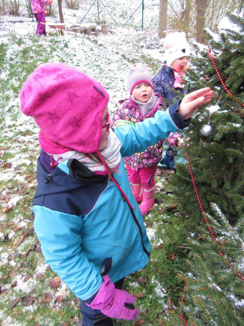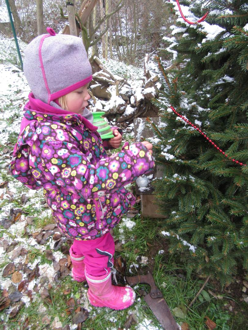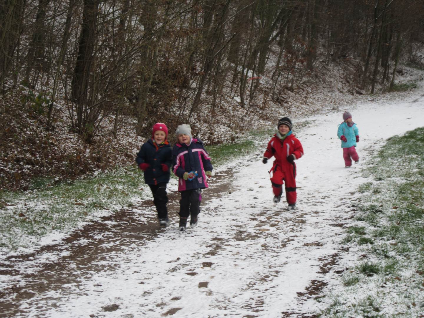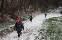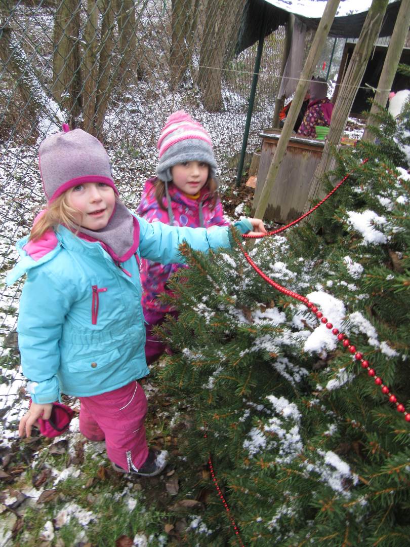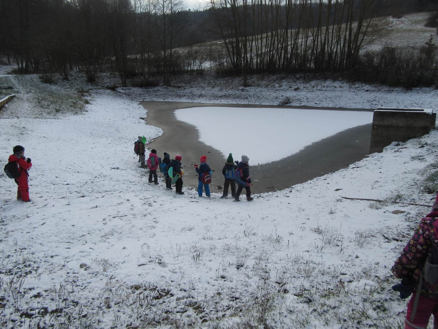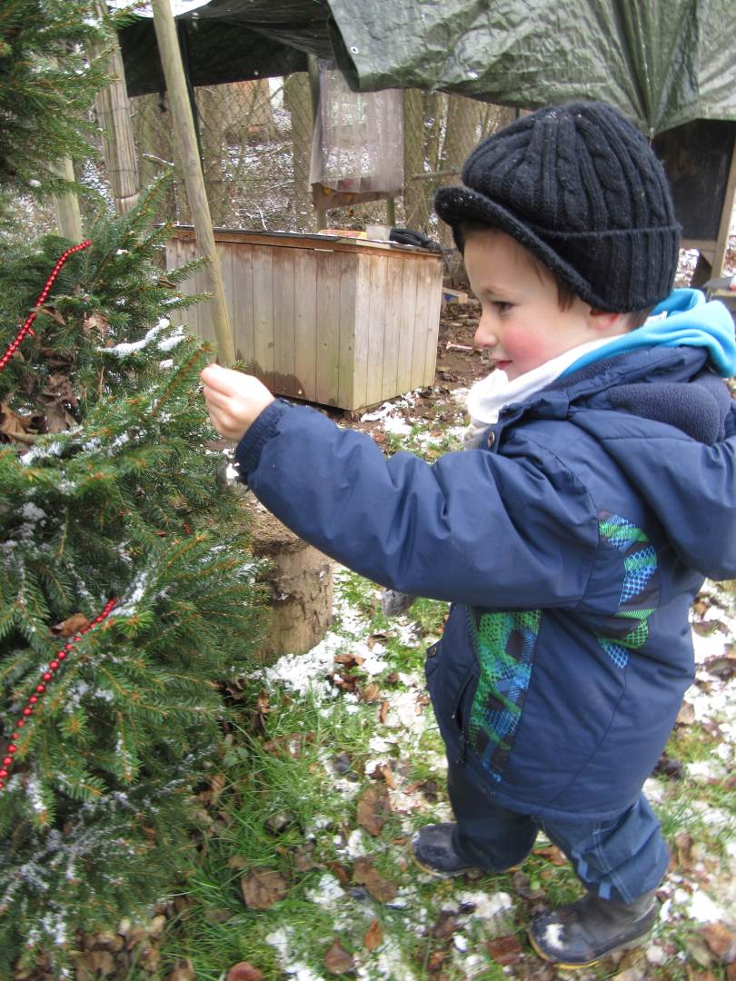 V úterý nám napadl první sních. Vyrazili jsme k maringotce postavit sněhuláky, zahrát si koulovačku, udělat ve sněhu andílka a nazdobit stromeček. Seznámili jsme se s písničkou „Prosinec“ od Uhlíře a Svěráka. Cestou jsme objevili ve sněhu stopy různých zvířátek. Zjistili jsme, že rybník u lesní školky je poloprázdný a zamrzlý. I my jsme byli zmrzlí a tak jsme oběhli celý rybník dokolečka.