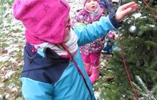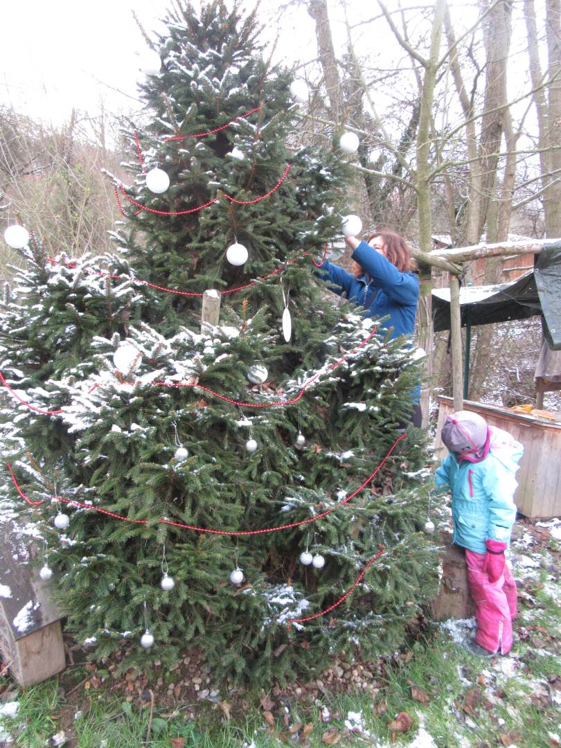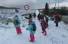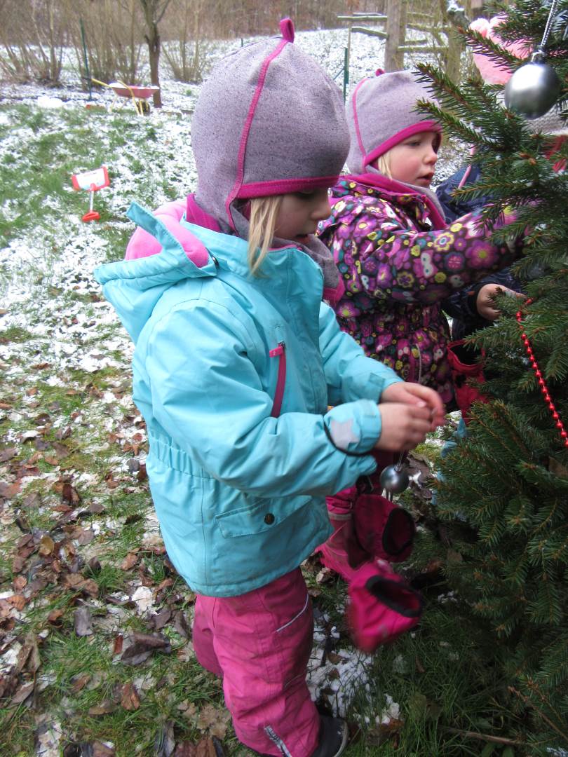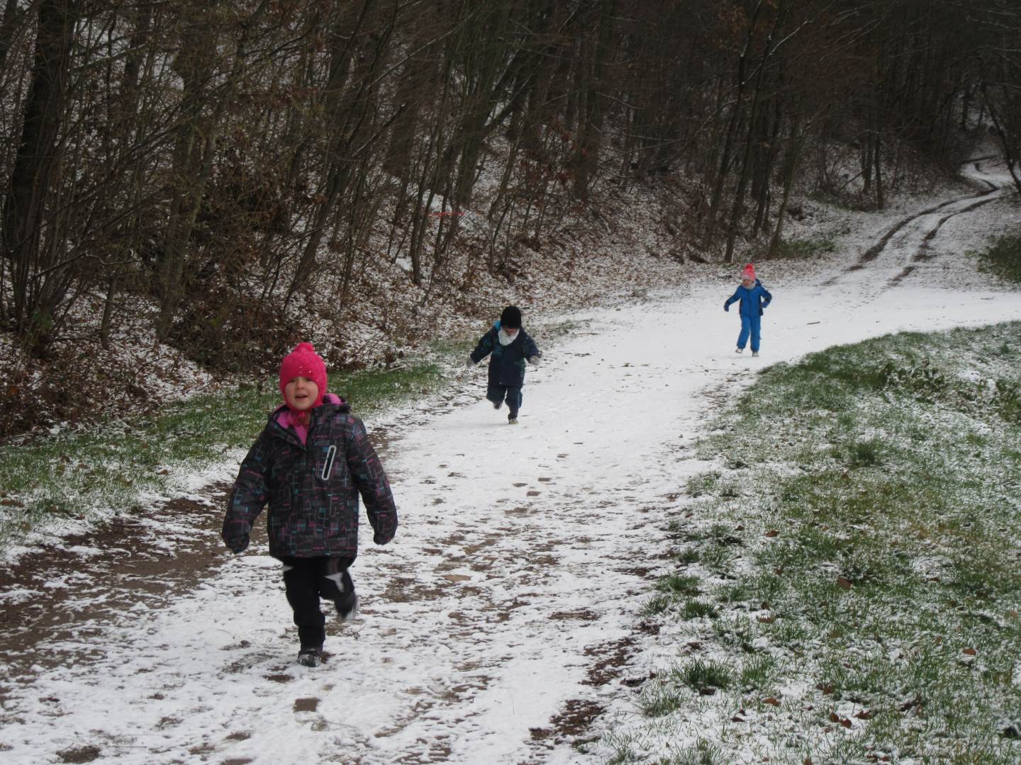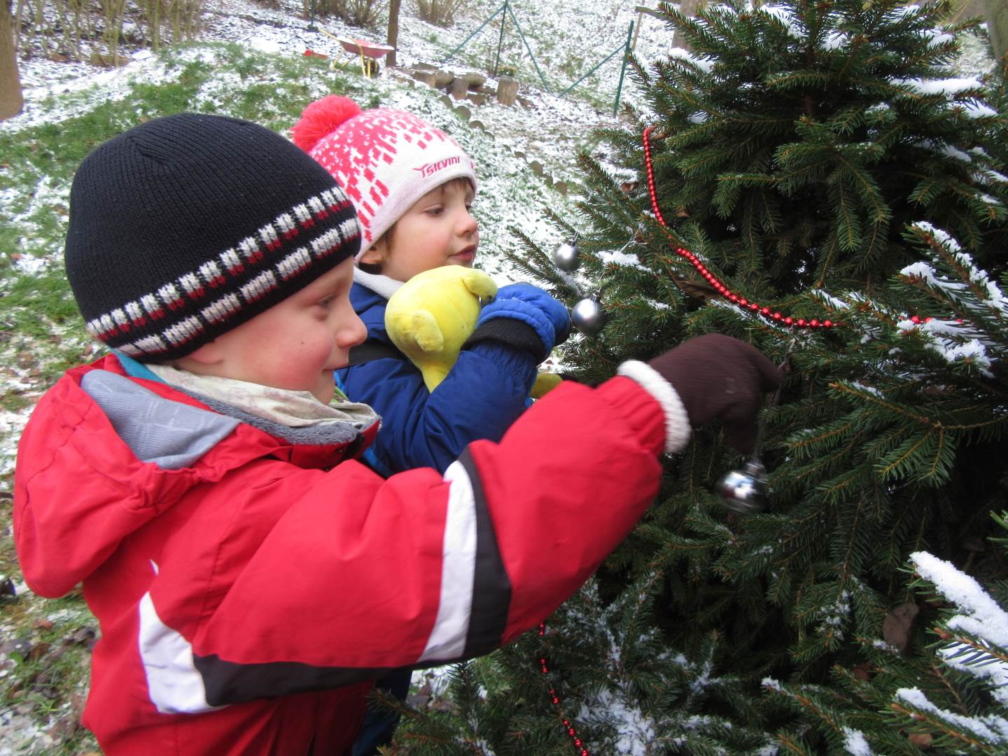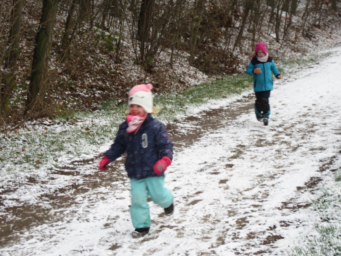 V úterý nám napadl první sních. Vyrazili jsme k maringotce postavit sněhuláky, zahrát si koulovačku, udělat ve sněhu andílka a nazdobit stromeček. Seznámili jsme se s písničkou „Prosinec“ od Uhlíře a Svěráka. Cestou jsme objevili ve sněhu stopy různých zvířátek. Zjistili jsme, že rybník u lesní školky je poloprázdný a zamrzlý. I my jsme byli zmrzlí a tak jsme oběhli celý rybník dokolečka.