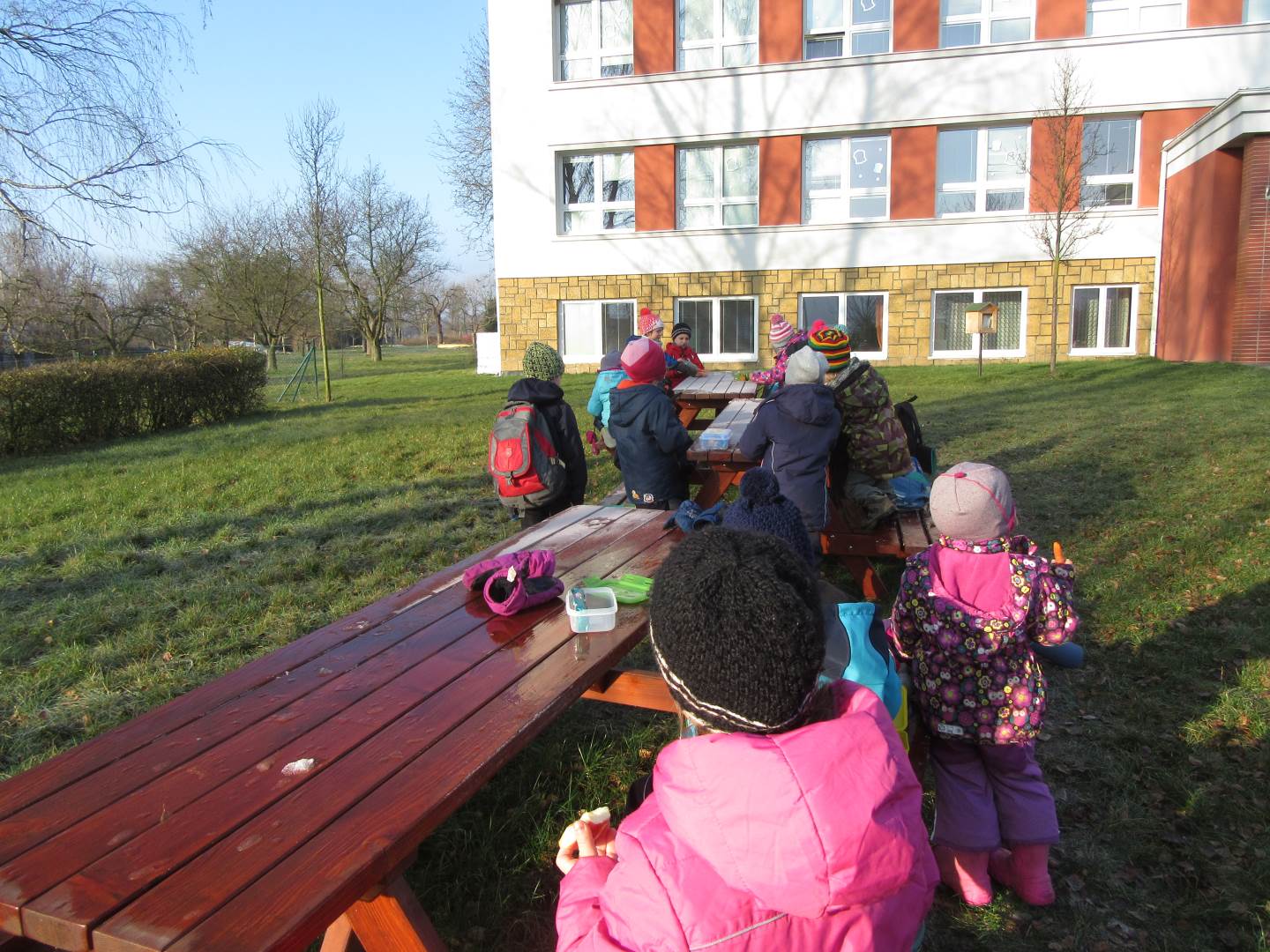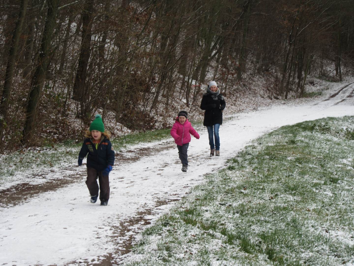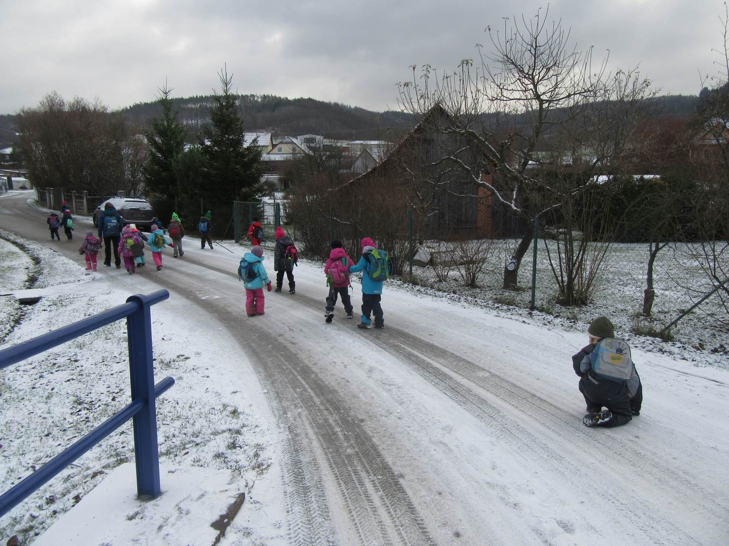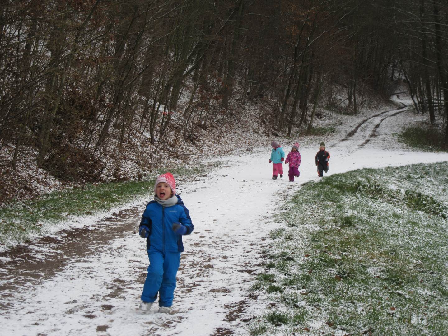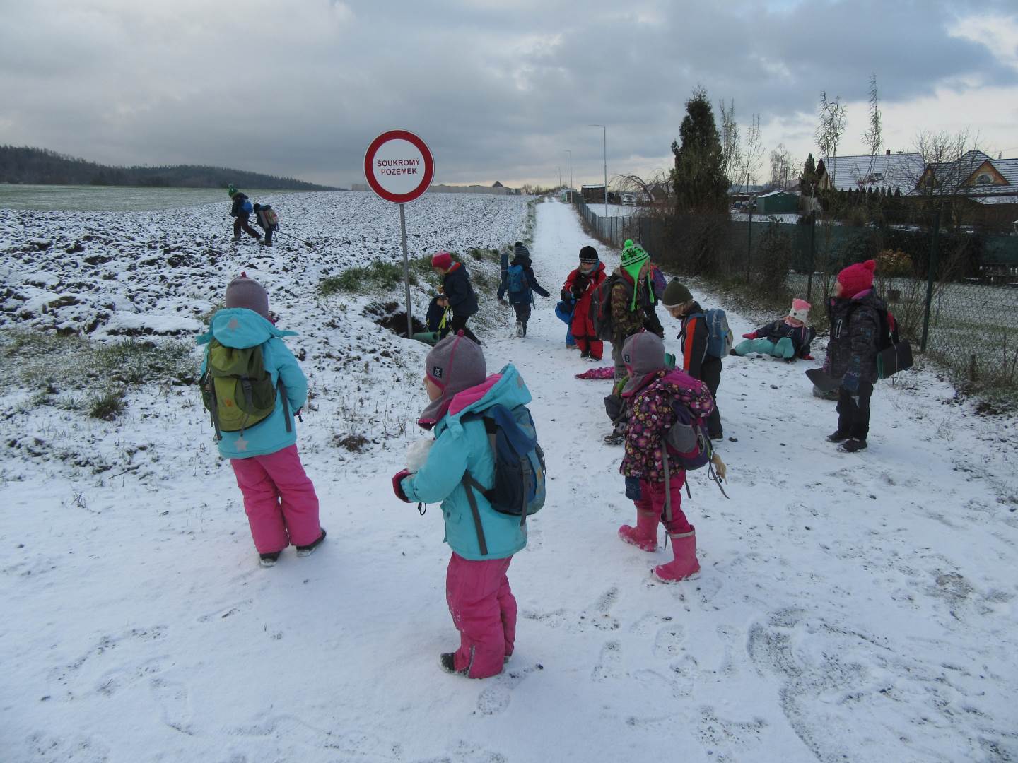 V úterý nám napadl první sních. Vyrazili jsme k maringotce postavit sněhuláky, zahrát si koulovačku, udělat ve sněhu andílka a nazdobit stromeček. Seznámili jsme se s písničkou „Prosinec“ od Uhlíře a Svěráka. Cestou jsme objevili ve sněhu stopy různých zvířátek. Zjistili jsme, že rybník u lesní školky je poloprázdný a zamrzlý. I my jsme byli zmrzlí a tak jsme oběhli celý rybník dokolečka.