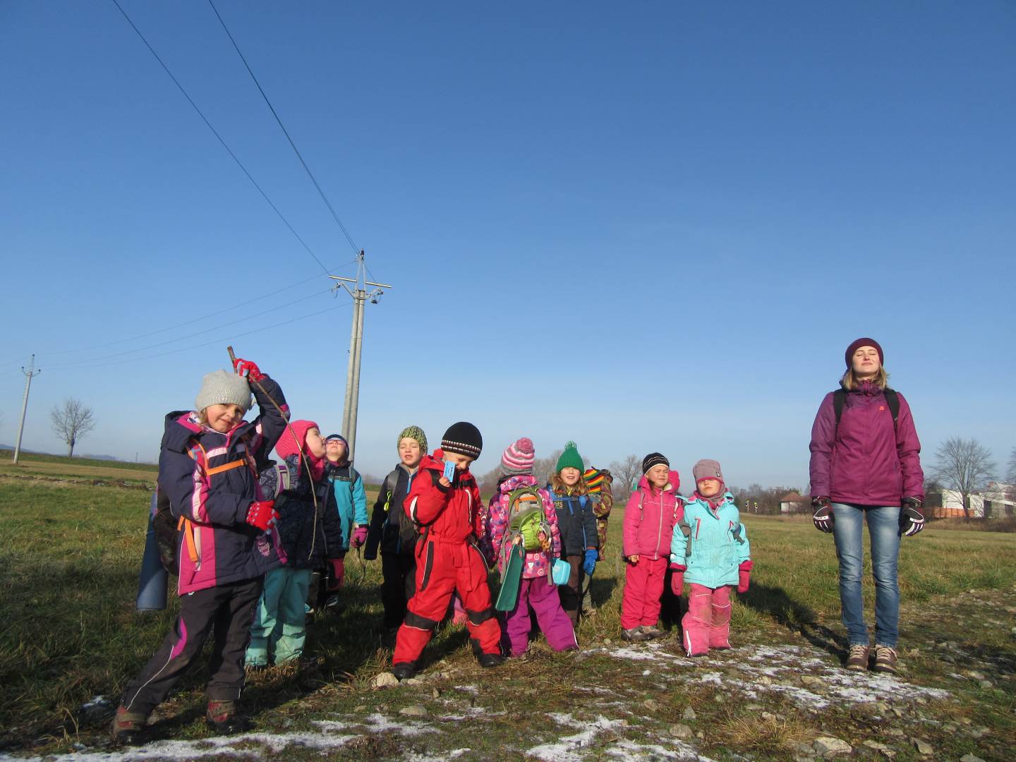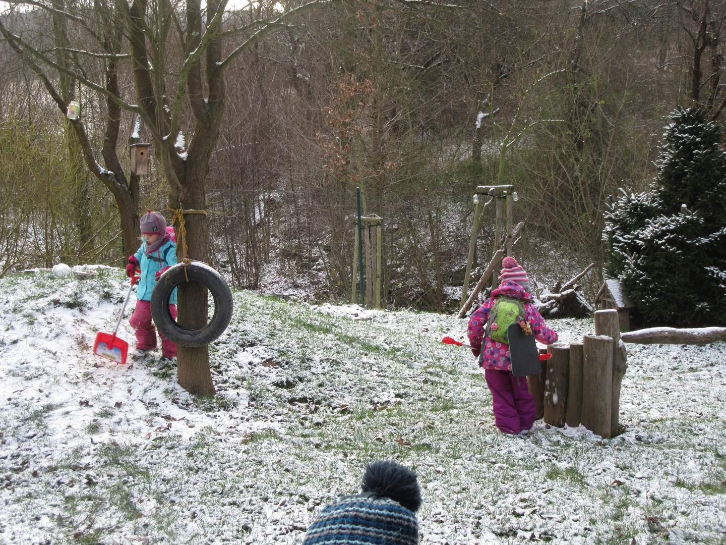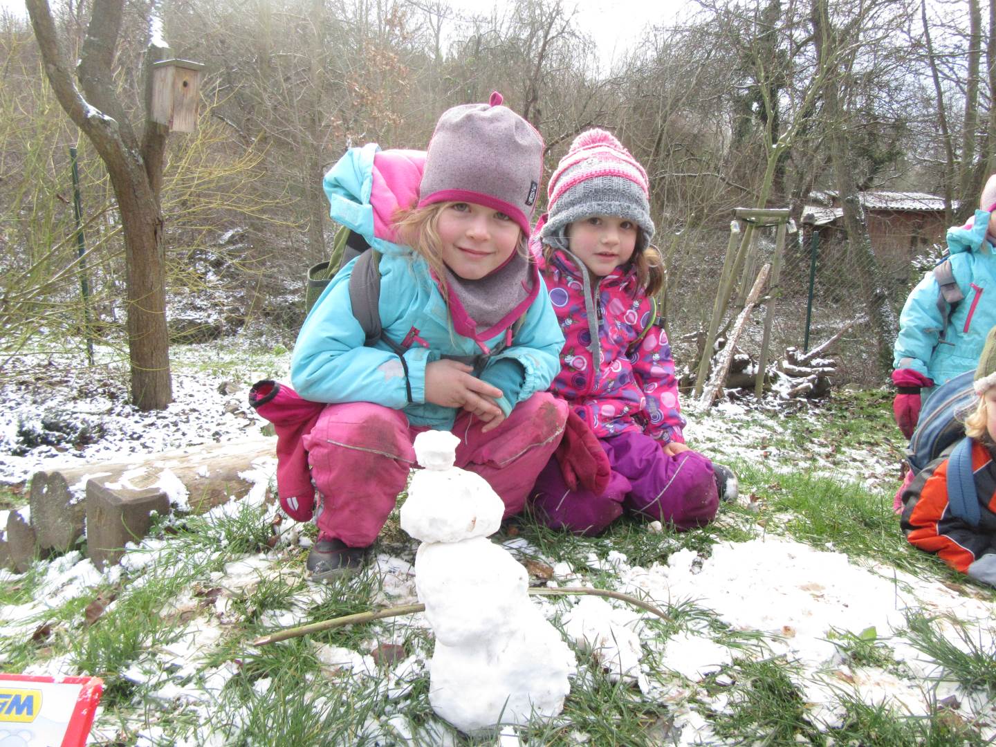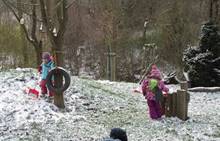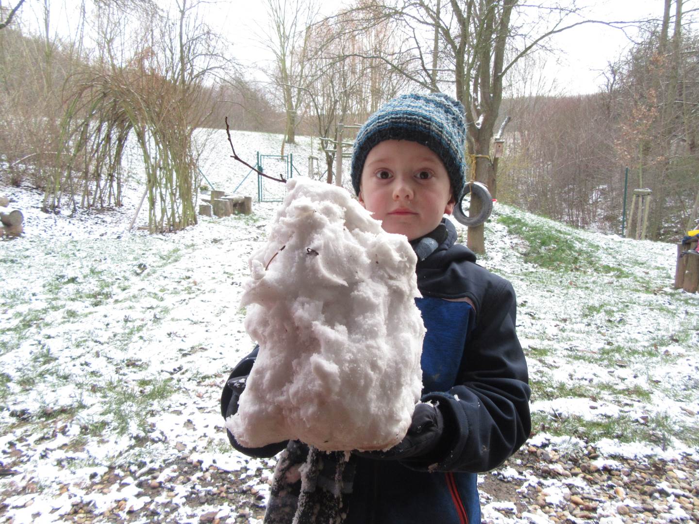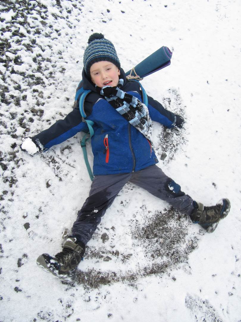 V úterý nám napadl první sních. Vyrazili jsme k maringotce postavit sněhuláky, zahrát si koulovačku, udělat ve sněhu andílka a nazdobit stromeček. Seznámili jsme se s písničkou „Prosinec“ od Uhlíře a Svěráka. Cestou jsme objevili ve sněhu stopy různých zvířátek. Zjistili jsme, že rybník u lesní školky je poloprázdný a zamrzlý. I my jsme byli zmrzlí a tak jsme oběhli celý rybník dokolečka.