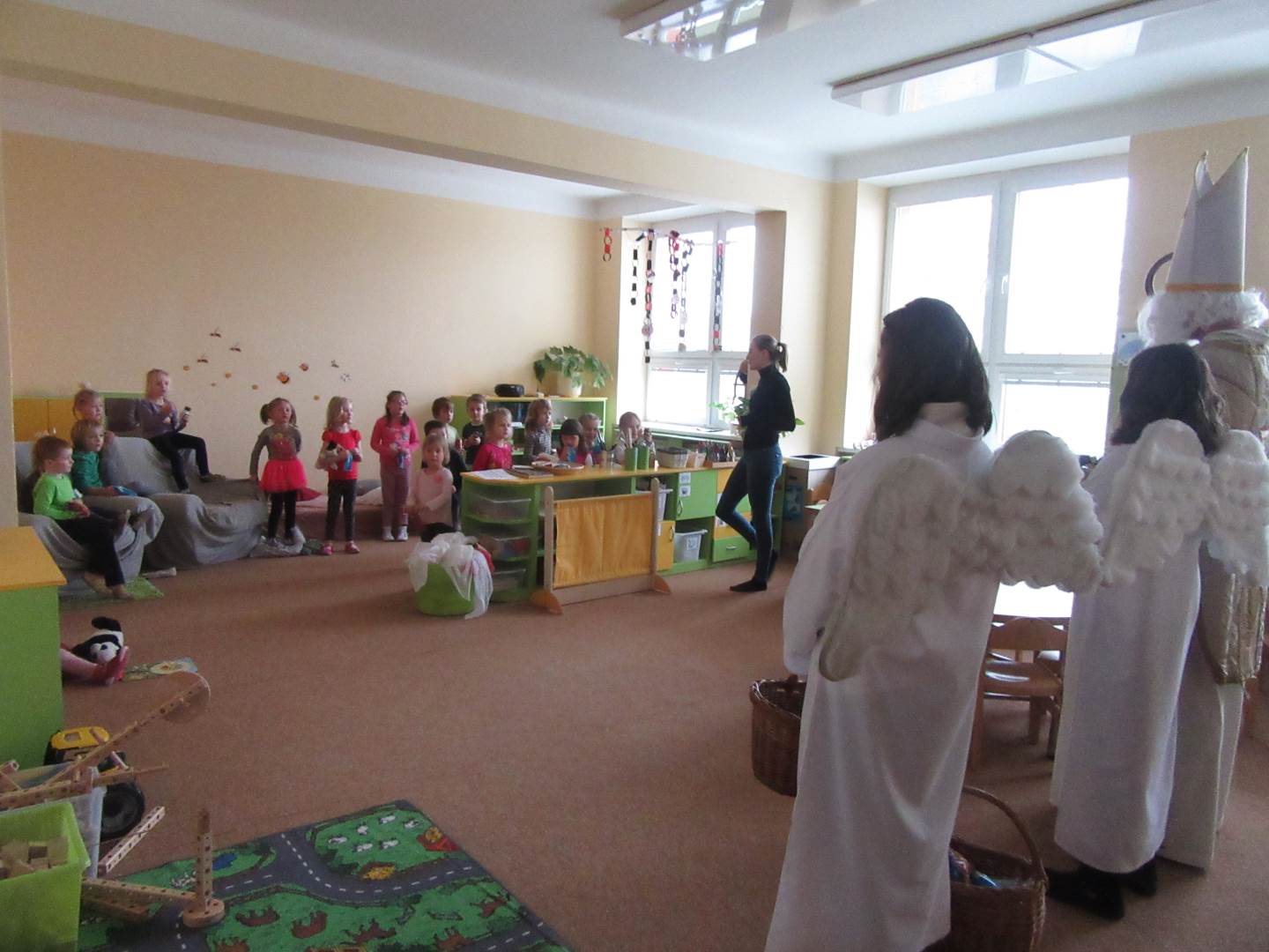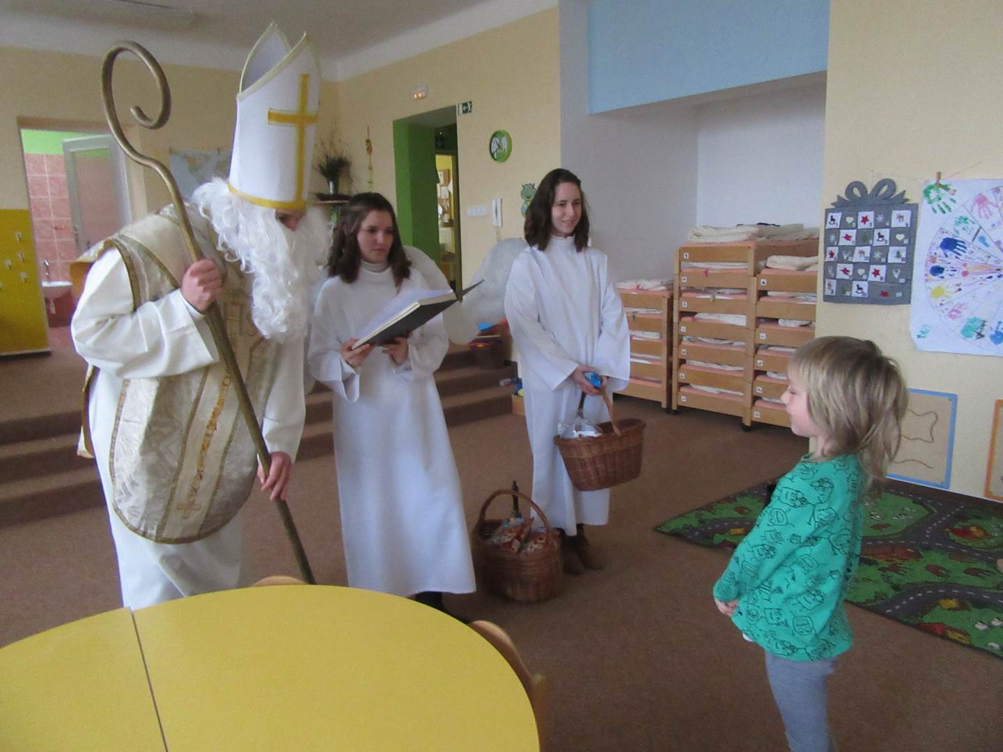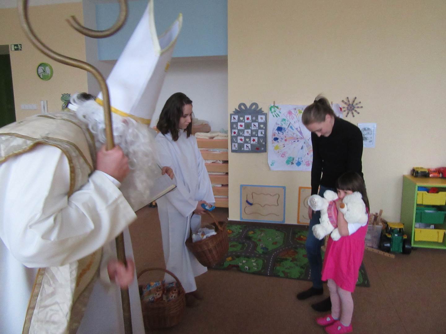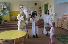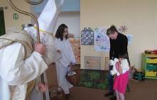 Ve čtvrtek jsme měli ve školce návštěvu až z nebes a pekla. Přišel Mikuláš, dva andílci a dva čerti (ti naštěstí zůstali v šatně). Mikuláš děti podaroval perníkem, sušenkami, jablíčkem a mandarinkou. Tak jsme mu na oplátku zazpívali písničku Mik, Miku, Mikuláš.