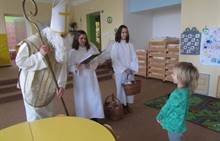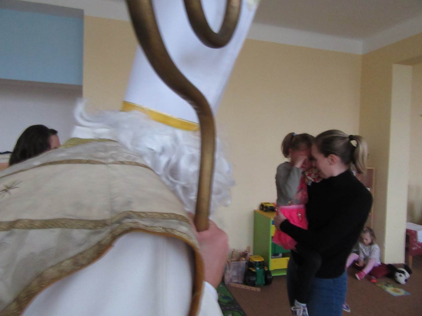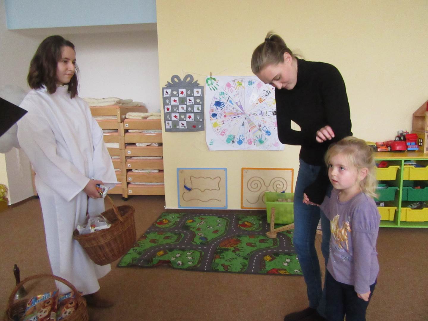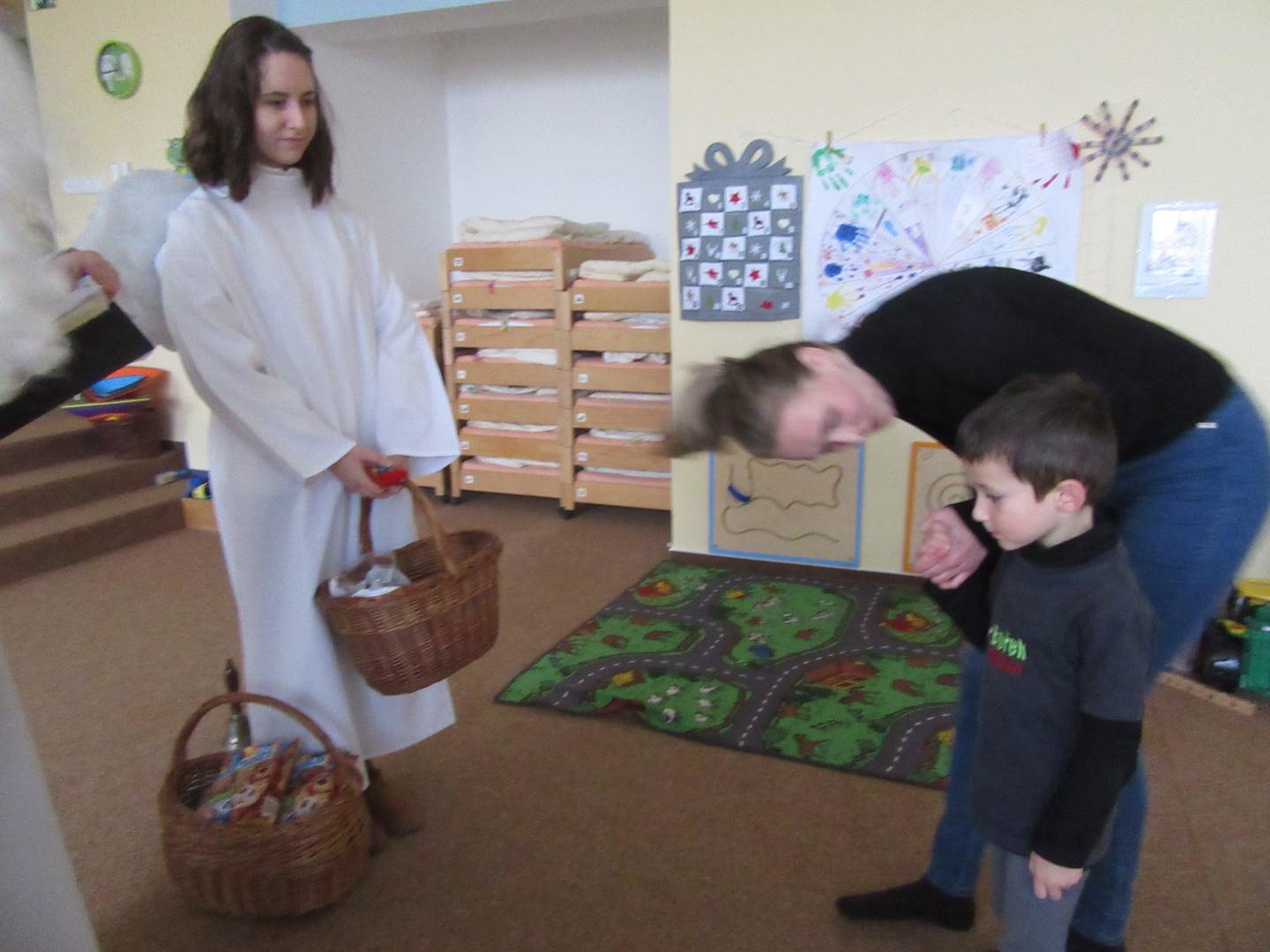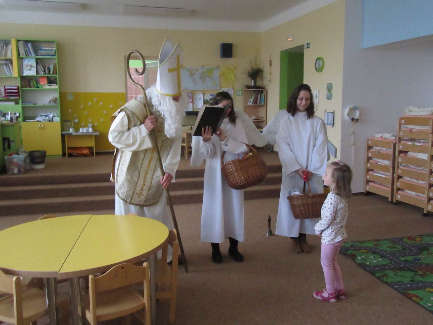 Ve čtvrtek jsme měli ve školce návštěvu až z nebes a pekla. Přišel Mikuláš, dva andílci a dva čerti (ti naštěstí zůstali v šatně). Mikuláš děti podaroval perníkem, sušenkami, jablíčkem a mandarinkou. Tak jsme mu na oplátku zazpívali písničku Mik, Miku, Mikuláš.