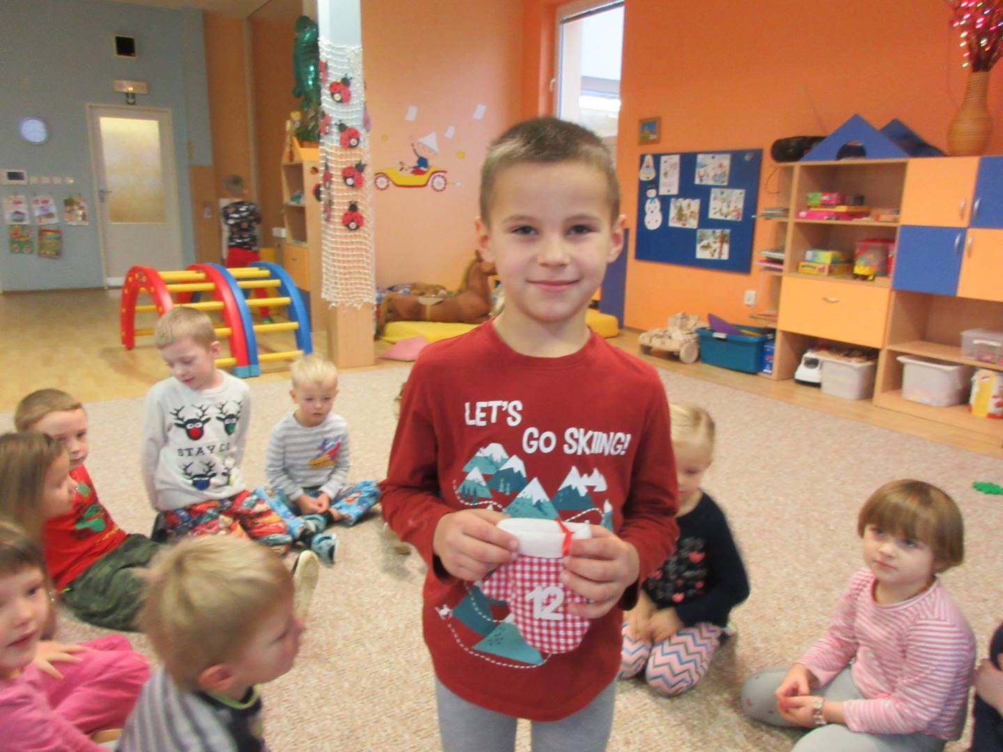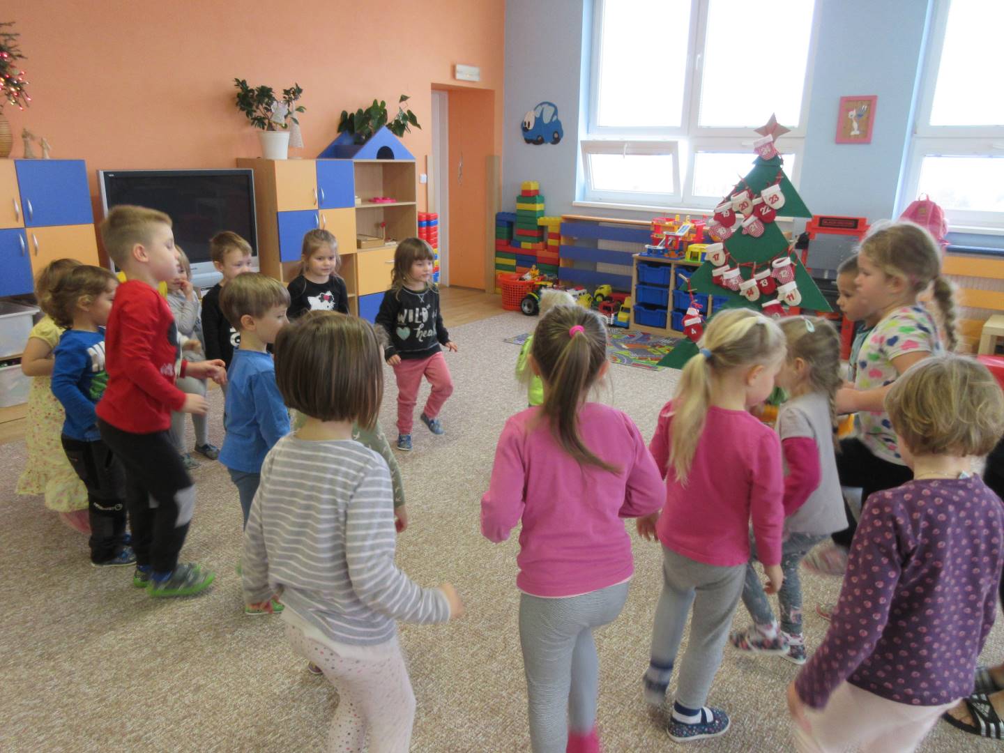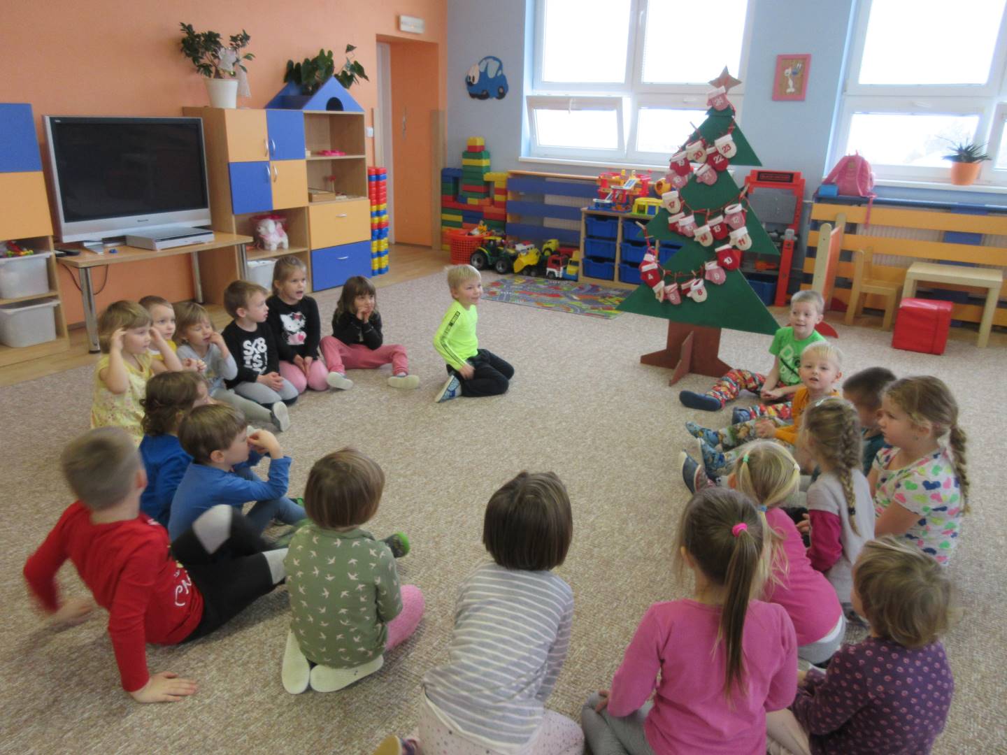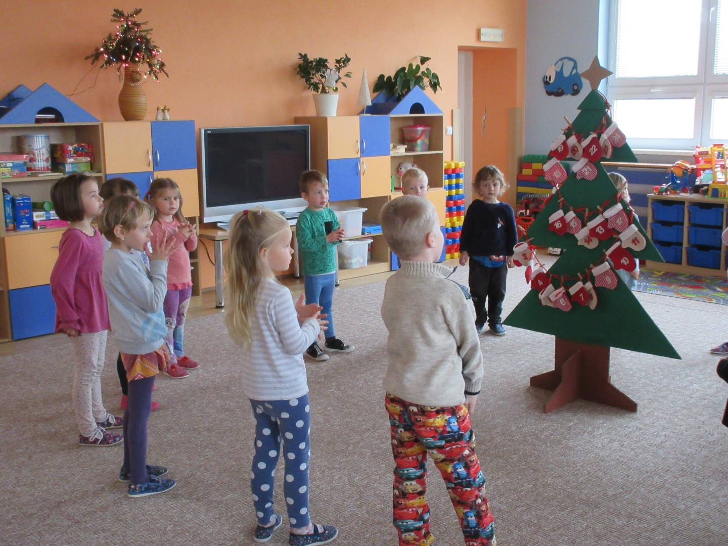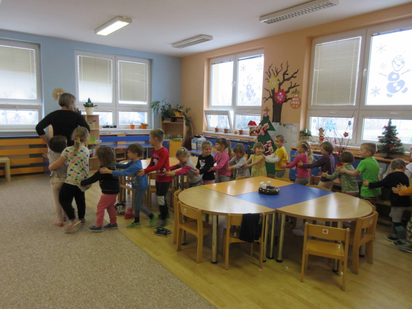 V prosinci jsme se věnovali tématu ,,Vánoční pohádka". Děti ozdobily vánoční stromeček před MŠ. Naučili jsme se nové básničky a písničky pro Mikuláše, který nás navštívil ve třídě a děti odměnil balíčkem. Postupně rozsvěcujeme svíčky na adventním věnci a také plníme úkoly z našeho adventního kalendáře. Vánoční příběh dětem vyprávěla paní Muchová, která jim poutavým způsobem přiblížila narození Ježíška. Vyrobili jsme krásná přáníčka z kapradin, zdobili perníčky a napsali dopis Ježíškovi. Předškoláci si udělali několik pracovních listů a nechybělo ani sportovní vyžití. V tělocvičně jsme se seznámili s novým gymnastickým nářadím RinoGym, které děti velmi zaujalo.