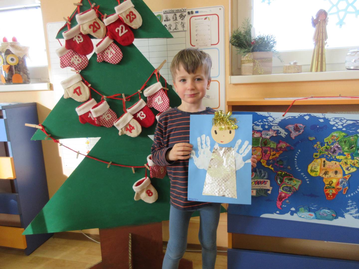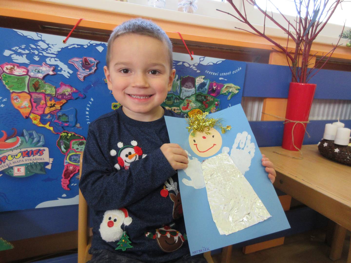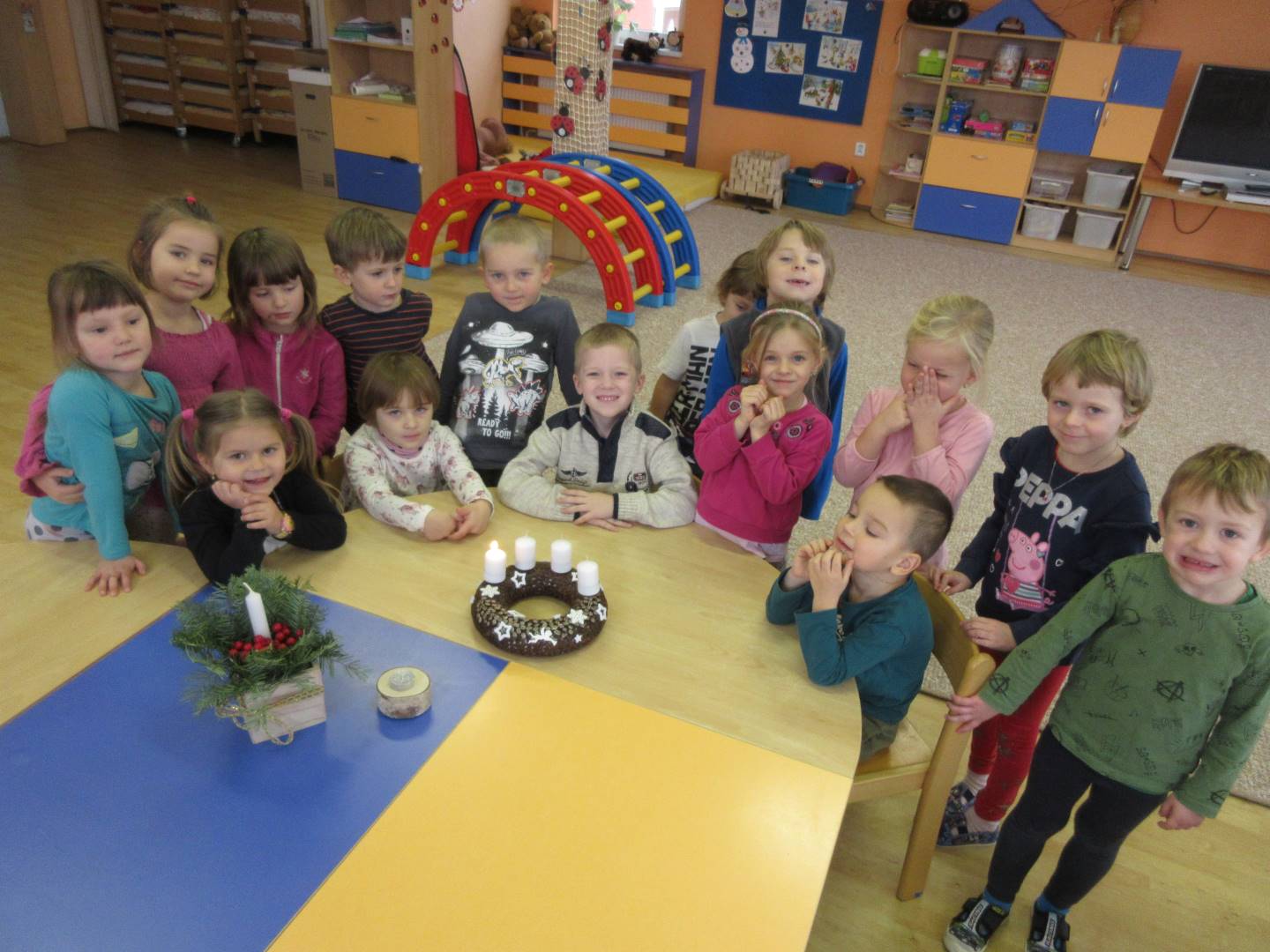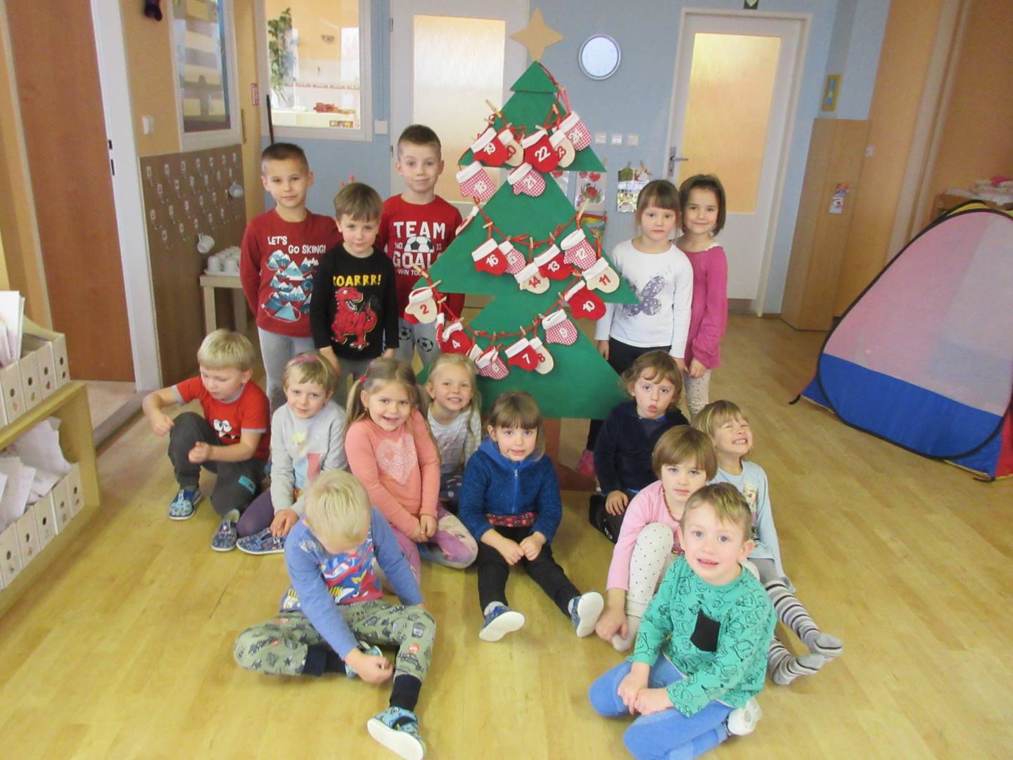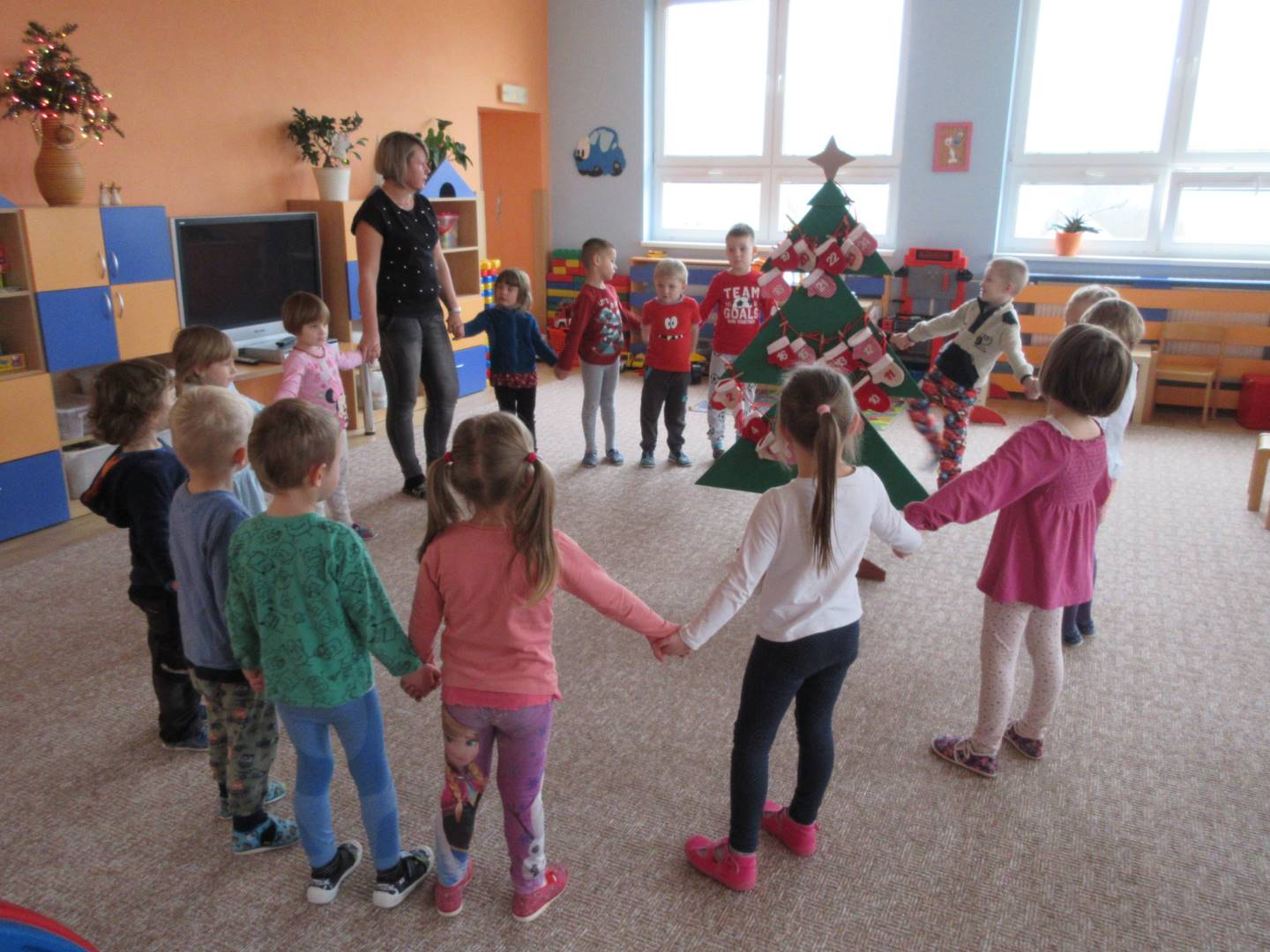 V prosinci jsme se věnovali tématu ,,Vánoční pohádka". Děti ozdobily vánoční stromeček před MŠ. Naučili jsme se nové básničky a písničky pro Mikuláše, který nás navštívil ve třídě a děti odměnil balíčkem. Postupně rozsvěcujeme svíčky na adventním věnci a také plníme úkoly z našeho adventního kalendáře. Vánoční příběh dětem vyprávěla paní Muchová, která jim poutavým způsobem přiblížila narození Ježíška. Vyrobili jsme krásná přáníčka z kapradin, zdobili perníčky a napsali dopis Ježíškovi. Předškoláci si udělali několik pracovních listů a nechybělo ani sportovní vyžití. V tělocvičně jsme se seznámili s novým gymnastickým nářadím RinoGym, které děti velmi zaujalo.
