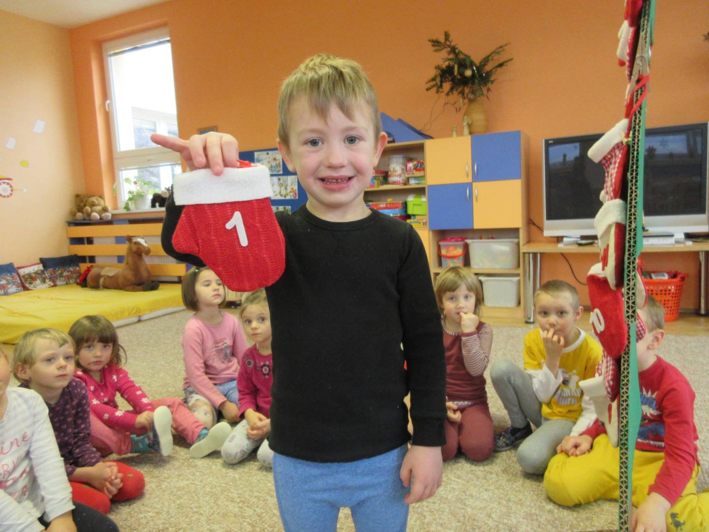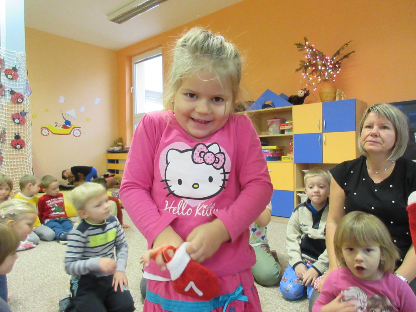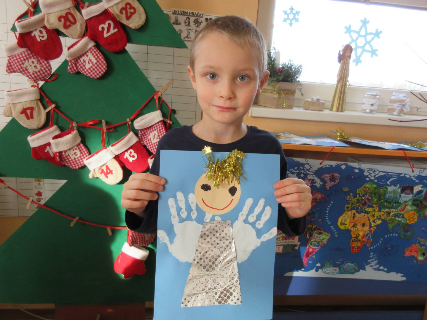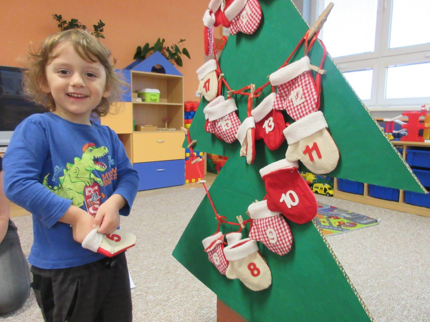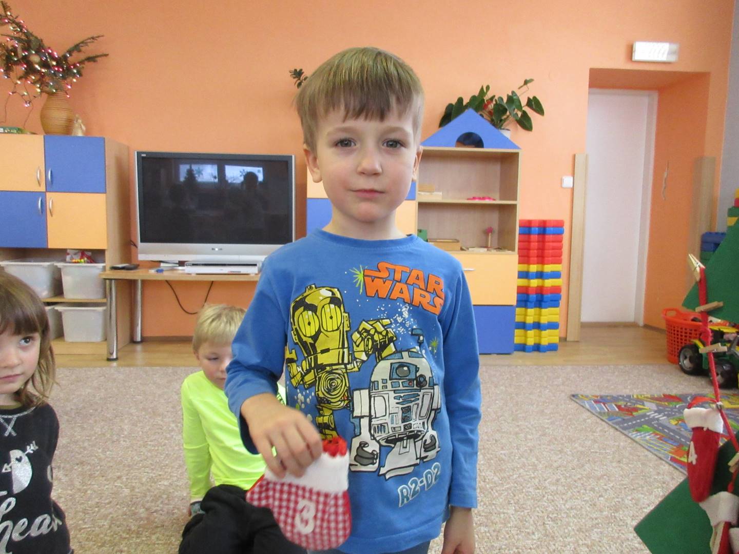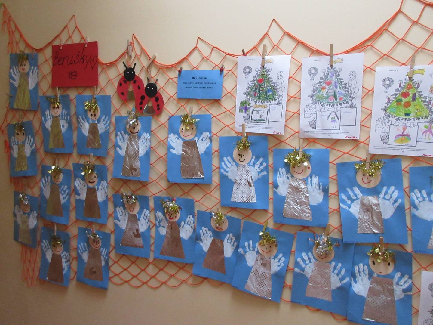 V prosinci jsme se věnovali tématu ,,Vánoční pohádka". Děti ozdobily vánoční stromeček před MŠ. Naučili jsme se nové básničky a písničky pro Mikuláše, který nás navštívil ve třídě a děti odměnil balíčkem. Postupně rozsvěcujeme svíčky na adventním věnci a také plníme úkoly z našeho adventního kalendáře. Vánoční příběh dětem vyprávěla paní Muchová, která jim poutavým způsobem přiblížila narození Ježíška. Vyrobili jsme krásná přáníčka z kapradin, zdobili perníčky a napsali dopis Ježíškovi. Předškoláci si udělali několik pracovních listů a nechybělo ani sportovní vyžití. V tělocvičně jsme se seznámili s novým gymnastickým nářadím RinoGym, které děti velmi zaujalo.