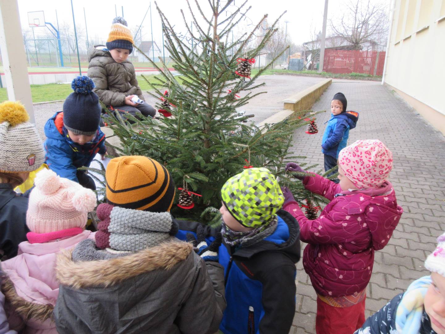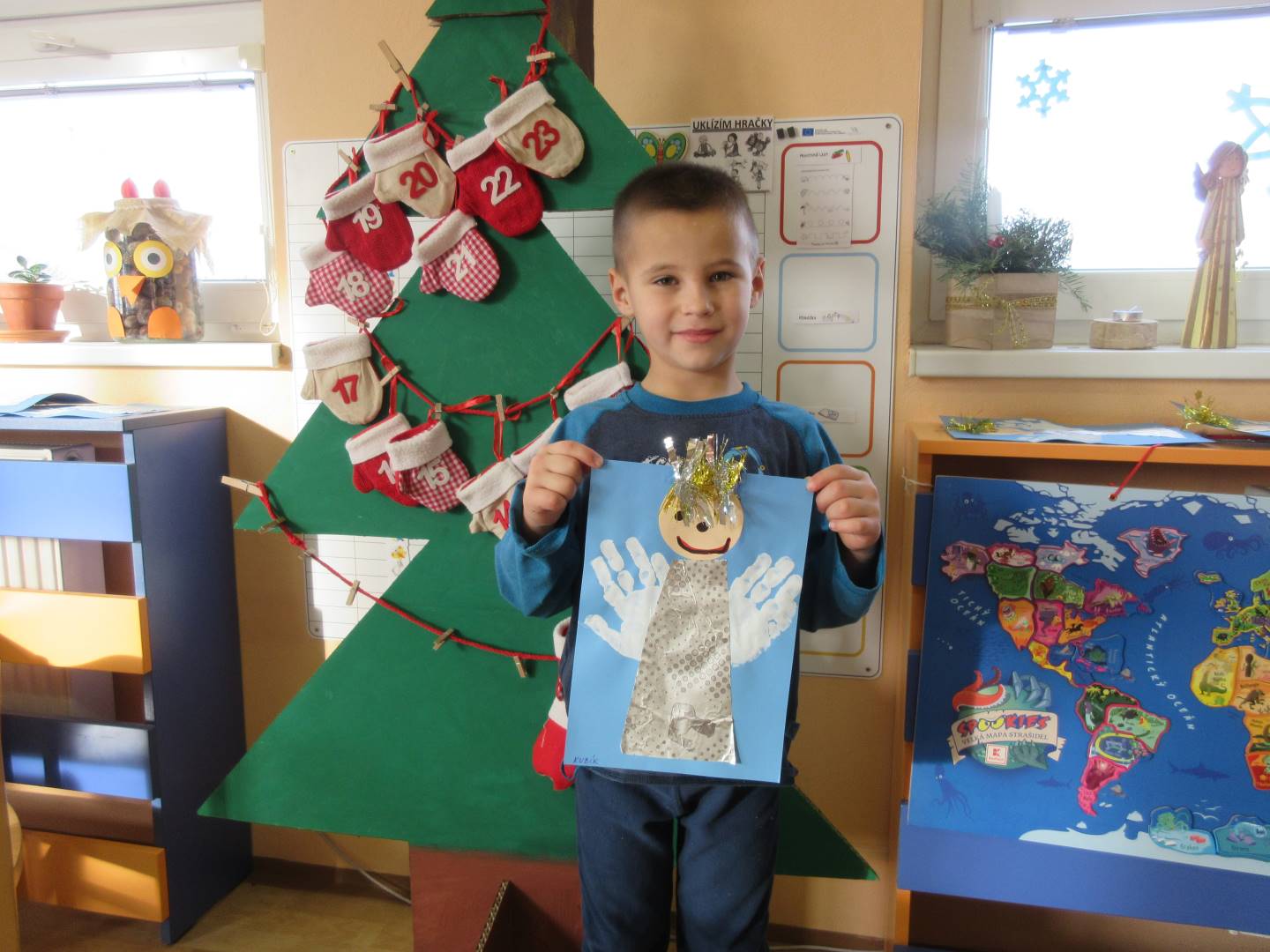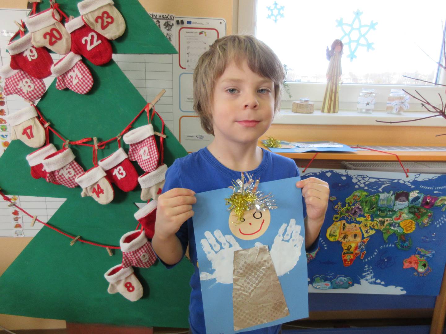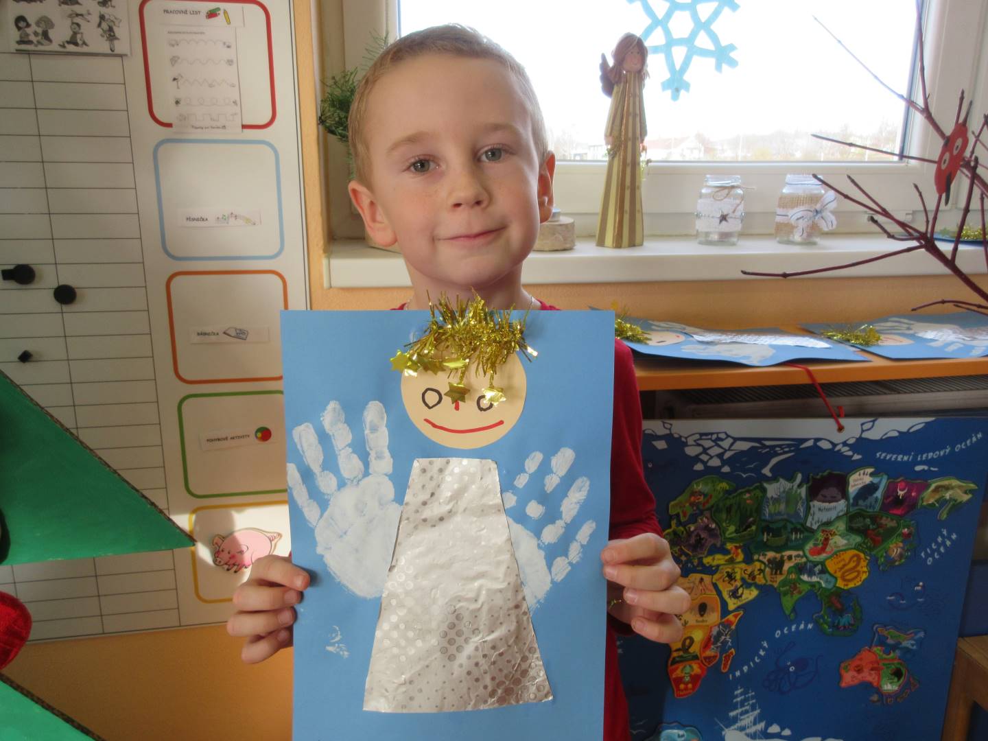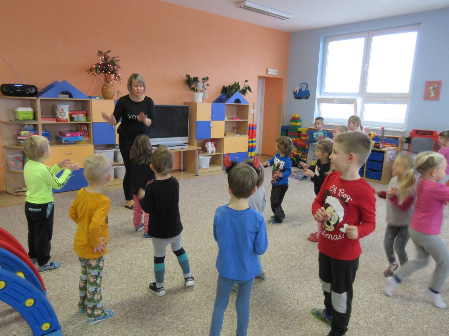 V prosinci jsme se věnovali tématu ,,Vánoční pohádka". Děti ozdobily vánoční stromeček před MŠ. Naučili jsme se nové básničky a písničky pro Mikuláše, který nás navštívil ve třídě a děti odměnil balíčkem. Postupně rozsvěcujeme svíčky na adventním věnci a také plníme úkoly z našeho adventního kalendáře. Vánoční příběh dětem vyprávěla paní Muchová, která jim poutavým způsobem přiblížila narození Ježíška. Vyrobili jsme krásná přáníčka z kapradin, zdobili perníčky a napsali dopis Ježíškovi. Předškoláci si udělali několik pracovních listů a nechybělo ani sportovní vyžití. V tělocvičně jsme se seznámili s novým gymnastickým nářadím RinoGym, které děti velmi zaujalo.