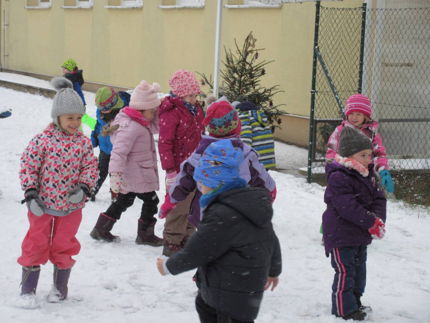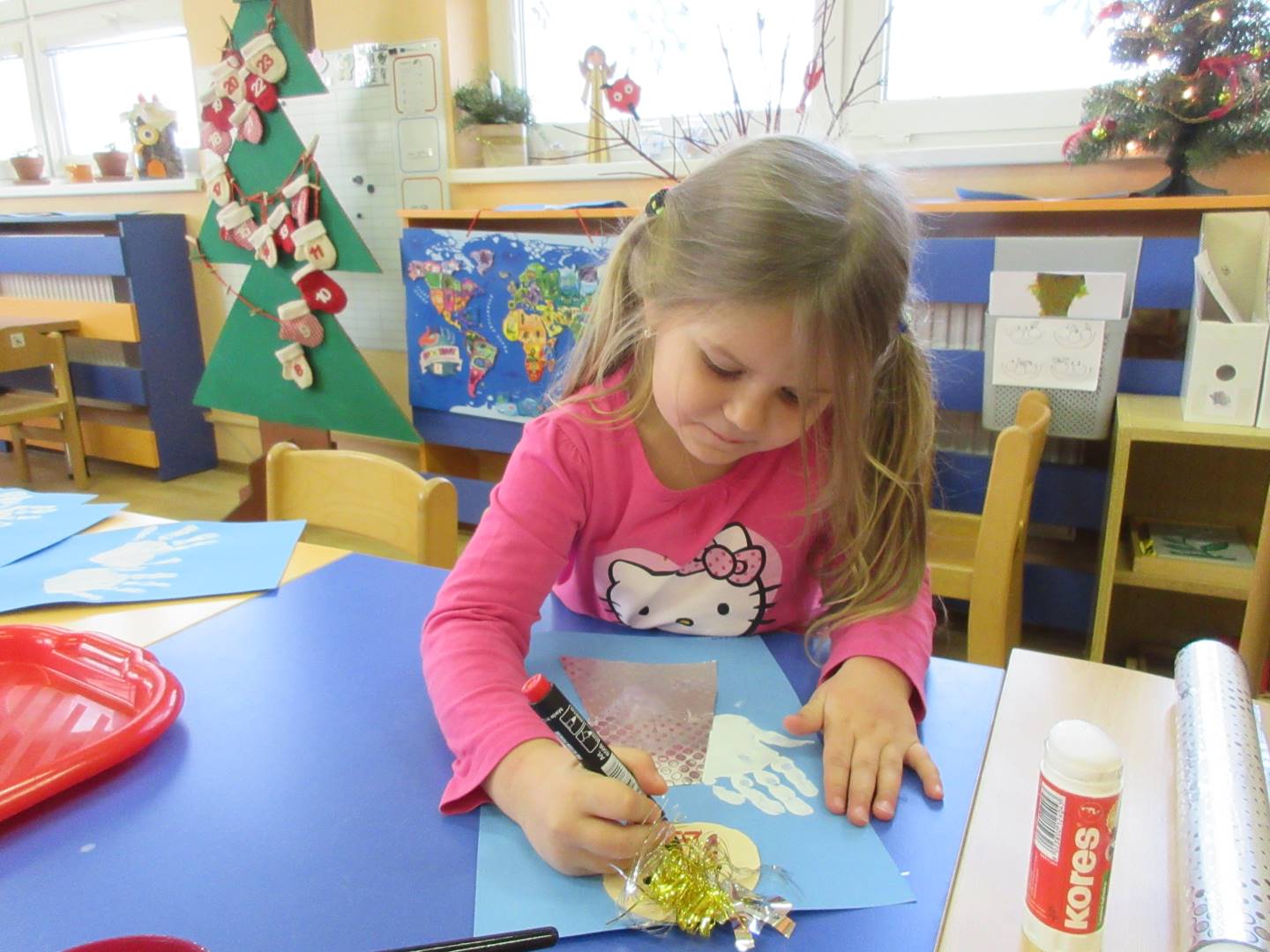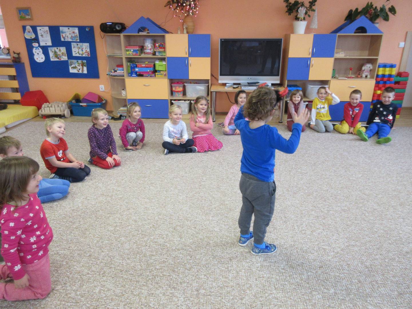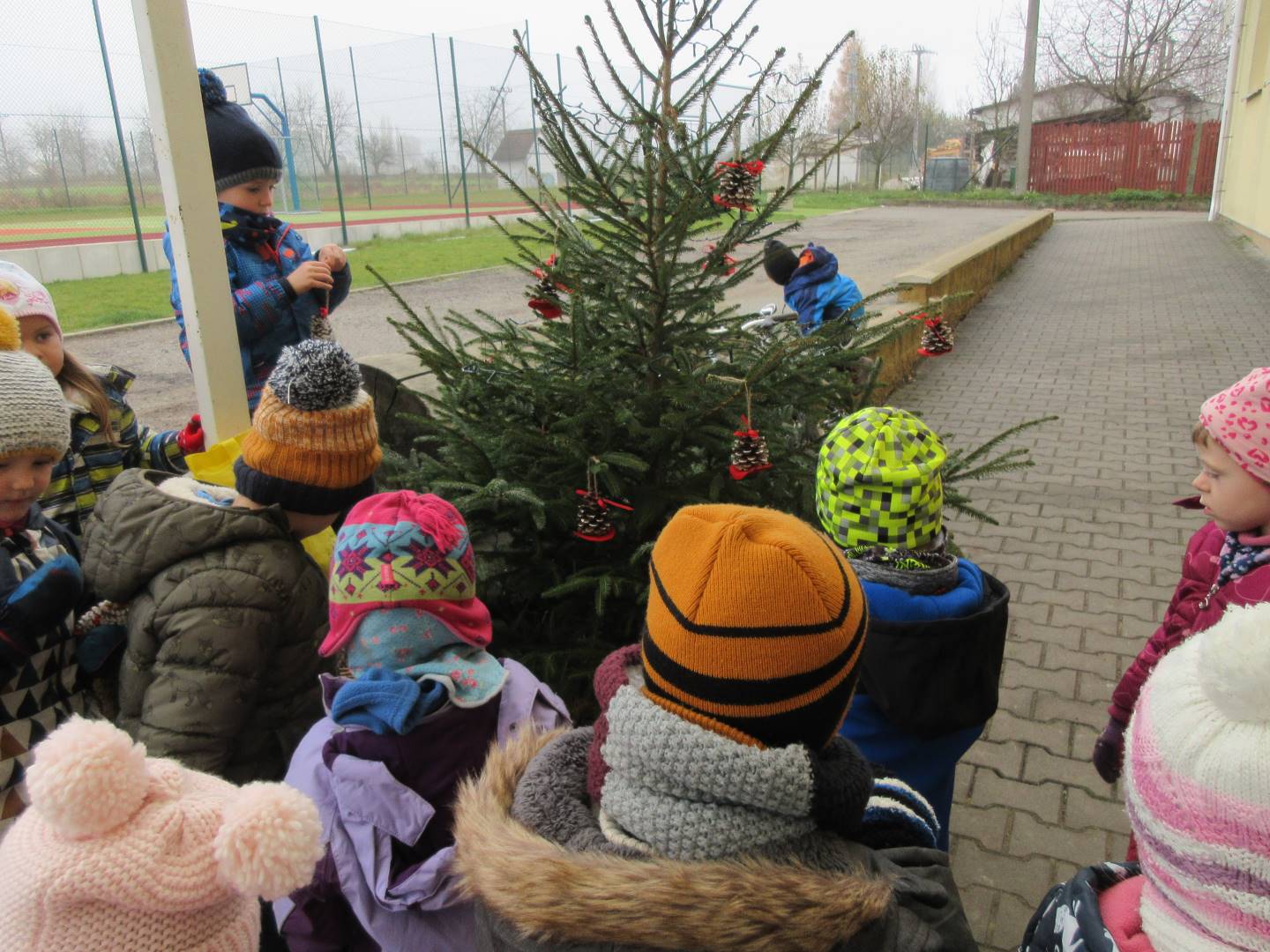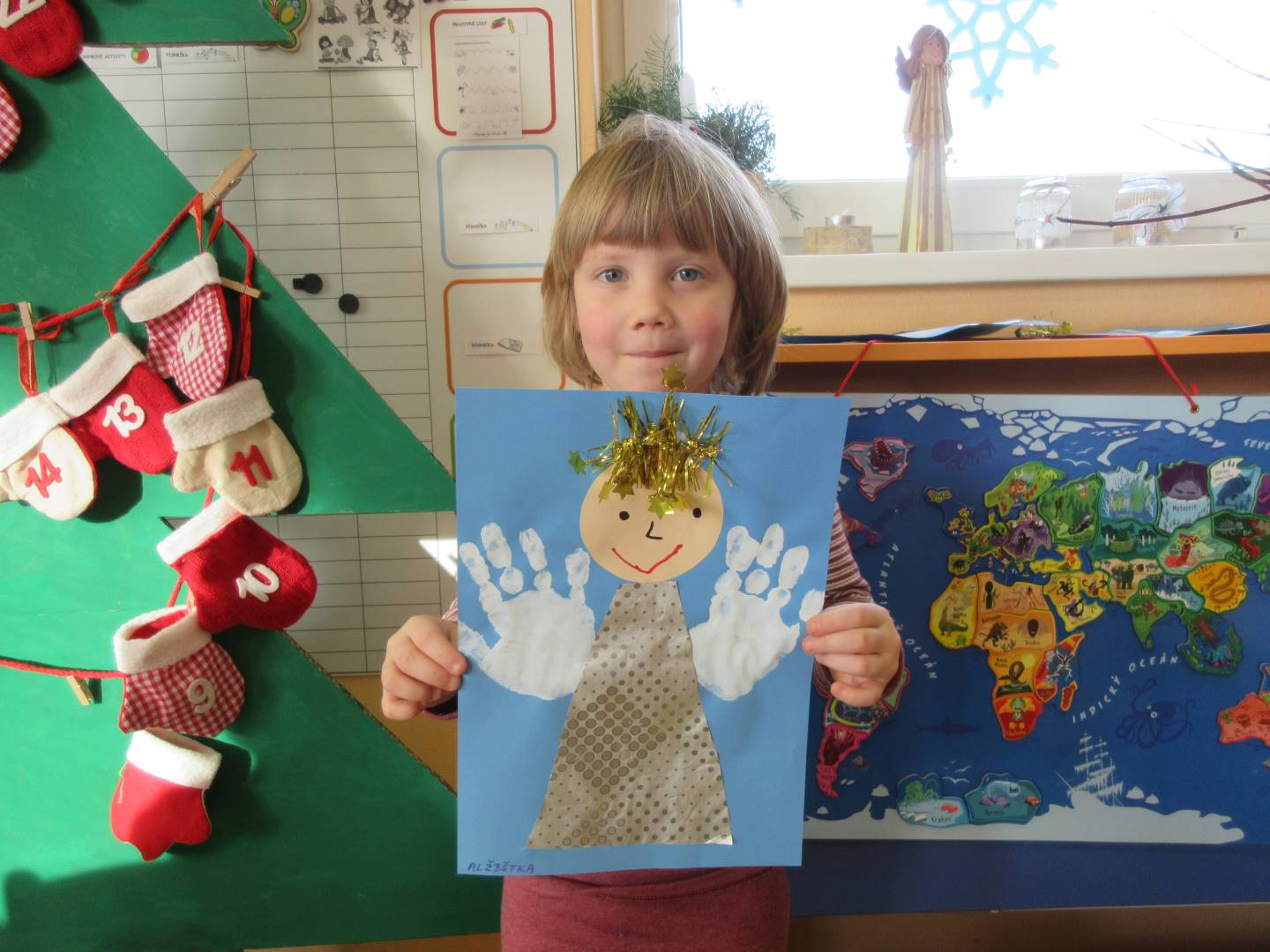 V prosinci jsme se věnovali tématu ,,Vánoční pohádka". Děti ozdobily vánoční stromeček před MŠ. Naučili jsme se nové básničky a písničky pro Mikuláše, který nás navštívil ve třídě a děti odměnil balíčkem. Postupně rozsvěcujeme svíčky na adventním věnci a také plníme úkoly z našeho adventního kalendáře. Vánoční příběh dětem vyprávěla paní Muchová, která jim poutavým způsobem přiblížila narození Ježíška. Vyrobili jsme krásná přáníčka z kapradin, zdobili perníčky a napsali dopis Ježíškovi. Předškoláci si udělali několik pracovních listů a nechybělo ani sportovní vyžití. V tělocvičně jsme se seznámili s novým gymnastickým nářadím RinoGym, které děti velmi zaujalo.