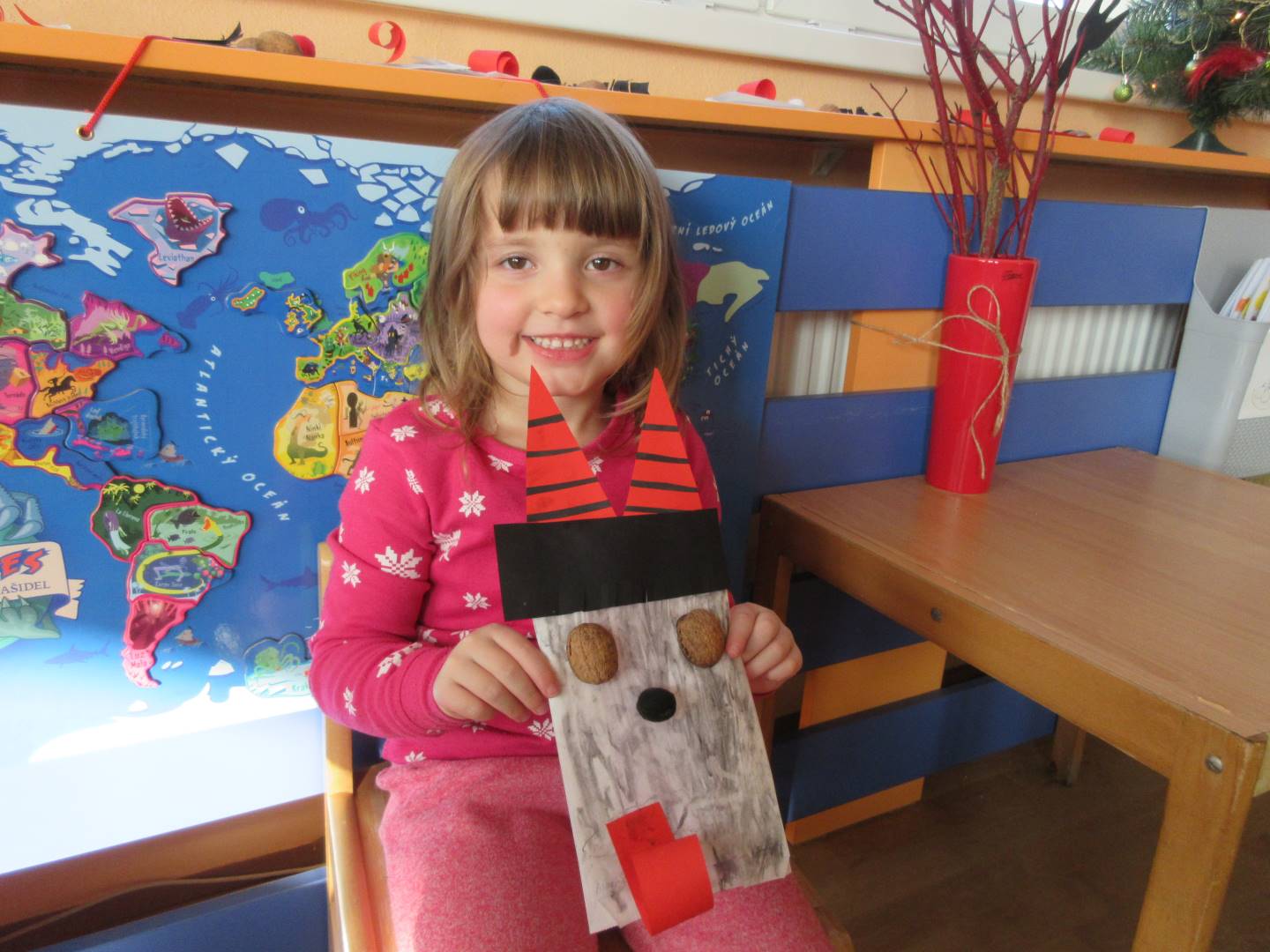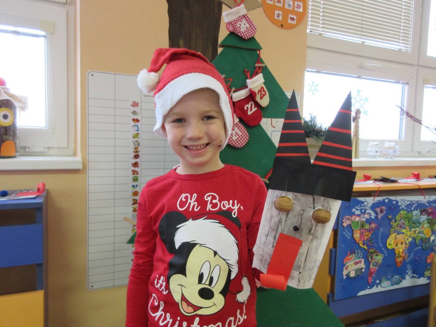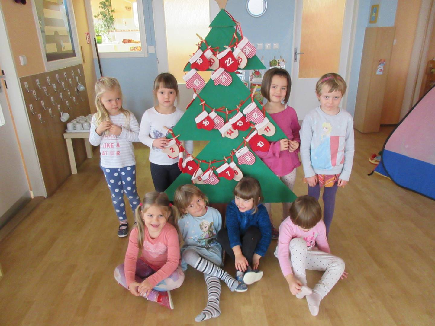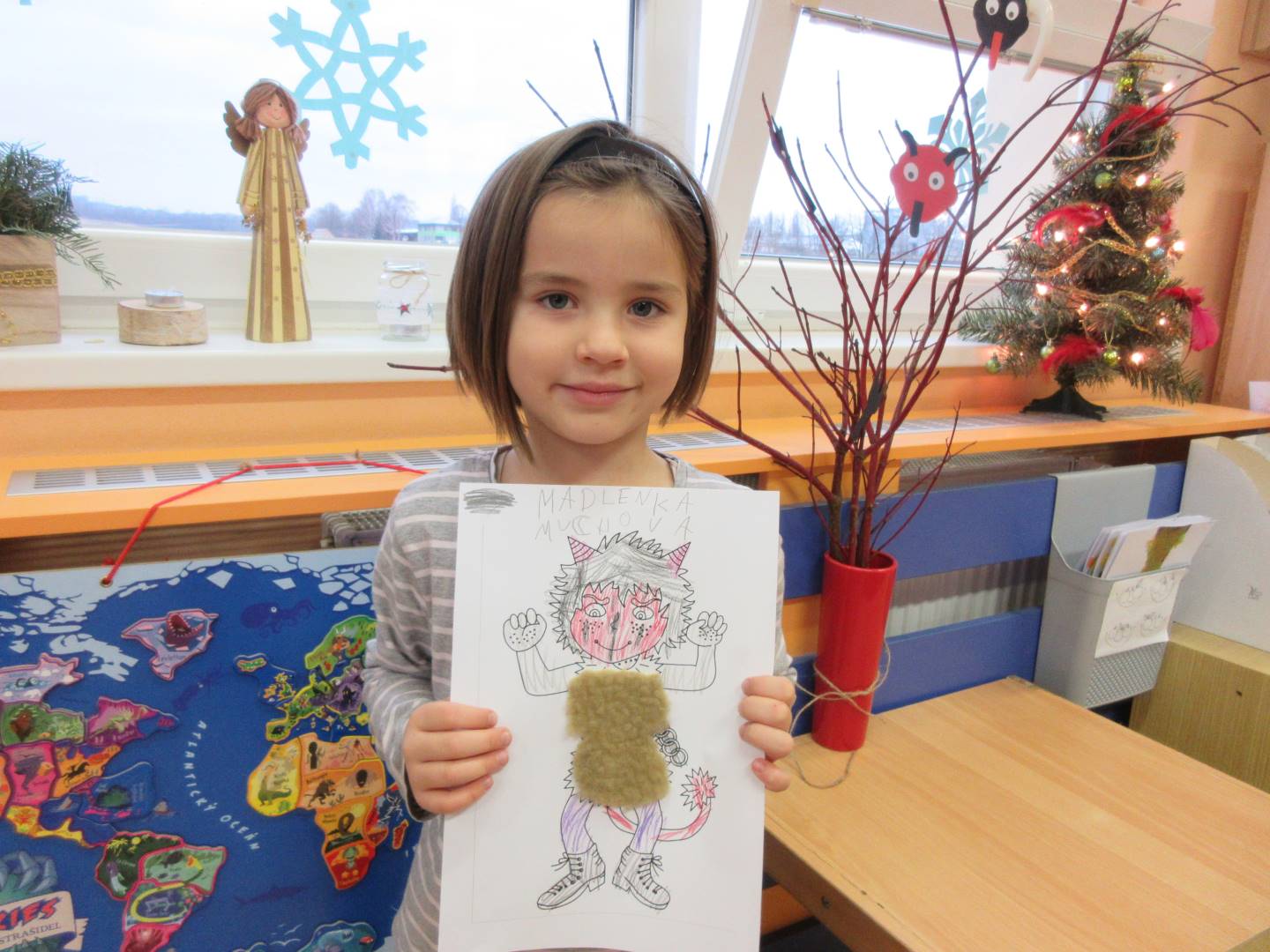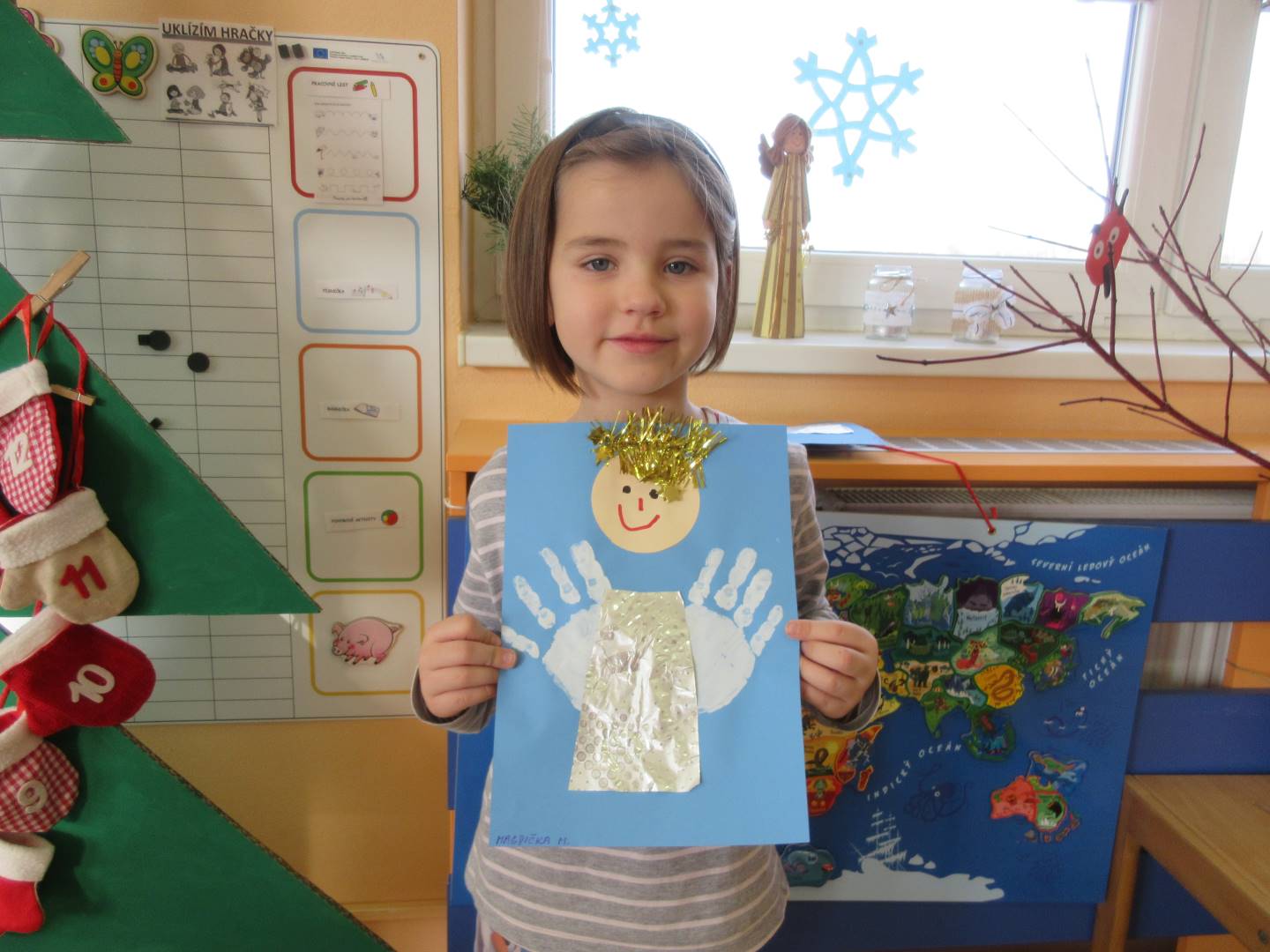 V prosinci jsme se věnovali tématu ,,Vánoční pohádka". Děti ozdobily vánoční stromeček před MŠ. Naučili jsme se nové básničky a písničky pro Mikuláše, který nás navštívil ve třídě a děti odměnil balíčkem. Postupně rozsvěcujeme svíčky na adventním věnci a také plníme úkoly z našeho adventního kalendáře. Vánoční příběh dětem vyprávěla paní Muchová, která jim poutavým způsobem přiblížila narození Ježíška. Vyrobili jsme krásná přáníčka z kapradin, zdobili perníčky a napsali dopis Ježíškovi. Předškoláci si udělali několik pracovních listů a nechybělo ani sportovní vyžití. V tělocvičně jsme se seznámili s novým gymnastickým nářadím RinoGym, které děti velmi zaujalo.