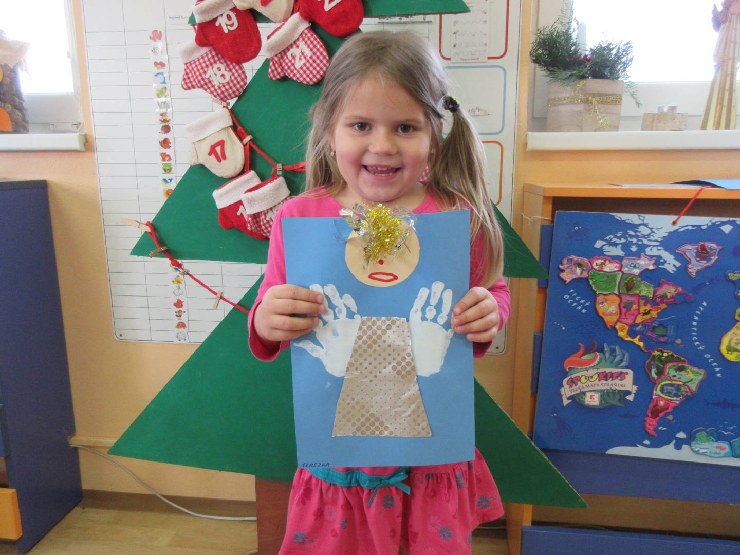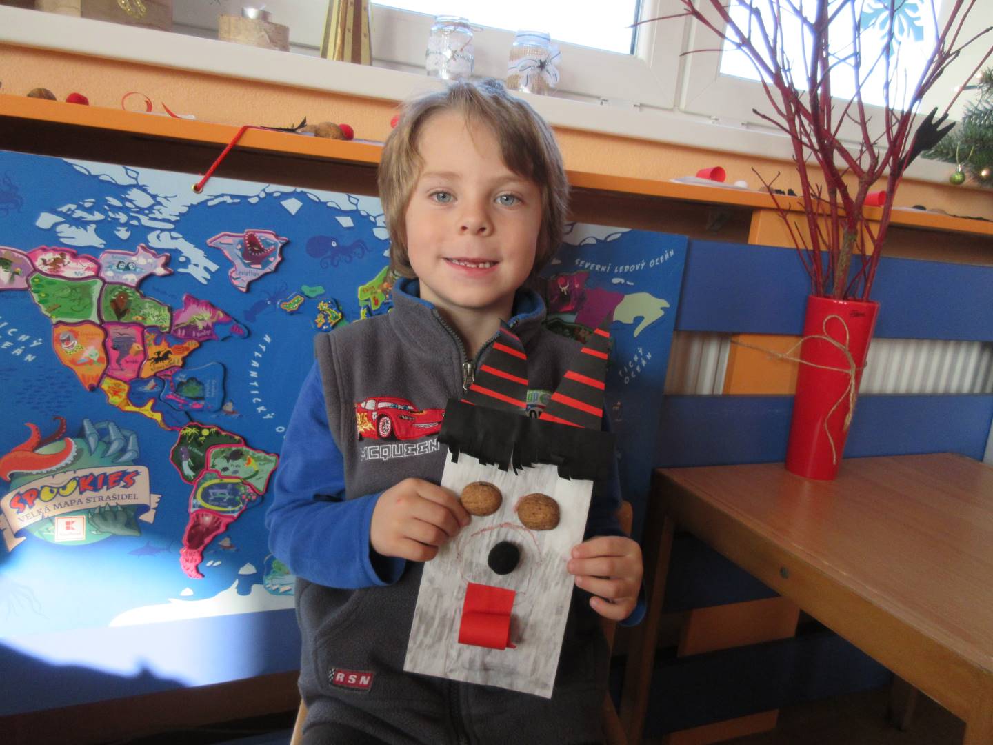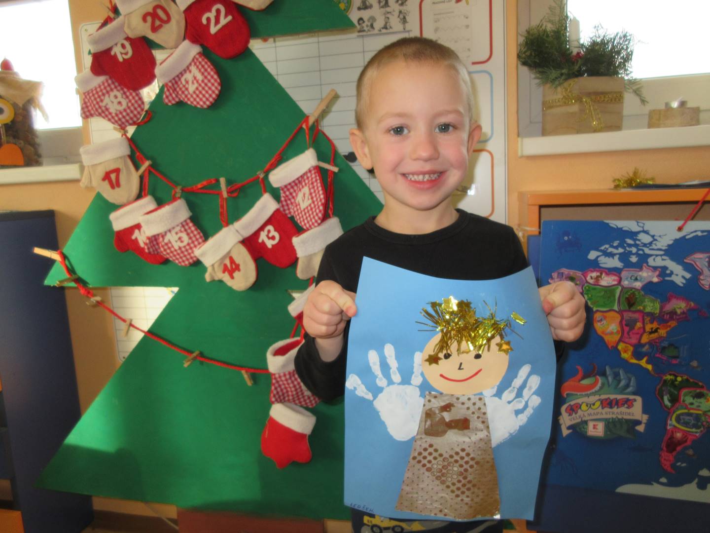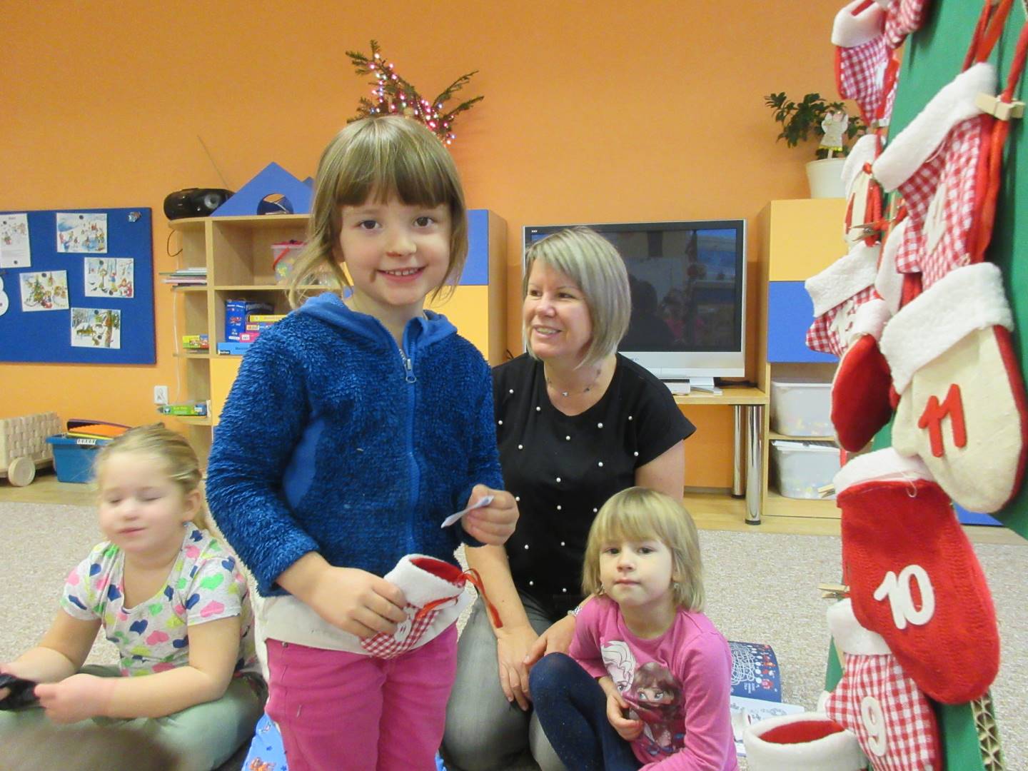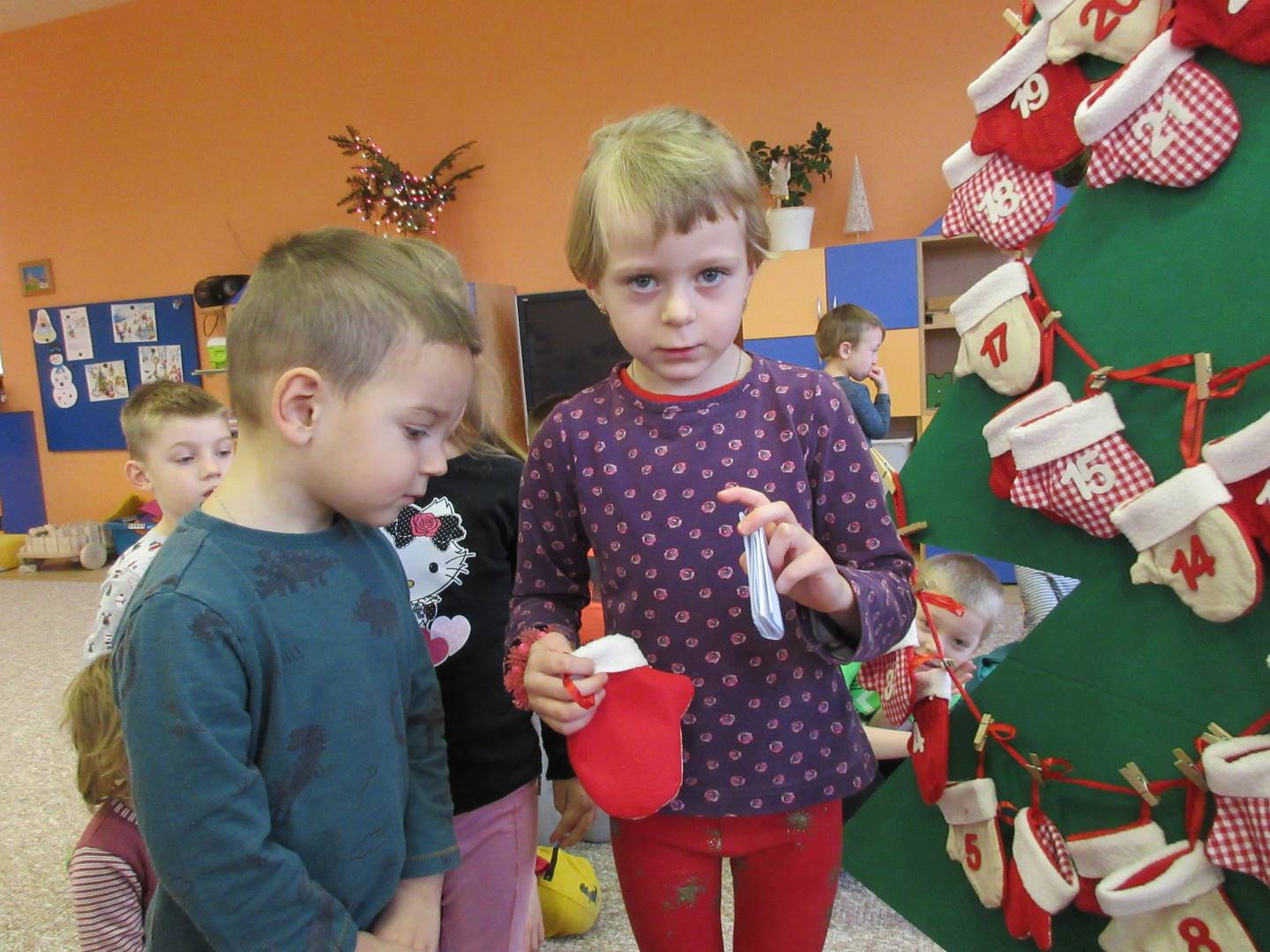 V prosinci jsme se věnovali tématu ,,Vánoční pohádka". Děti ozdobily vánoční stromeček před MŠ. Naučili jsme se nové básničky a písničky pro Mikuláše, který nás navštívil ve třídě a děti odměnil balíčkem. Postupně rozsvěcujeme svíčky na adventním věnci a také plníme úkoly z našeho adventního kalendáře. Vánoční příběh dětem vyprávěla paní Muchová, která jim poutavým způsobem přiblížila narození Ježíška. Vyrobili jsme krásná přáníčka z kapradin, zdobili perníčky a napsali dopis Ježíškovi. Předškoláci si udělali několik pracovních listů a nechybělo ani sportovní vyžití. V tělocvičně jsme se seznámili s novým gymnastickým nářadím RinoGym, které děti velmi zaujalo.