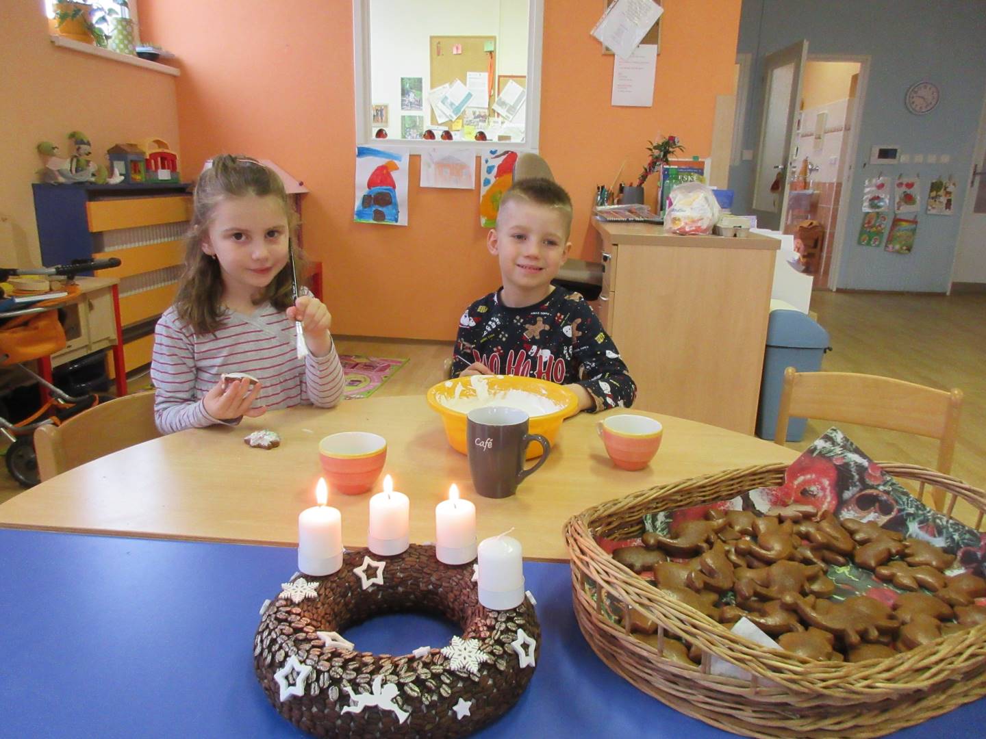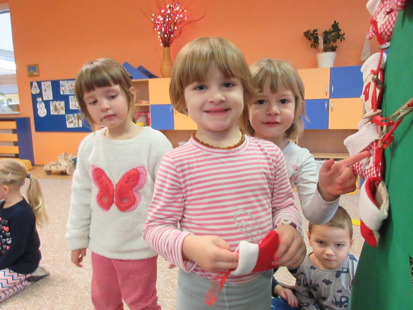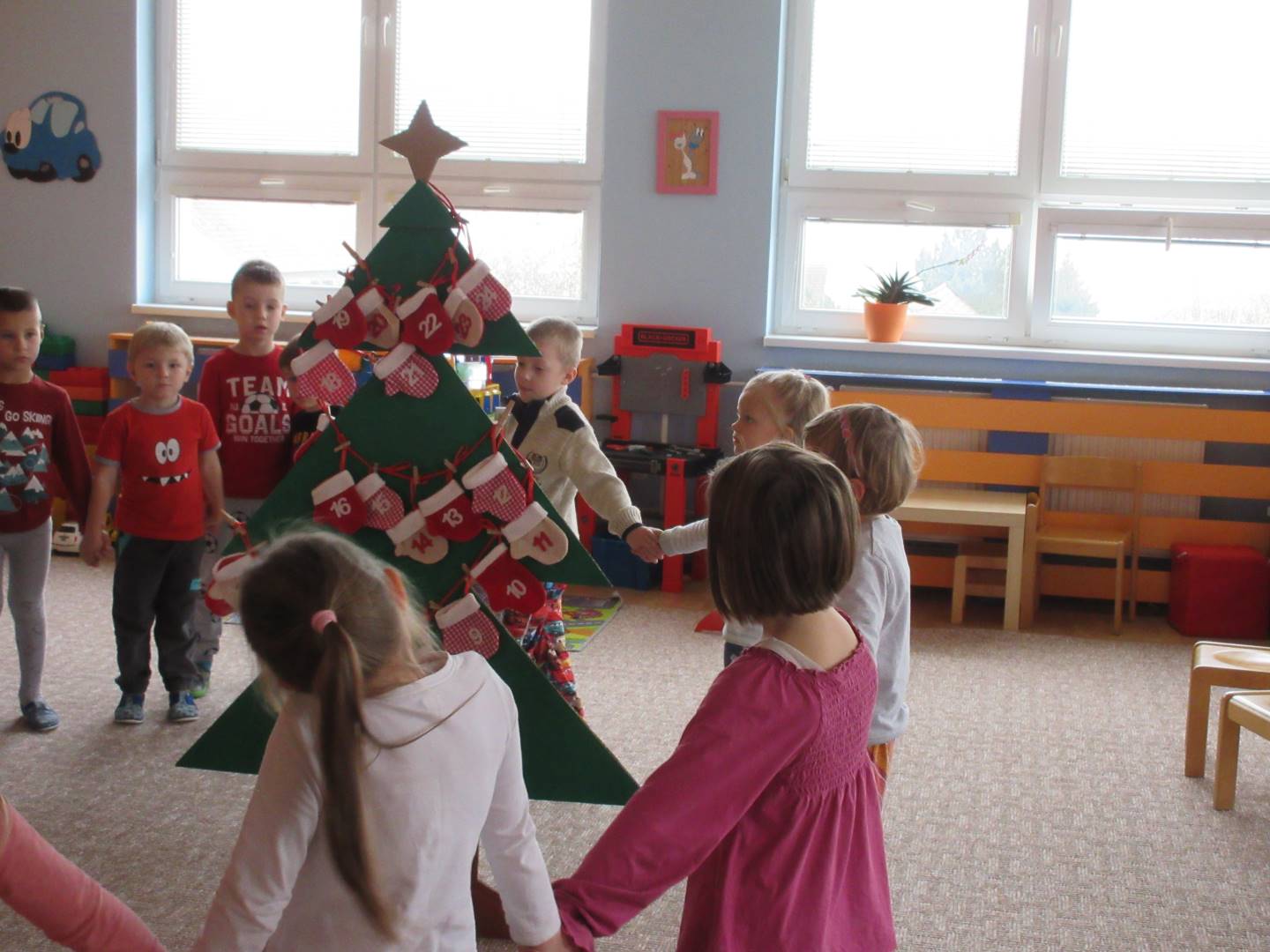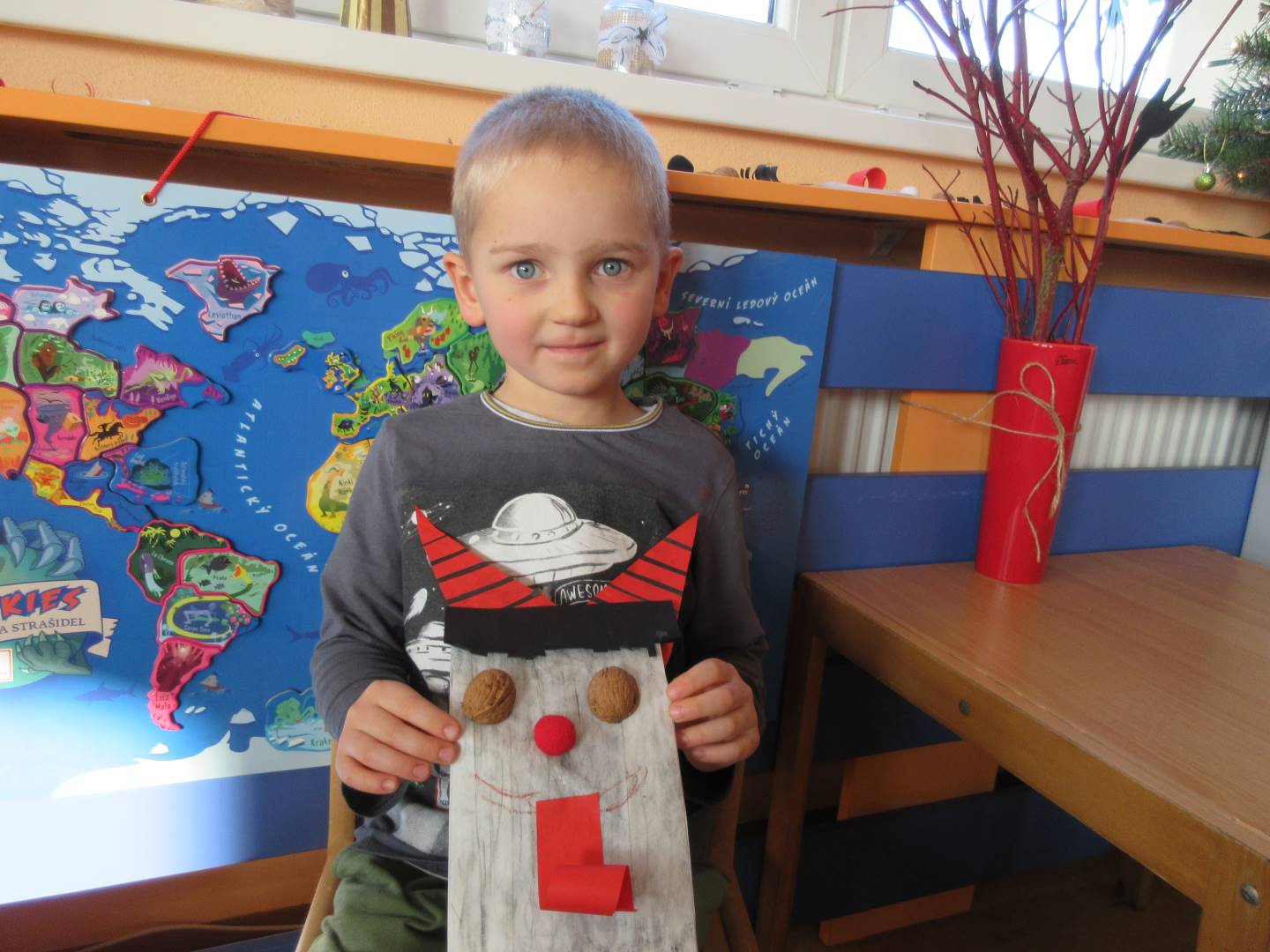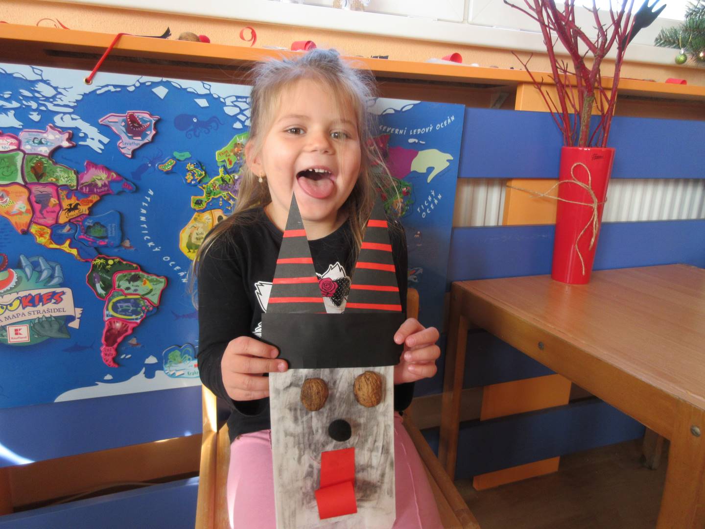 V prosinci jsme se věnovali tématu ,,Vánoční pohádka". Děti ozdobily vánoční stromeček před MŠ. Naučili jsme se nové básničky a písničky pro Mikuláše, který nás navštívil ve třídě a děti odměnil balíčkem. Postupně rozsvěcujeme svíčky na adventním věnci a také plníme úkoly z našeho adventního kalendáře. Vánoční příběh dětem vyprávěla paní Muchová, která jim poutavým způsobem přiblížila narození Ježíška. Vyrobili jsme krásná přáníčka z kapradin, zdobili perníčky a napsali dopis Ježíškovi. Předškoláci si udělali několik pracovních listů a nechybělo ani sportovní vyžití. V tělocvičně jsme se seznámili s novým gymnastickým nářadím RinoGym, které děti velmi zaujalo.