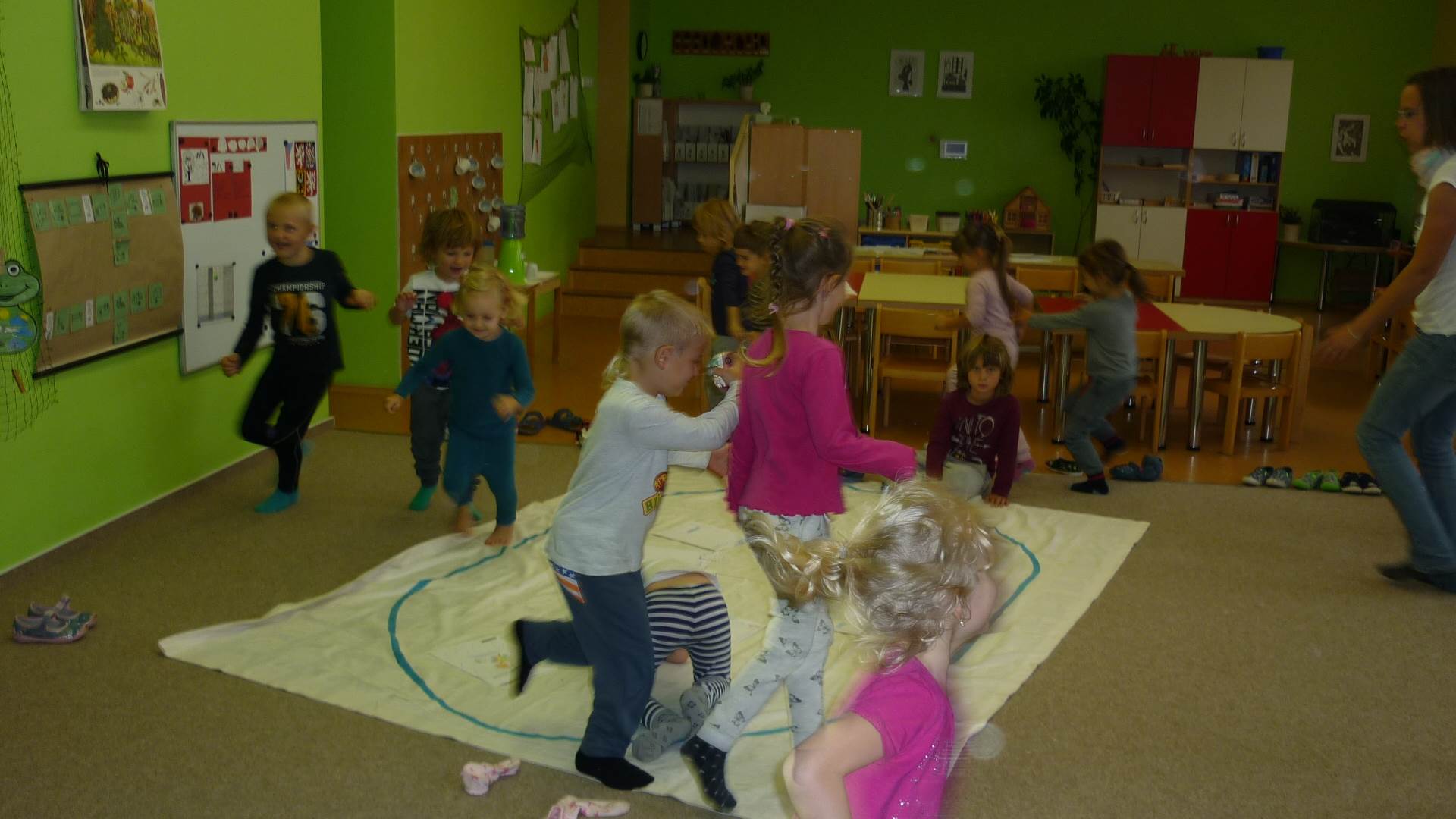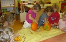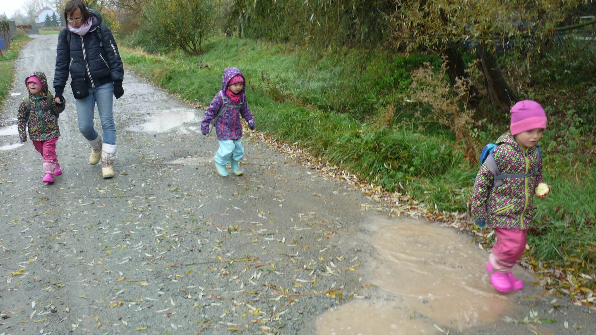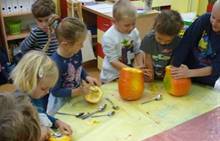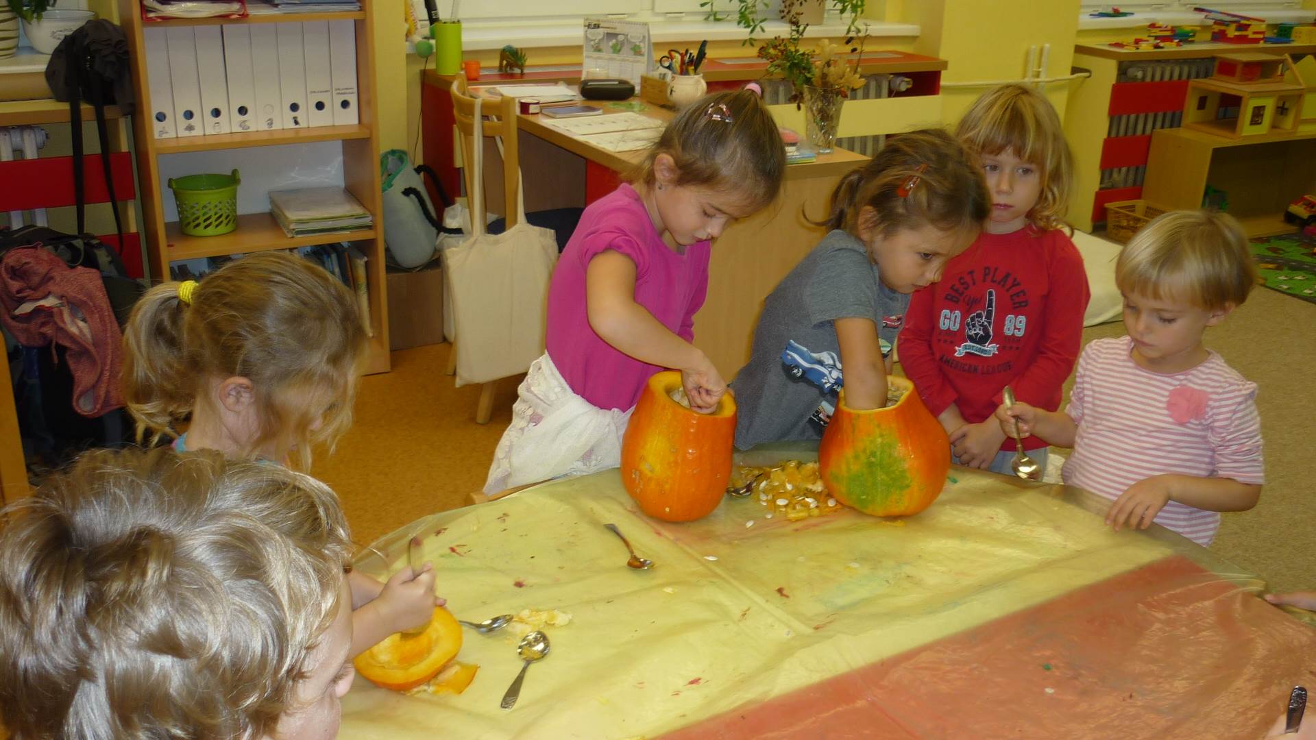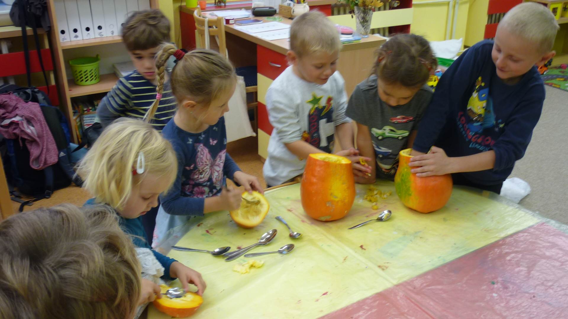 Týden jsme začali výletem do Skalice nad Svitavou. Byli jsme pozvaní do školy, kam teď chodí náš kamarád Elda. Zúčastnili jsme se tu hudebního pořadu Ladovy obrázky. Další den jsme si to už užívali u maringotky. Vyráběli jsme větrný rukáv, papírové draky a hráli si s dračími ocásky. Kluci pak holkám připravili stopovačku. Další den jsme vyráběli postýlku pro broučky a dlabali dýně. Foukal silný vítr, tak jsme šli ven později. Bylo po dešti a ještě mírně poprchávalo, ale alespoň jsme si to užili v kalužích. Povídali jsme si o počasí a napravovali škody napáchané větrem (převrácené vázy a svíčky u kostela). Na počasí jsme si hráli i ve školce a vyráběli jsme pavouky v pavučině. Na školní zahradě jsme pilně pracovali - sbírali jsme jablka a ořechy. V pátek jsme zkoušeli malovat podzimní krajinu a byli se podívat ve škole na výstavu Miss dýně. Venku jsme pak hráli různé hry a kontrolovali, jestli jsme při Uspávání broučků broučky dobře uspali. Zdá se, že ano!