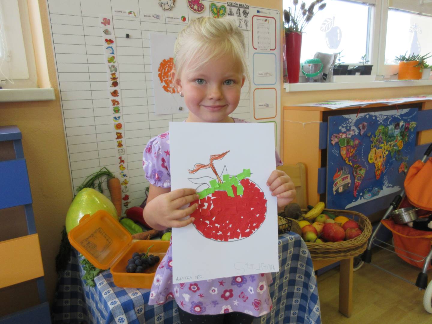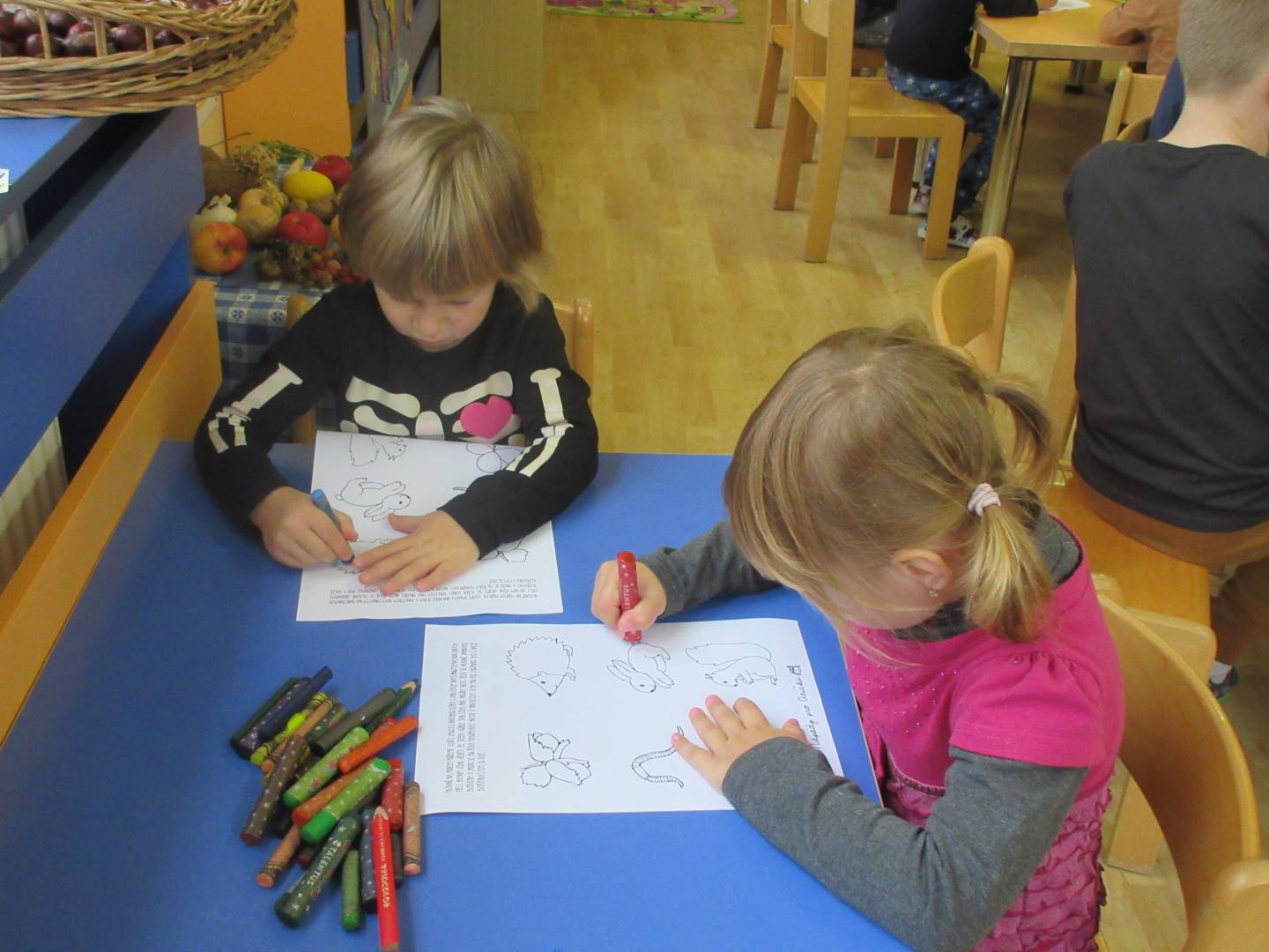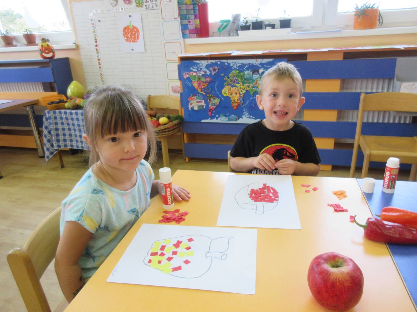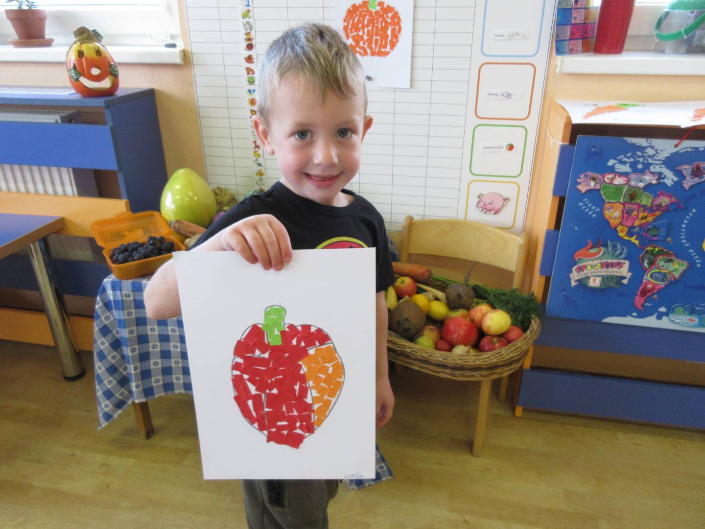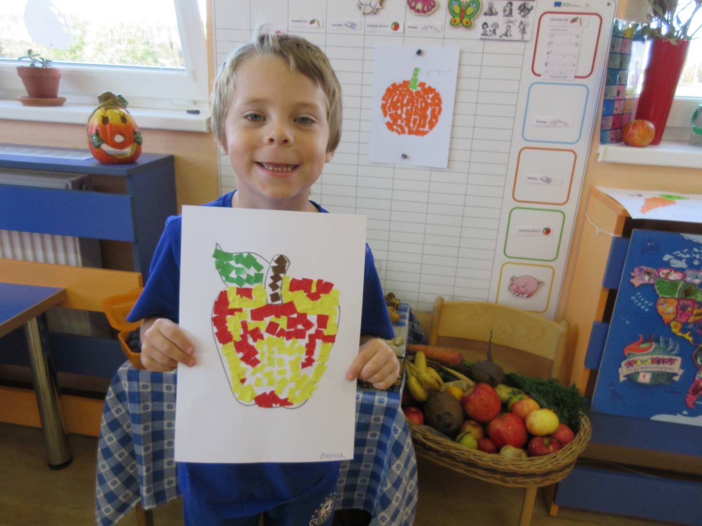 V měsíci říjnu jsme se v Beruškách věnovali tématu ,,Jablíčko se kutálelo“. Ve třídě jsme měli nádhernou výstavu ovoce a zeleniny, za kterou patří i velké poděkování rodičům. Děti se naučily rozeznávat ovoce a zeleninu, poznávání podle hmatu, chuti a čichu. Zahráli jsme si hru s barvičkami a říkanku ,,Barvy ovoce“. Vyprávěli jsme si pohádku ,,O veliké řepě“ a naučili se říkanku s pohybem ,,Kutálí se brambora“. Ovoce a zeleninu jsme si také vyrobili – MOZAIKA. Povídali jsme si o zvířátkách, která se ukládají k zimnímu spánku a pozorovali ježka na zahradě. Z nasbíraných kaštanů jsme si také ježečka vyrobili a naučili se novou básničku. Hodně času jsme trávili venku, hráli si a pozorovali změny v přírodě. Nechyběl ani zpěv, pracovní listy a sportovní vyžití.