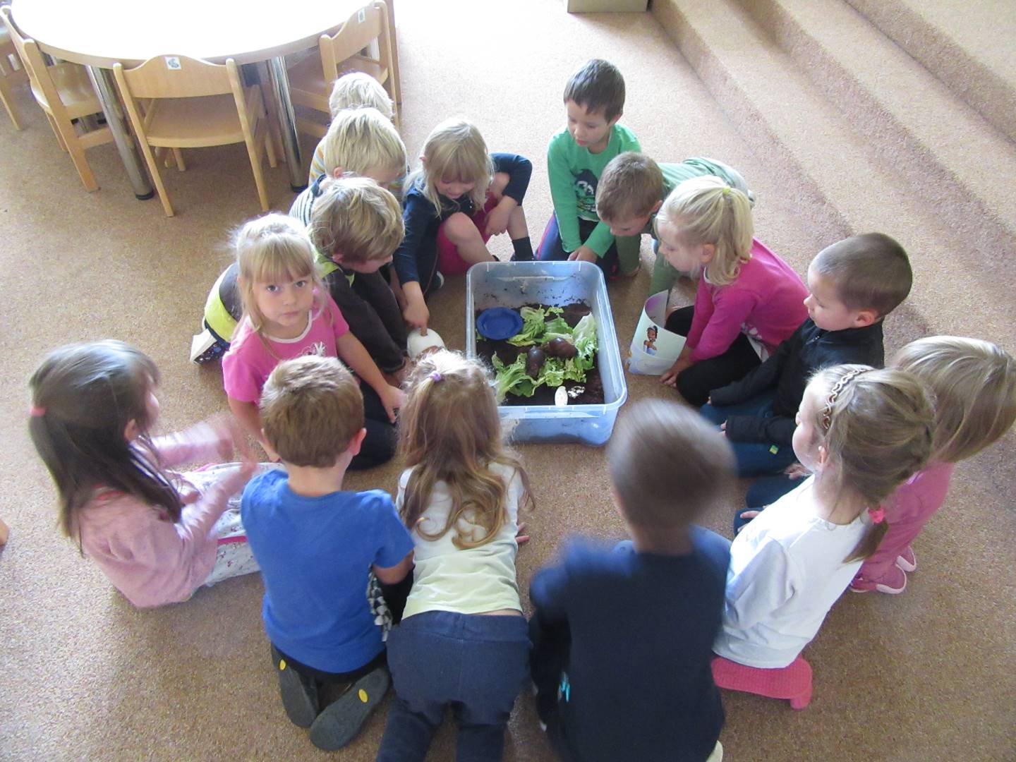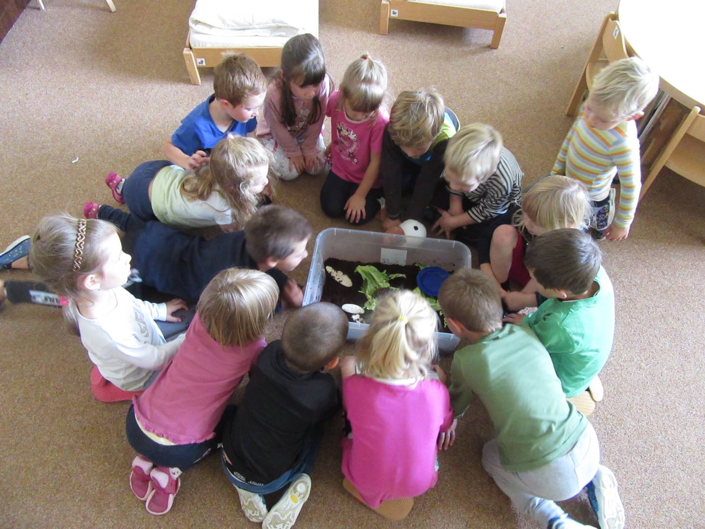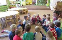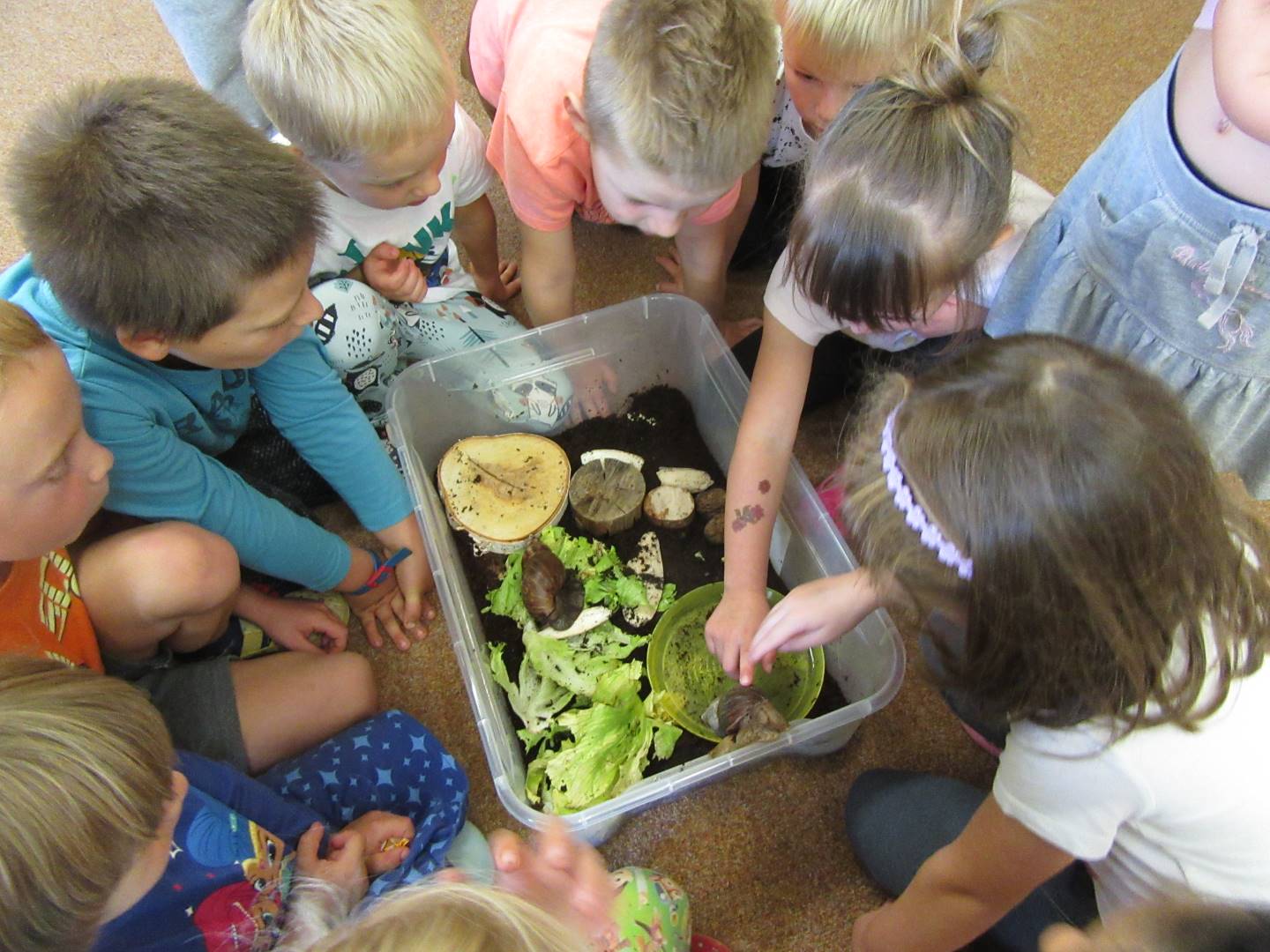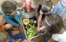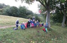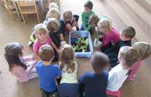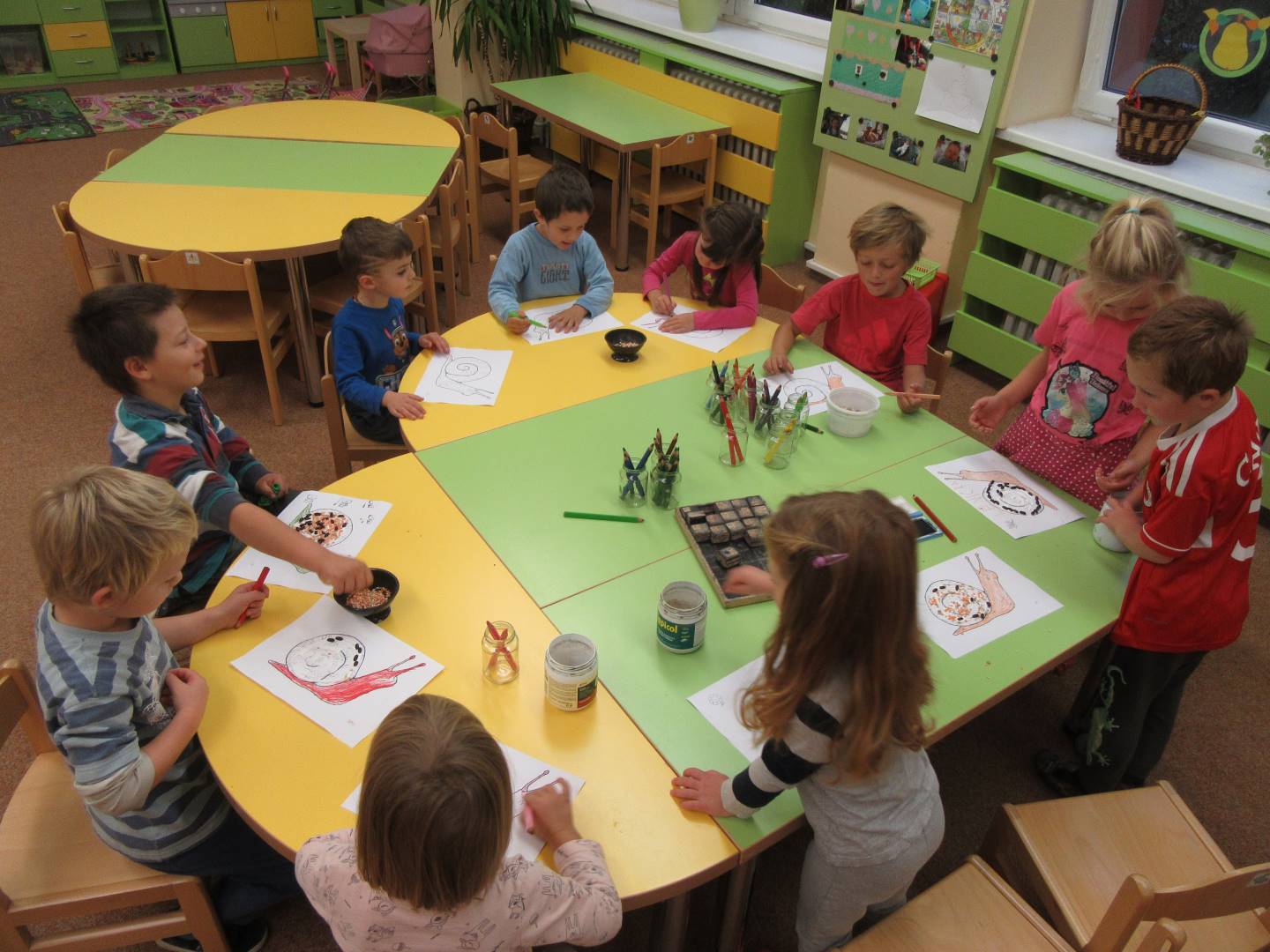 V měsíci říjnu jsme měli podtéma "U rozvážného hlemýždě". Povídali jsme si o podzimní přírodě a změnách, které nastávají v tomto období, o počasí i o tom, jaké plody nám podzim přináší. Naučili jsme se básničku s pohybem o šnekovi a každý si jednoho šneka také vyrobil pomocí luštěnin. U maringotky si děti vyrobily strašidýlka z látky a šišky. Ve třídě jsme přivitali nové kamarády, šnečky Bleska a Maxe, pro které si děti samy vymyslely jména.