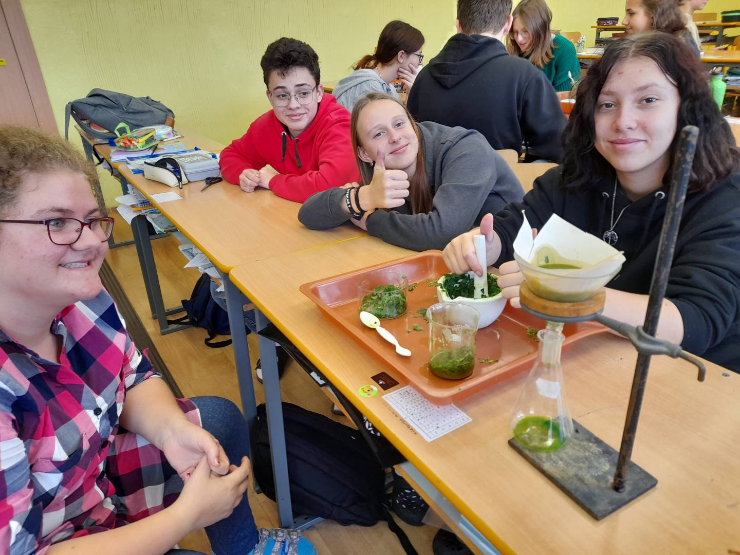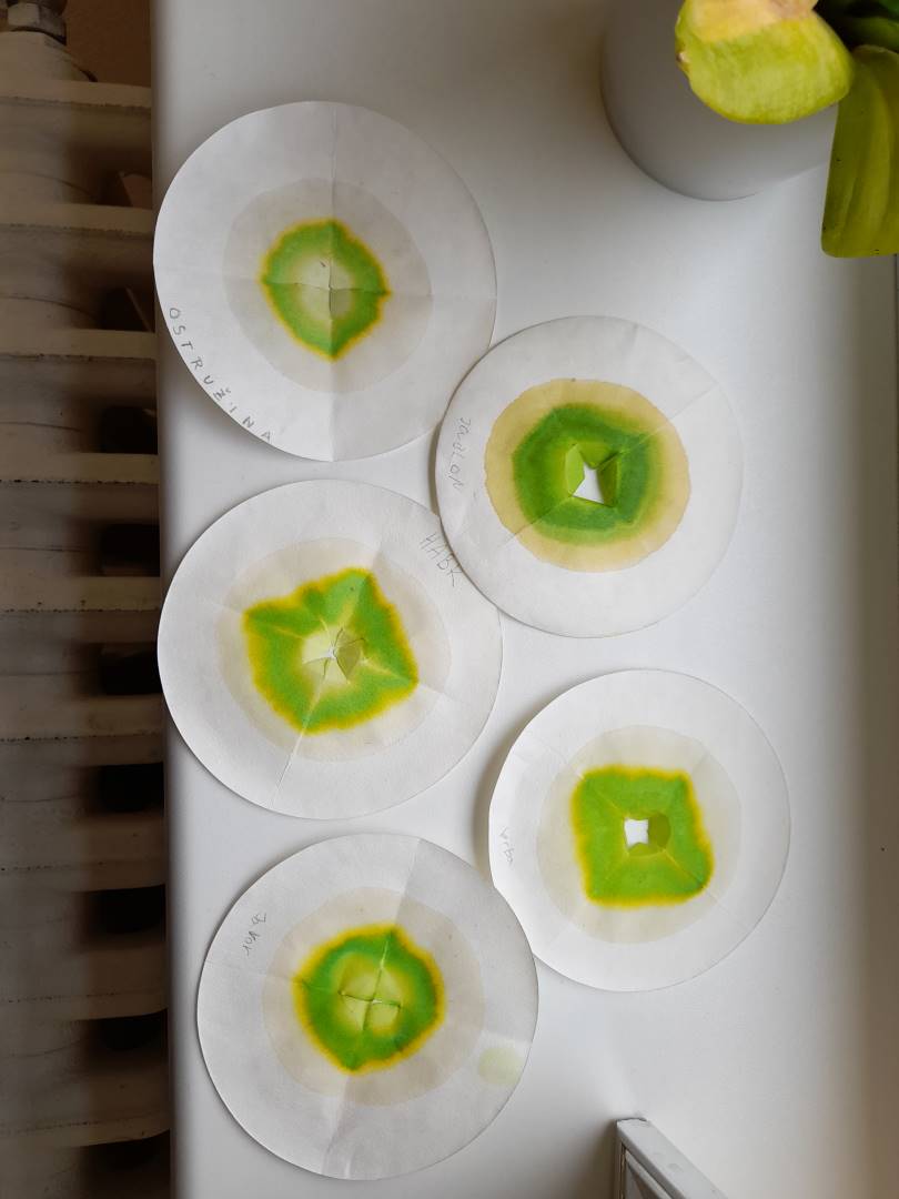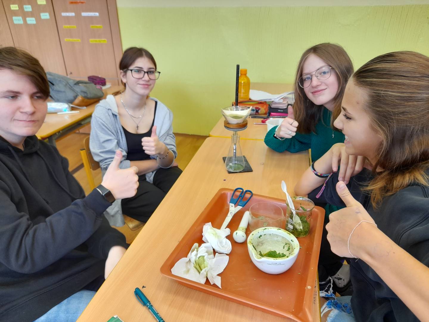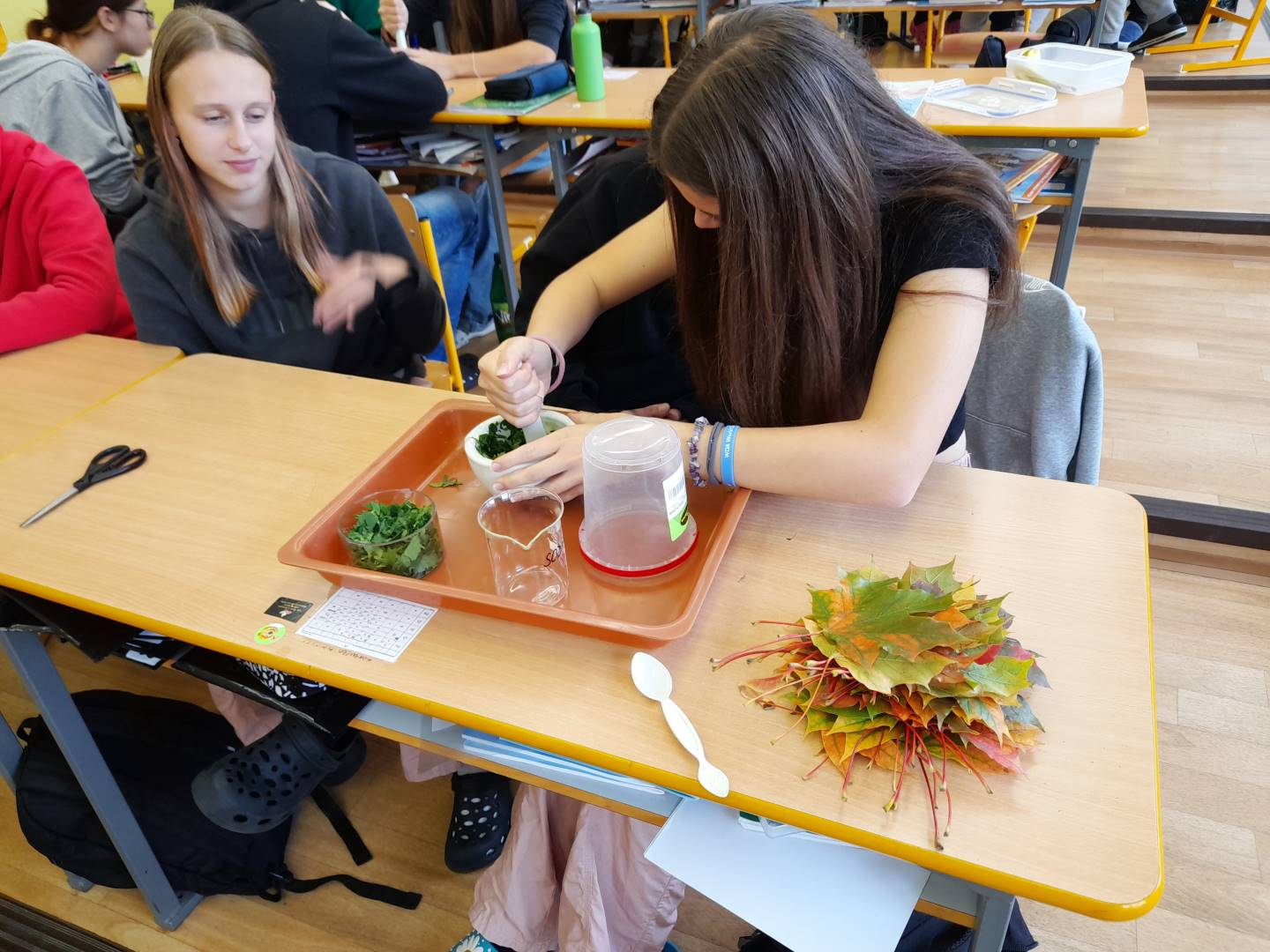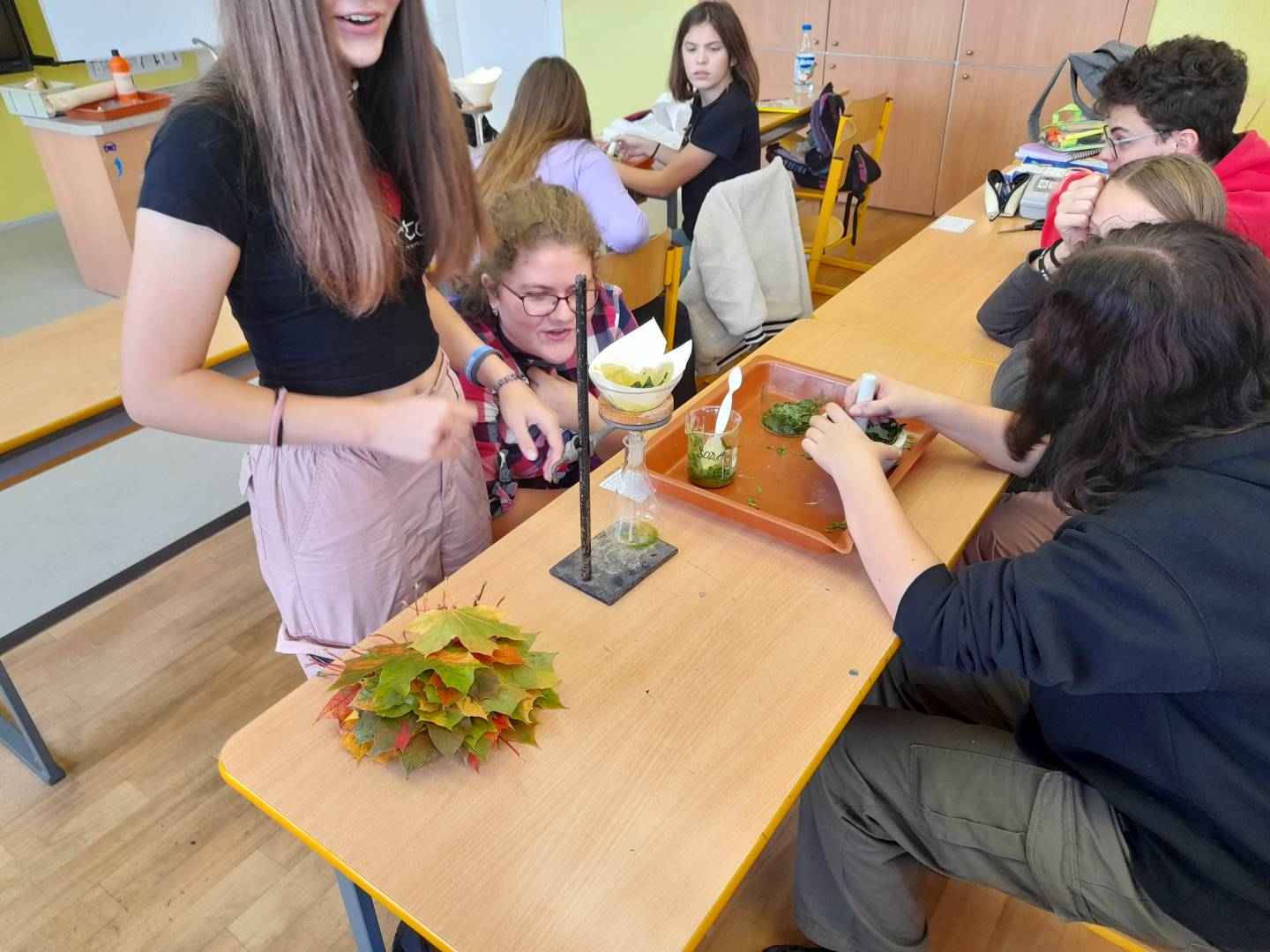Fotografie z činností různých tříd najdete v jejich třídních fotogaleriích. Zde přikládáme fotografie žáků 9. třídy, kteří v hodinách přírodopisu, fyziky a chemie zjišťovali, proč listy stromů na podzim mění barvy - pomocí chromatografie rozdělovali listová barviva na jednotlivé složky.