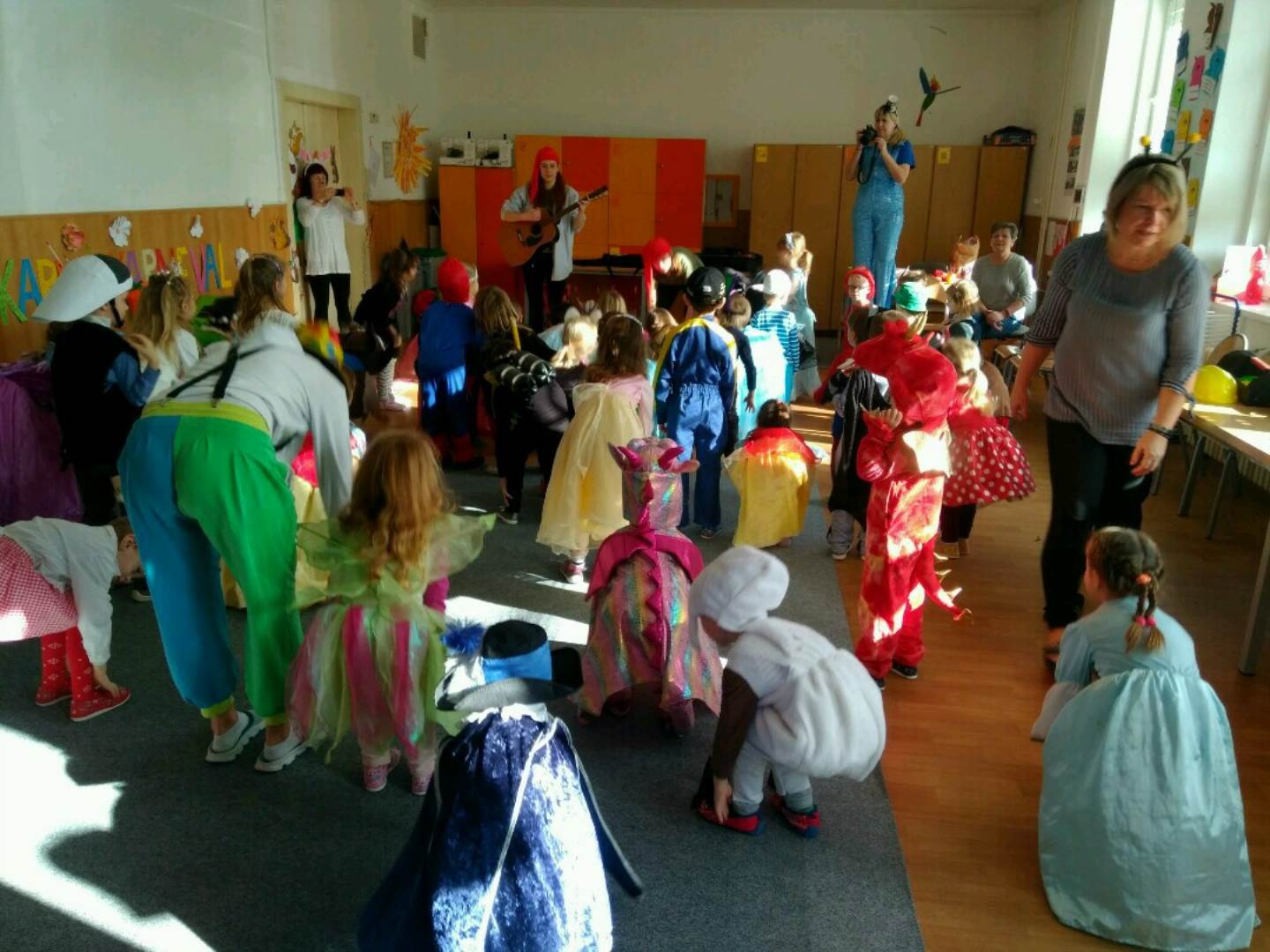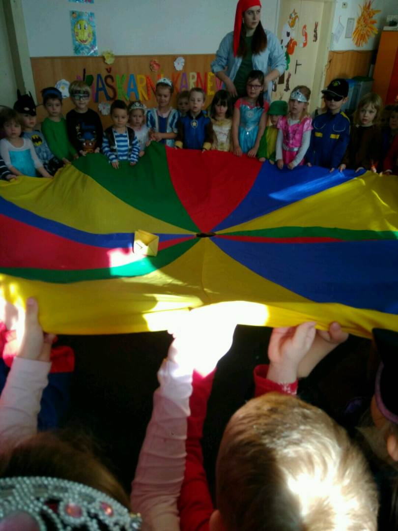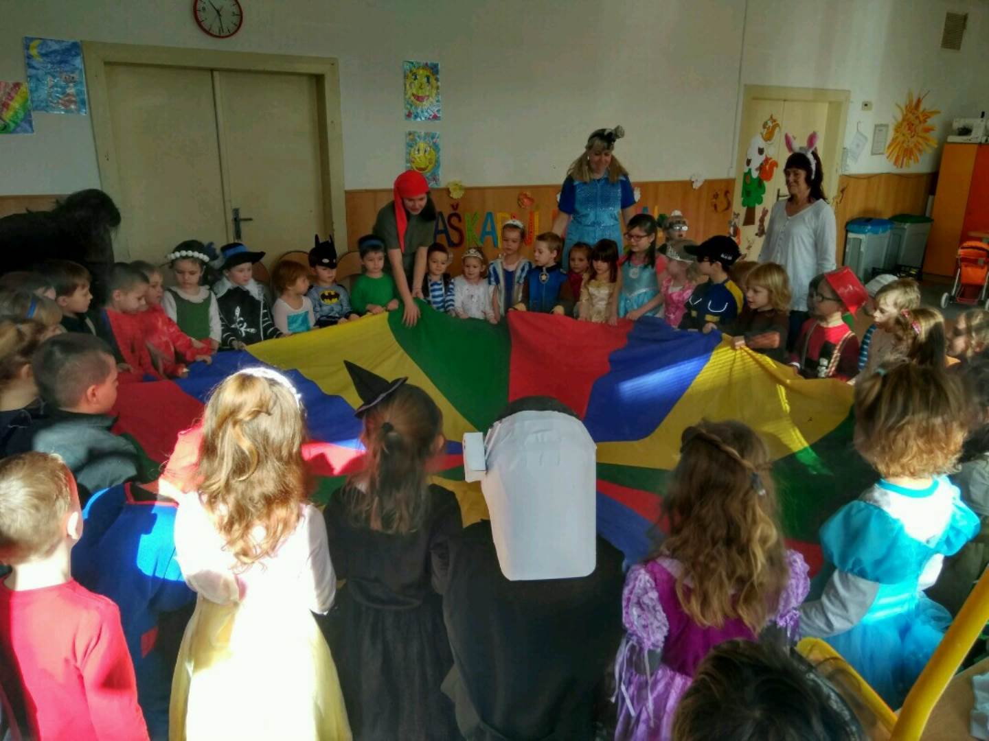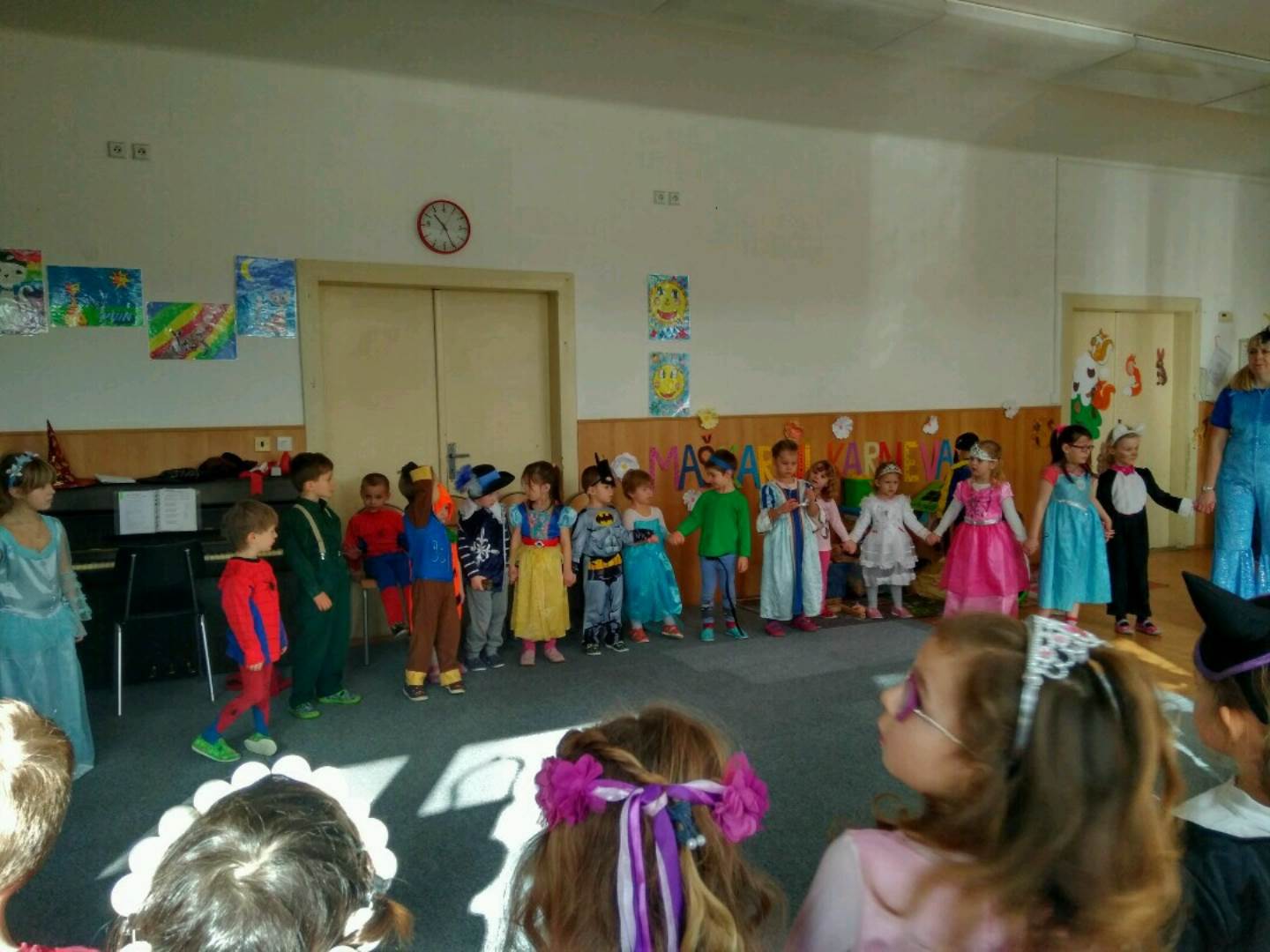 Vrátili jsme se po prázdninách do školky ve skvělé náladě. Nepřišli jsme v běžném oblečení, ale v kostýmech - hasiči, superhrdinové, různá zvířátka, pohádkové postavy atd. V prostorách školy (družině) se odehrál masopust, který organizovali dva skřítci (studentky z pedagogické školy). Zahrály s dětmi hry, zpívalo se a tancovalo.