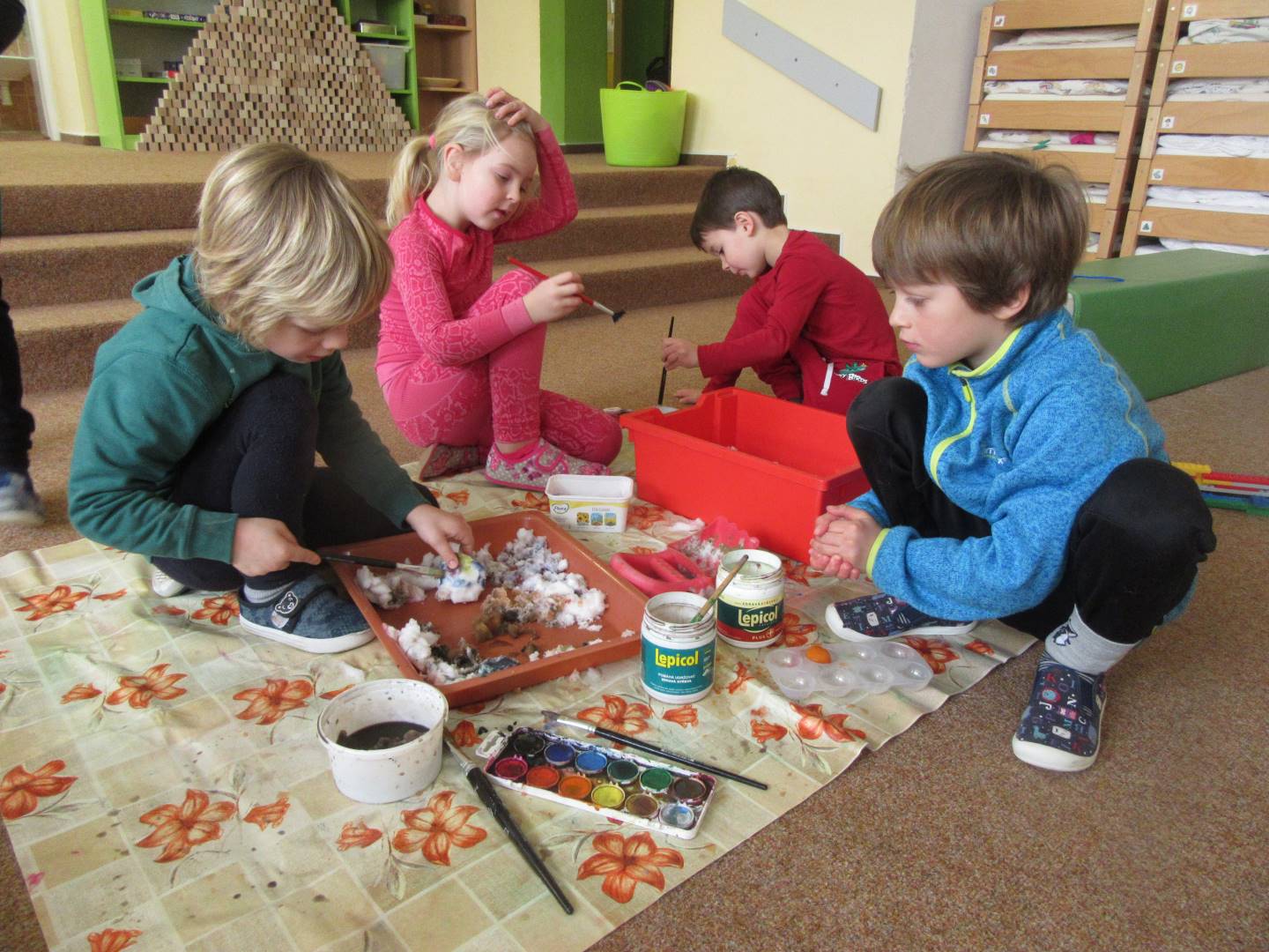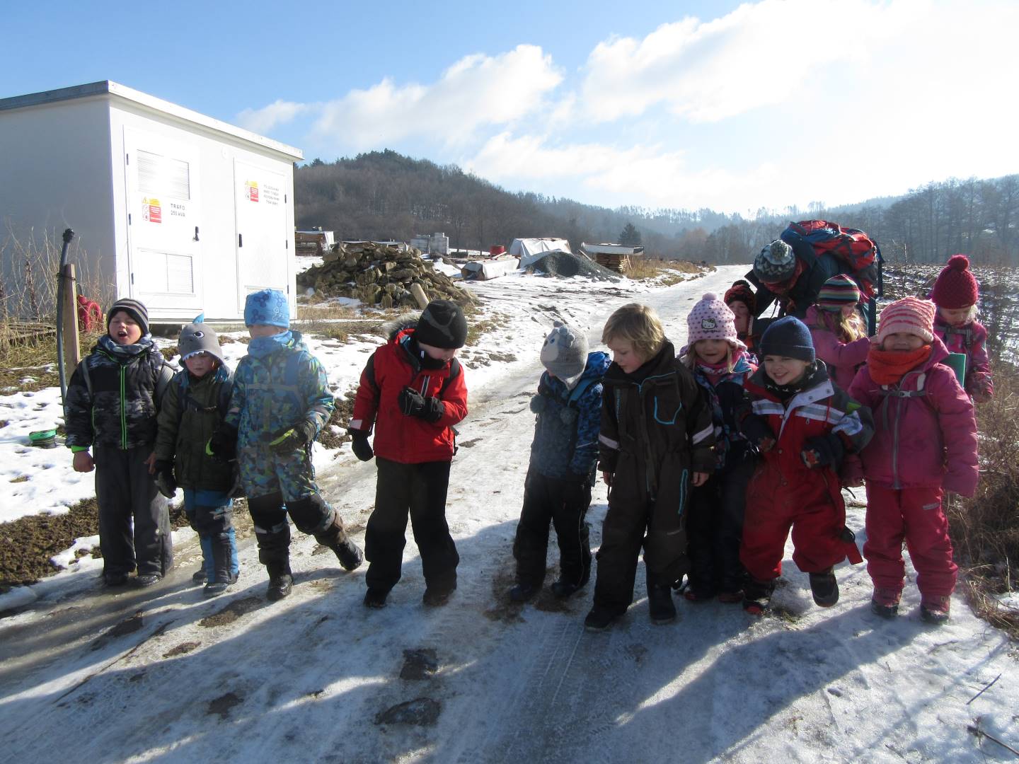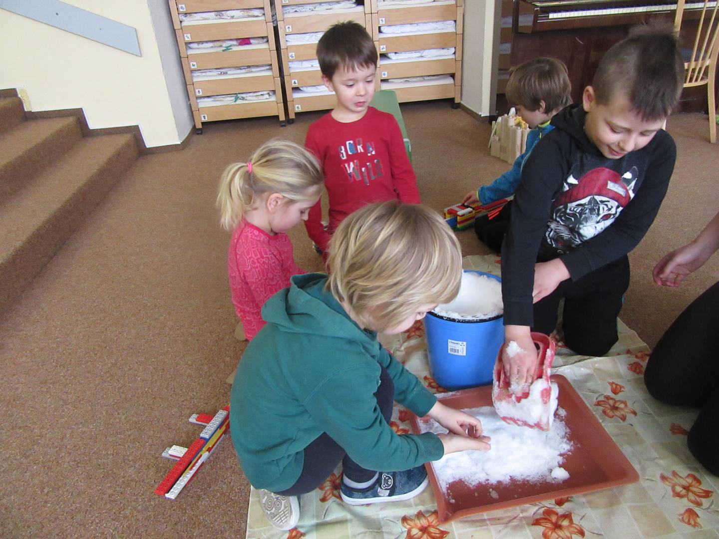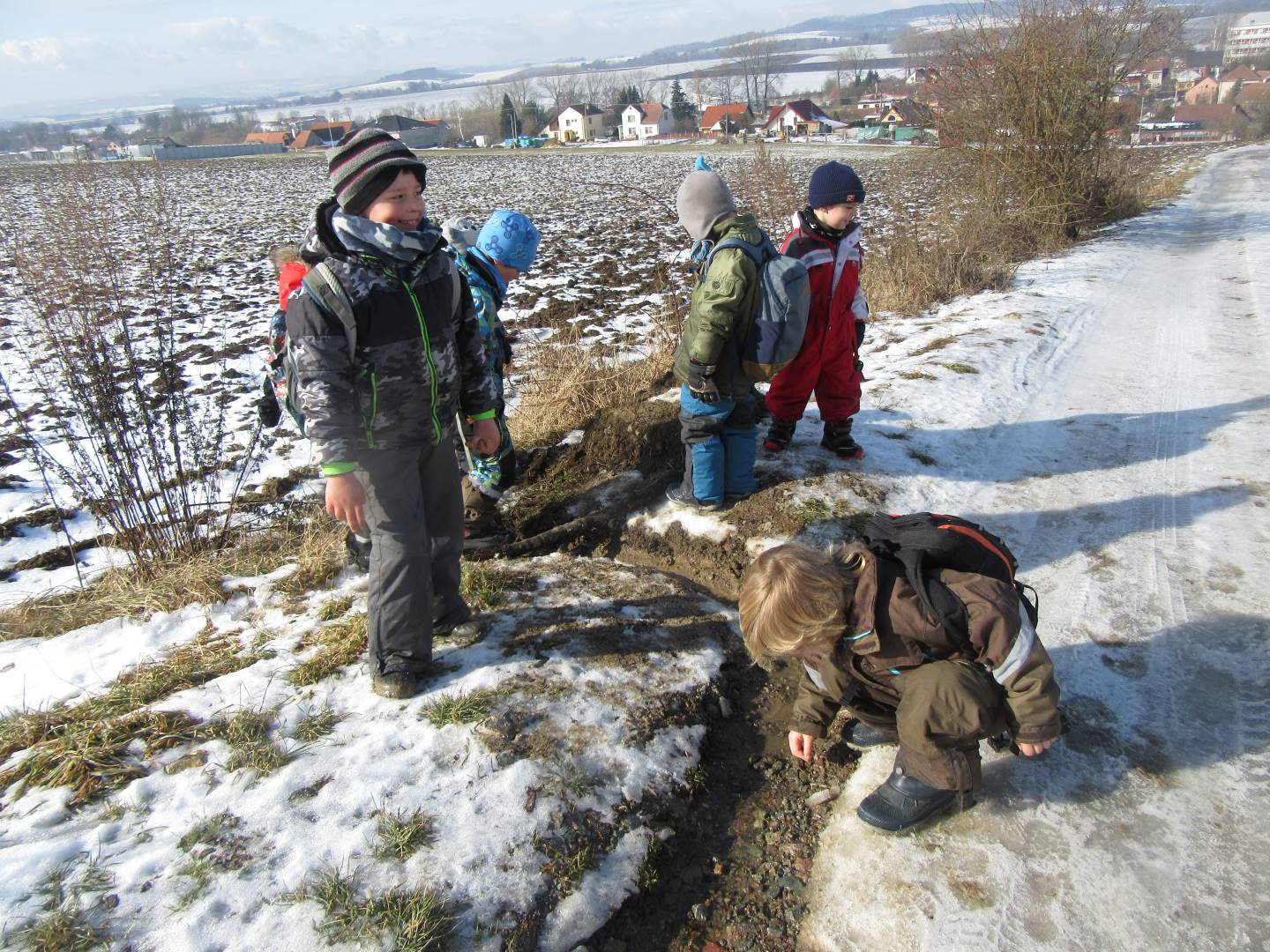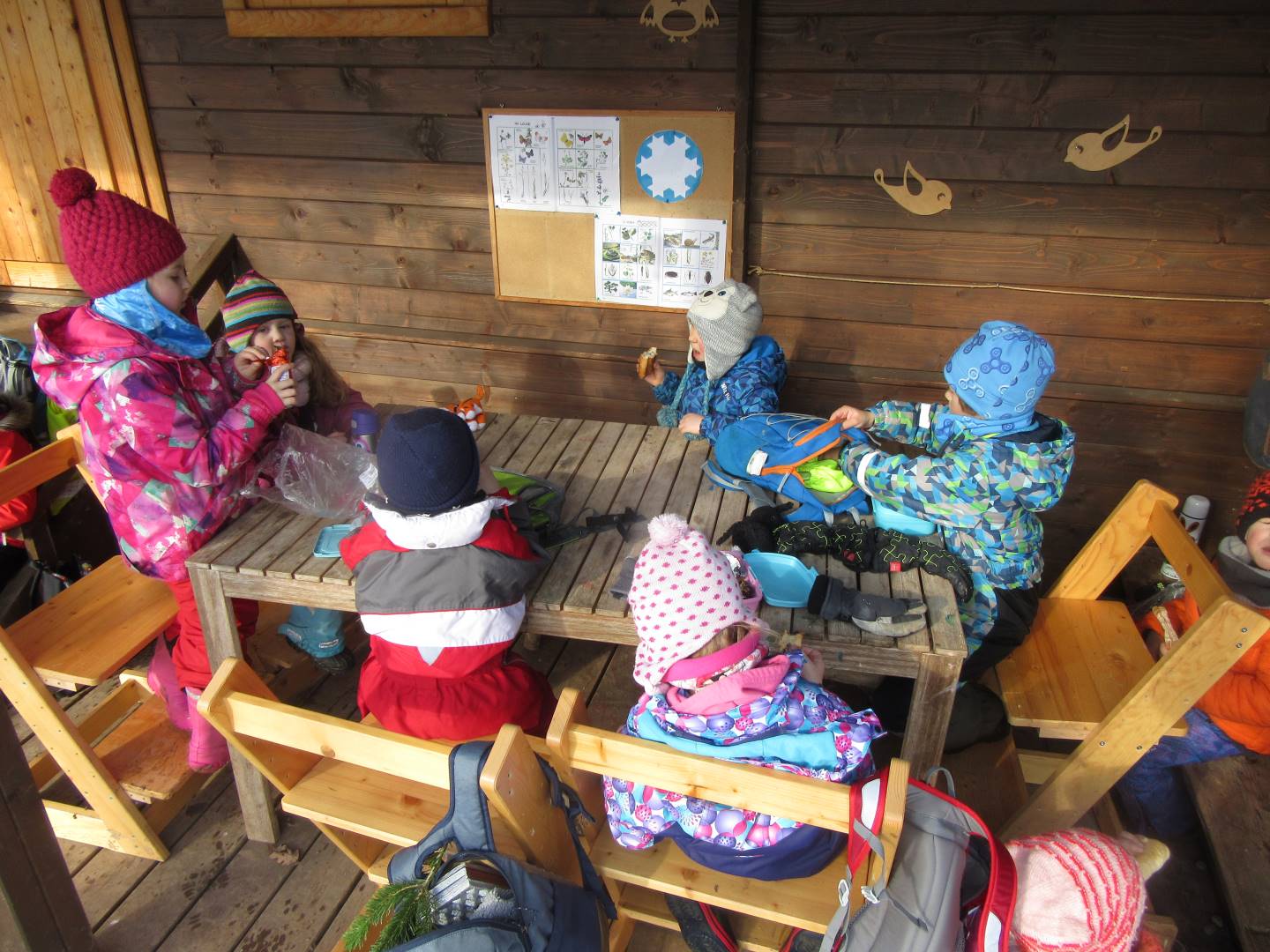 Máme za sebou opravdu mrazivý únor. Sníh a led si děti užívaly všemi smysly. Většinu měsíce jsme fungovali v běžném lesním režimu. Tedy středa a pátek program uvnitř a okolo školky, kdy jsme navštěvovali tělocvičnu, ve třídě jsme zpívali, tvořili a během dopoledních procházek jsme lépe poznávali okolí školky. Pondělí, úterý a čtvrtek jsme se točili kolem lesního zázemí.