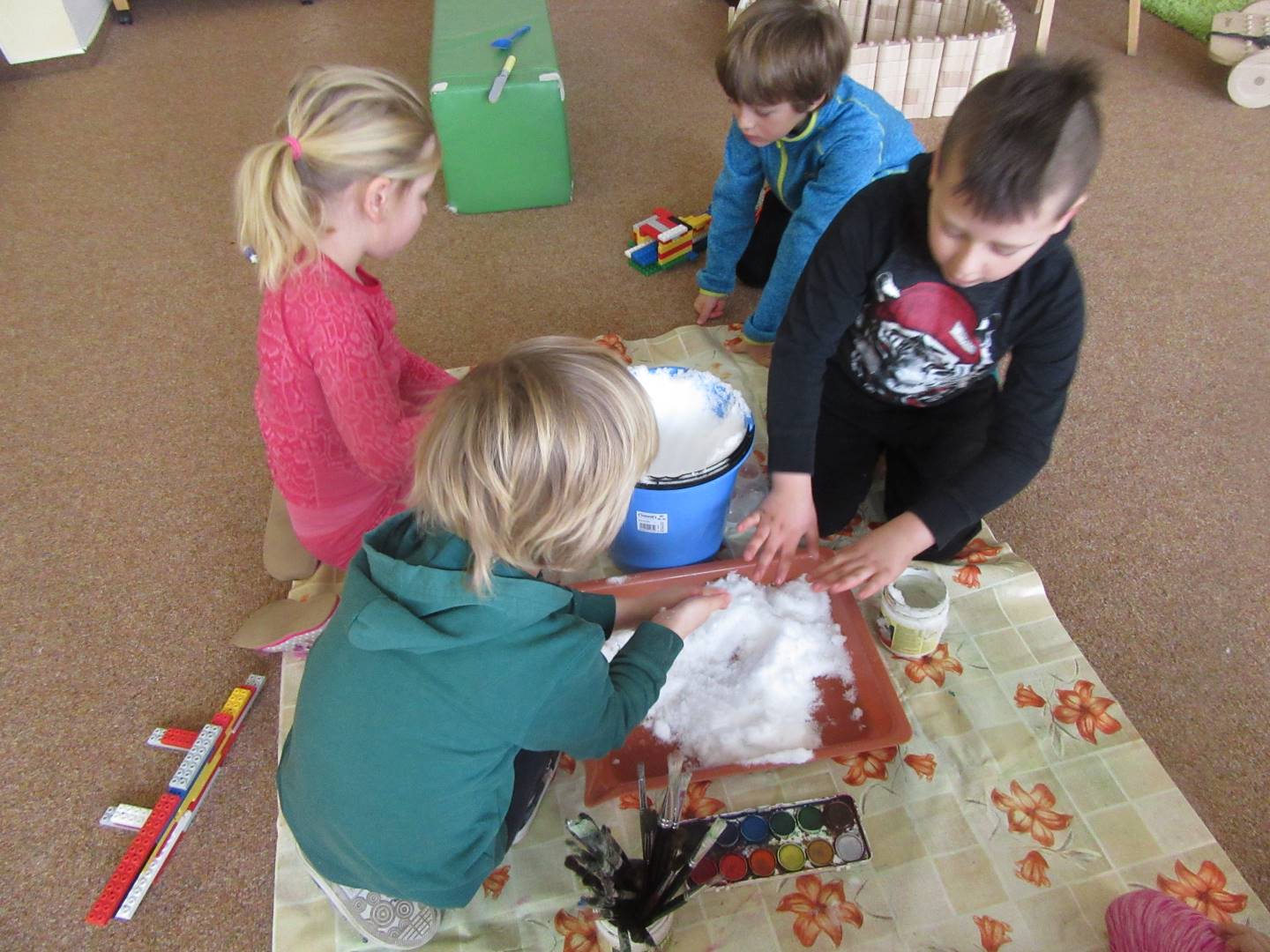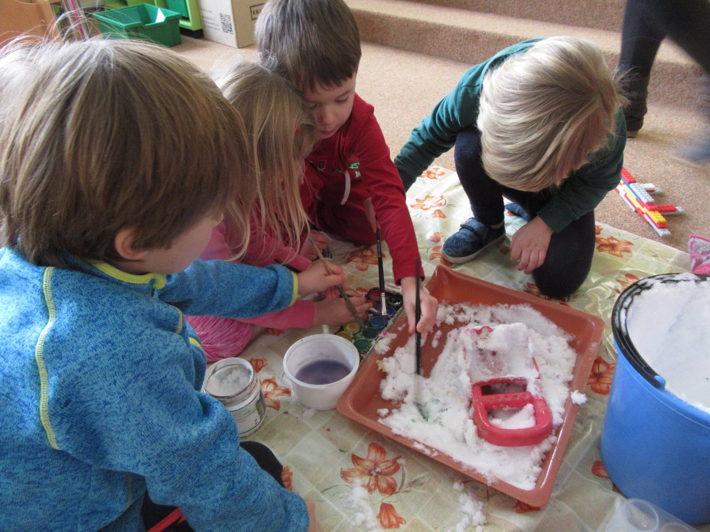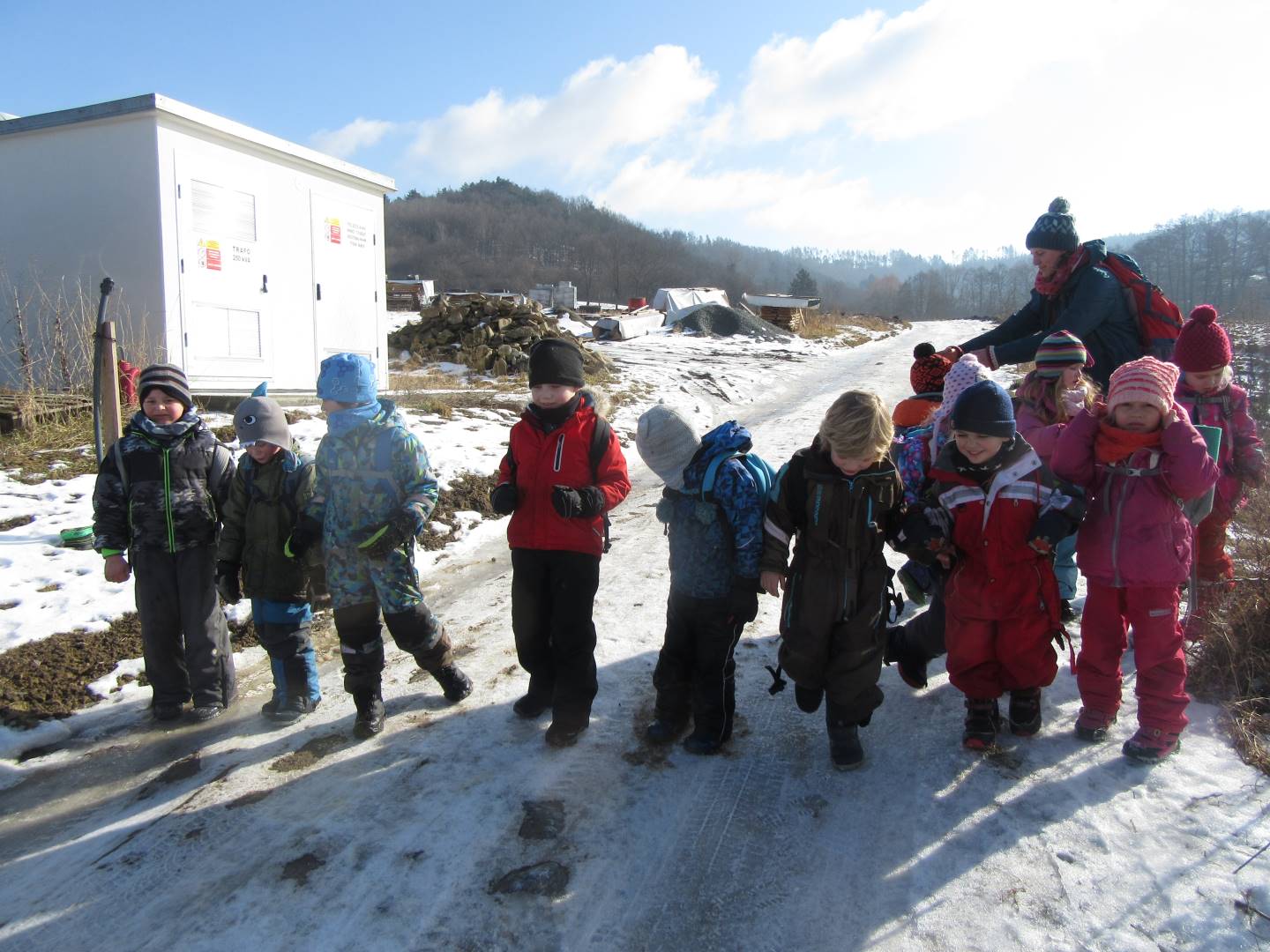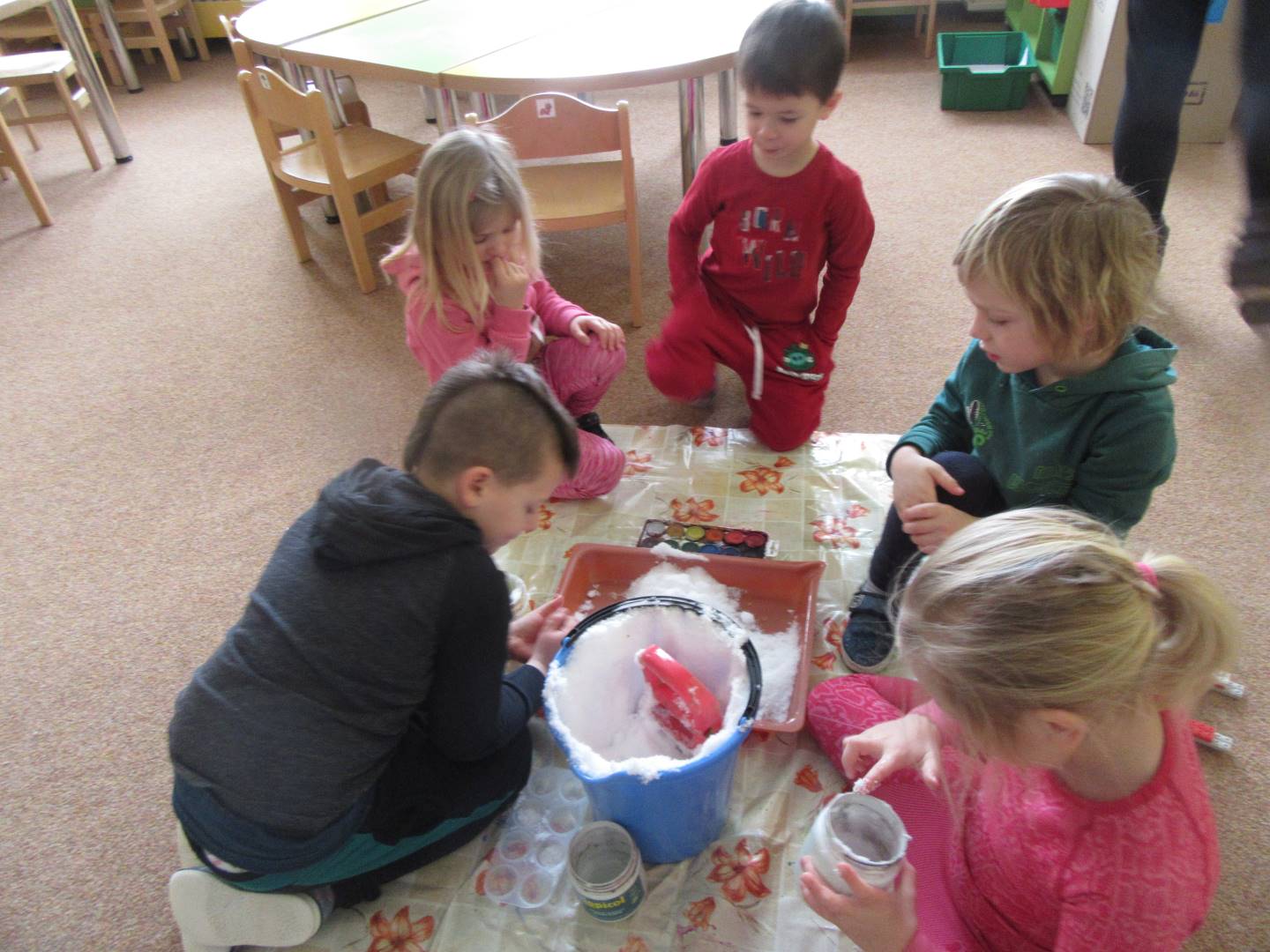 Máme za sebou opravdu mrazivý únor. Sníh a led si děti užívaly všemi smysly. Většinu měsíce jsme fungovali v běžném lesním režimu. Tedy středa a pátek program uvnitř a okolo školky, kdy jsme navštěvovali tělocvičnu, ve třídě jsme zpívali, tvořili a během dopoledních procházek jsme lépe poznávali okolí školky. Pondělí, úterý a čtvrtek jsme se točili kolem lesního zázemí.