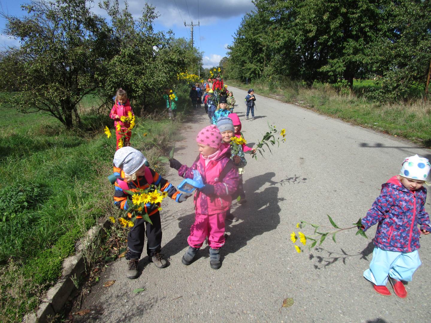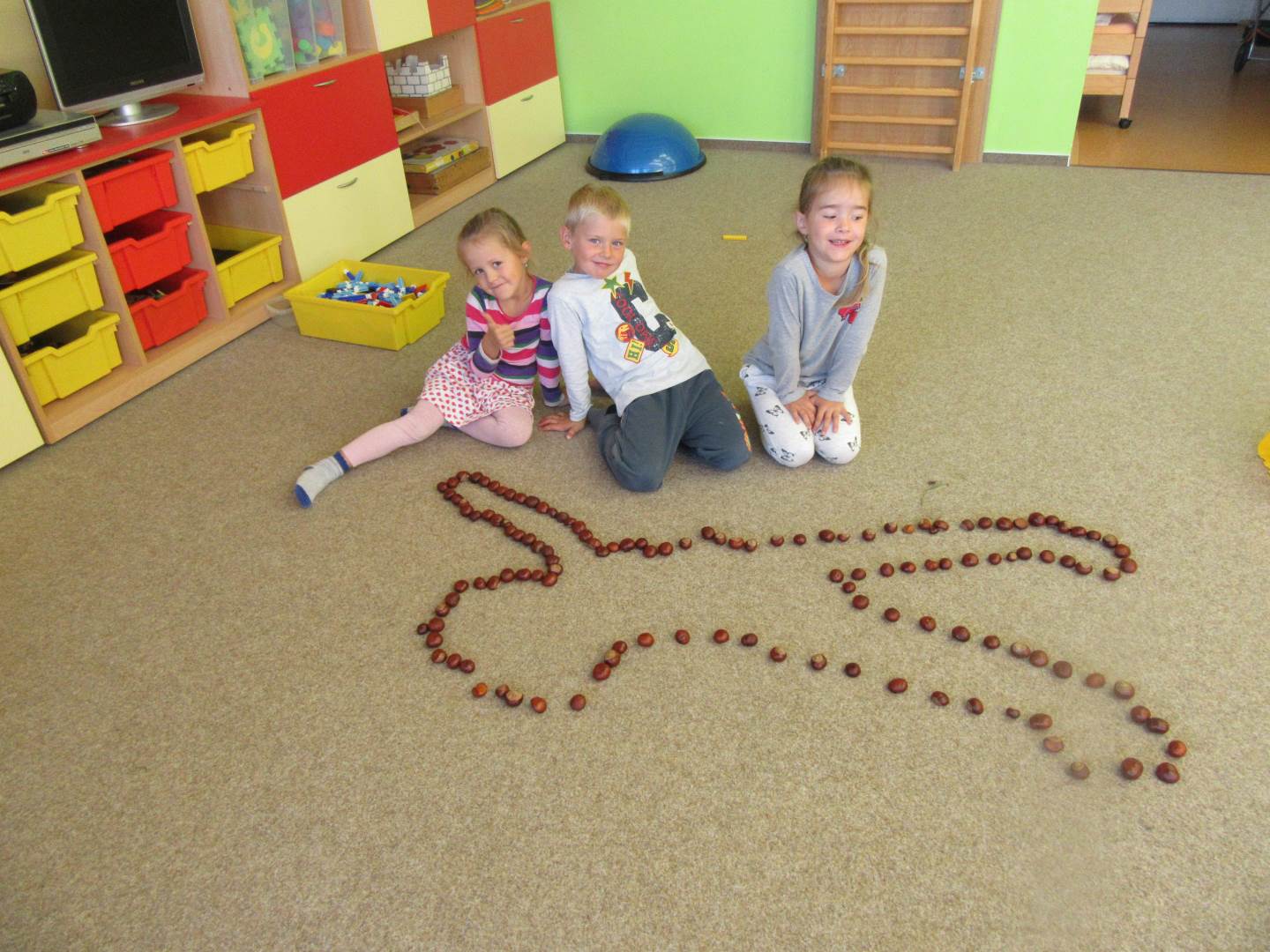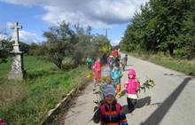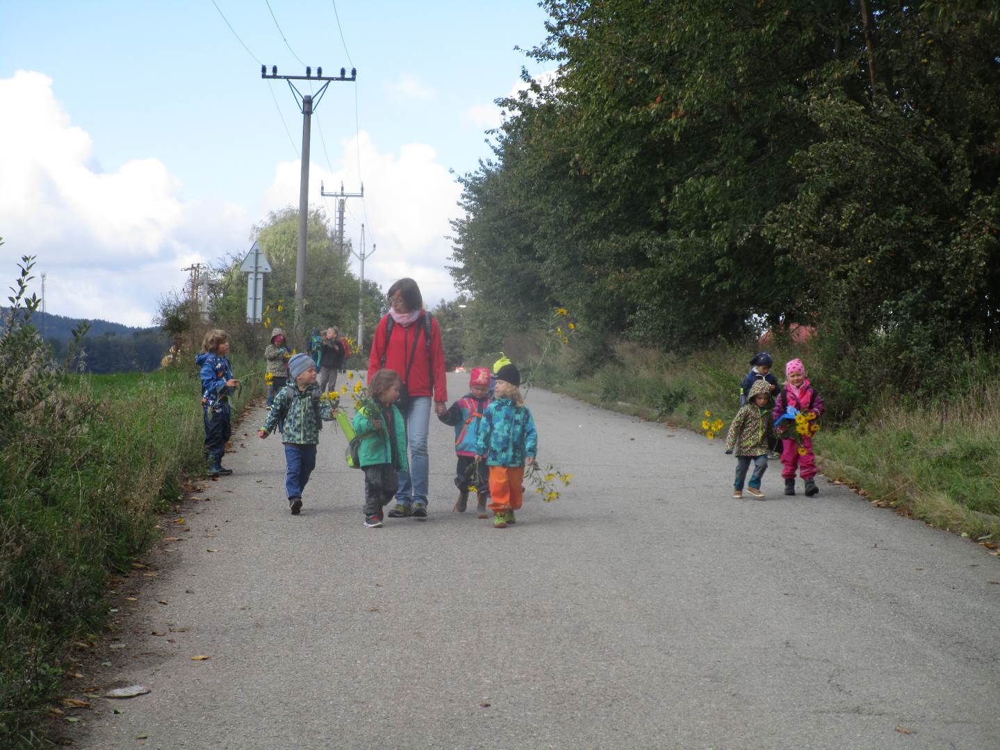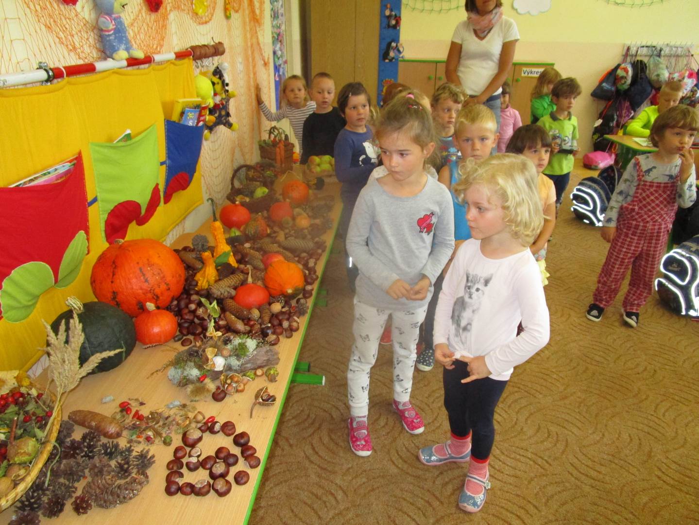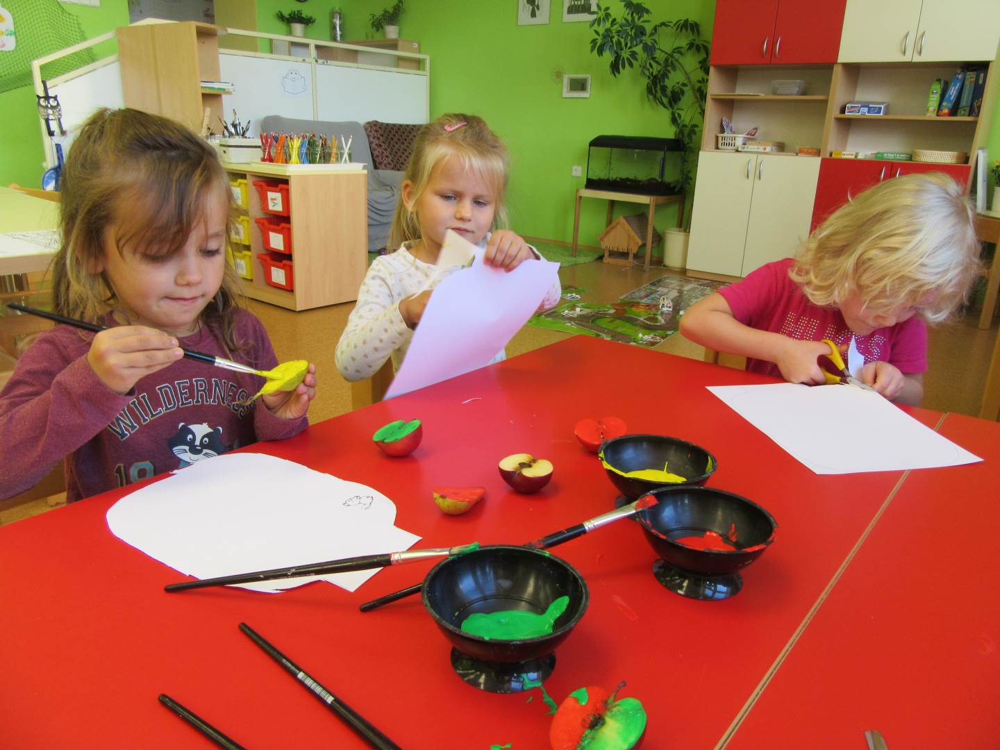 Babí léto skončilo a venku už je pěkná zima! V noci dokonce pršelo, a tak nás lákají potůčky na cestě. Jabloňová víla nám pověděla o svých kamarádkách a i tahle skupinka si maluje jablíčka. Zopakujeme si o jablíčku i říkanku a písničky a vyzkoušíme si, jak se dělá mošt. Při cestě zpět vidíme duhu! Další dny si povídáme o svatém Václavovi a připomínáme si Den české státnosti. Školáci z první třídy nás pozvali na výstavku podzimních plodin a na malou pohádku. Pak jdeme nasbírat kaštany, ať máme pro zvířátka na zimu. Zatím si s nim hrajeme. Děti ve třídě zase otiskují jablíčka do zavařovacích sklenic. Umíme také vylézt na strom. Připomínáme si odlet vlaštovek, nějaké si i vyrobíme, a pak si s nimi hrajeme. Hrajeme si i na Zlatou bránu a rádi hádáme hádnky. U maringotky si opakujeme pohádku O veliké řepě a pak si procvičujeme hmat i paměť, když hmatem poznáváme podzimní plody. Nakonec nás čekala výstava místních hasičů.