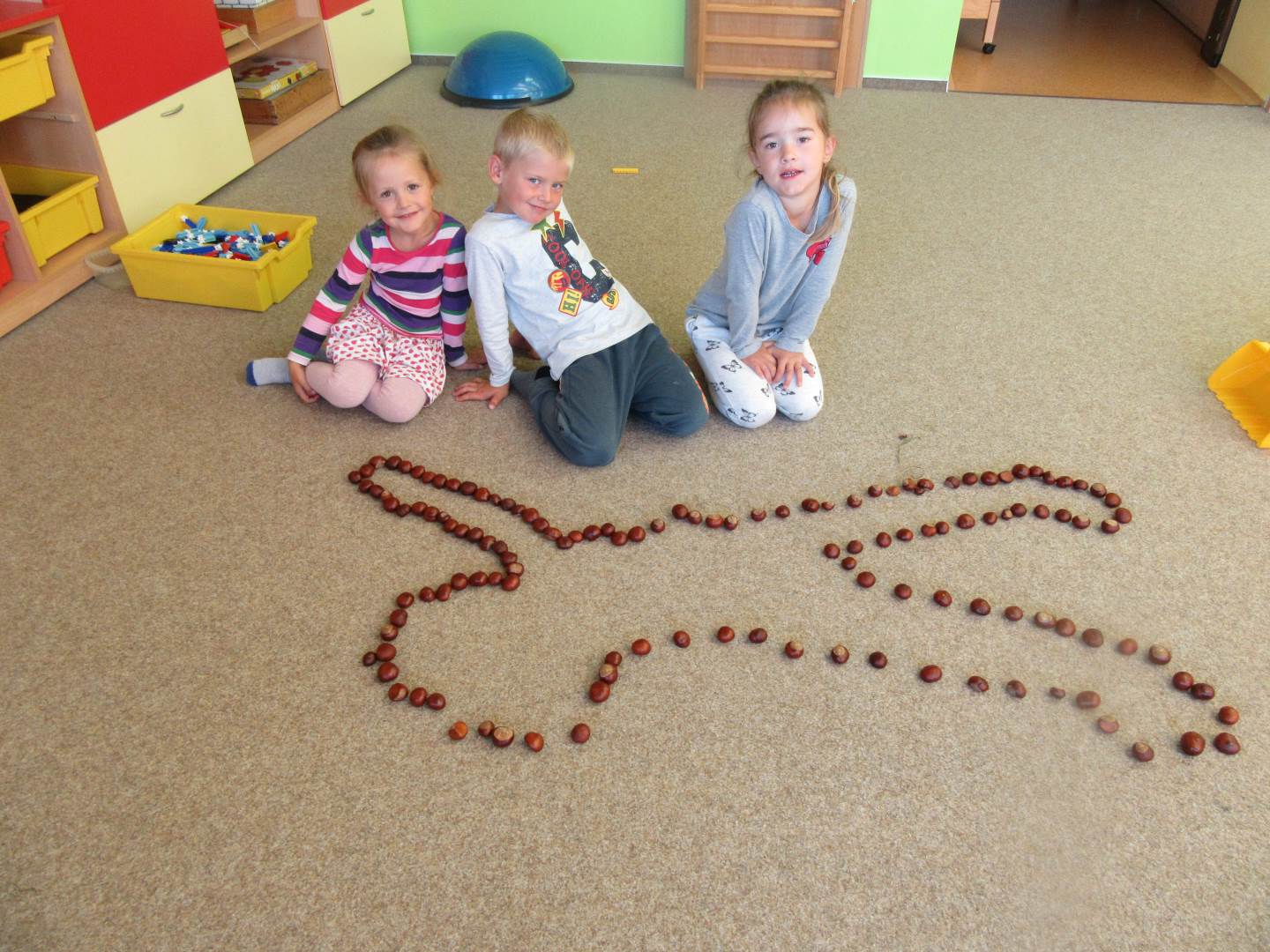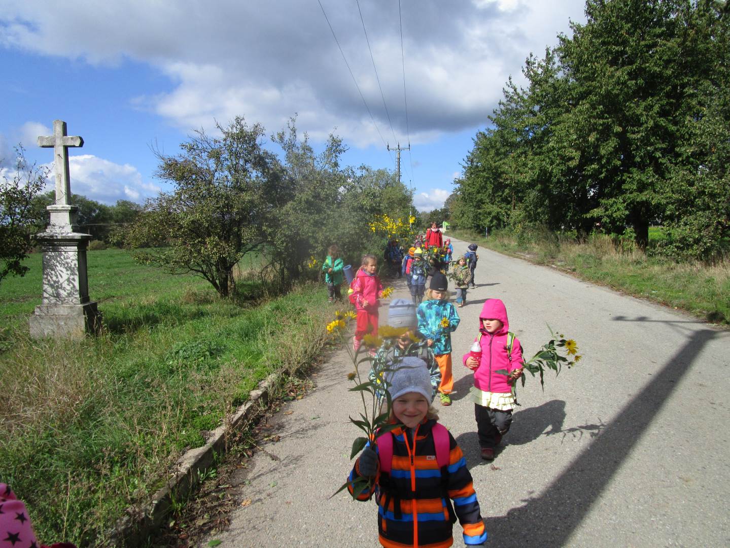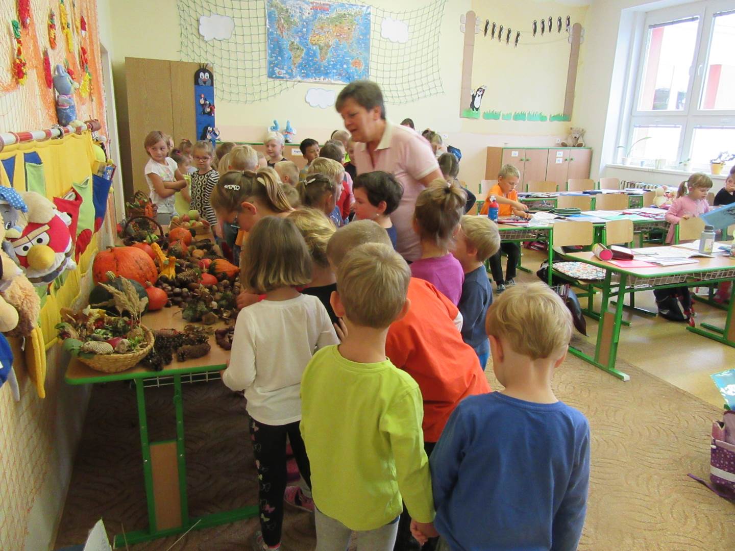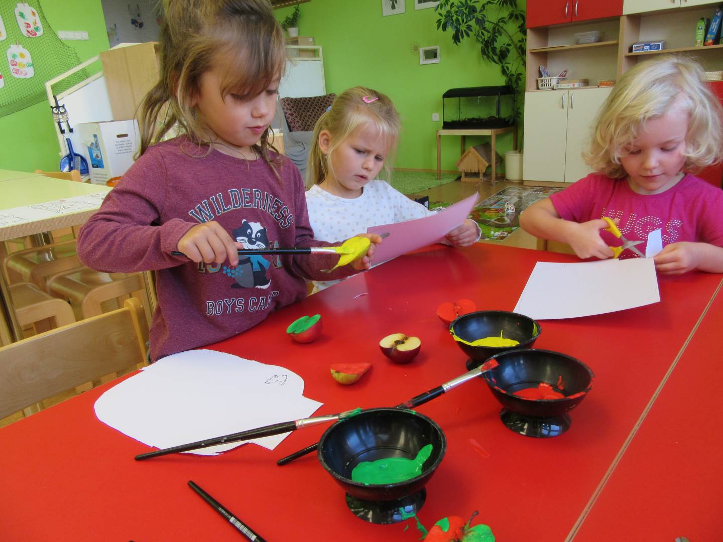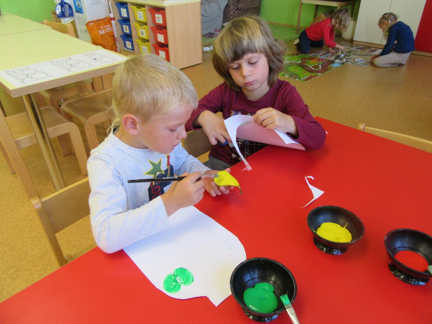 Babí léto skončilo a venku už je pěkná zima! V noci dokonce pršelo, a tak nás lákají potůčky na cestě. Jabloňová víla nám pověděla o svých kamarádkách a i tahle skupinka si maluje jablíčka. Zopakujeme si o jablíčku i říkanku a písničky a vyzkoušíme si, jak se dělá mošt. Při cestě zpět vidíme duhu! Další dny si povídáme o svatém Václavovi a připomínáme si Den české státnosti. Školáci z první třídy nás pozvali na výstavku podzimních plodin a na malou pohádku. Pak jdeme nasbírat kaštany, ať máme pro zvířátka na zimu. Zatím si s nim hrajeme. Děti ve třídě zase otiskují jablíčka do zavařovacích sklenic. Umíme také vylézt na strom. Připomínáme si odlet vlaštovek, nějaké si i vyrobíme, a pak si s nimi hrajeme. Hrajeme si i na Zlatou bránu a rádi hádáme hádnky. U maringotky si opakujeme pohádku O veliké řepě a pak si procvičujeme hmat i paměť, když hmatem poznáváme podzimní plody. Nakonec nás čekala výstava místních hasičů.
