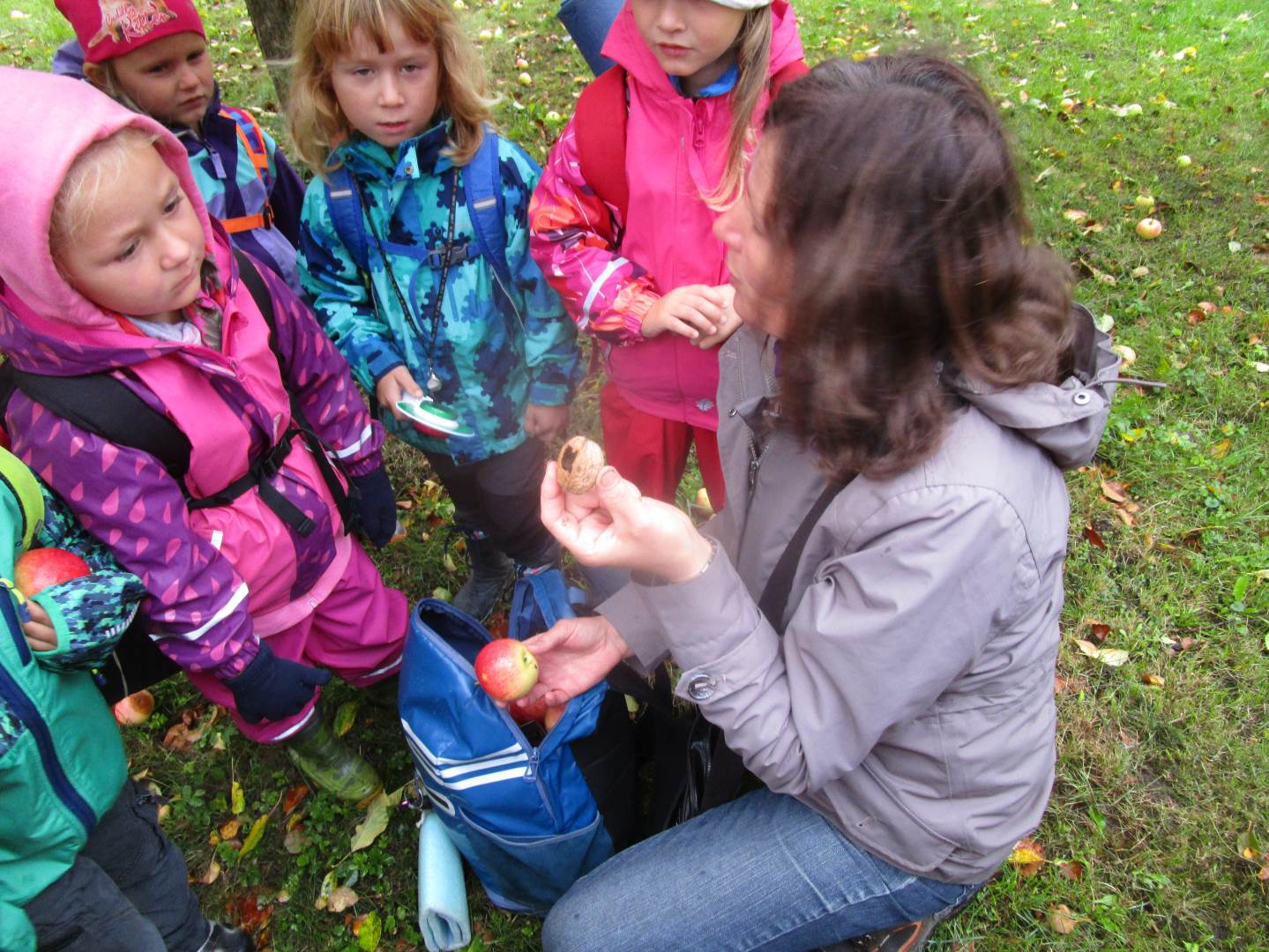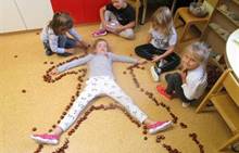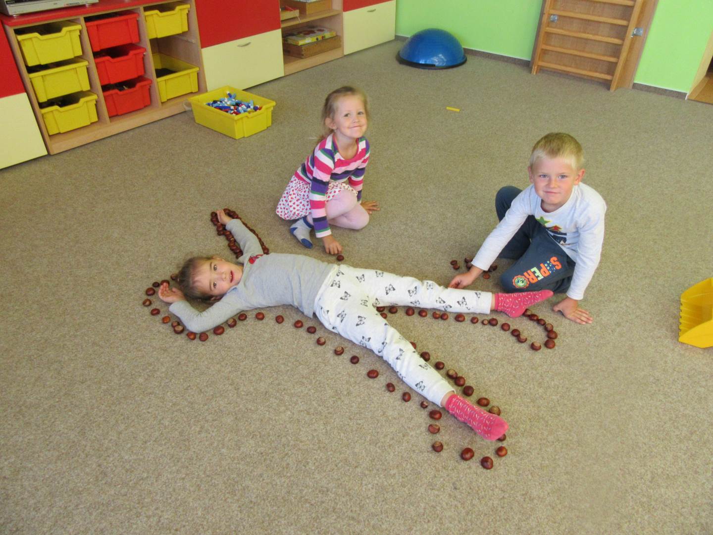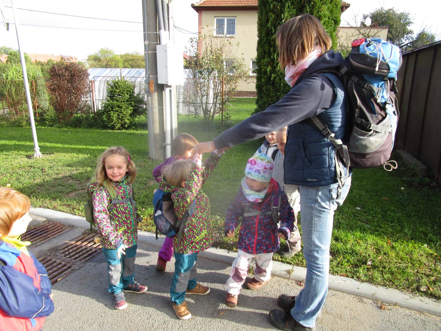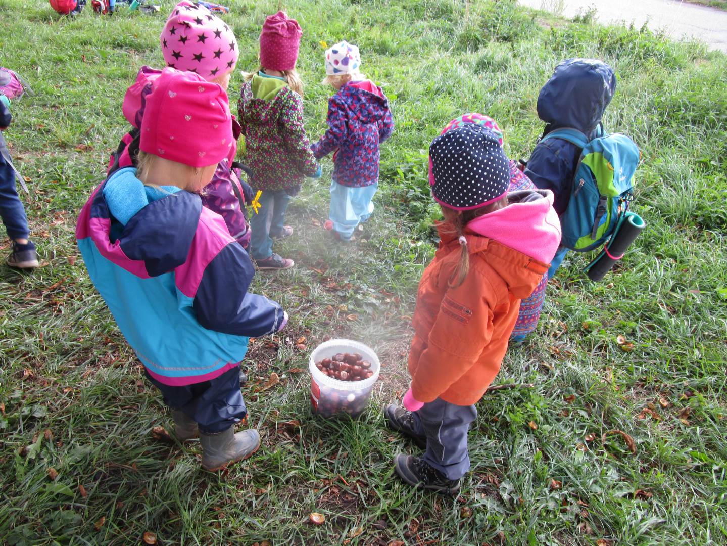 Babí léto skončilo a venku už je pěkná zima! V noci dokonce pršelo, a tak nás lákají potůčky na cestě. Jabloňová víla nám pověděla o svých kamarádkách a i tahle skupinka si maluje jablíčka. Zopakujeme si o jablíčku i říkanku a písničky a vyzkoušíme si, jak se dělá mošt. Při cestě zpět vidíme duhu! Další dny si povídáme o svatém Václavovi a připomínáme si Den české státnosti. Školáci z první třídy nás pozvali na výstavku podzimních plodin a na malou pohádku. Pak jdeme nasbírat kaštany, ať máme pro zvířátka na zimu. Zatím si s nim hrajeme. Děti ve třídě zase otiskují jablíčka do zavařovacích sklenic. Umíme také vylézt na strom. Připomínáme si odlet vlaštovek, nějaké si i vyrobíme, a pak si s nimi hrajeme. Hrajeme si i na Zlatou bránu a rádi hádáme hádnky. U maringotky si opakujeme pohádku O veliké řepě a pak si procvičujeme hmat i paměť, když hmatem poznáváme podzimní plody. Nakonec nás čekala výstava místních hasičů.