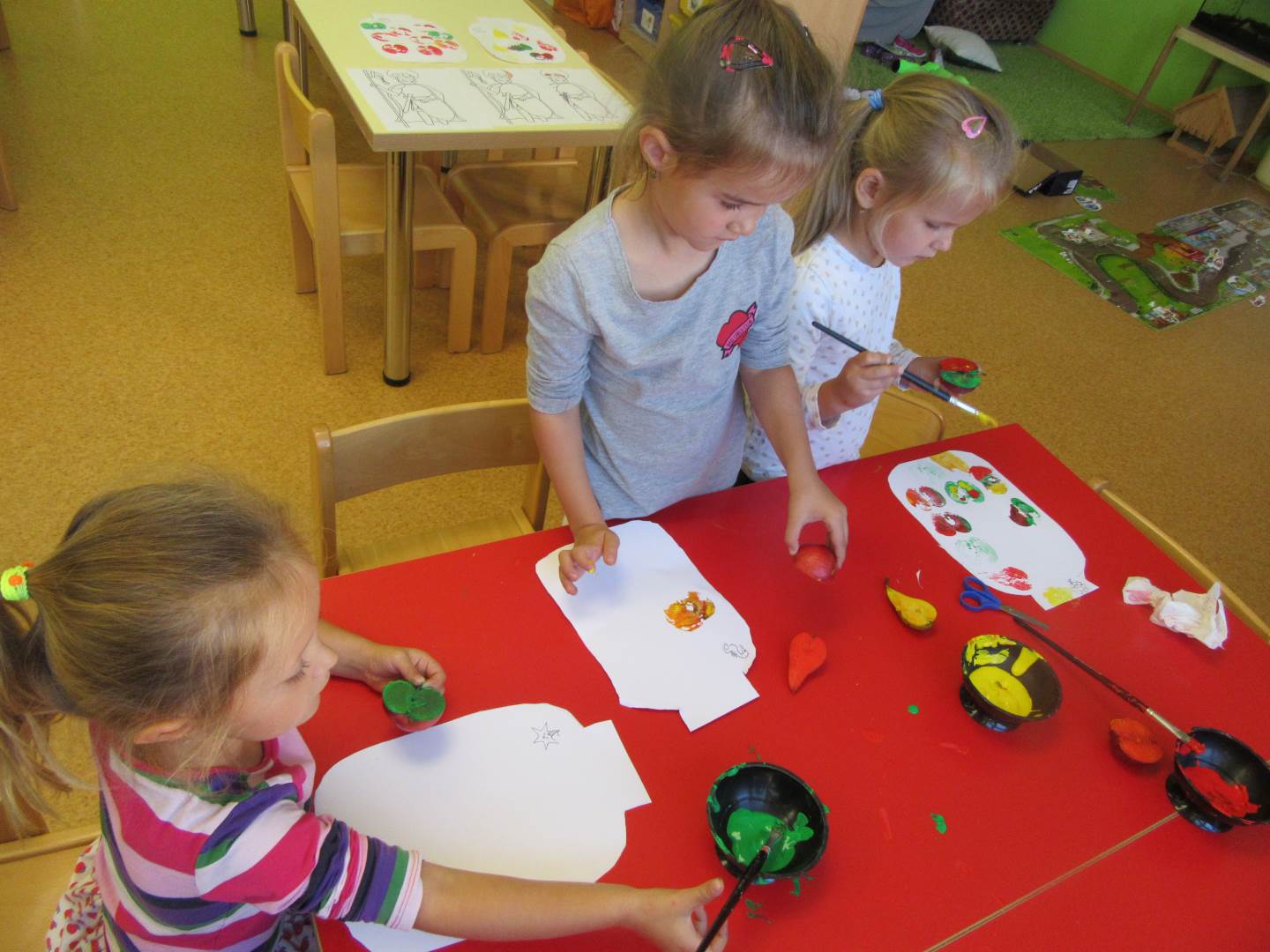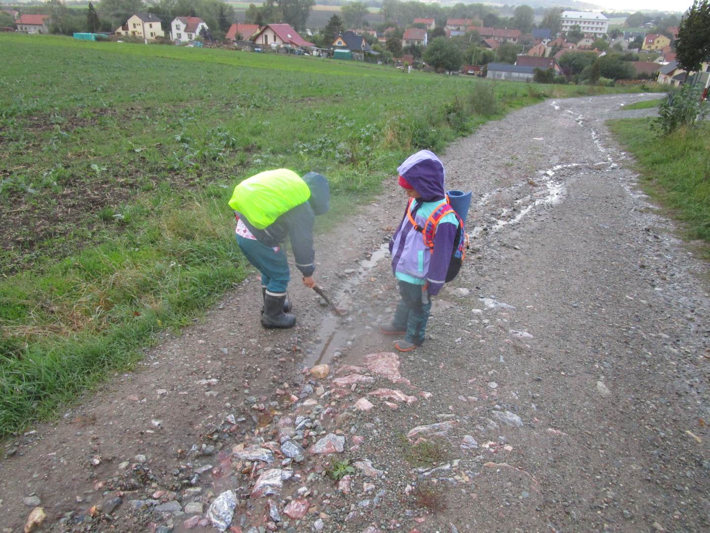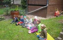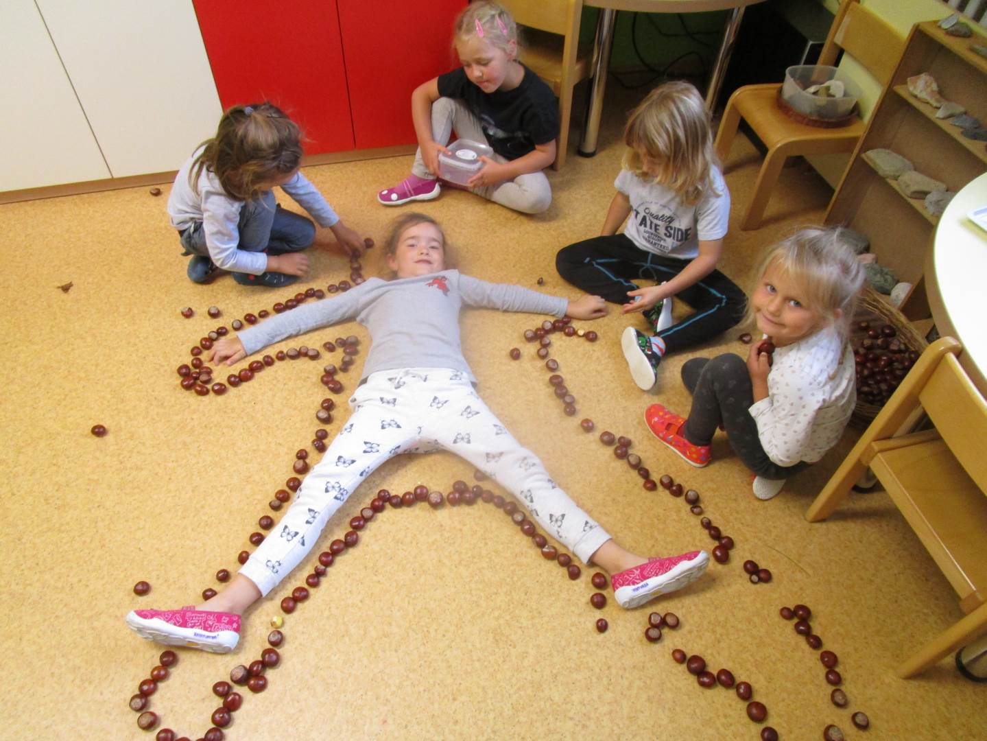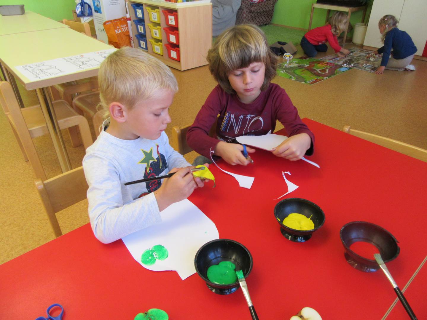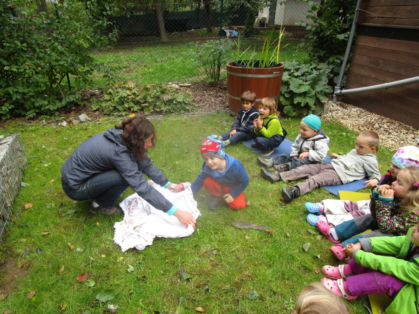 Babí léto skončilo a venku už je pěkná zima! V noci dokonce pršelo, a tak nás lákají potůčky na cestě. Jabloňová víla nám pověděla o svých kamarádkách a i tahle skupinka si maluje jablíčka. Zopakujeme si o jablíčku i říkanku a písničky a vyzkoušíme si, jak se dělá mošt. Při cestě zpět vidíme duhu! Další dny si povídáme o svatém Václavovi a připomínáme si Den české státnosti. Školáci z první třídy nás pozvali na výstavku podzimních plodin a na malou pohádku. Pak jdeme nasbírat kaštany, ať máme pro zvířátka na zimu. Zatím si s nim hrajeme. Děti ve třídě zase otiskují jablíčka do zavařovacích sklenic. Umíme také vylézt na strom. Připomínáme si odlet vlaštovek, nějaké si i vyrobíme, a pak si s nimi hrajeme. Hrajeme si i na Zlatou bránu a rádi hádáme hádnky. U maringotky si opakujeme pohádku O veliké řepě a pak si procvičujeme hmat i paměť, když hmatem poznáváme podzimní plody. Nakonec nás čekala výstava místních hasičů.