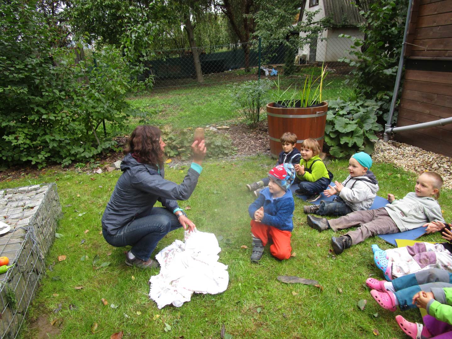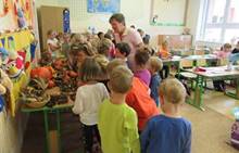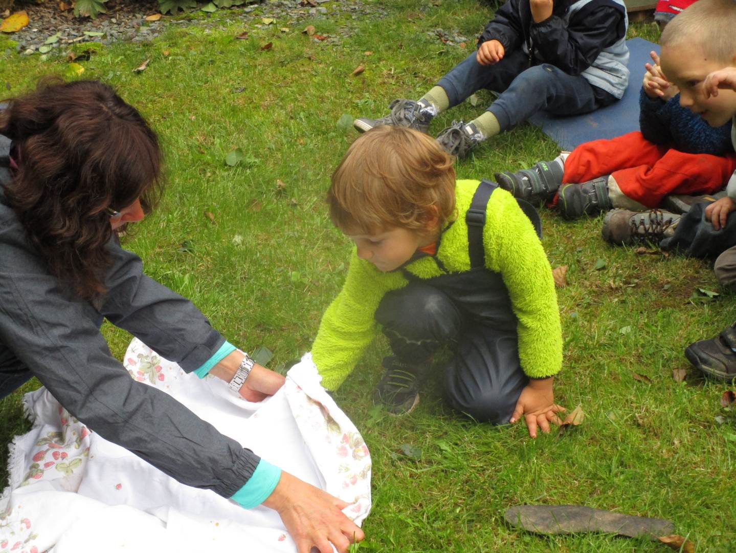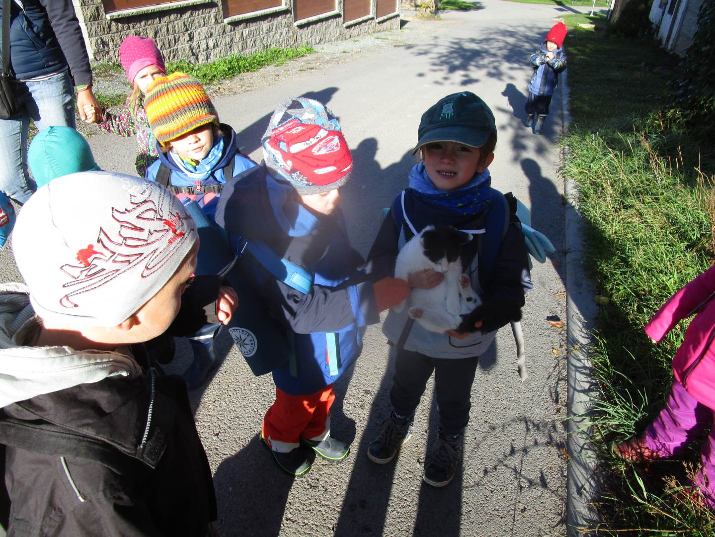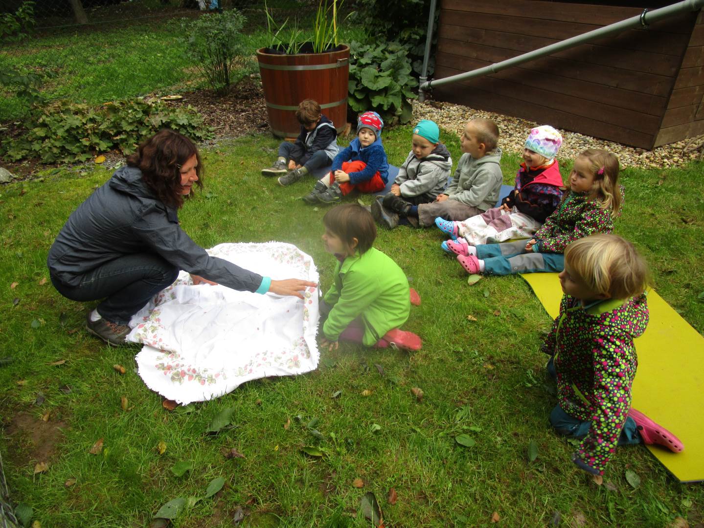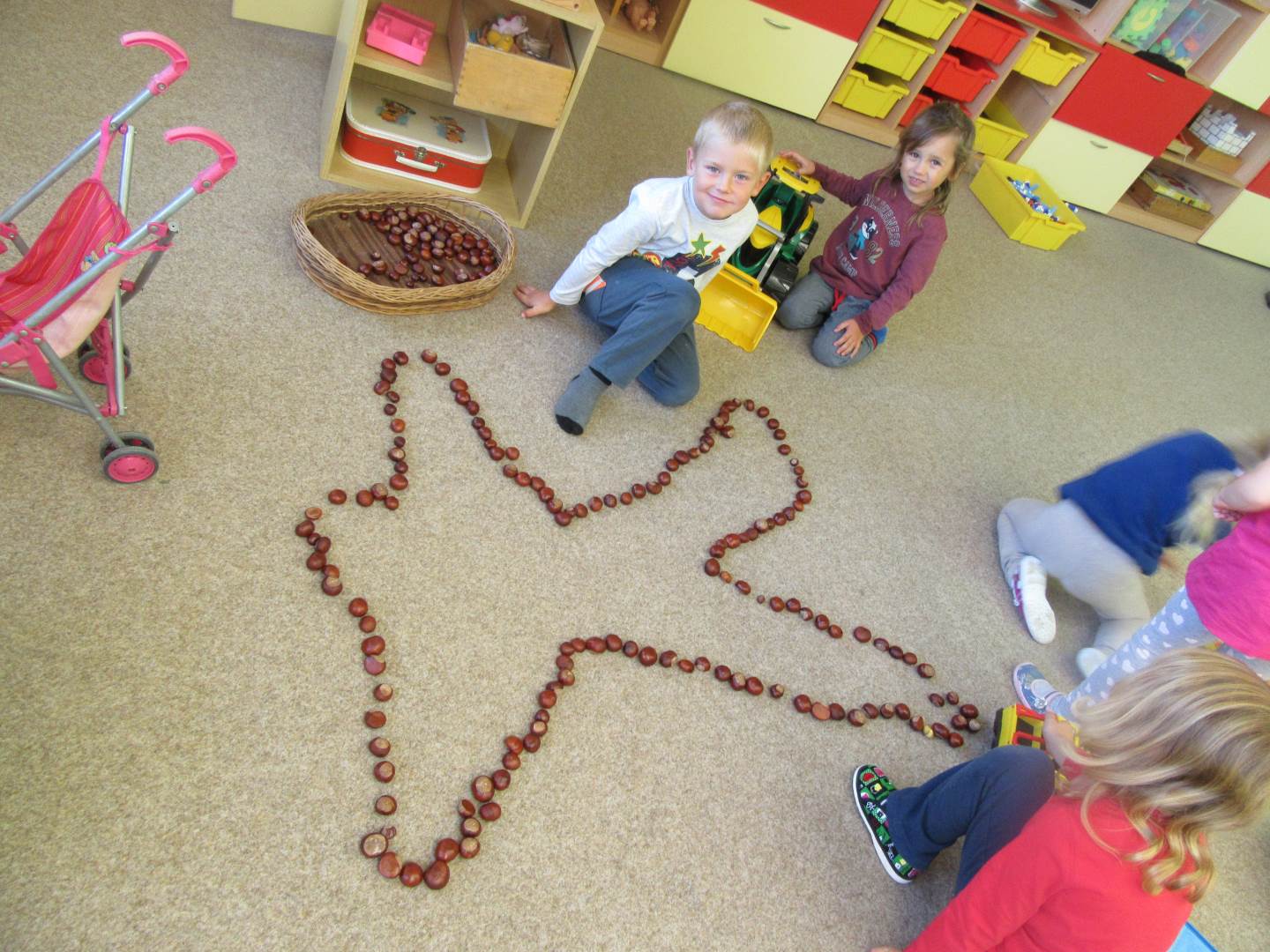Babí léto skončilo a venku už je pěkná zima! V noci dokonce pršelo, a tak nás lákají potůčky na cestě. Jabloňová víla nám pověděla o svých kamarádkách a i tahle skupinka si maluje jablíčka. Zopakujeme si o jablíčku i říkanku a písničky a vyzkoušíme si, jak se dělá mošt. Při cestě zpět vidíme duhu! Další dny si povídáme o svatém Václavovi a připomínáme si Den české státnosti. Školáci z první třídy nás pozvali na výstavku podzimních plodin a na malou pohádku. Pak jdeme nasbírat kaštany, ať máme pro zvířátka na zimu. Zatím si s nim hrajeme. Děti ve třídě zase otiskují jablíčka do zavařovacích sklenic. Umíme také vylézt na strom. Připomínáme si odlet vlaštovek, nějaké si i vyrobíme, a pak si s nimi hrajeme. Hrajeme si i na Zlatou bránu a rádi hádáme hádnky. U maringotky si opakujeme pohádku O veliké řepě a pak si procvičujeme hmat i paměť, když hmatem poznáváme podzimní plody. Nakonec nás čekala výstava místních hasičů.