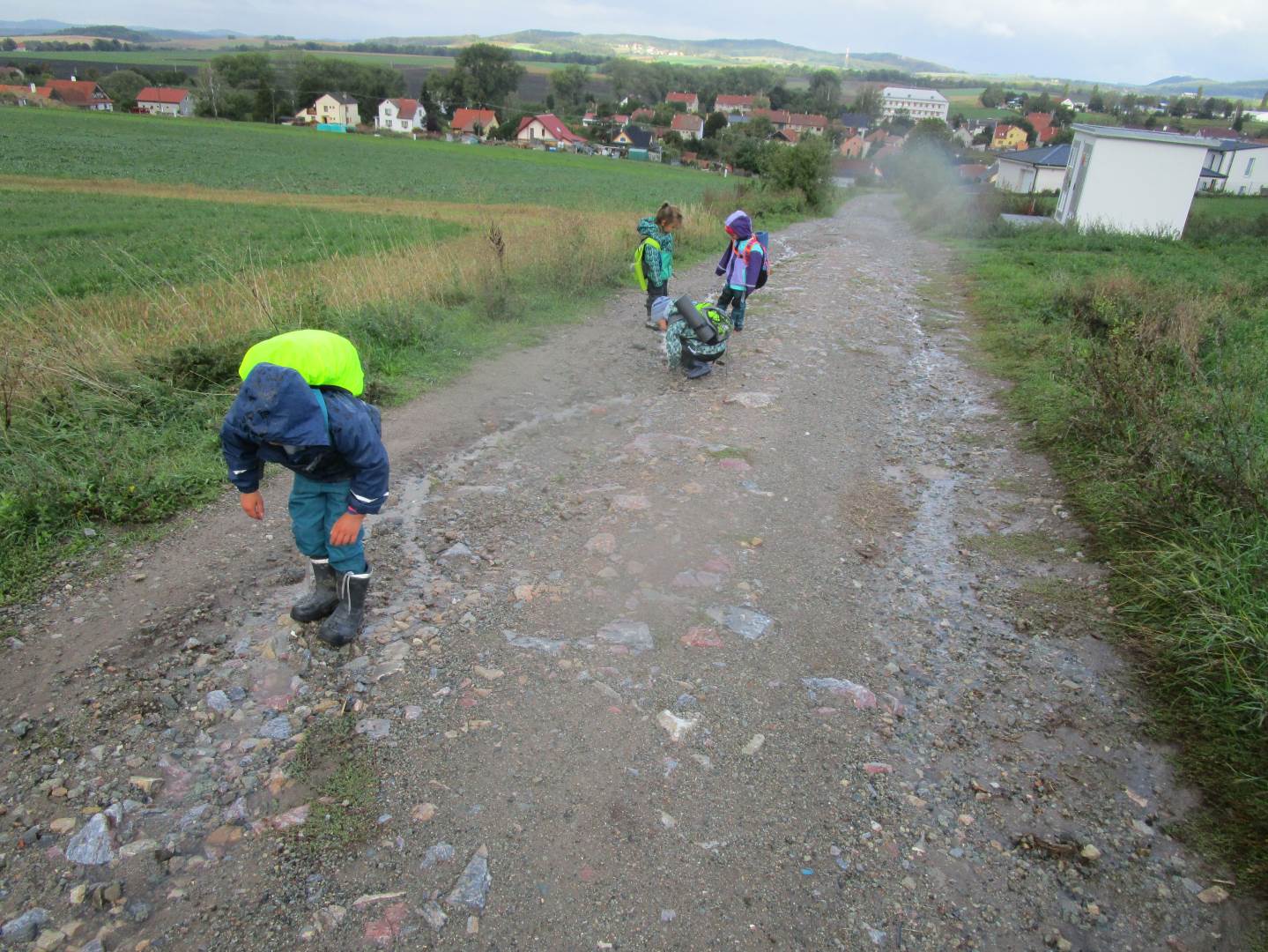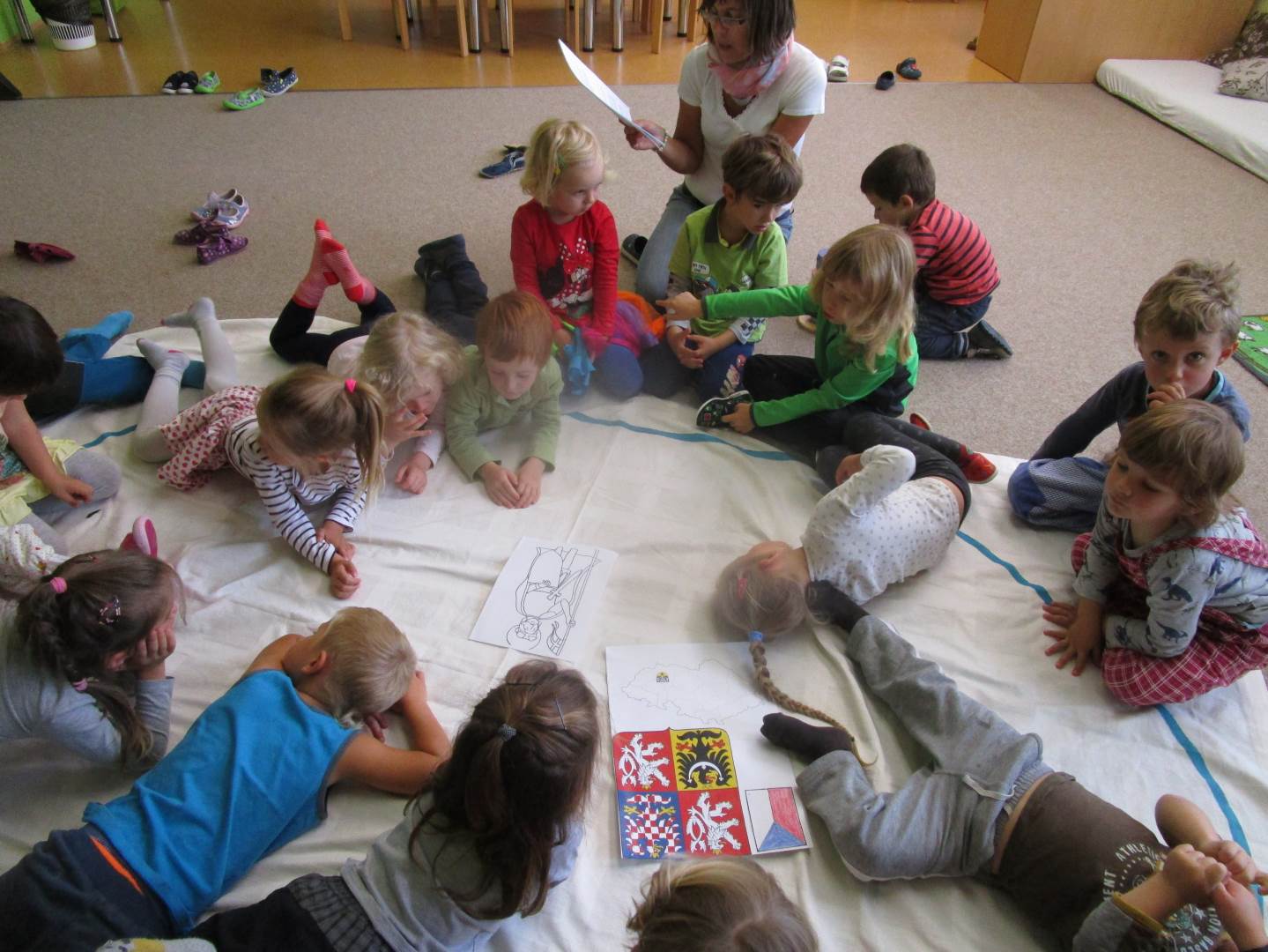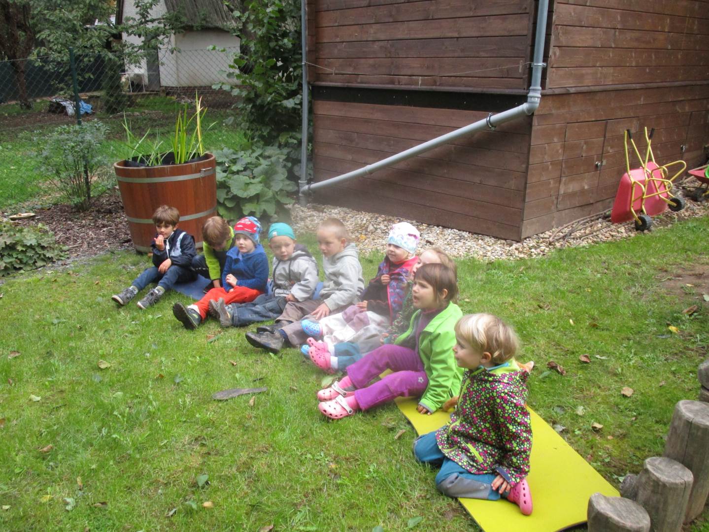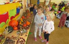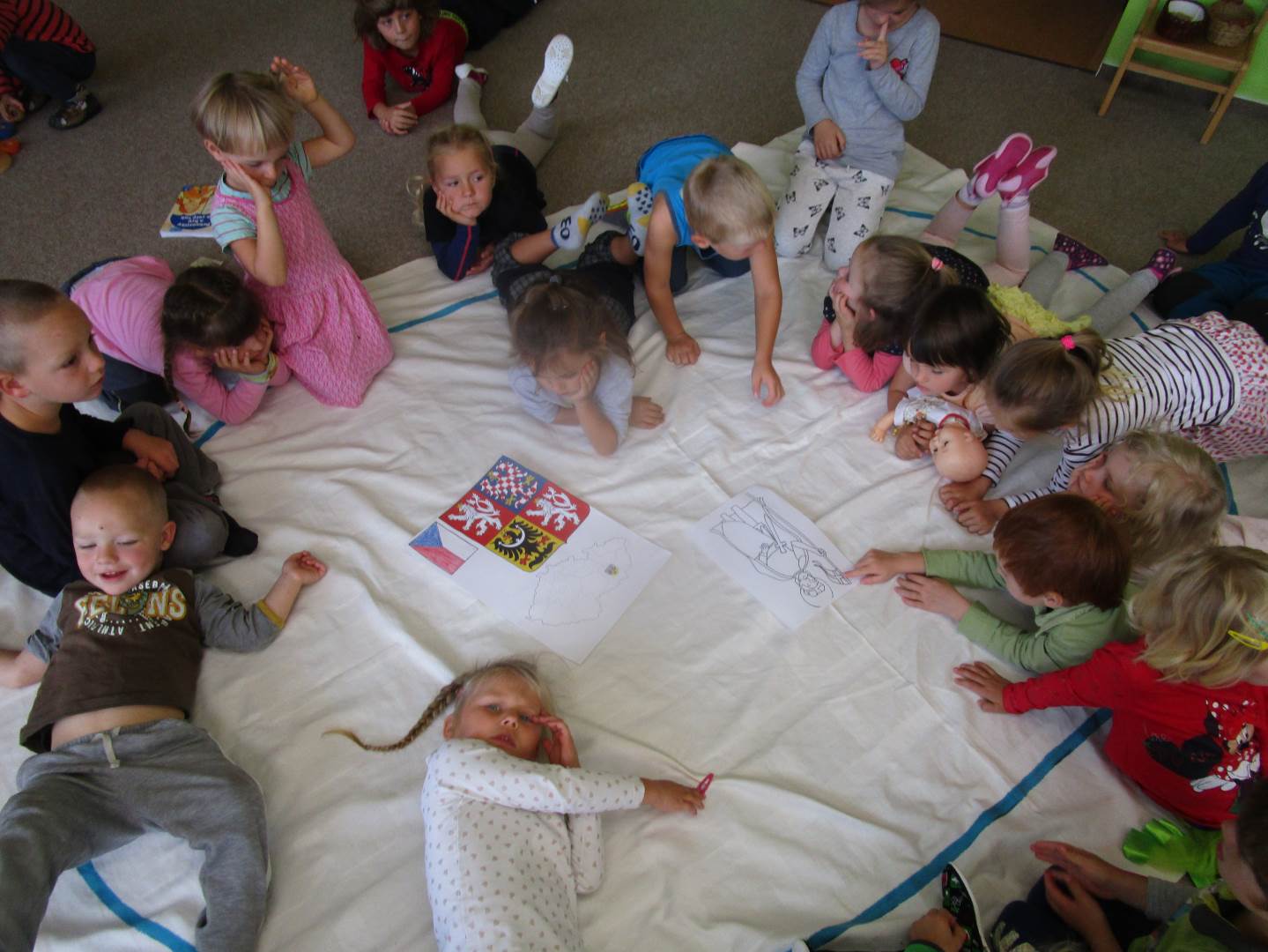 Babí léto skončilo a venku už je pěkná zima! V noci dokonce pršelo, a tak nás lákají potůčky na cestě. Jabloňová víla nám pověděla o svých kamarádkách a i tahle skupinka si maluje jablíčka. Zopakujeme si o jablíčku i říkanku a písničky a vyzkoušíme si, jak se dělá mošt. Při cestě zpět vidíme duhu! Další dny si povídáme o svatém Václavovi a připomínáme si Den české státnosti. Školáci z první třídy nás pozvali na výstavku podzimních plodin a na malou pohádku. Pak jdeme nasbírat kaštany, ať máme pro zvířátka na zimu. Zatím si s nim hrajeme. Děti ve třídě zase otiskují jablíčka do zavařovacích sklenic. Umíme také vylézt na strom. Připomínáme si odlet vlaštovek, nějaké si i vyrobíme, a pak si s nimi hrajeme. Hrajeme si i na Zlatou bránu a rádi hádáme hádnky. U maringotky si opakujeme pohádku O veliké řepě a pak si procvičujeme hmat i paměť, když hmatem poznáváme podzimní plody. Nakonec nás čekala výstava místních hasičů.
