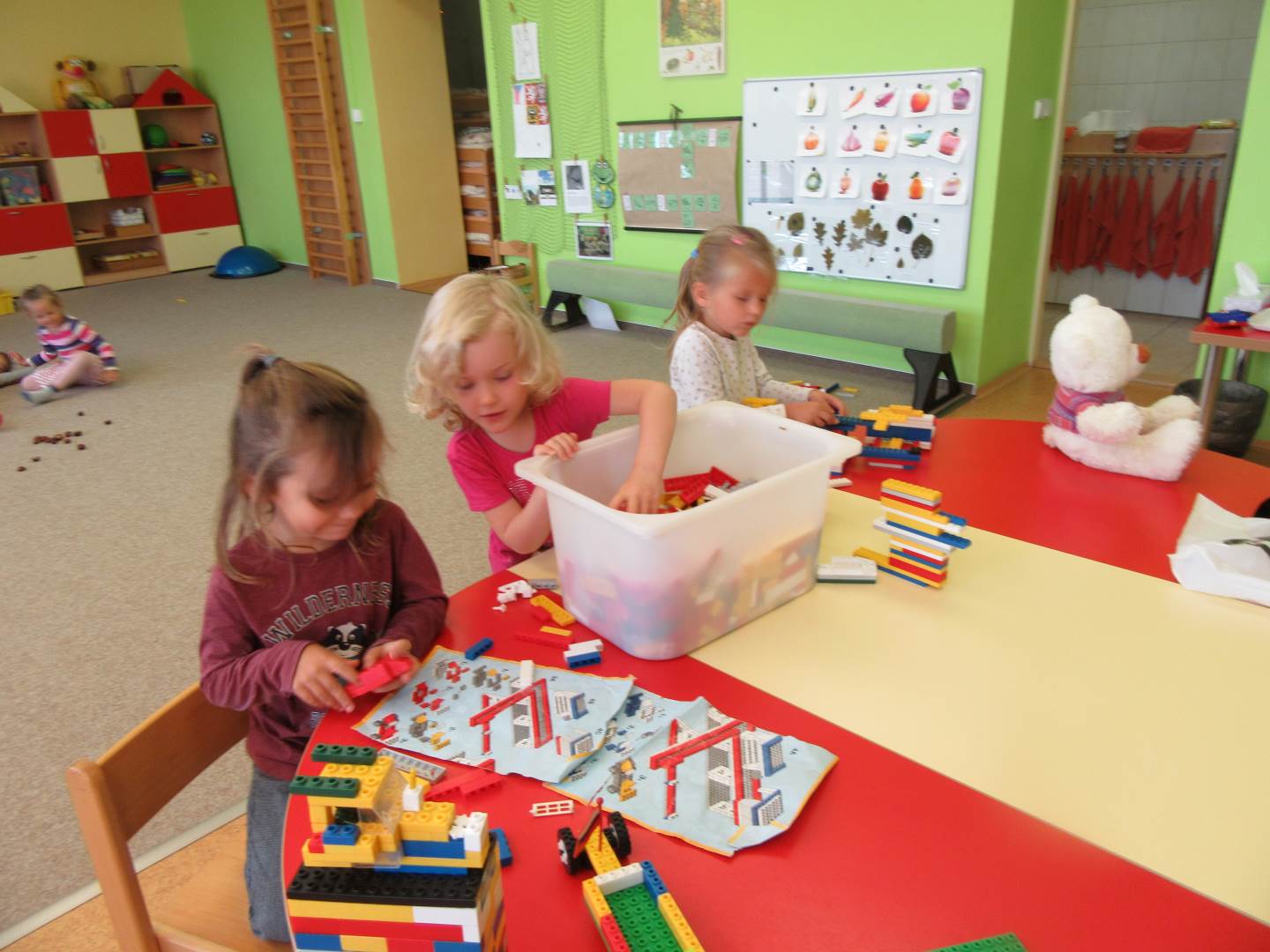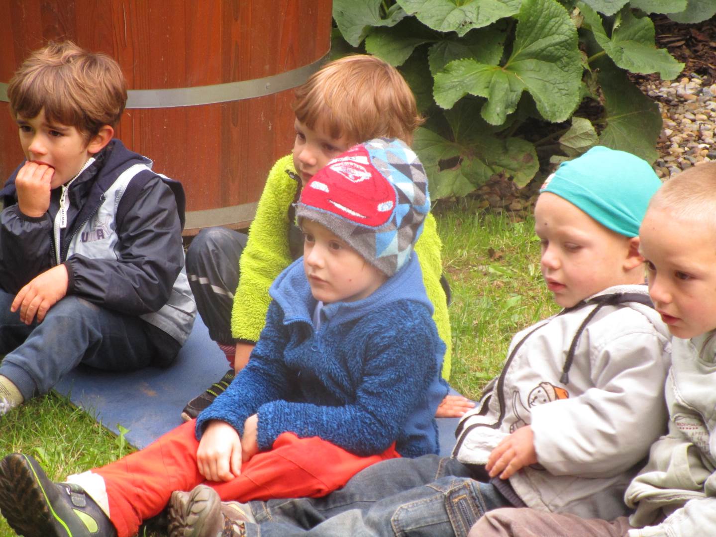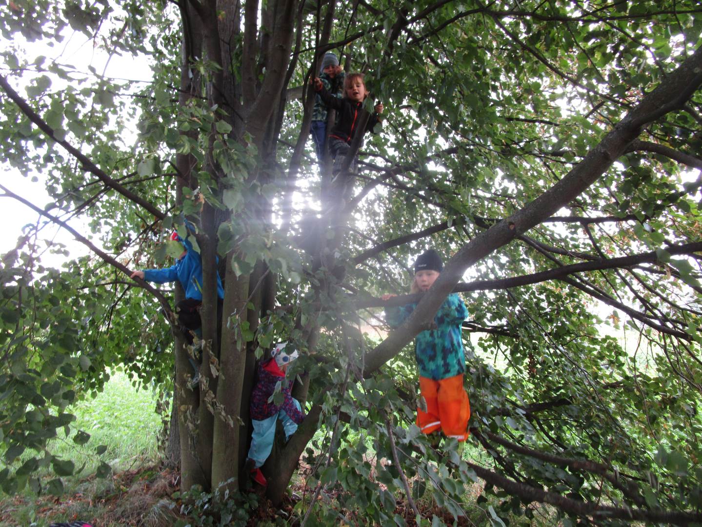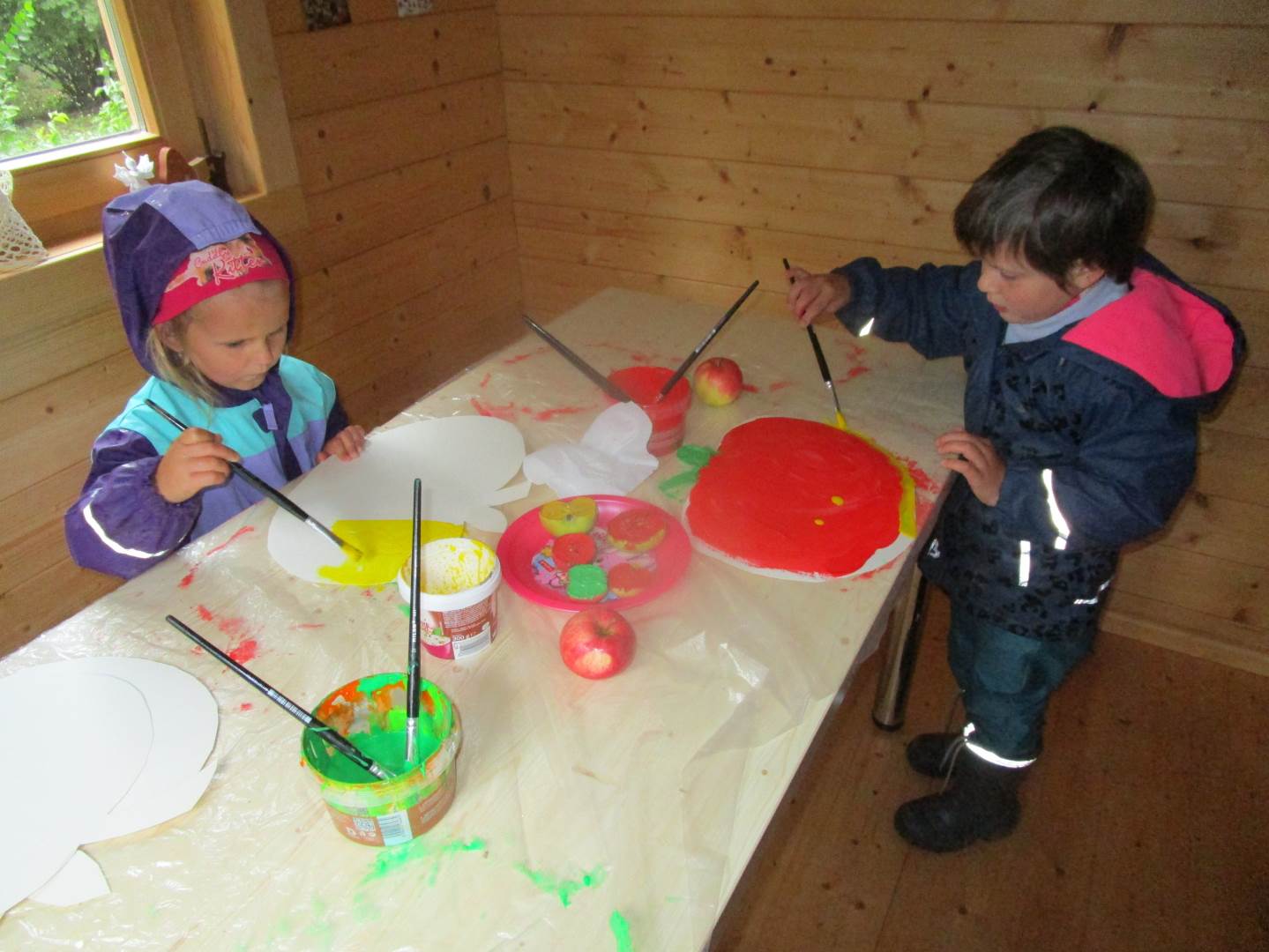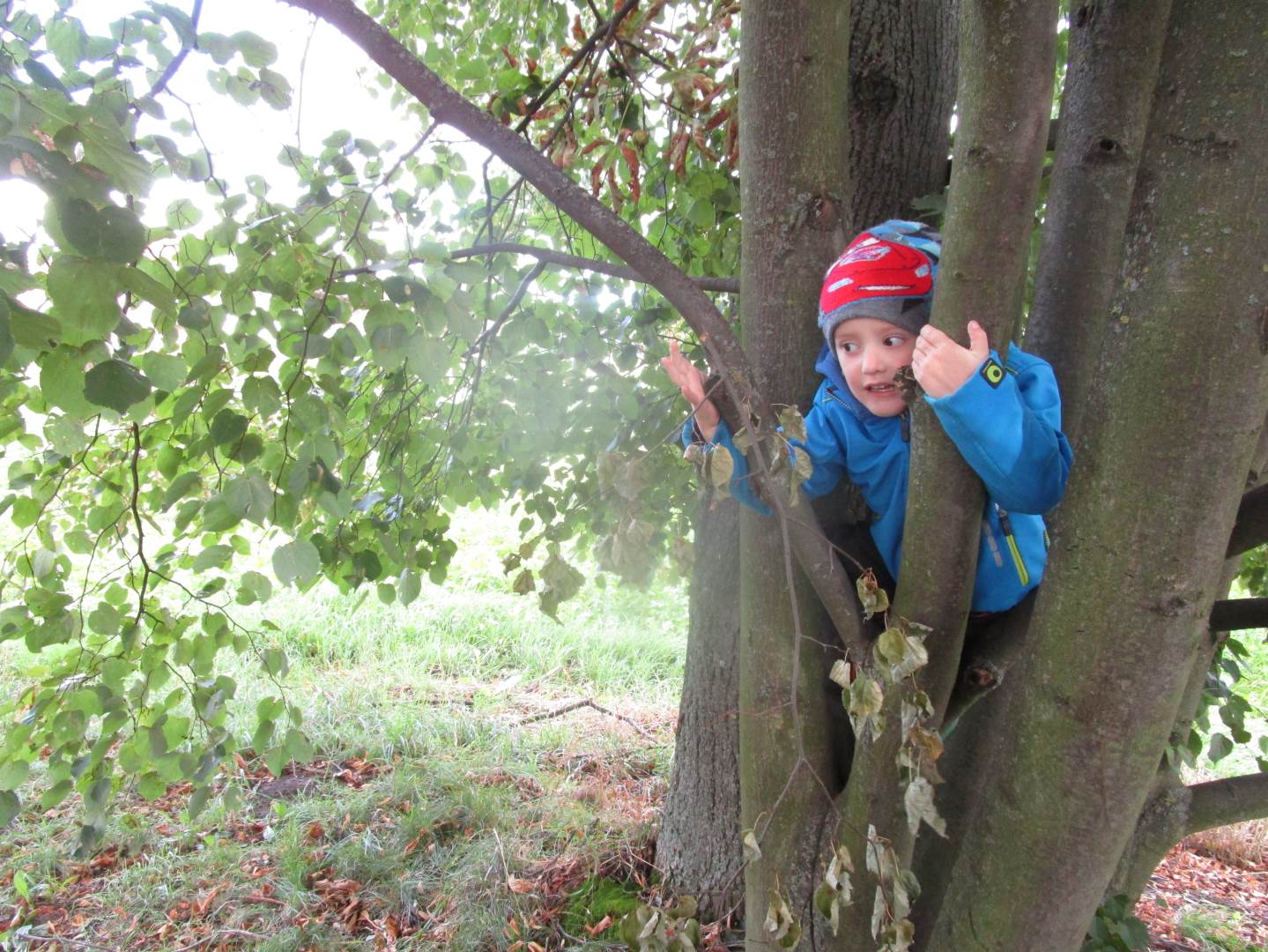 Babí léto skončilo a venku už je pěkná zima! V noci dokonce pršelo, a tak nás lákají potůčky na cestě. Jabloňová víla nám pověděla o svých kamarádkách a i tahle skupinka si maluje jablíčka. Zopakujeme si o jablíčku i říkanku a písničky a vyzkoušíme si, jak se dělá mošt. Při cestě zpět vidíme duhu! Další dny si povídáme o svatém Václavovi a připomínáme si Den české státnosti. Školáci z první třídy nás pozvali na výstavku podzimních plodin a na malou pohádku. Pak jdeme nasbírat kaštany, ať máme pro zvířátka na zimu. Zatím si s nim hrajeme. Děti ve třídě zase otiskují jablíčka do zavařovacích sklenic. Umíme také vylézt na strom. Připomínáme si odlet vlaštovek, nějaké si i vyrobíme, a pak si s nimi hrajeme. Hrajeme si i na Zlatou bránu a rádi hádáme hádnky. U maringotky si opakujeme pohádku O veliké řepě a pak si procvičujeme hmat i paměť, když hmatem poznáváme podzimní plody. Nakonec nás čekala výstava místních hasičů.