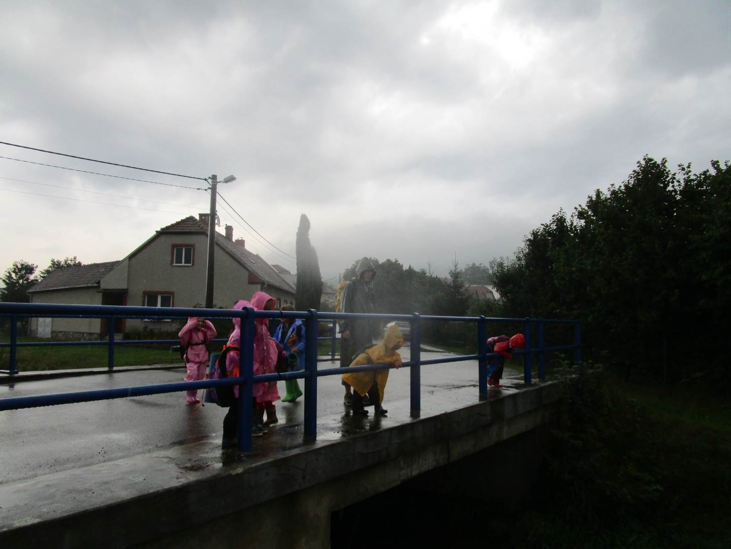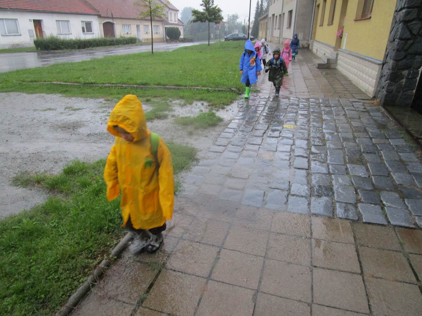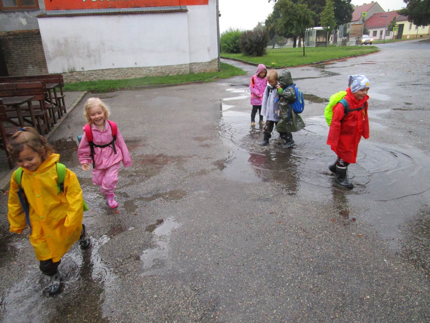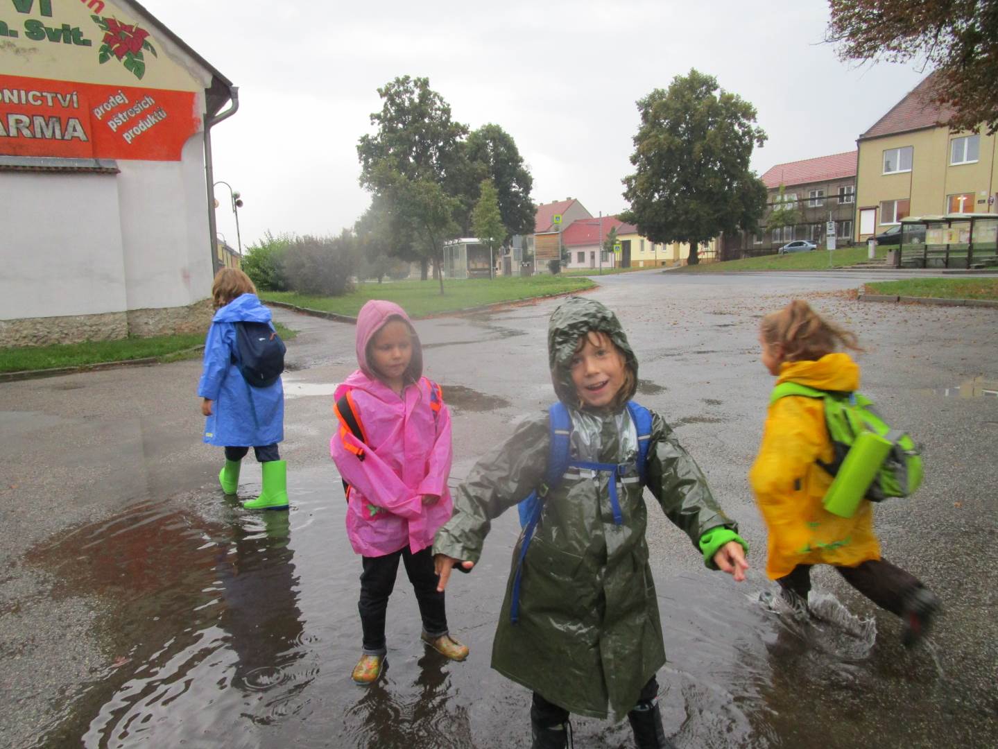 Tento týden je ve znamení seznamování se s kamarády, s prostředím školky i lesního zázemí a s pravidly. První, zkušenější skupinka, jde do lesa hned první den. Musíme zkontrolovat, v jakém stavu je po prázdninách maringotka a vůbec celý areál. V rybníčku není téměř žádná voda, má se tu brzy bagrovat. Všude je plno ovoce, hlavně švestek. Můžeme jíst, co hrdlo ráčí. Druhý den nás čeká zatěžkávací zkouška. Celý den prší. Co prší, leje jako z konve! Pláštěnku mají naštěstí všichni. Chvíli se schováváme na obecním úřadě, chvíli na autobusové zastávce, ale nakonec to vzdáváme a vracíme se kolem potoka zpět do školky. I tak jsme promočení až na kůži. Ale užili jsme si to!