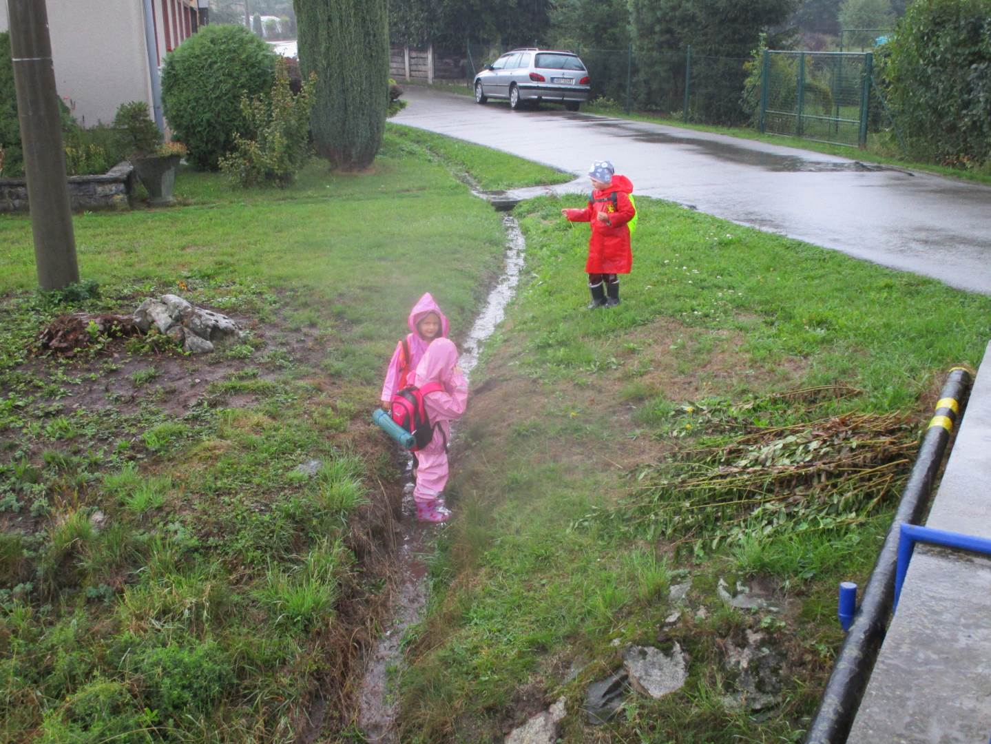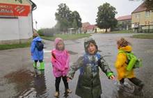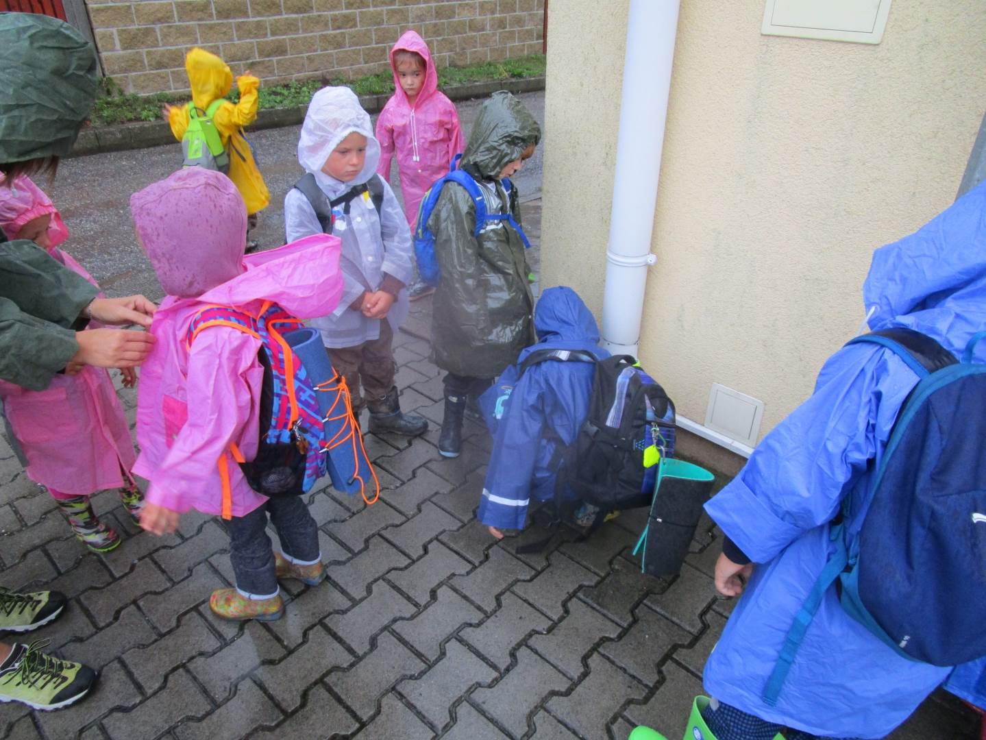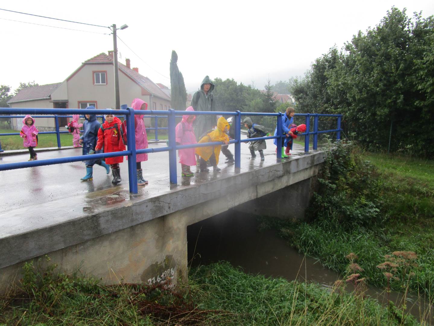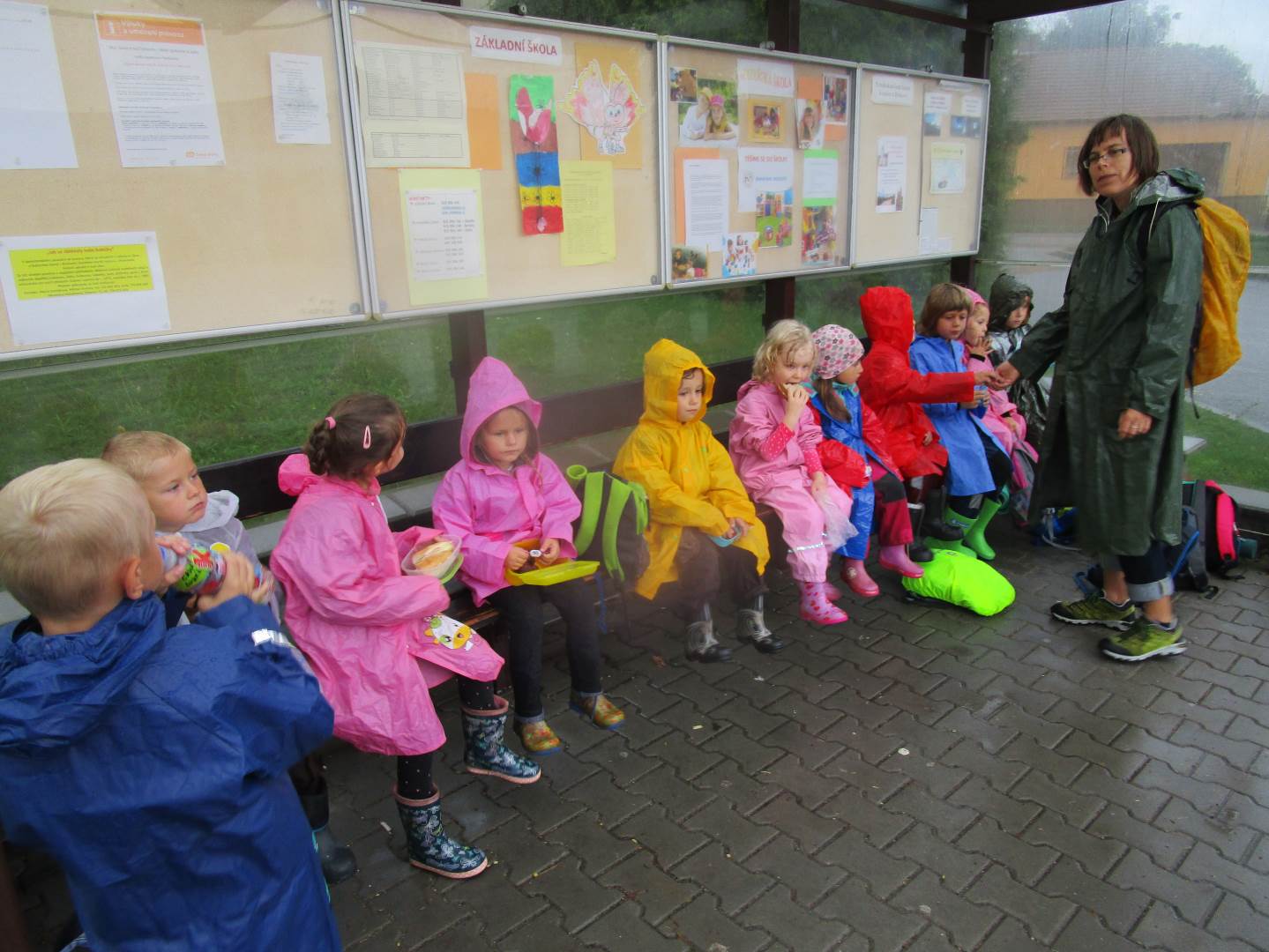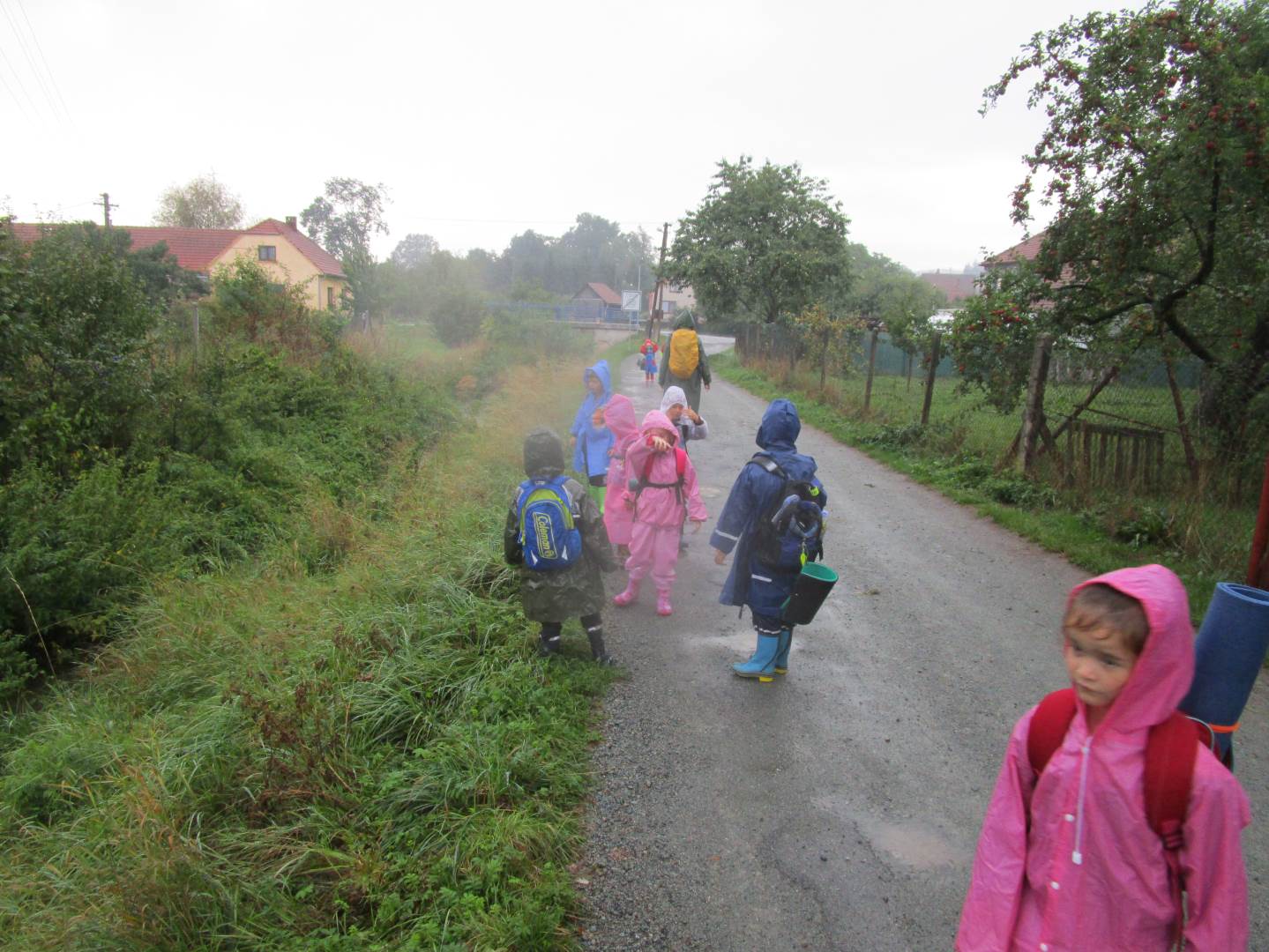 Tento týden je ve znamení seznamování se s kamarády, s prostředím školky i lesního zázemí a s pravidly. První, zkušenější skupinka, jde do lesa hned první den. Musíme zkontrolovat, v jakém stavu je po prázdninách maringotka a vůbec celý areál. V rybníčku není téměř žádná voda, má se tu brzy bagrovat. Všude je plno ovoce, hlavně švestek. Můžeme jíst, co hrdlo ráčí. Druhý den nás čeká zatěžkávací zkouška. Celý den prší. Co prší, leje jako z konve! Pláštěnku mají naštěstí všichni. Chvíli se schováváme na obecním úřadě, chvíli na autobusové zastávce, ale nakonec to vzdáváme a vracíme se kolem potoka zpět do školky. I tak jsme promočení až na kůži. Ale užili jsme si to!
