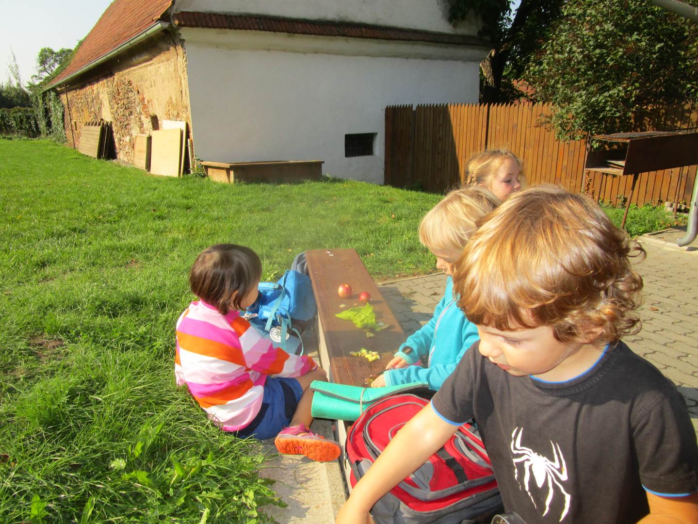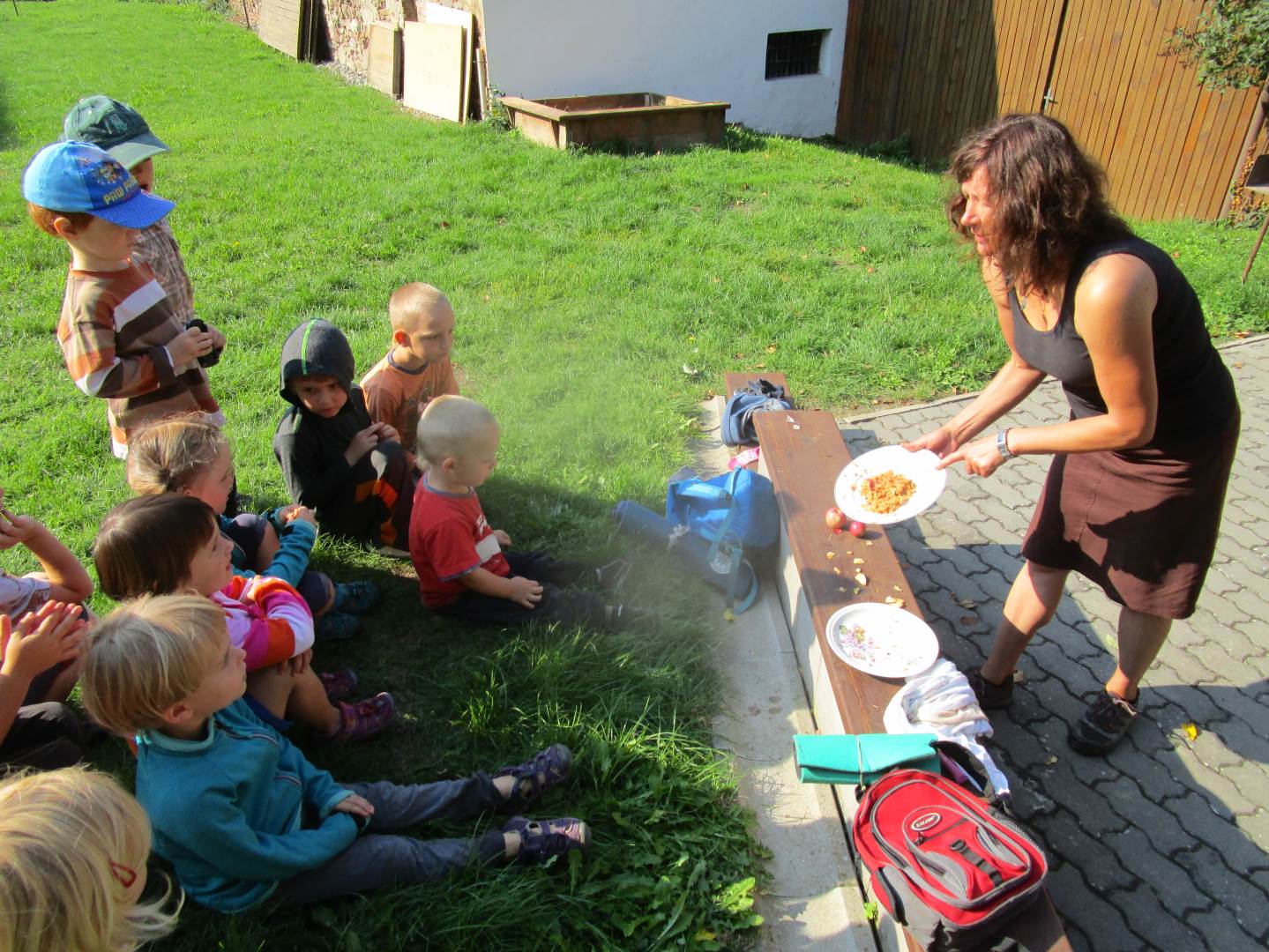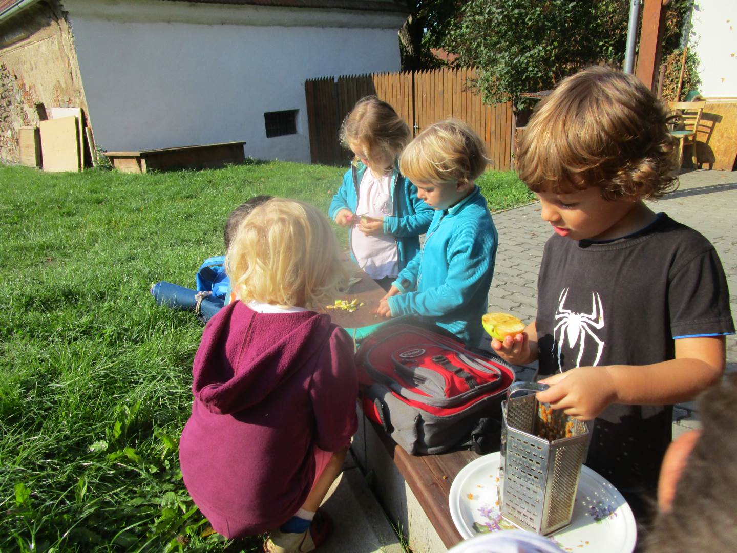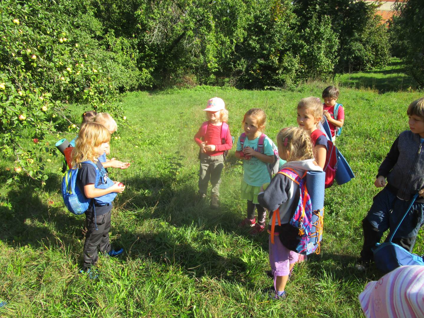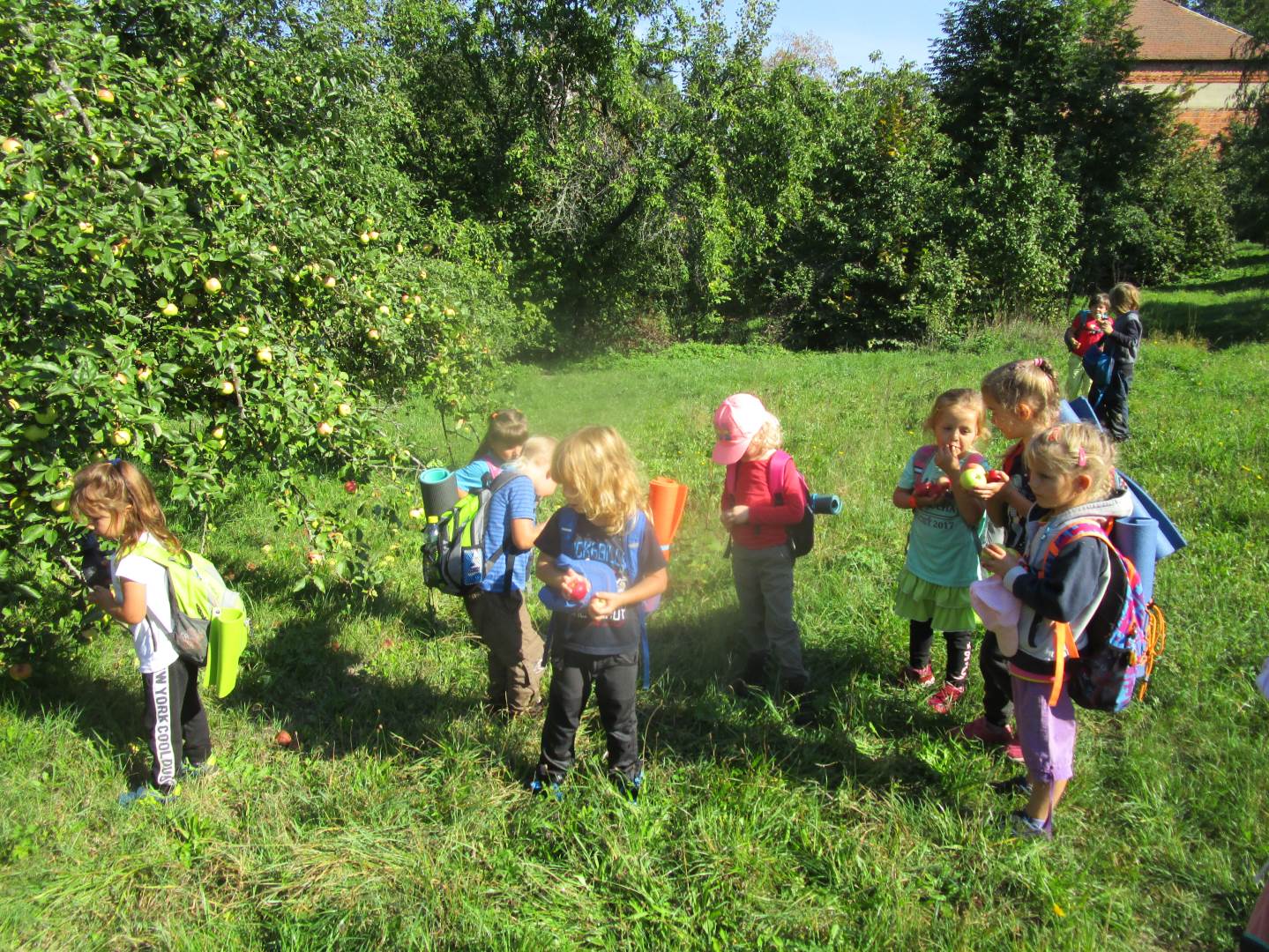 V pondělí se jdeme podívat, kde probíhaly sobotní cyklokrosové závody. Startujeme od kulturního domu a cesta nás vede kolem klád, různými lesními serpentinami až k ovečkám. Další dny si opakujeme písničky o jablíčku, počítáme je, porovnáváme velikost a barvu, zkoušíme je nosit na hlavě. Zjišťujeme, že jablíčka chutnají nejen nám, ale i zvířátkům a objevujeme, jak se z jablíček dělá mošt. Nakonec si jablíčka namalujem a vida, dá se s nimi i tisknout! Ve třídě rádi cvičíme, na elipse vytváříme pavučinu přátelství a své kamarády si namalujeme. Naučili jsme se hrát Zlatou bránu a skákat Panáka.