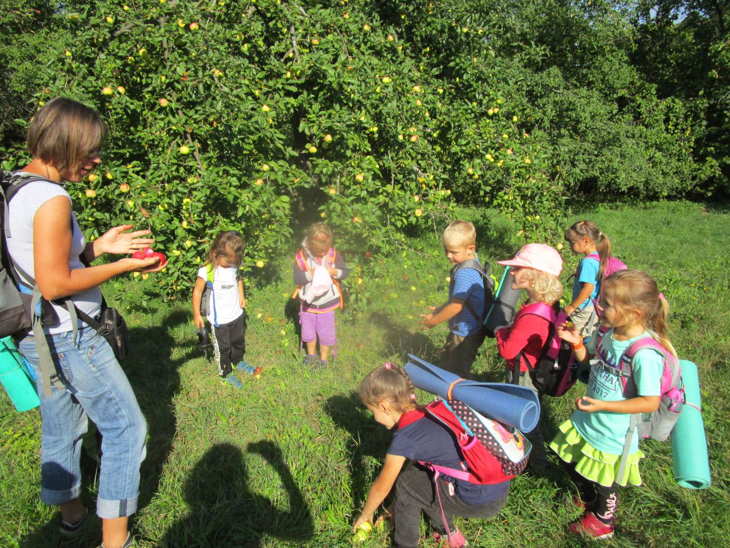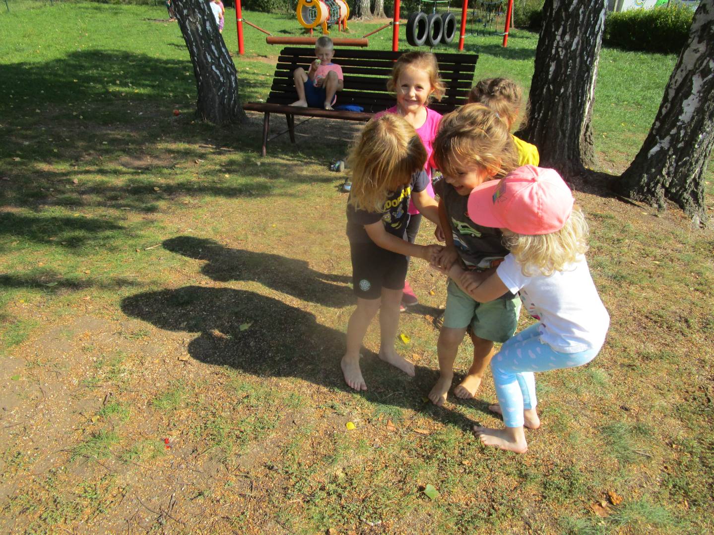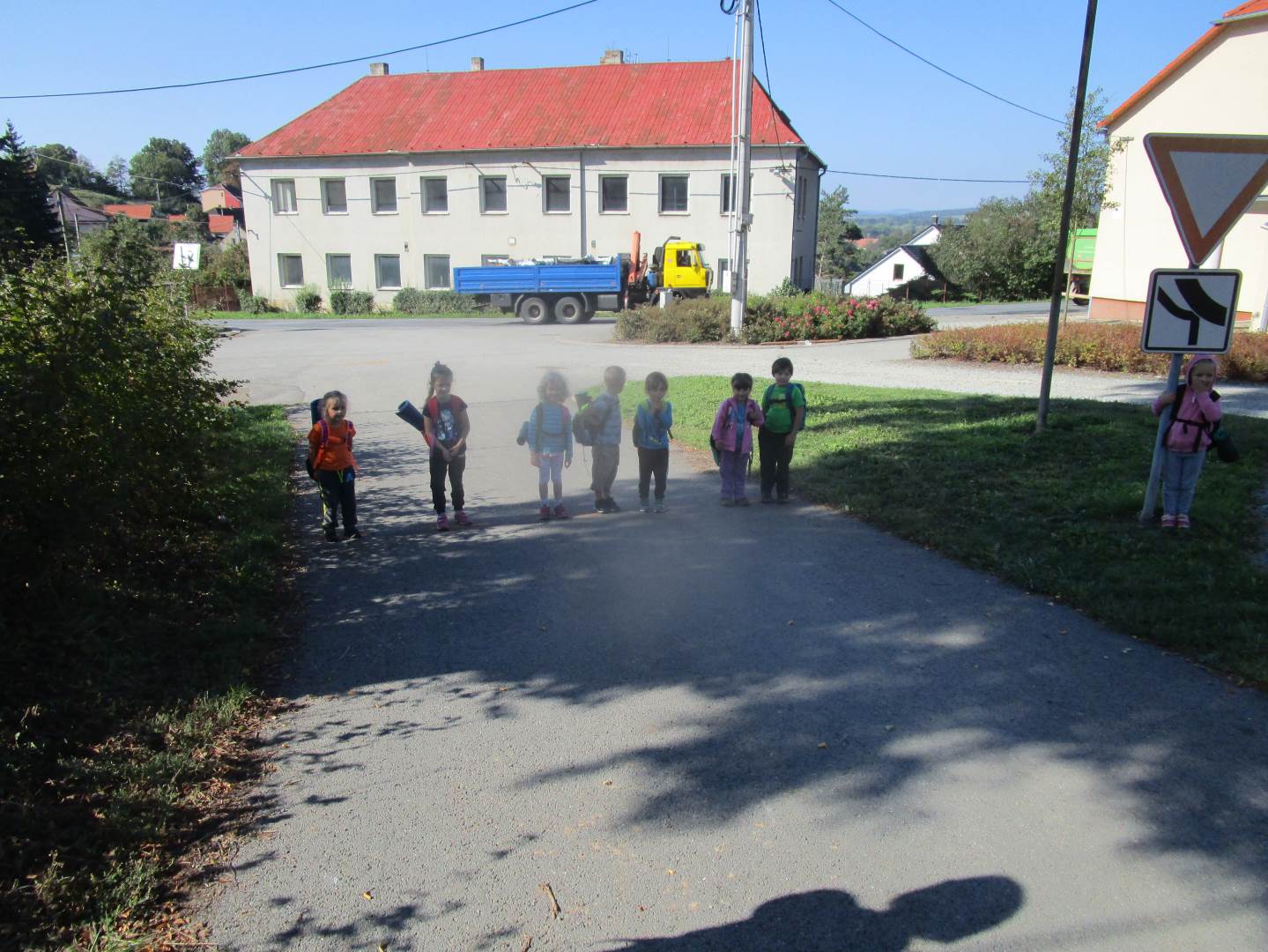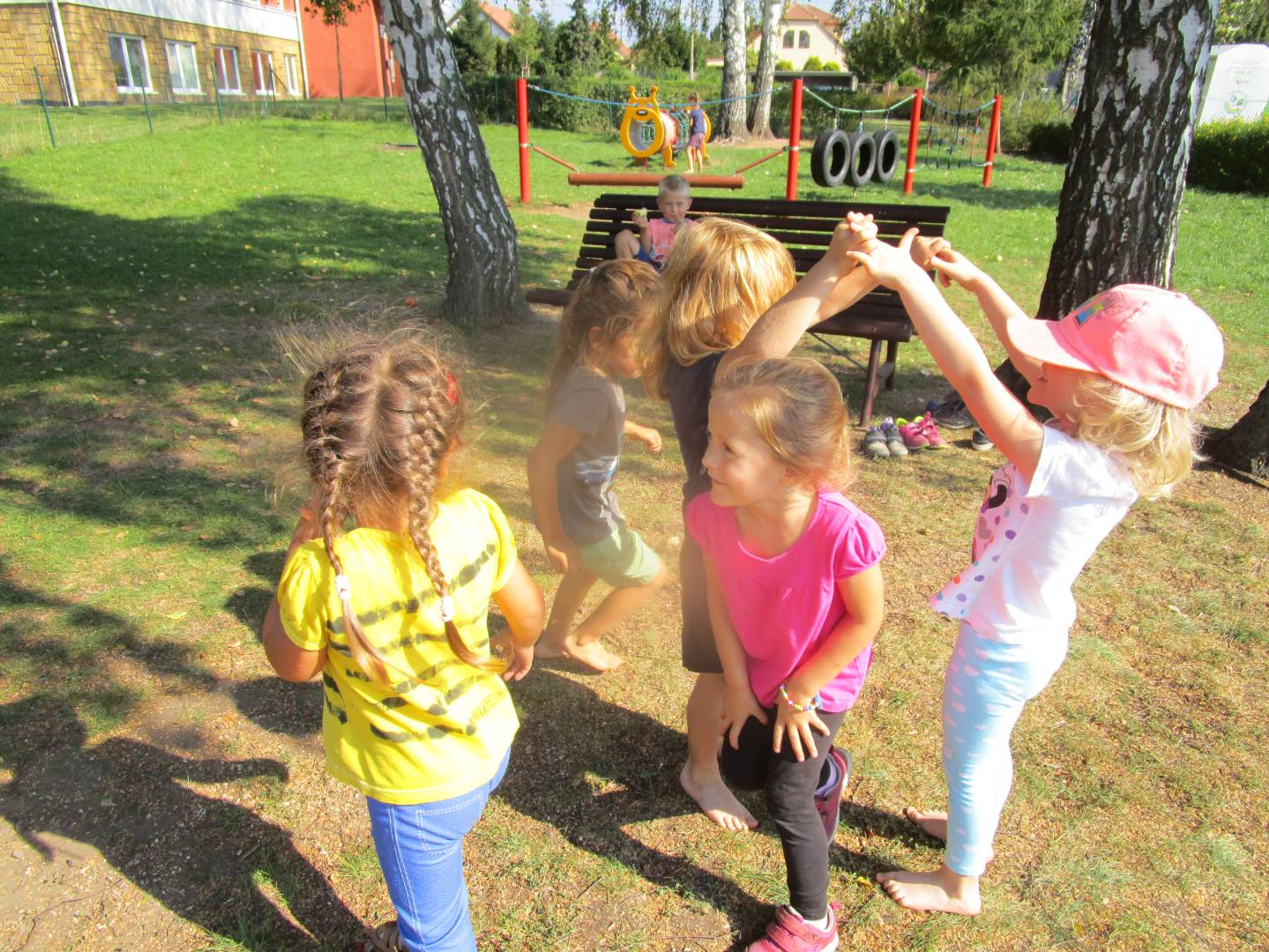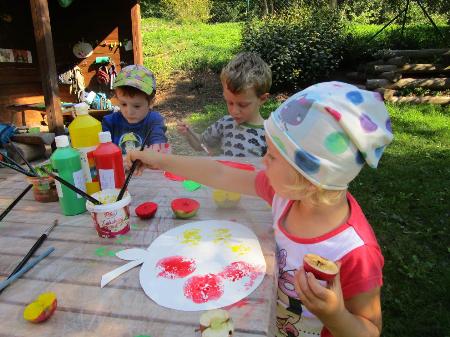 V pondělí se jdeme podívat, kde probíhaly sobotní cyklokrosové závody. Startujeme od kulturního domu a cesta nás vede kolem klád, různými lesními serpentinami až k ovečkám. Další dny si opakujeme písničky o jablíčku, počítáme je, porovnáváme velikost a barvu, zkoušíme je nosit na hlavě. Zjišťujeme, že jablíčka chutnají nejen nám, ale i zvířátkům a objevujeme, jak se z jablíček dělá mošt. Nakonec si jablíčka namalujem a vida, dá se s nimi i tisknout! Ve třídě rádi cvičíme, na elipse vytváříme pavučinu přátelství a své kamarády si namalujeme. Naučili jsme se hrát Zlatou bránu a skákat Panáka.
