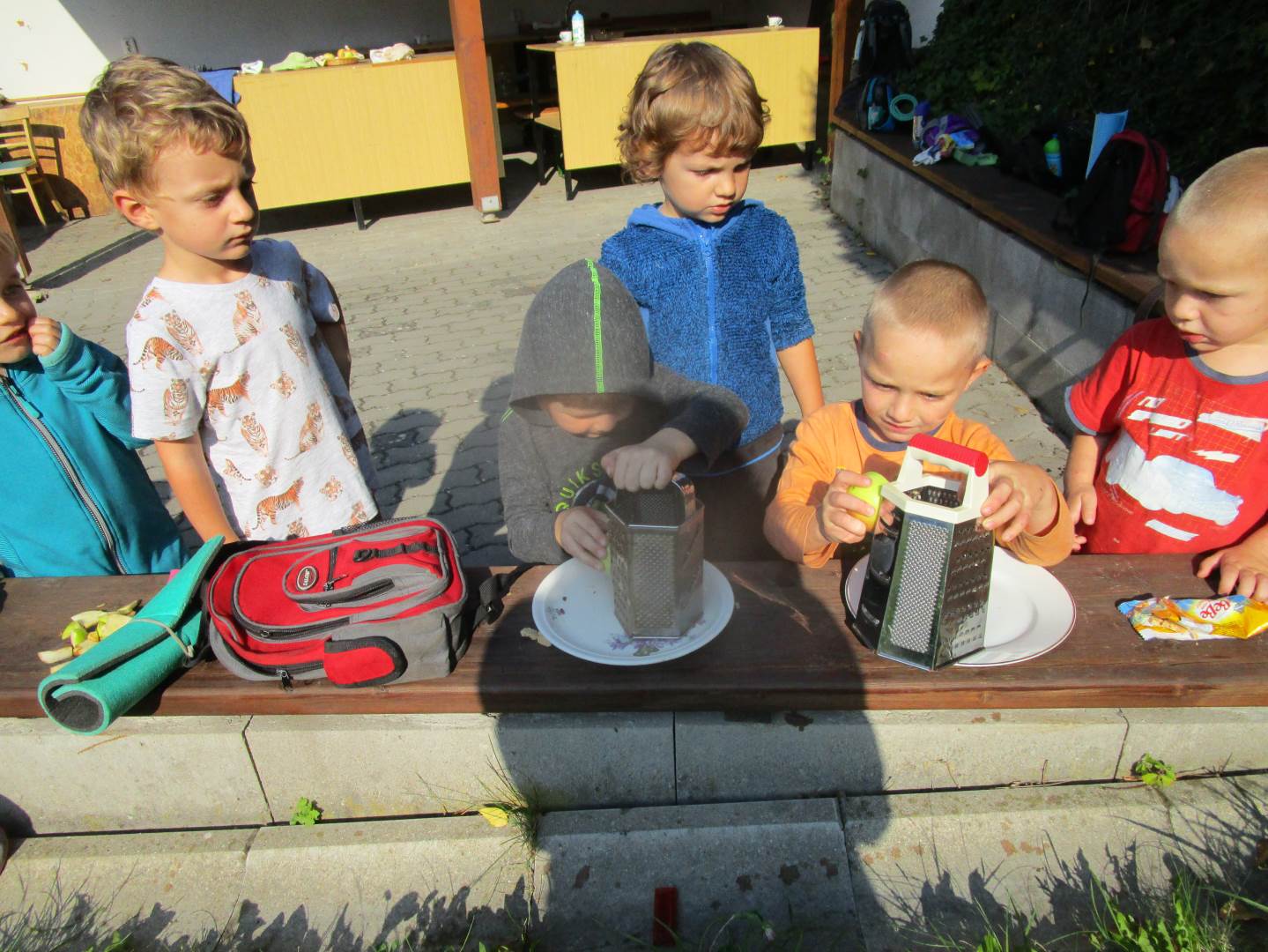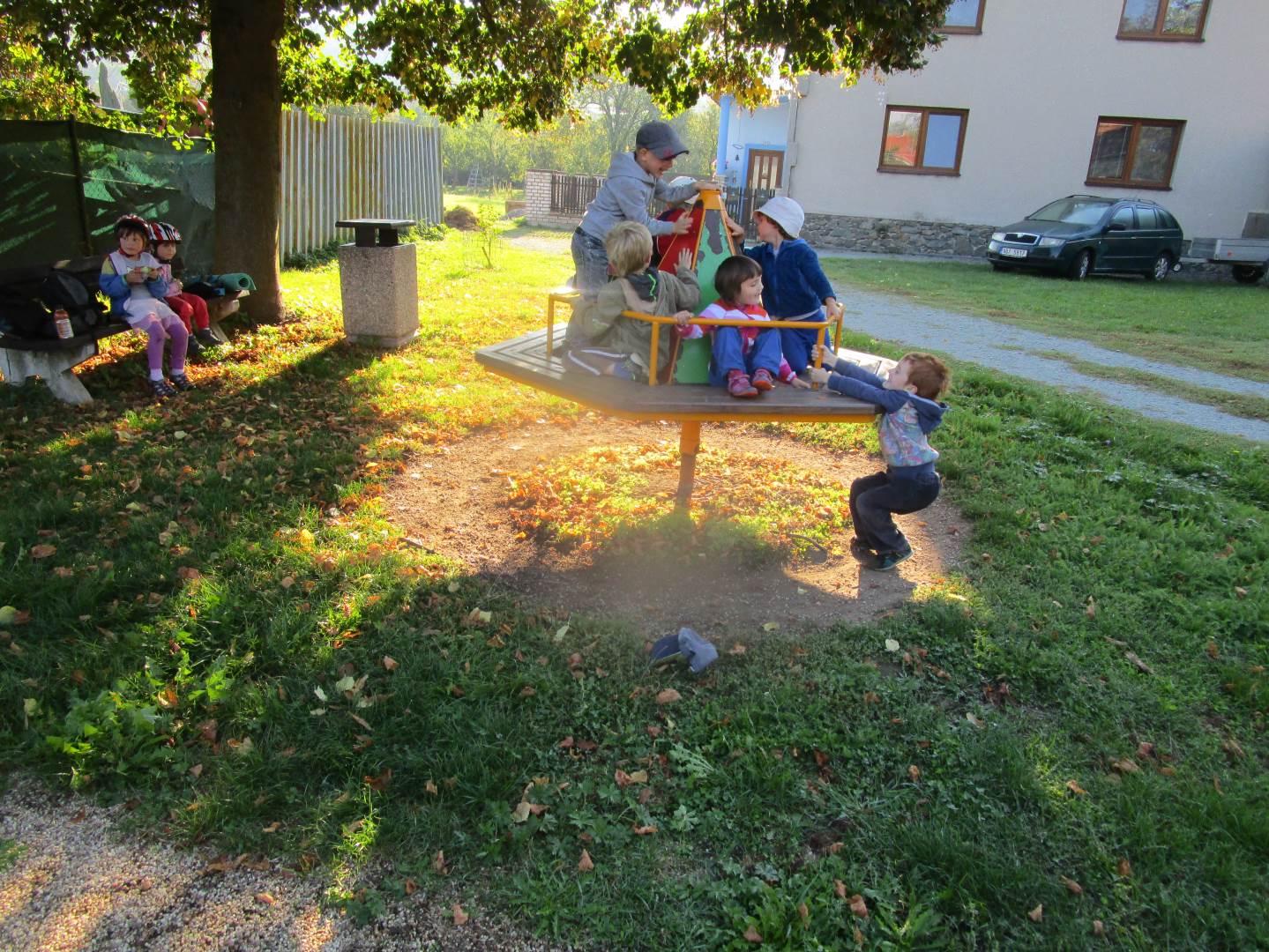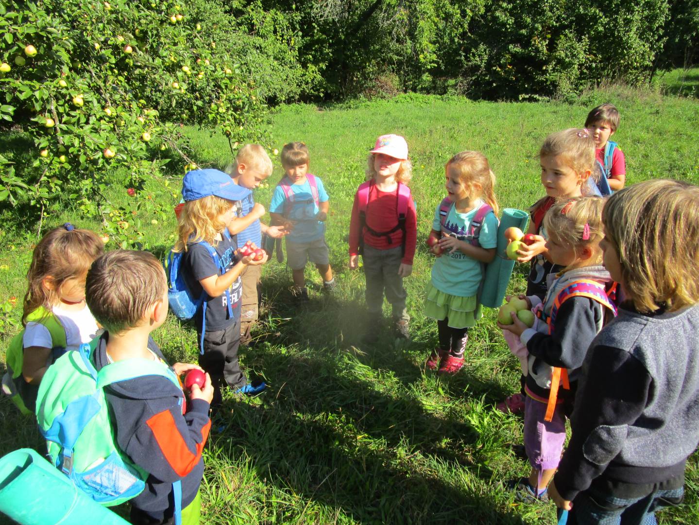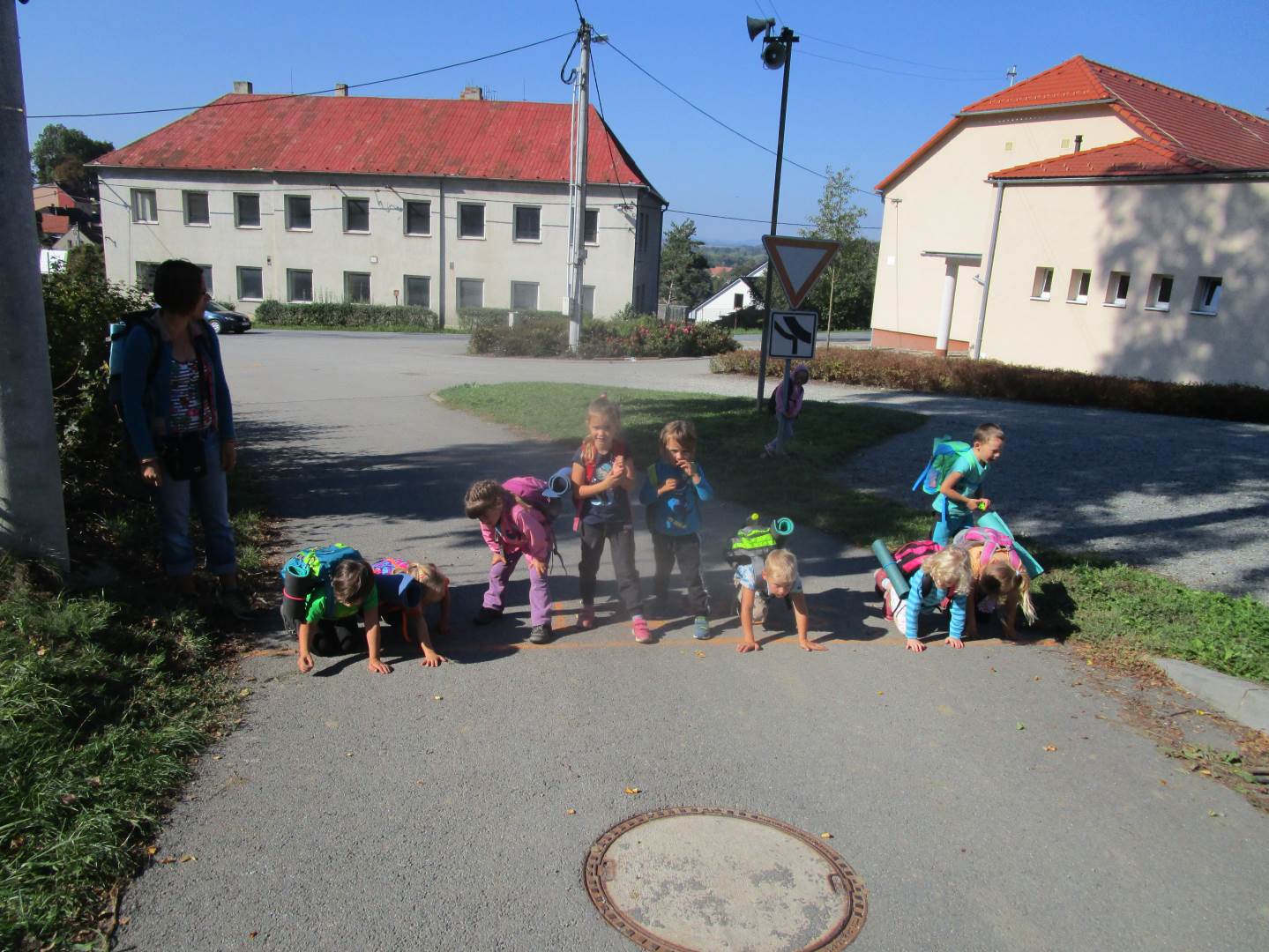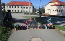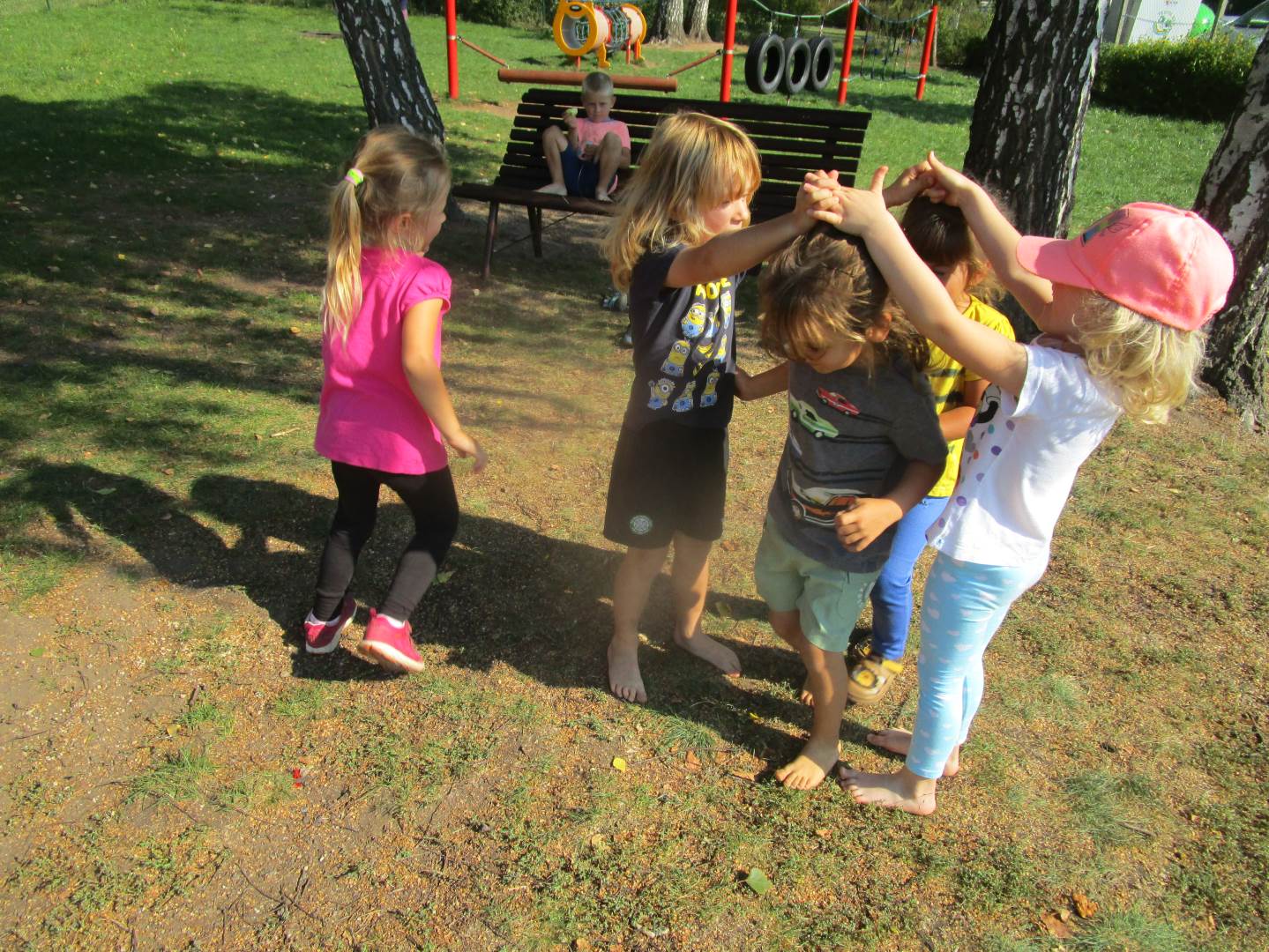V pondělí se jdeme podívat, kde probíhaly sobotní cyklokrosové závody. Startujeme od kulturního domu a cesta nás vede kolem klád, různými lesními serpentinami až k ovečkám. Další dny si opakujeme písničky o jablíčku, počítáme je, porovnáváme velikost a barvu, zkoušíme je nosit na hlavě. Zjišťujeme, že jablíčka chutnají nejen nám, ale i zvířátkům a objevujeme, jak se z jablíček dělá mošt. Nakonec si jablíčka namalujem a vida, dá se s nimi i tisknout! Ve třídě rádi cvičíme, na elipse vytváříme pavučinu přátelství a své kamarády si namalujeme. Naučili jsme se hrát Zlatou bránu a skákat Panáka.