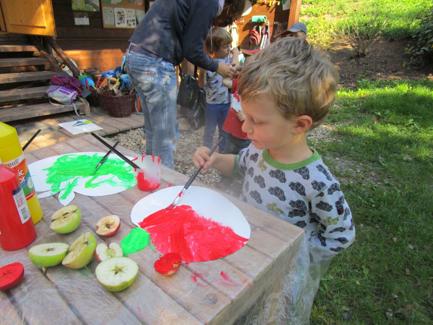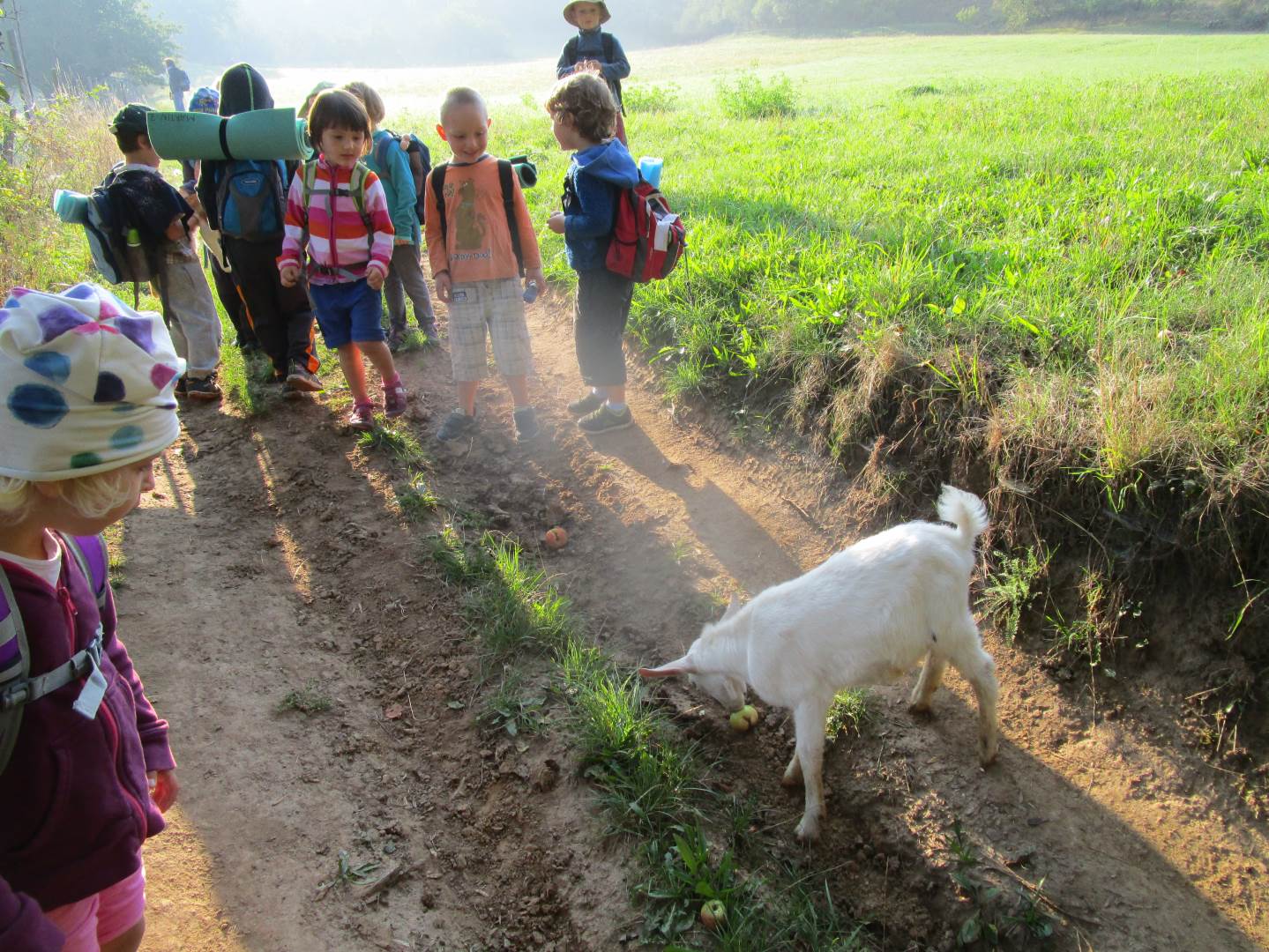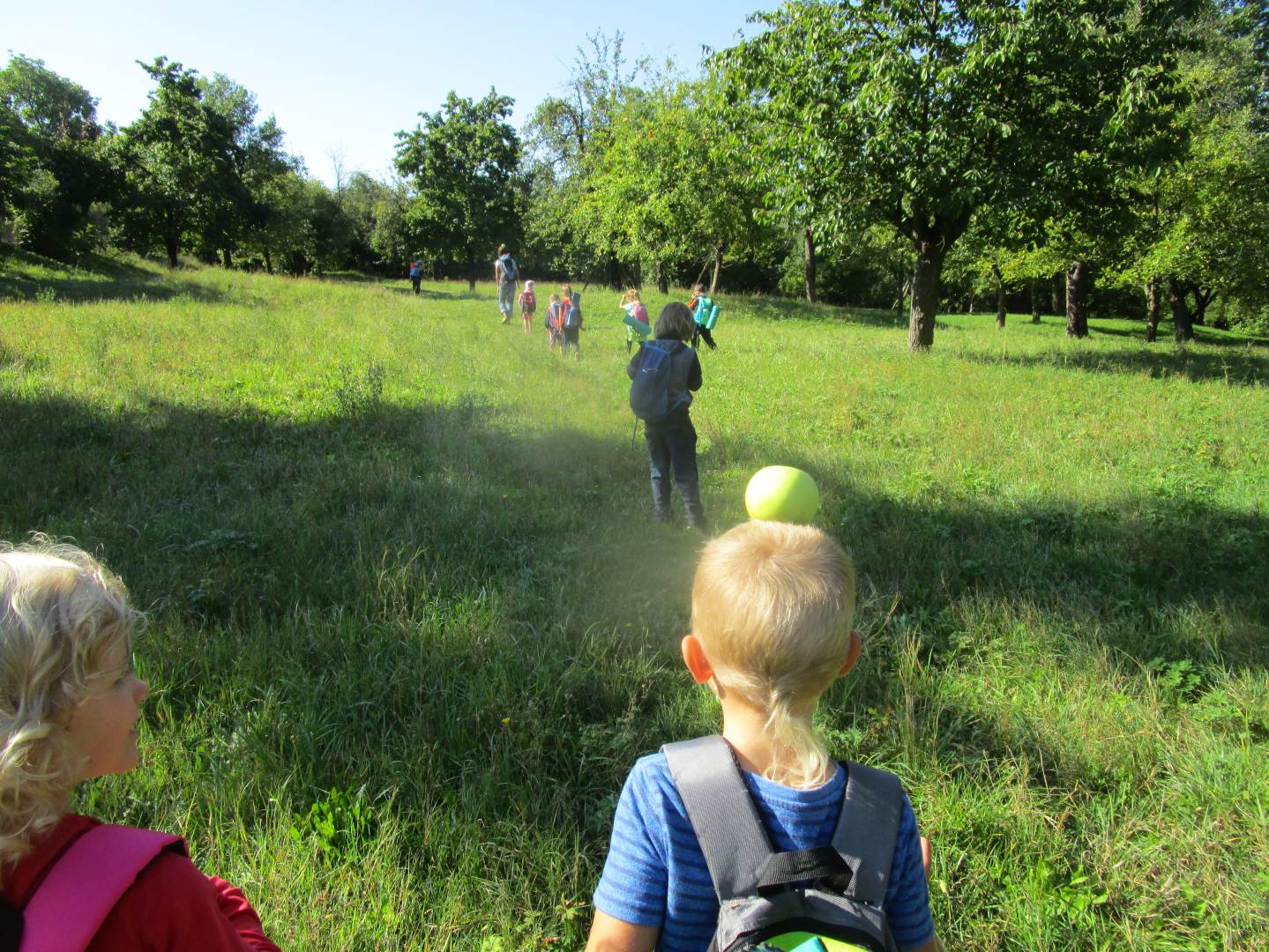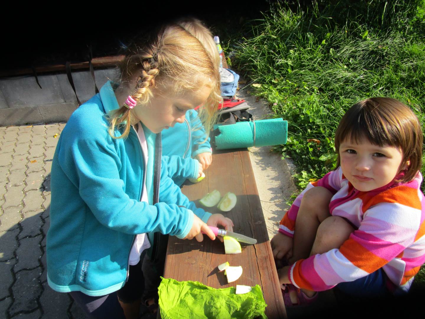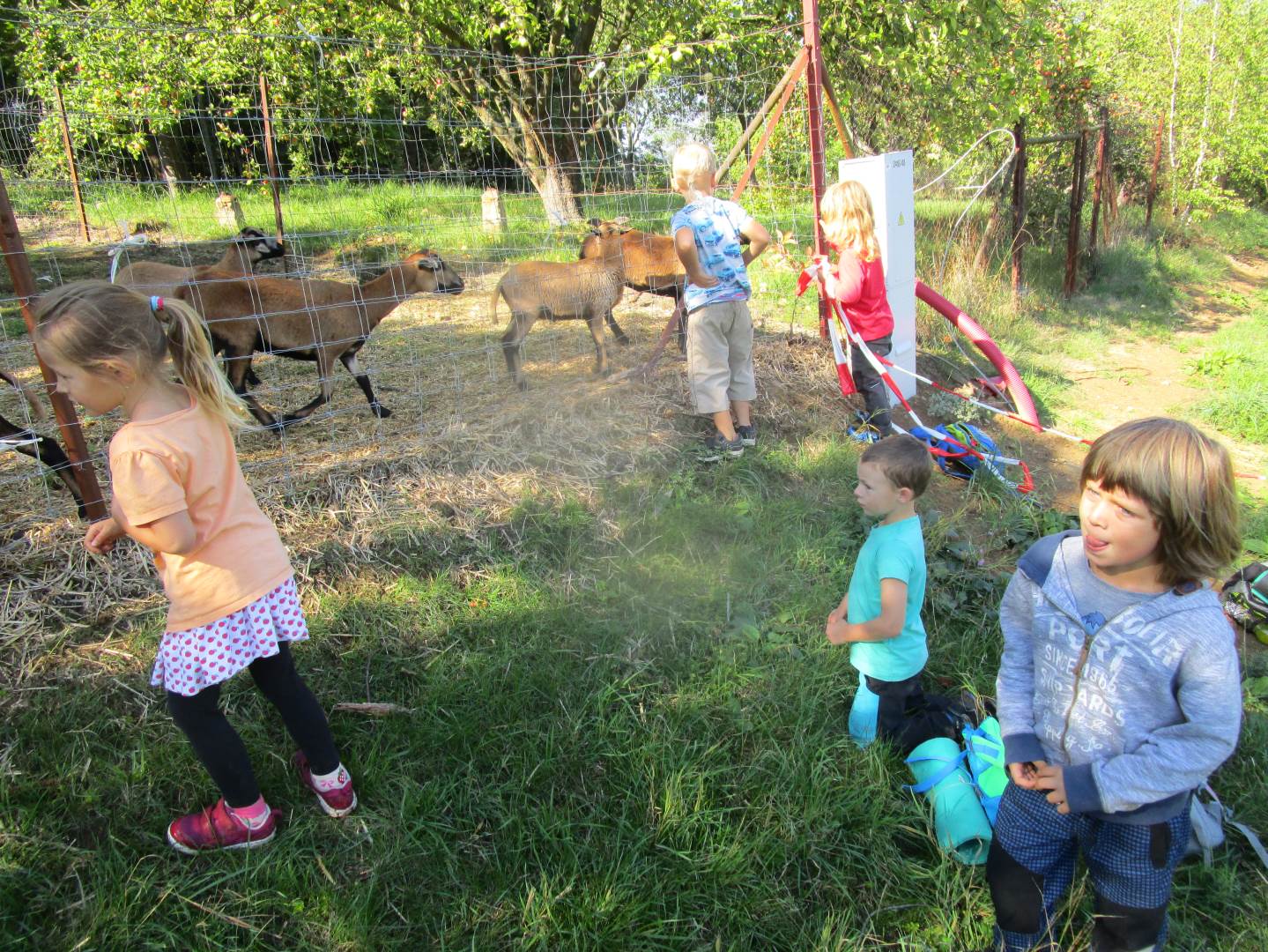 V pondělí se jdeme podívat, kde probíhaly sobotní cyklokrosové závody. Startujeme od kulturního domu a cesta nás vede kolem klád, různými lesními serpentinami až k ovečkám. Další dny si opakujeme písničky o jablíčku, počítáme je, porovnáváme velikost a barvu, zkoušíme je nosit na hlavě. Zjišťujeme, že jablíčka chutnají nejen nám, ale i zvířátkům a objevujeme, jak se z jablíček dělá mošt. Nakonec si jablíčka namalujem a vida, dá se s nimi i tisknout! Ve třídě rádi cvičíme, na elipse vytváříme pavučinu přátelství a své kamarády si namalujeme. Naučili jsme se hrát Zlatou bránu a skákat Panáka.