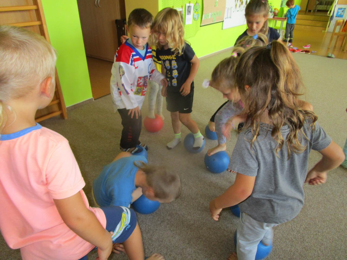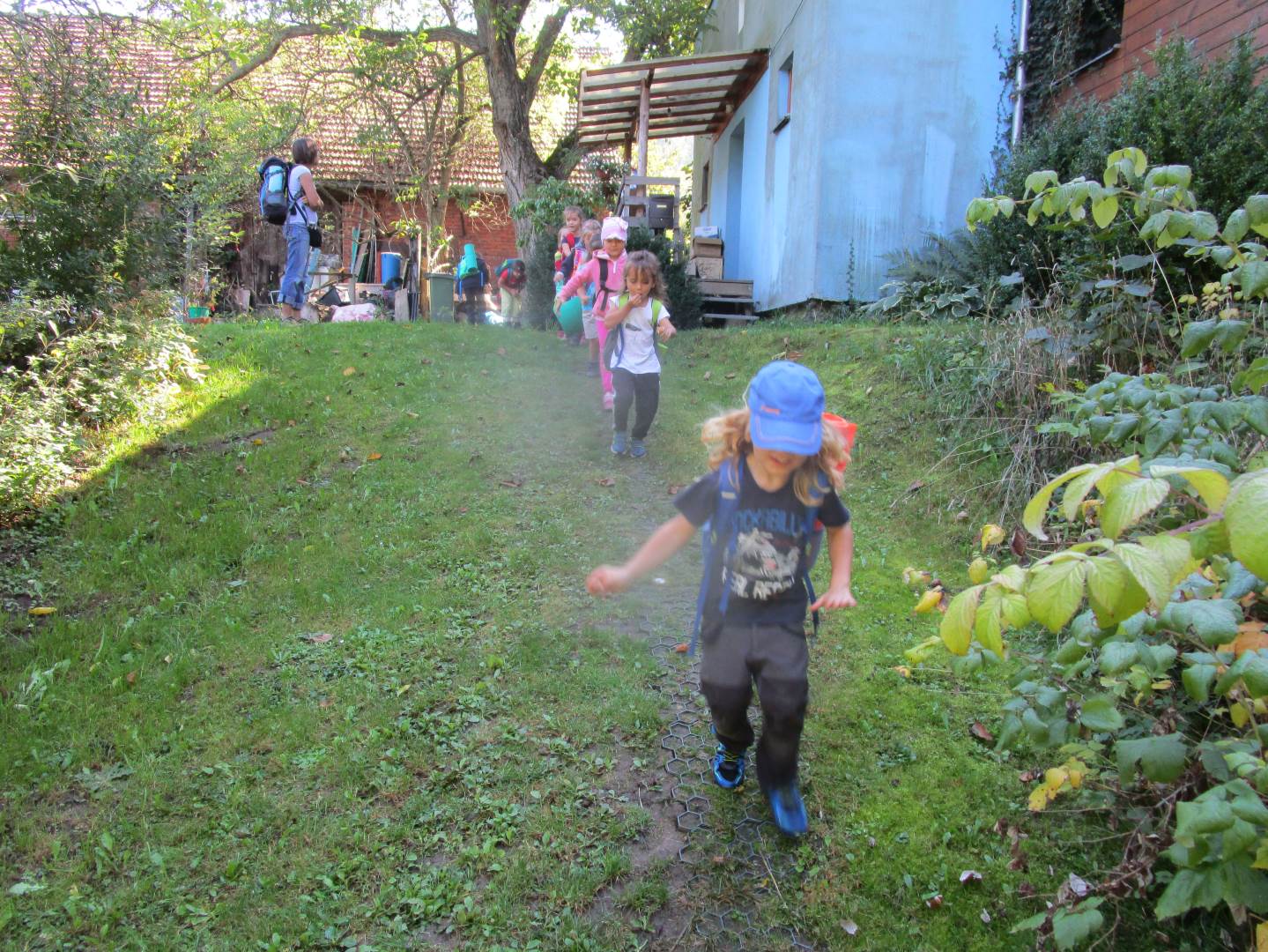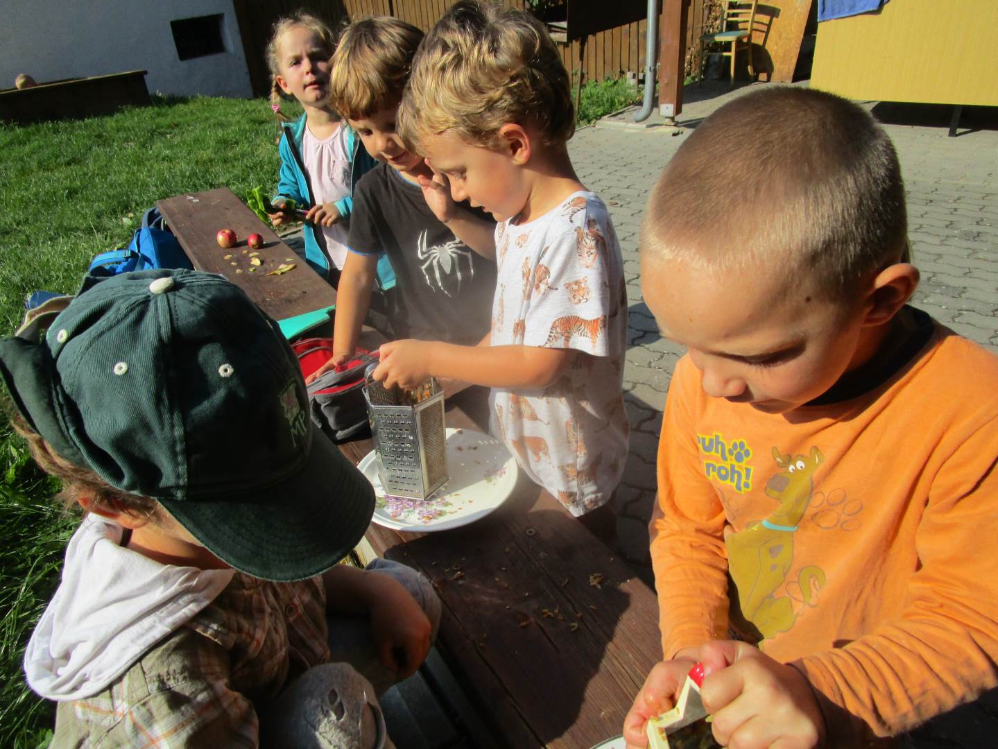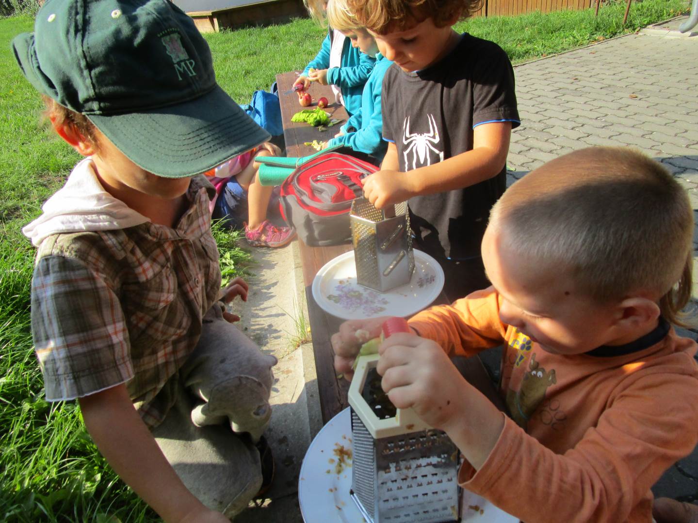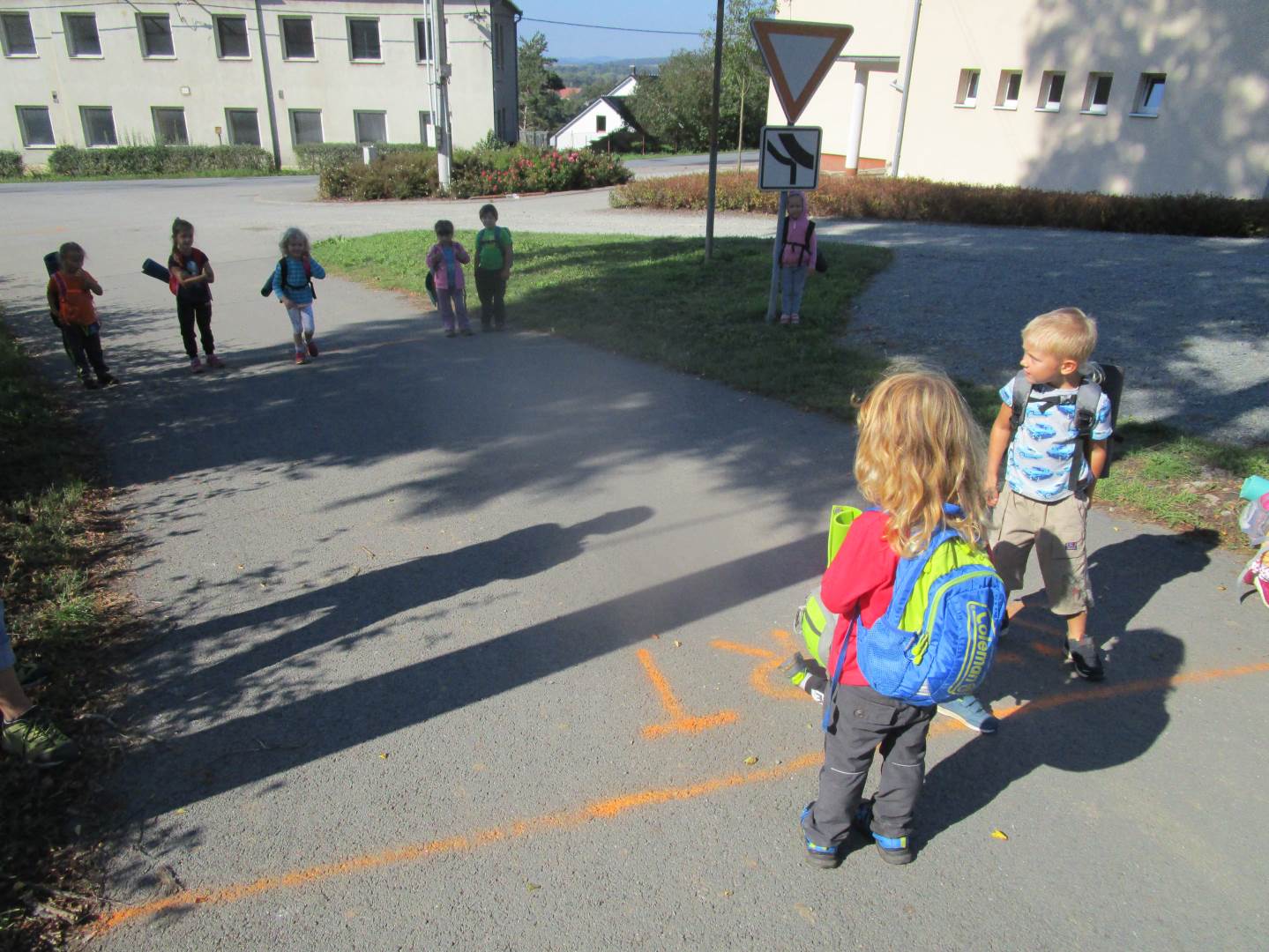 V pondělí se jdeme podívat, kde probíhaly sobotní cyklokrosové závody. Startujeme od kulturního domu a cesta nás vede kolem klád, různými lesními serpentinami až k ovečkám. Další dny si opakujeme písničky o jablíčku, počítáme je, porovnáváme velikost a barvu, zkoušíme je nosit na hlavě. Zjišťujeme, že jablíčka chutnají nejen nám, ale i zvířátkům a objevujeme, jak se z jablíček dělá mošt. Nakonec si jablíčka namalujem a vida, dá se s nimi i tisknout! Ve třídě rádi cvičíme, na elipse vytváříme pavučinu přátelství a své kamarády si namalujeme. Naučili jsme se hrát Zlatou bránu a skákat Panáka.
