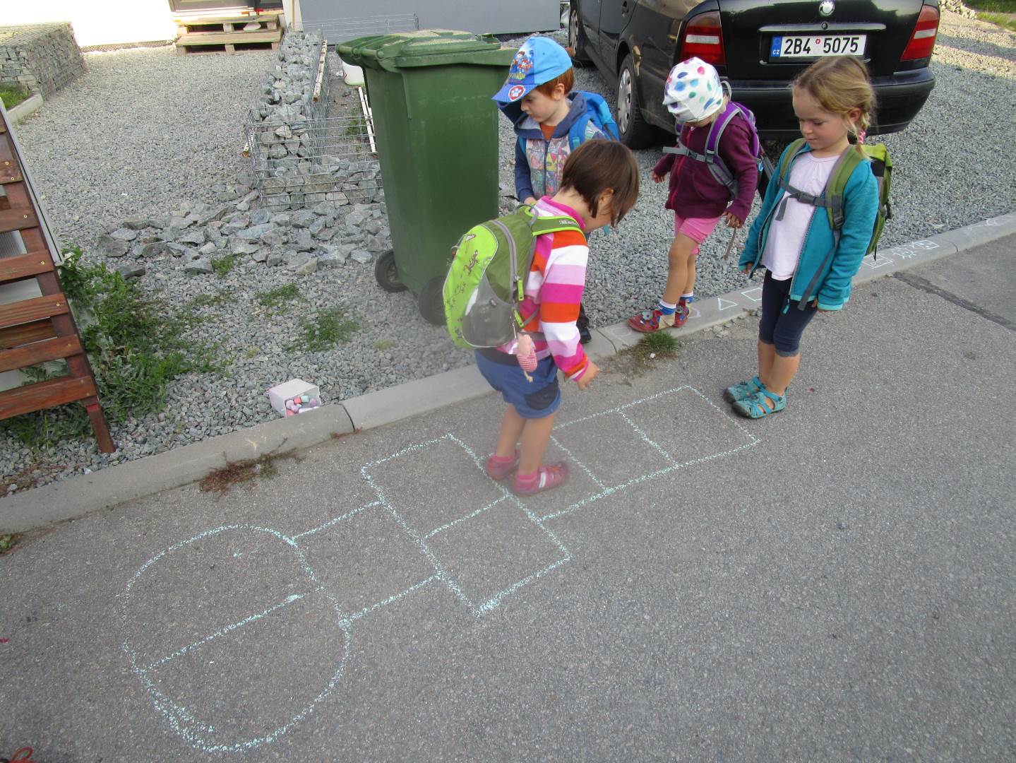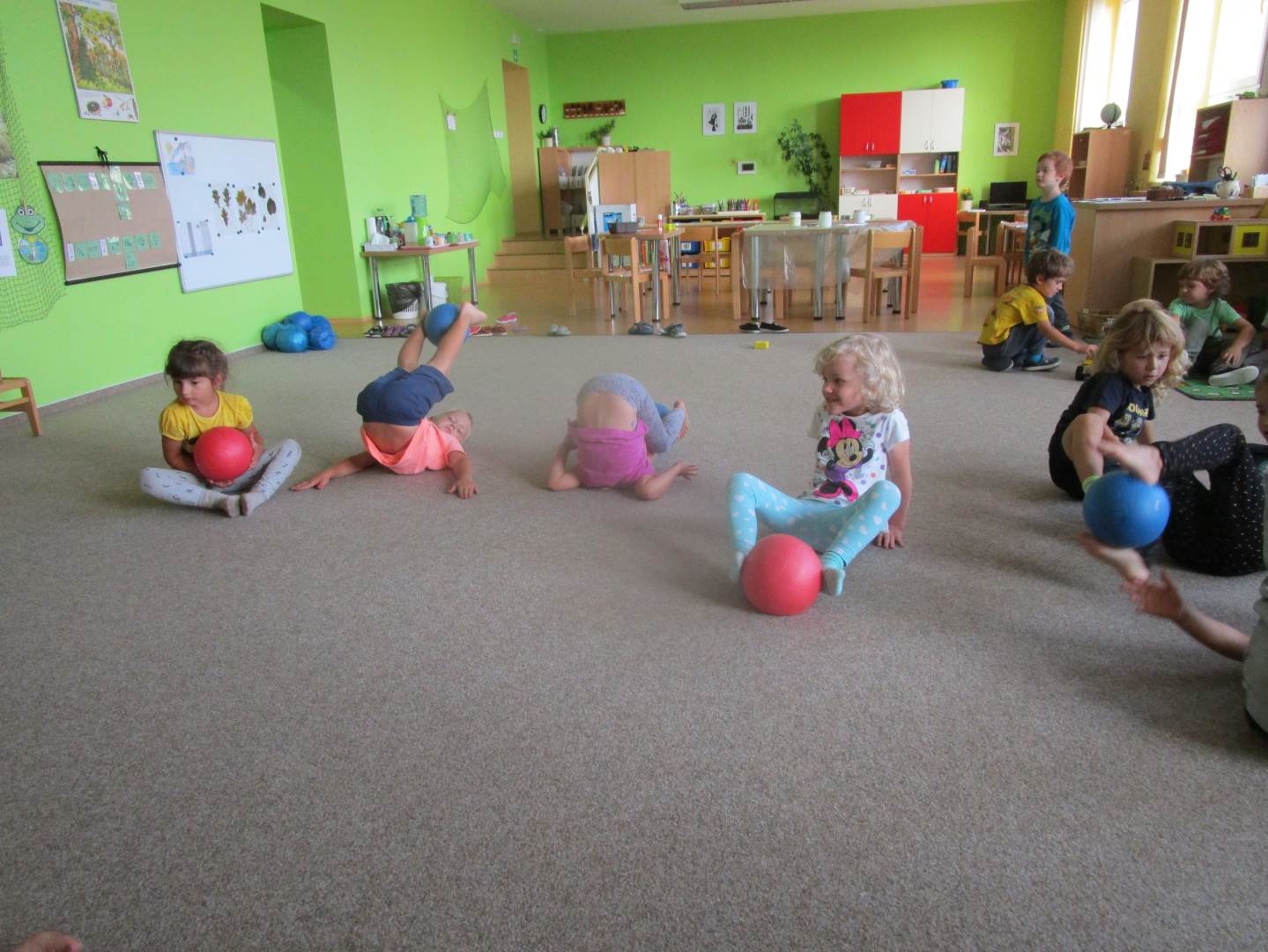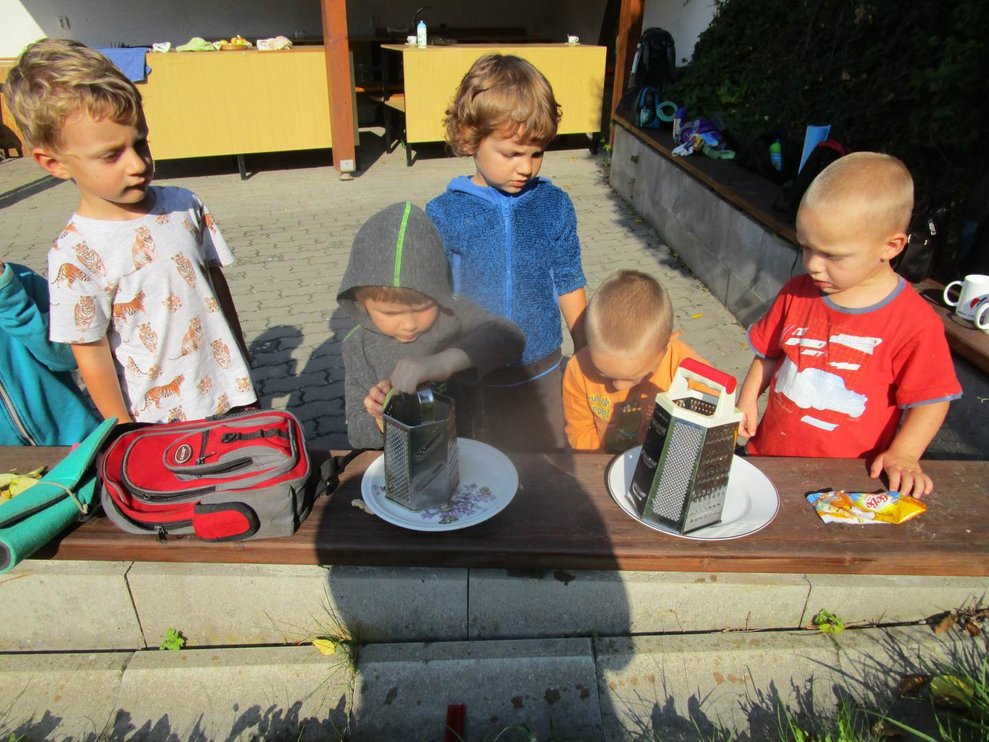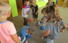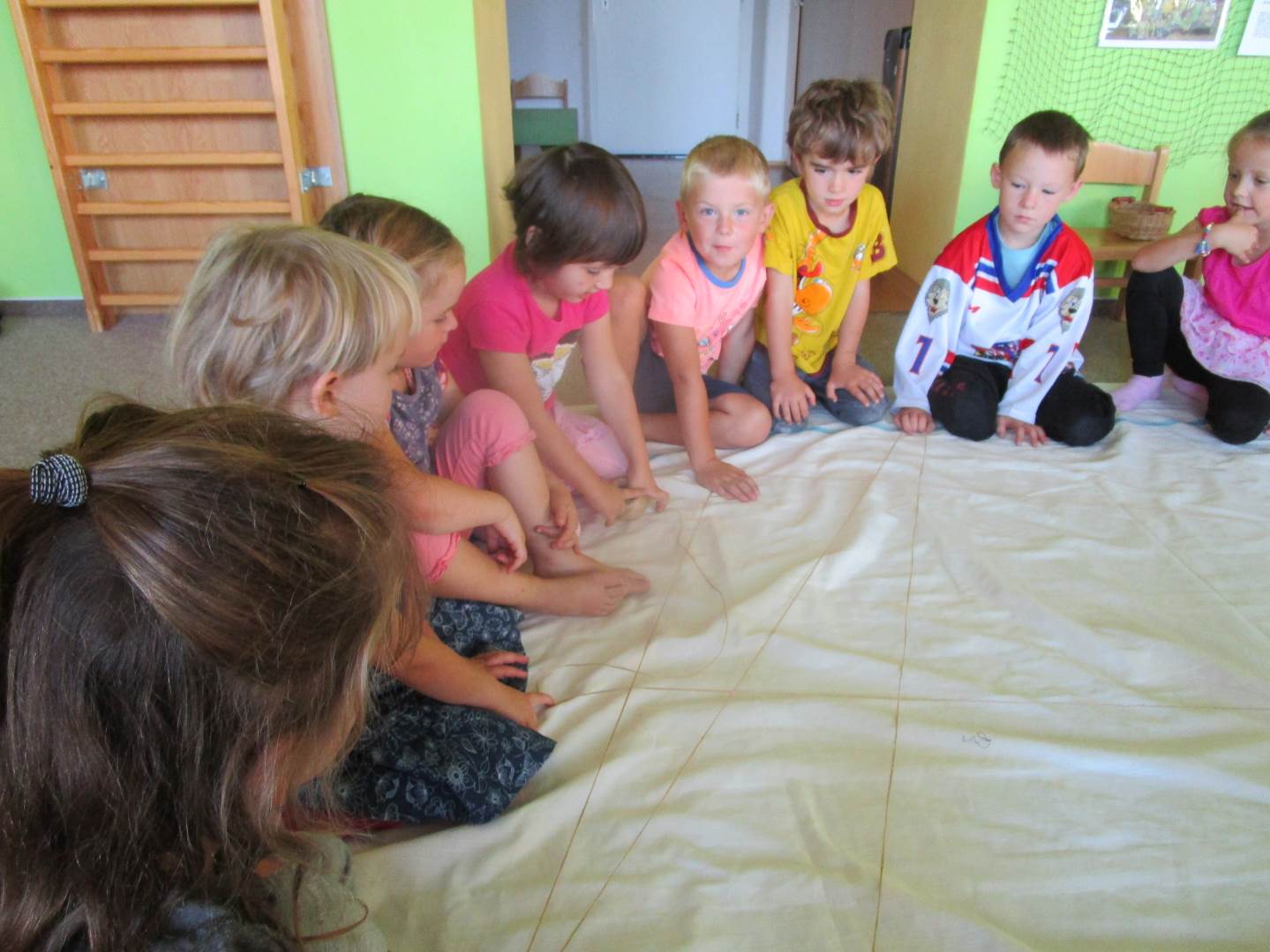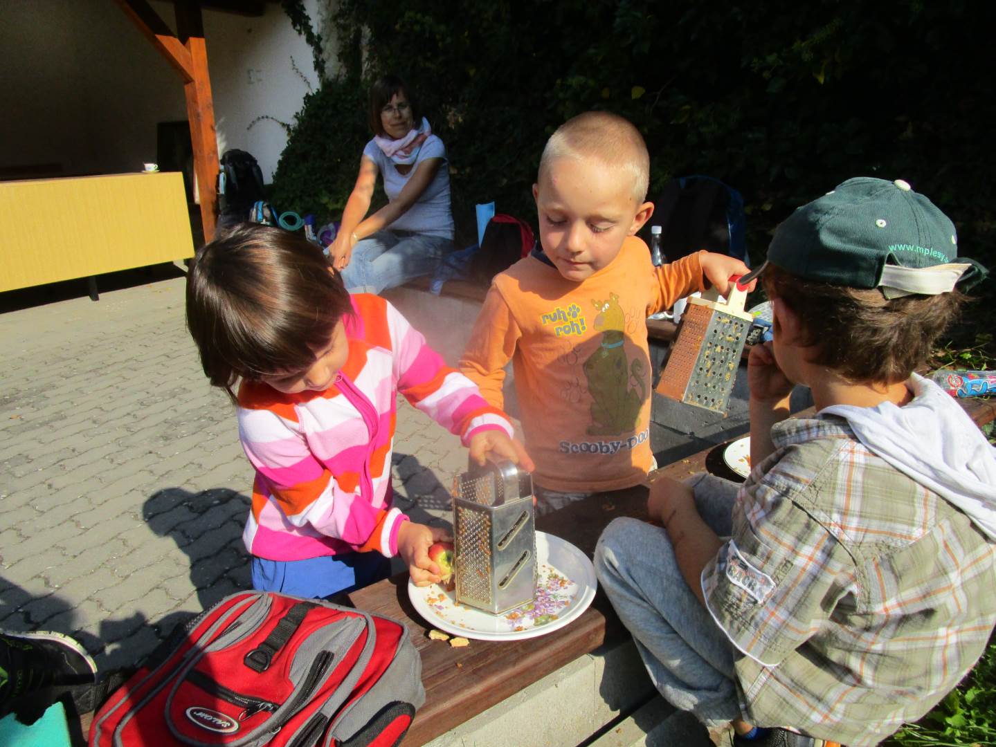 V pondělí se jdeme podívat, kde probíhaly sobotní cyklokrosové závody. Startujeme od kulturního domu a cesta nás vede kolem klád, různými lesními serpentinami až k ovečkám. Další dny si opakujeme písničky o jablíčku, počítáme je, porovnáváme velikost a barvu, zkoušíme je nosit na hlavě. Zjišťujeme, že jablíčka chutnají nejen nám, ale i zvířátkům a objevujeme, jak se z jablíček dělá mošt. Nakonec si jablíčka namalujem a vida, dá se s nimi i tisknout! Ve třídě rádi cvičíme, na elipse vytváříme pavučinu přátelství a své kamarády si namalujeme. Naučili jsme se hrát Zlatou bránu a skákat Panáka.