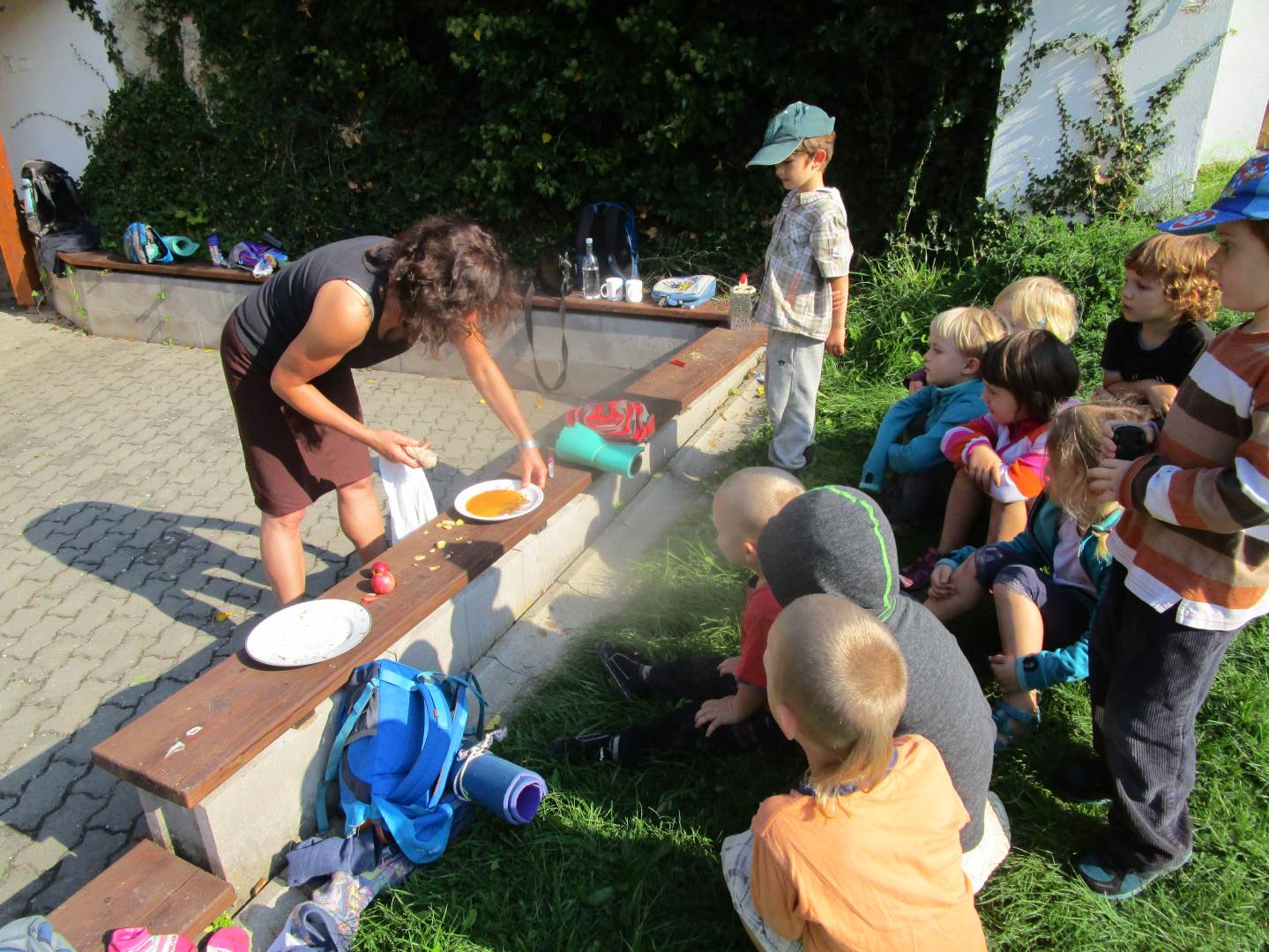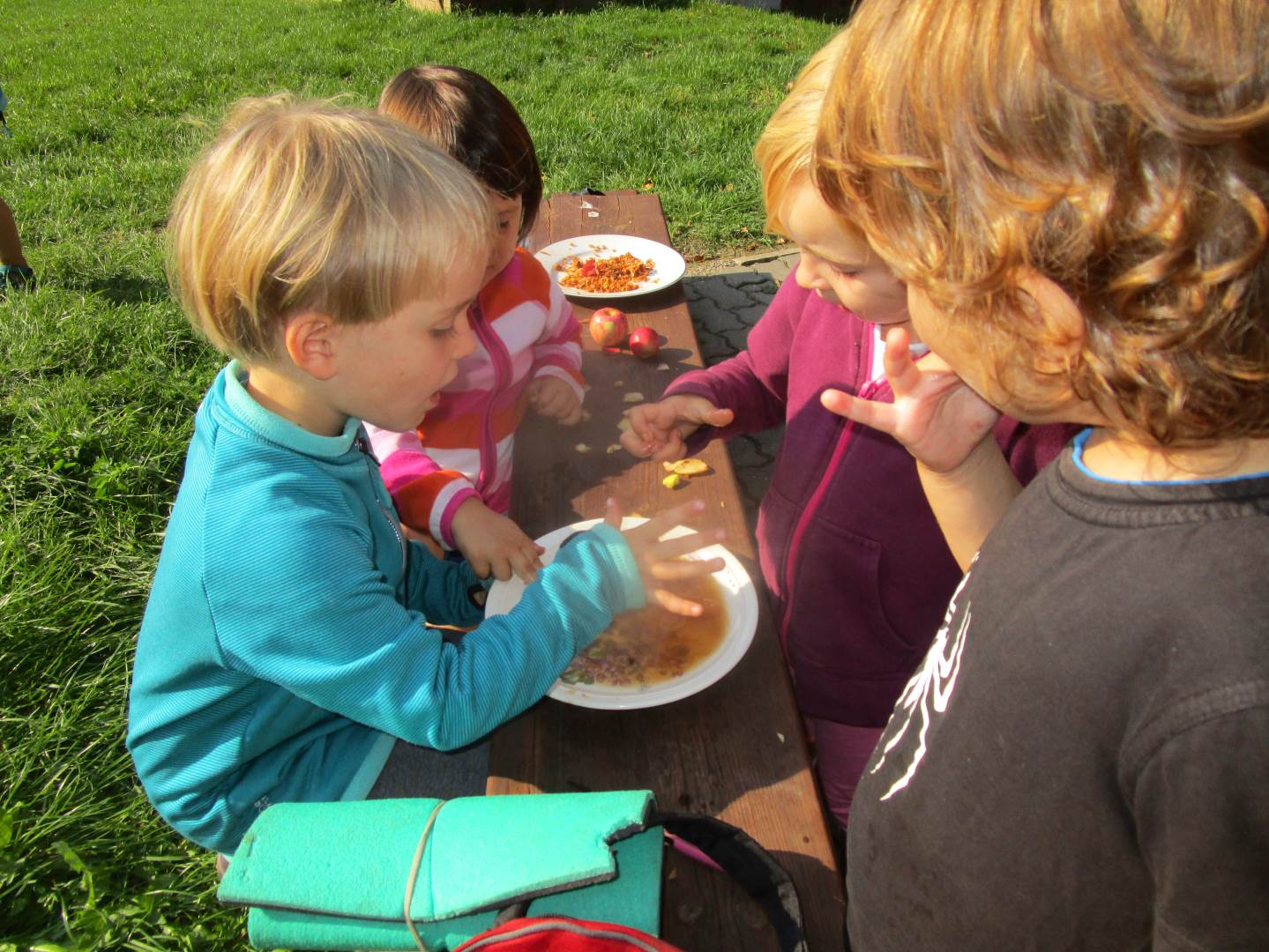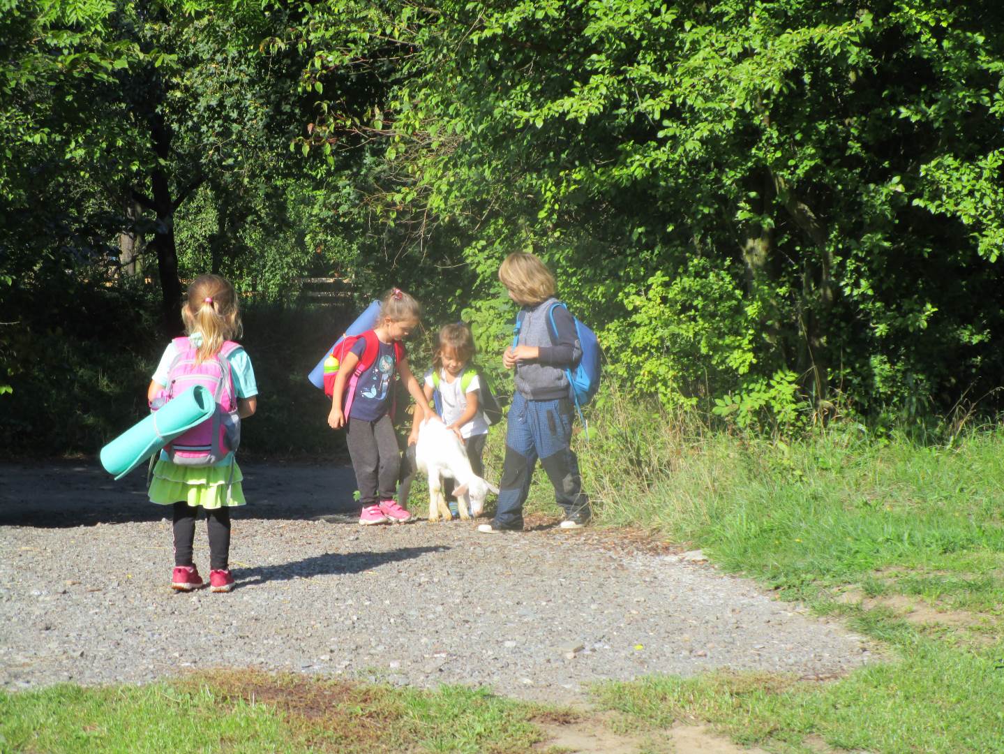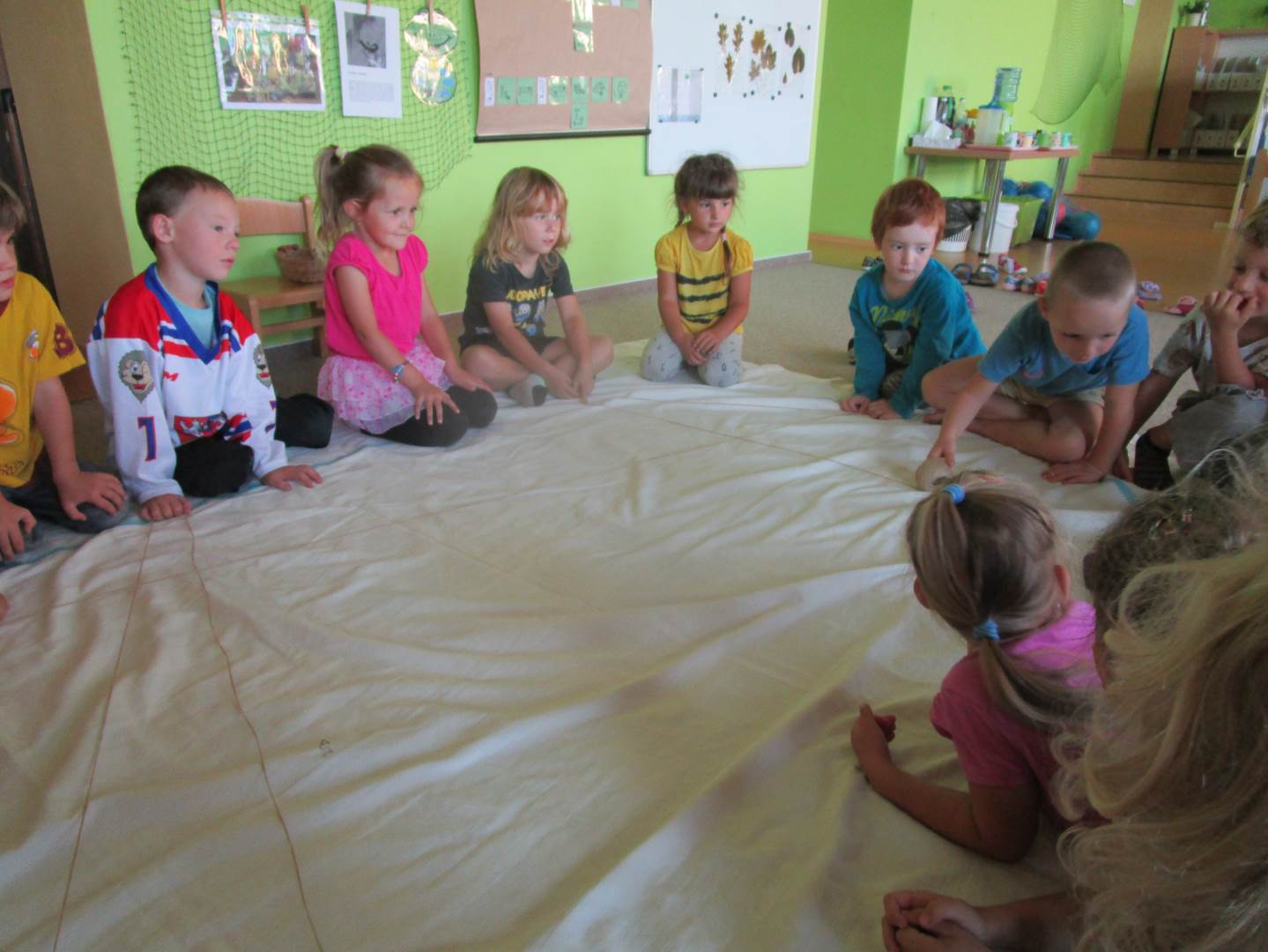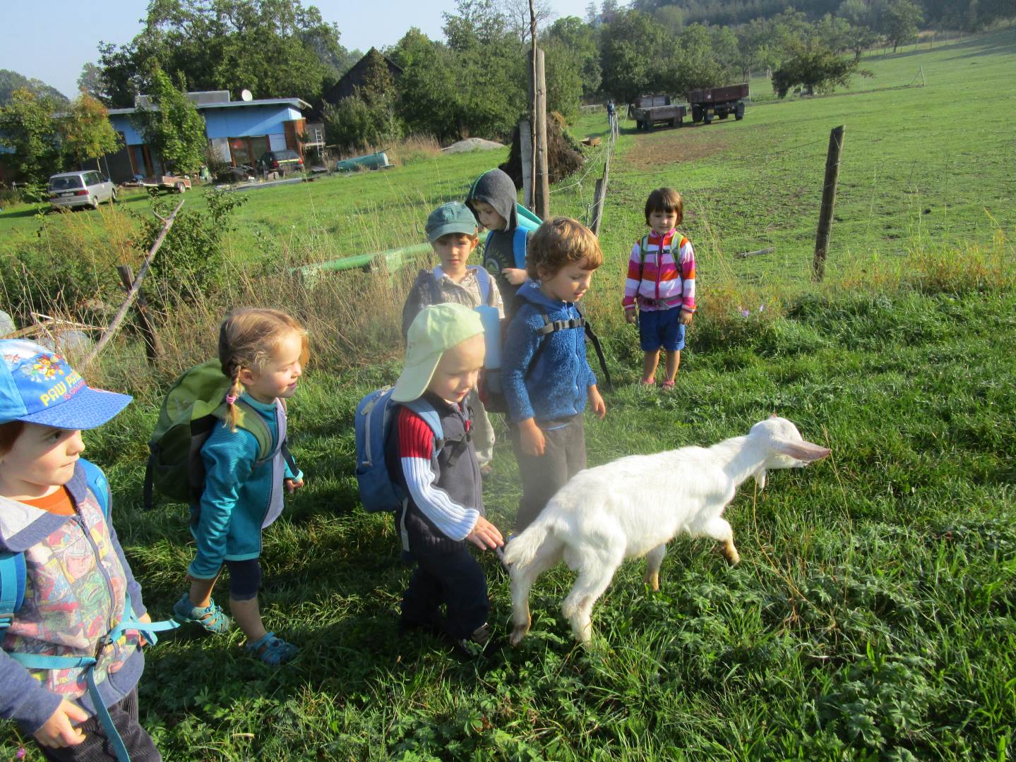 V pondělí se jdeme podívat, kde probíhaly sobotní cyklokrosové závody. Startujeme od kulturního domu a cesta nás vede kolem klád, různými lesními serpentinami až k ovečkám. Další dny si opakujeme písničky o jablíčku, počítáme je, porovnáváme velikost a barvu, zkoušíme je nosit na hlavě. Zjišťujeme, že jablíčka chutnají nejen nám, ale i zvířátkům a objevujeme, jak se z jablíček dělá mošt. Nakonec si jablíčka namalujem a vida, dá se s nimi i tisknout! Ve třídě rádi cvičíme, na elipse vytváříme pavučinu přátelství a své kamarády si namalujeme. Naučili jsme se hrát Zlatou bránu a skákat Panáka.