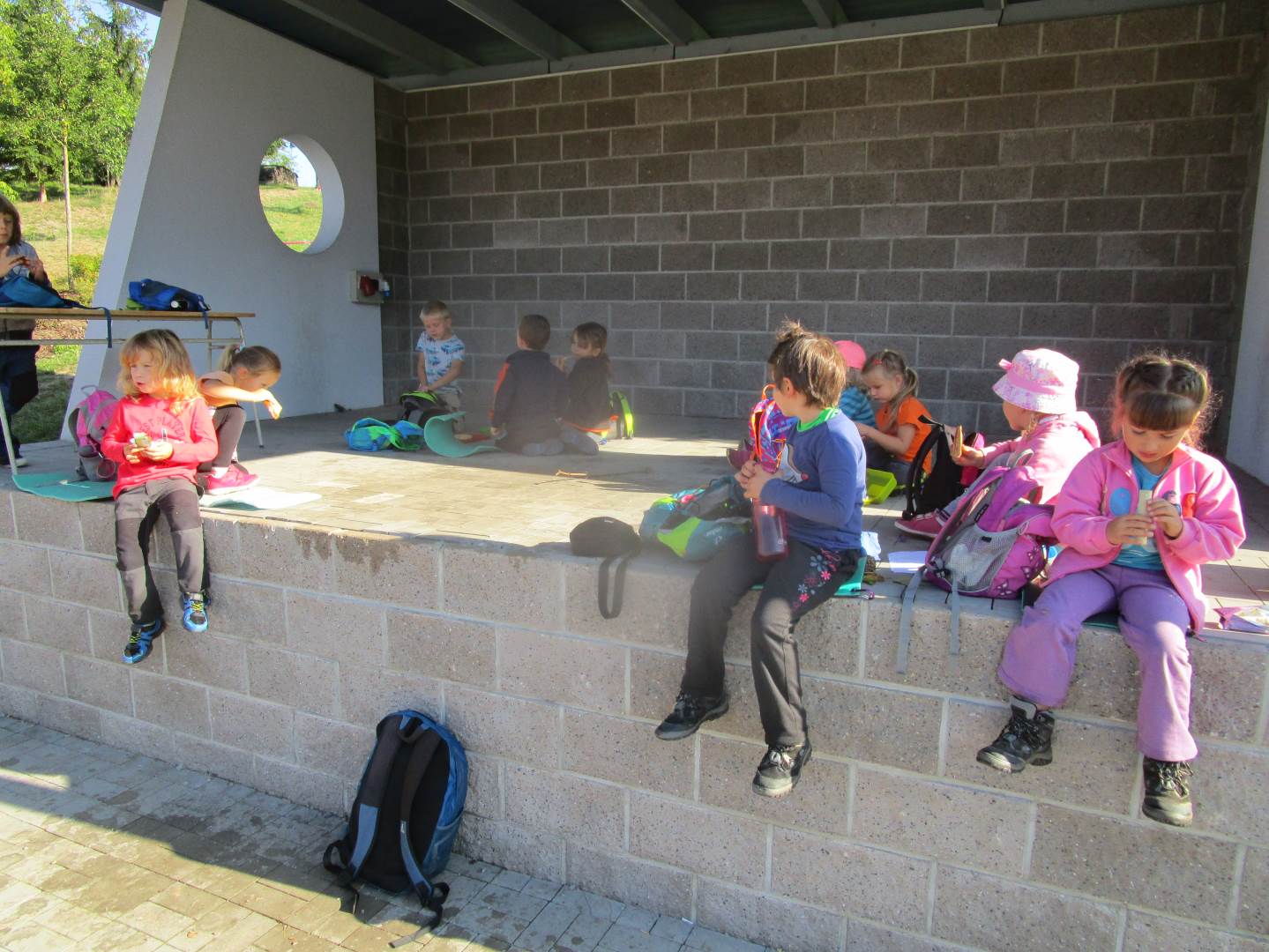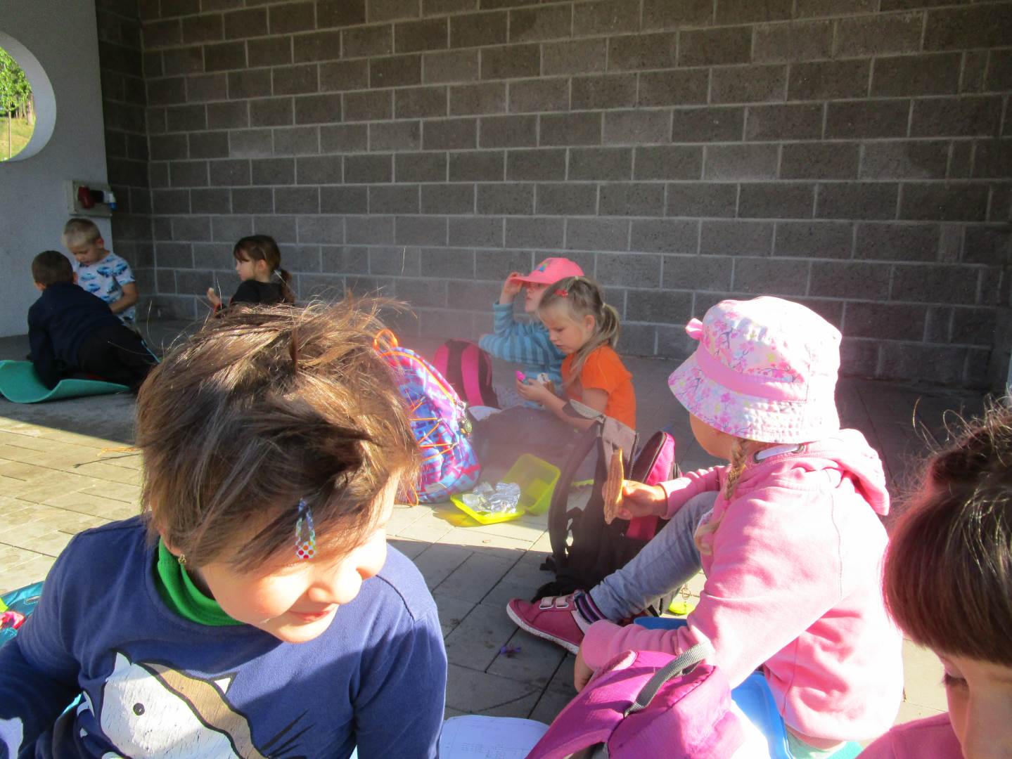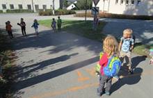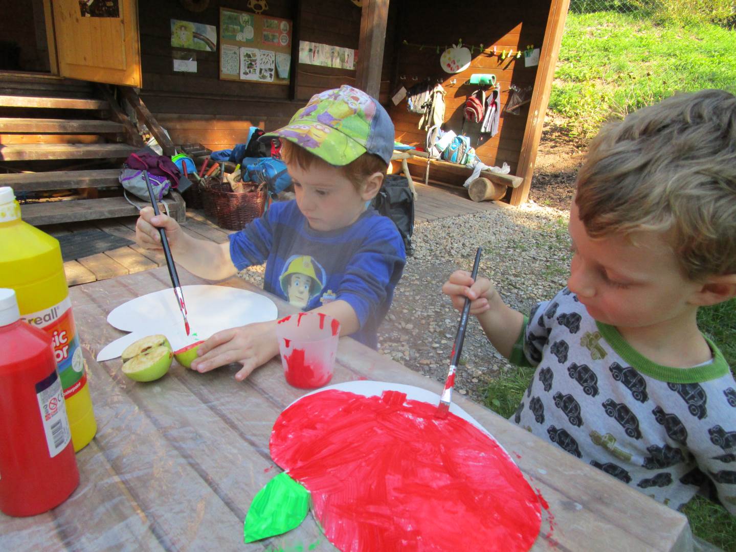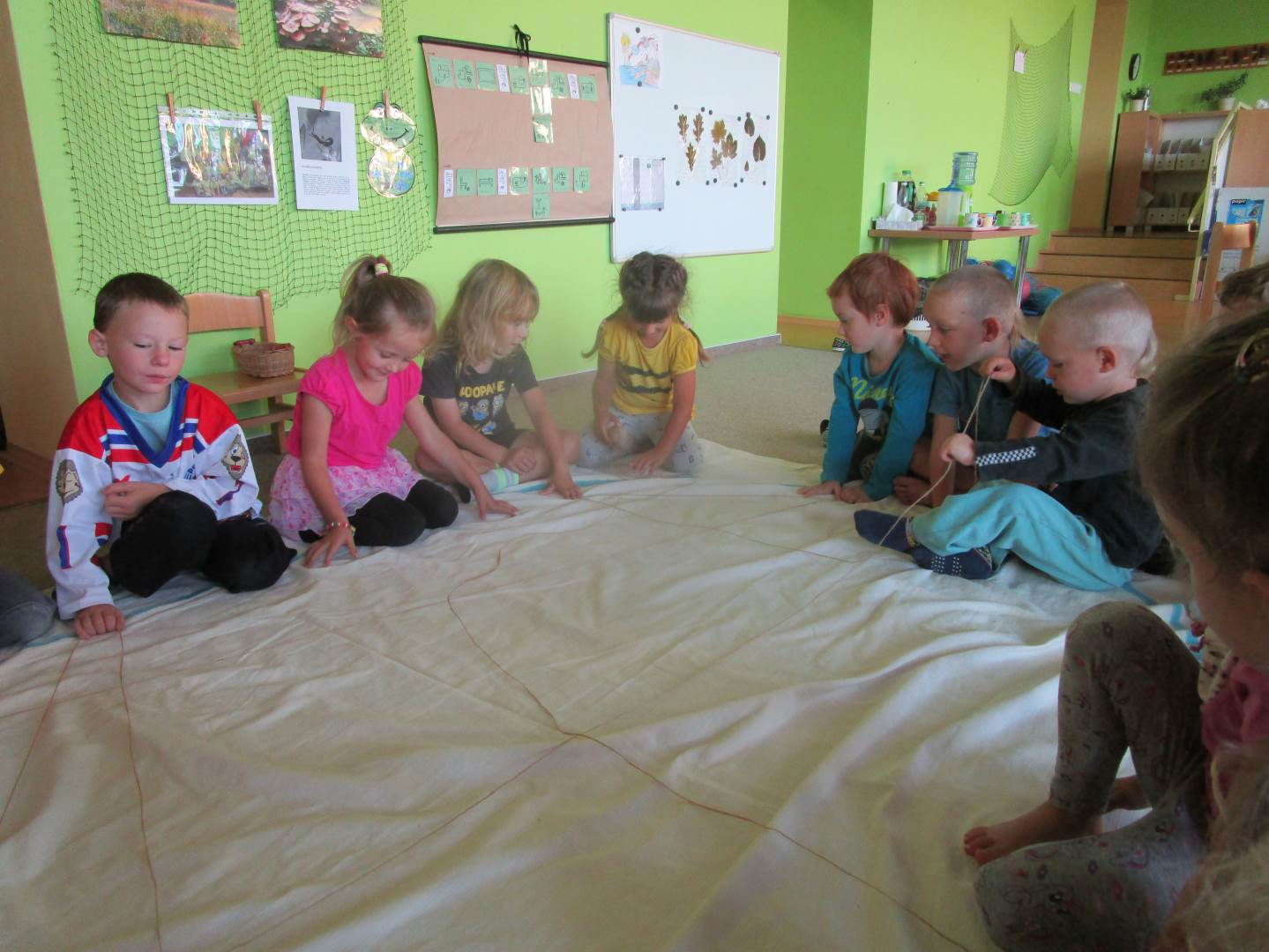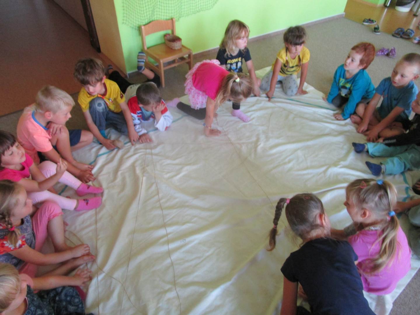 V pondělí se jdeme podívat, kde probíhaly sobotní cyklokrosové závody. Startujeme od kulturního domu a cesta nás vede kolem klád, různými lesními serpentinami až k ovečkám. Další dny si opakujeme písničky o jablíčku, počítáme je, porovnáváme velikost a barvu, zkoušíme je nosit na hlavě. Zjišťujeme, že jablíčka chutnají nejen nám, ale i zvířátkům a objevujeme, jak se z jablíček dělá mošt. Nakonec si jablíčka namalujem a vida, dá se s nimi i tisknout! Ve třídě rádi cvičíme, na elipse vytváříme pavučinu přátelství a své kamarády si namalujeme. Naučili jsme se hrát Zlatou bránu a skákat Panáka.