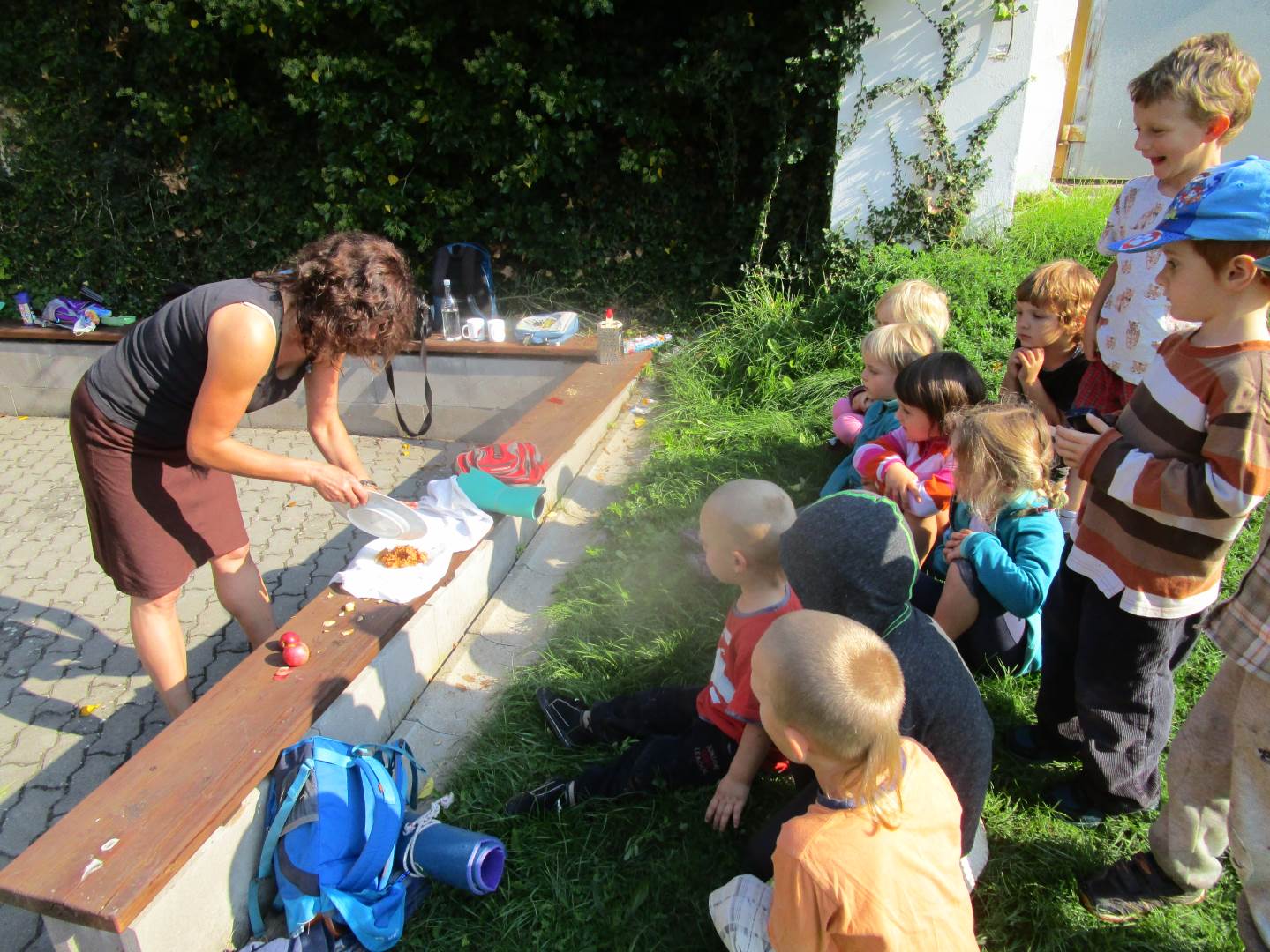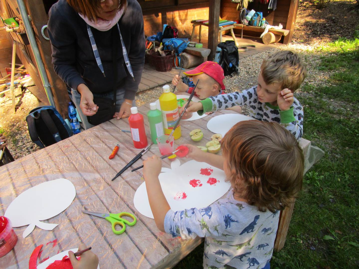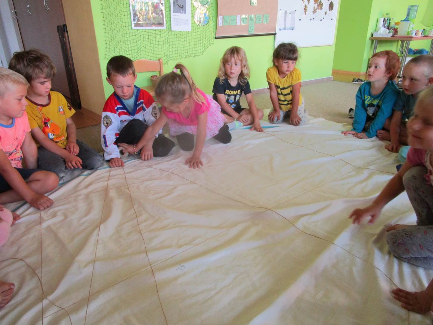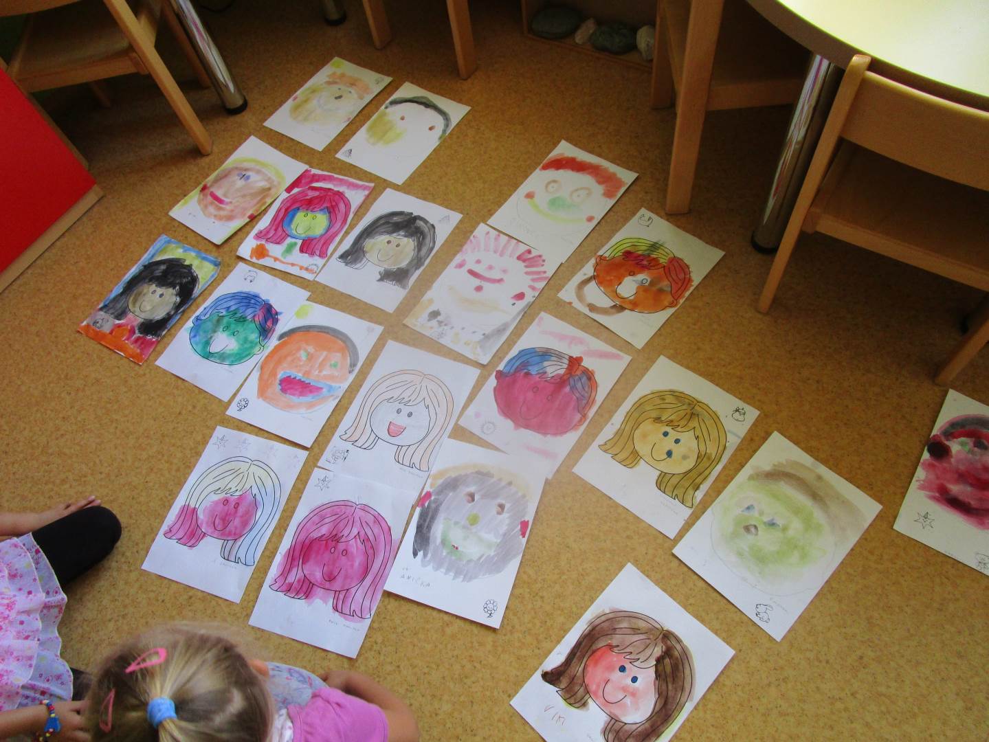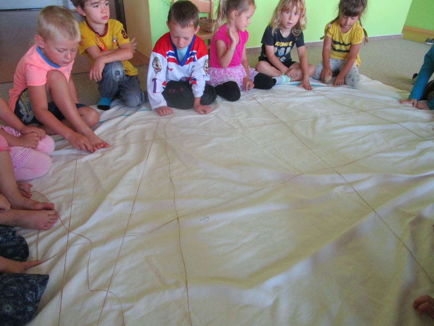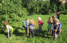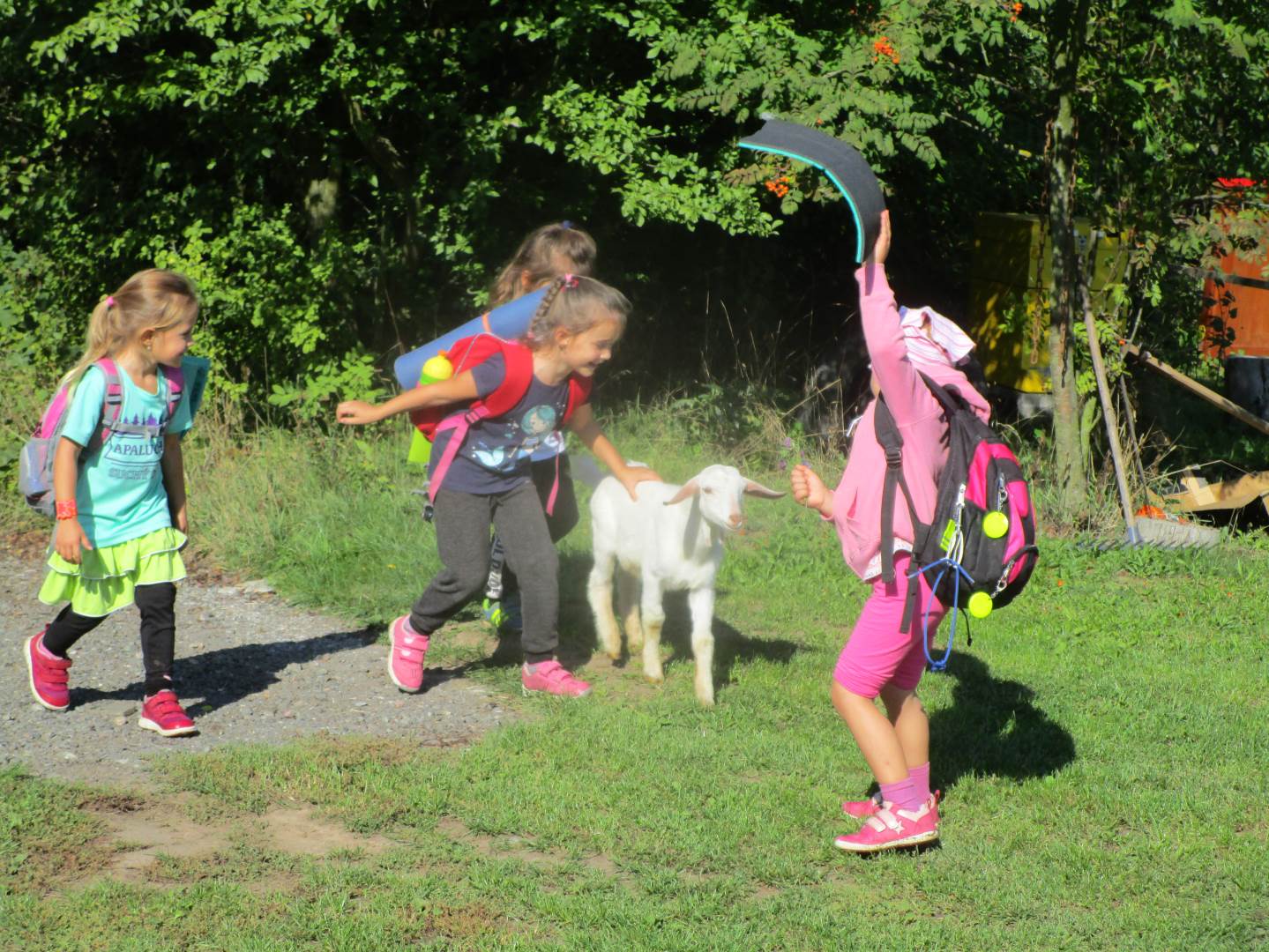 V pondělí se jdeme podívat, kde probíhaly sobotní cyklokrosové závody. Startujeme od kulturního domu a cesta nás vede kolem klád, různými lesními serpentinami až k ovečkám. Další dny si opakujeme písničky o jablíčku, počítáme je, porovnáváme velikost a barvu, zkoušíme je nosit na hlavě. Zjišťujeme, že jablíčka chutnají nejen nám, ale i zvířátkům a objevujeme, jak se z jablíček dělá mošt. Nakonec si jablíčka namalujem a vida, dá se s nimi i tisknout! Ve třídě rádi cvičíme, na elipse vytváříme pavučinu přátelství a své kamarády si namalujeme. Naučili jsme se hrát Zlatou bránu a skákat Panáka.