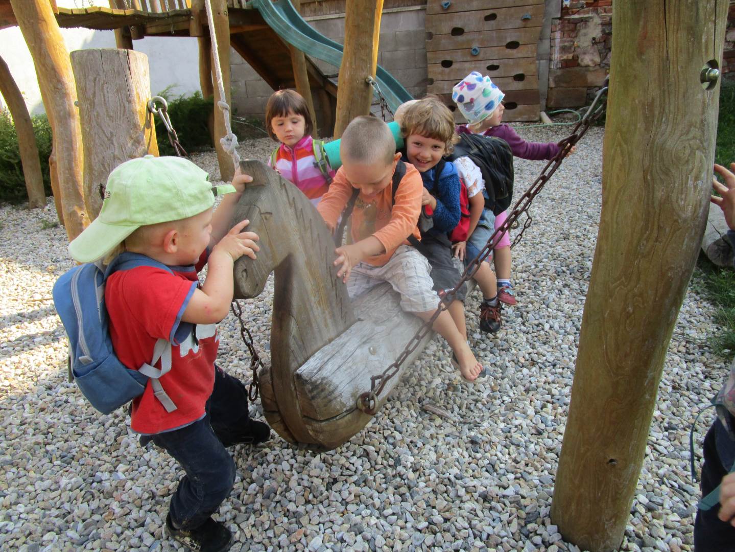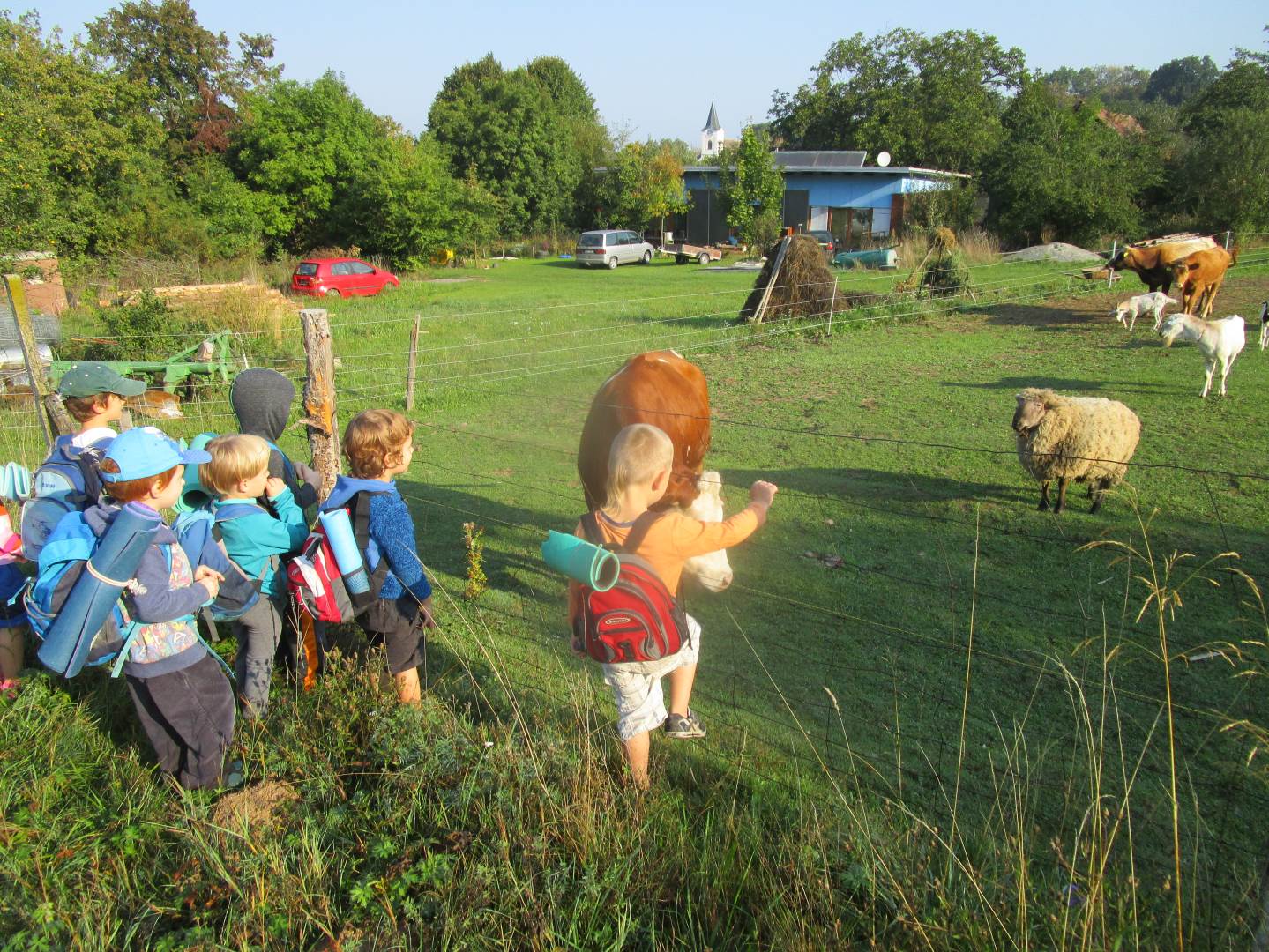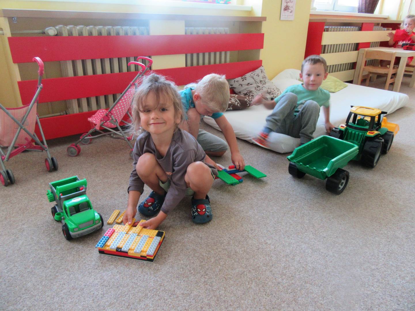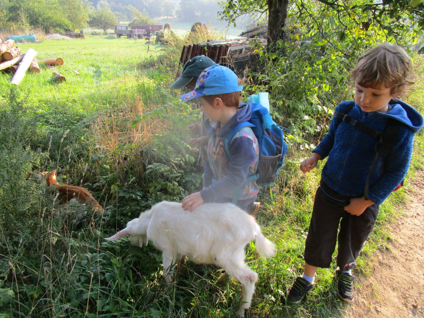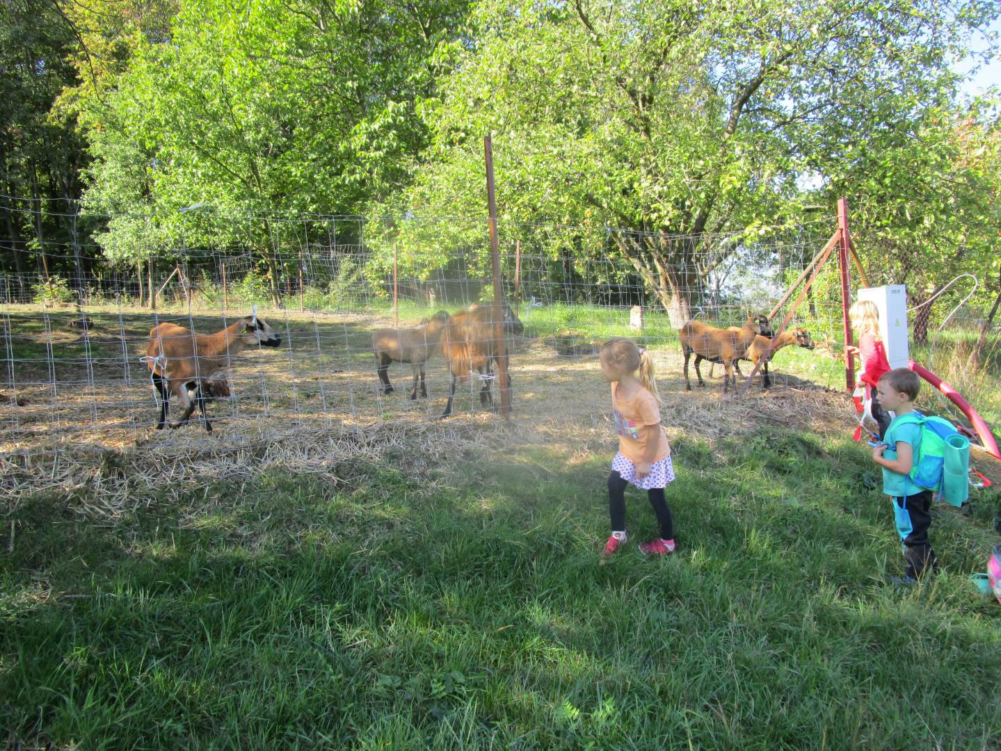 V pondělí se jdeme podívat, kde probíhaly sobotní cyklokrosové závody. Startujeme od kulturního domu a cesta nás vede kolem klád, různými lesními serpentinami až k ovečkám. Další dny si opakujeme písničky o jablíčku, počítáme je, porovnáváme velikost a barvu, zkoušíme je nosit na hlavě. Zjišťujeme, že jablíčka chutnají nejen nám, ale i zvířátkům a objevujeme, jak se z jablíček dělá mošt. Nakonec si jablíčka namalujem a vida, dá se s nimi i tisknout! Ve třídě rádi cvičíme, na elipse vytváříme pavučinu přátelství a své kamarády si namalujeme. Naučili jsme se hrát Zlatou bránu a skákat Panáka.