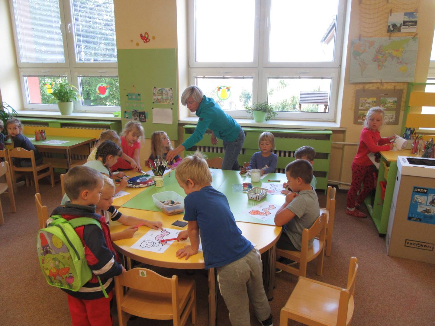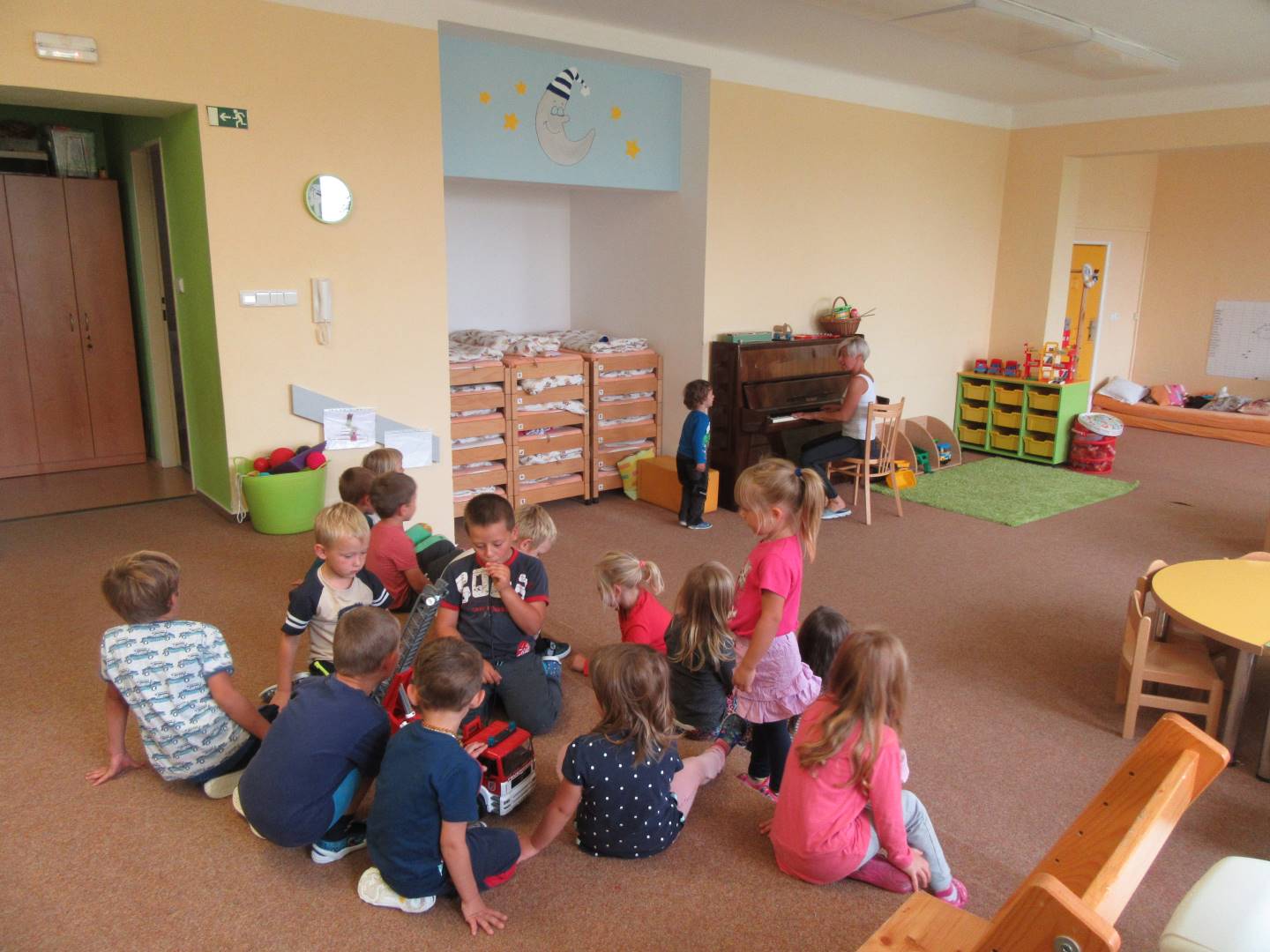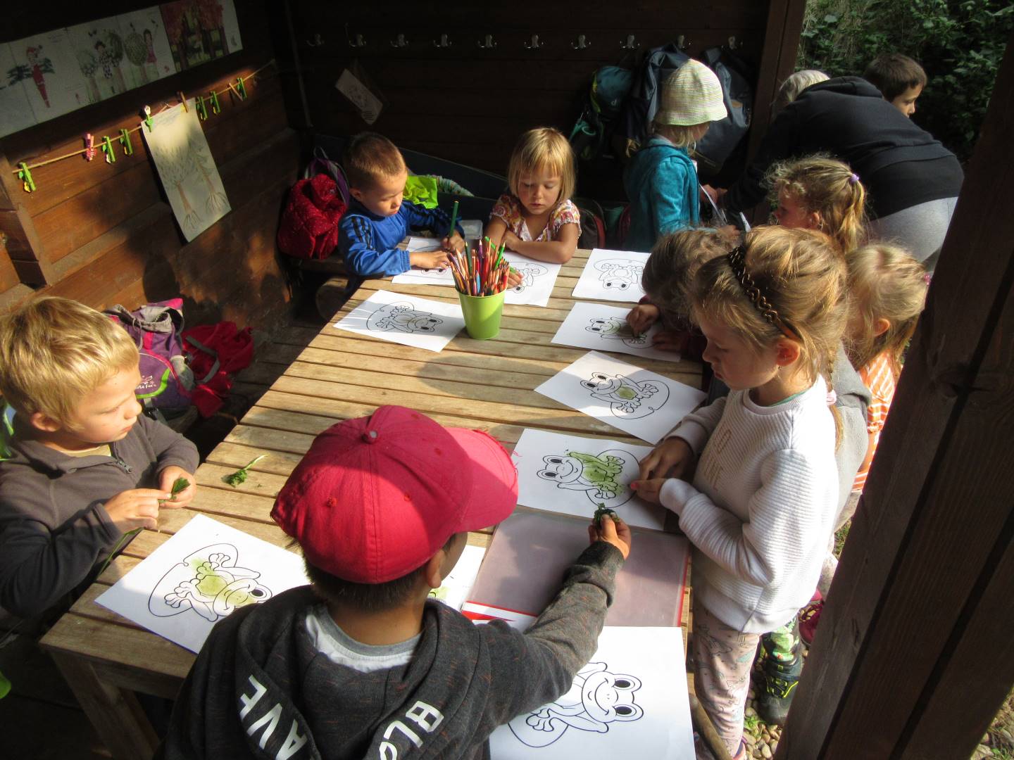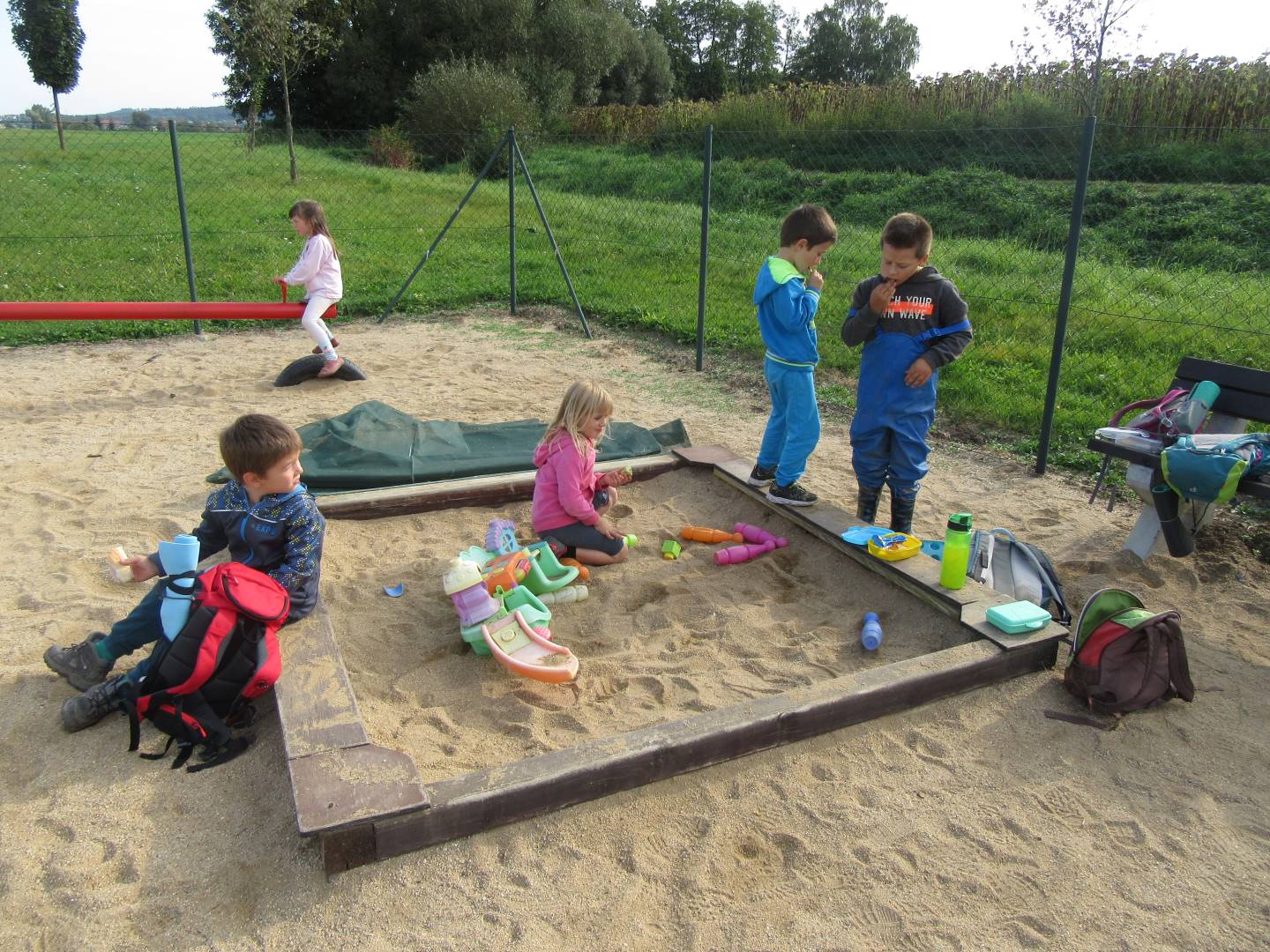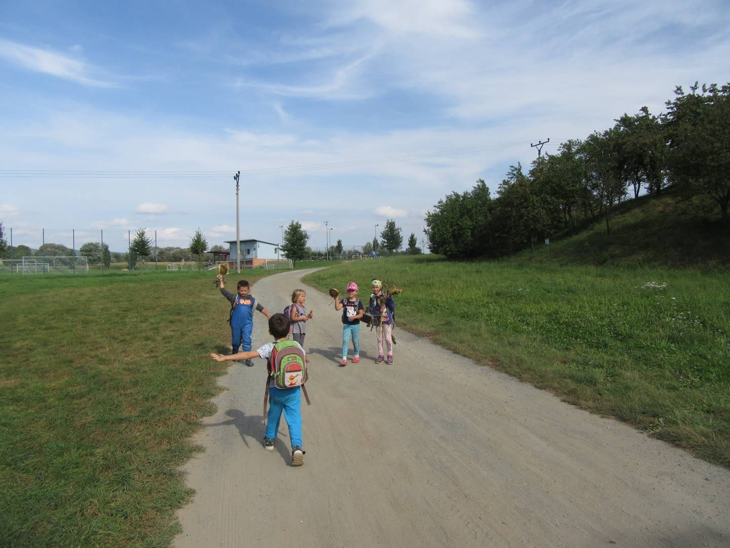 Zářím nás provedla "Žížala a její kamarádi". V dešti se nám několikrát podařilo pozorovat žížaly. Povídali jsme si o kompostu a velký obrázek kompostu si děti vytvoříly z papírových žížal a pířírodnin, které nám dala naše zahrada. Maringotku jsme vyzdobili žabičkami, které děti vybarvily trávou a listím. V půlce září jsme měli na zahradě canisterapii. Děti si vyzkoušely cvičení se psy, základní péči o srst a paní Adámková nám povídala o povolání veterináře. V pondělí 28.9. byl státní svátek a tak jsme si povídali o patronovi české země a děti vykreslily omalovánku sv. Václava. Na konci září se už ozval podzim a začaly radovánky v blátě, tvoření hrází a přehrad v lese, vaření v lesní blátivé kuchyni. Děti si oblíbily pohybové hry na kocoura a na myš a zvířecí přebíhanou. Několikrát týdně jsme zpívali za doprovodu klavíru. Kromě lidových písní jsme se naučili písničku "Srovnat hračky" a "Proč kopřiva pálí". Předškoláci dostali nové pracovní seštity, které začali vypracovávat.