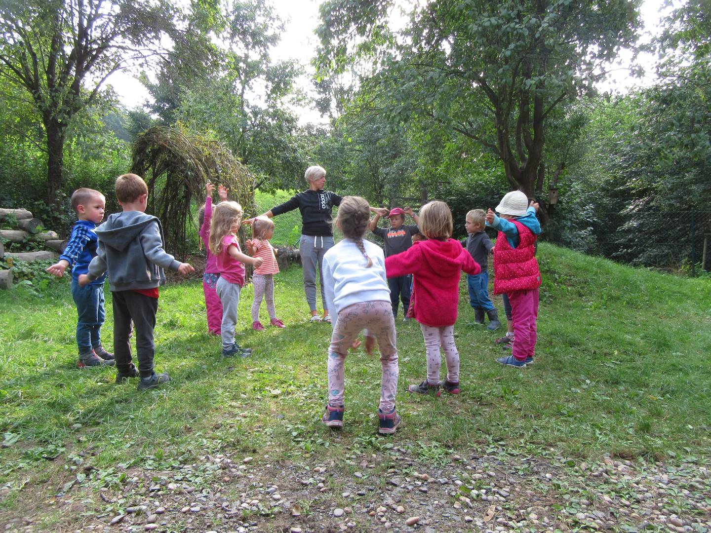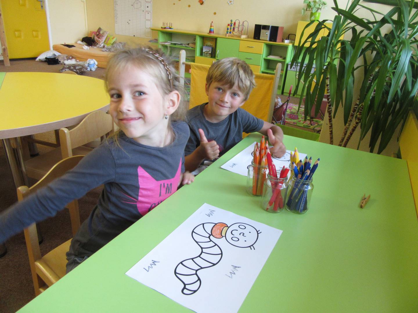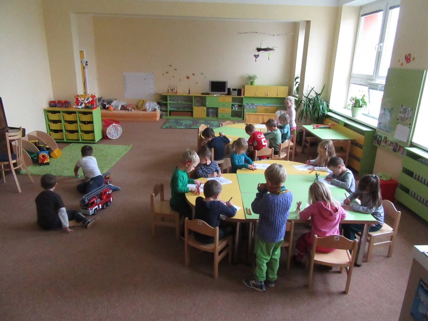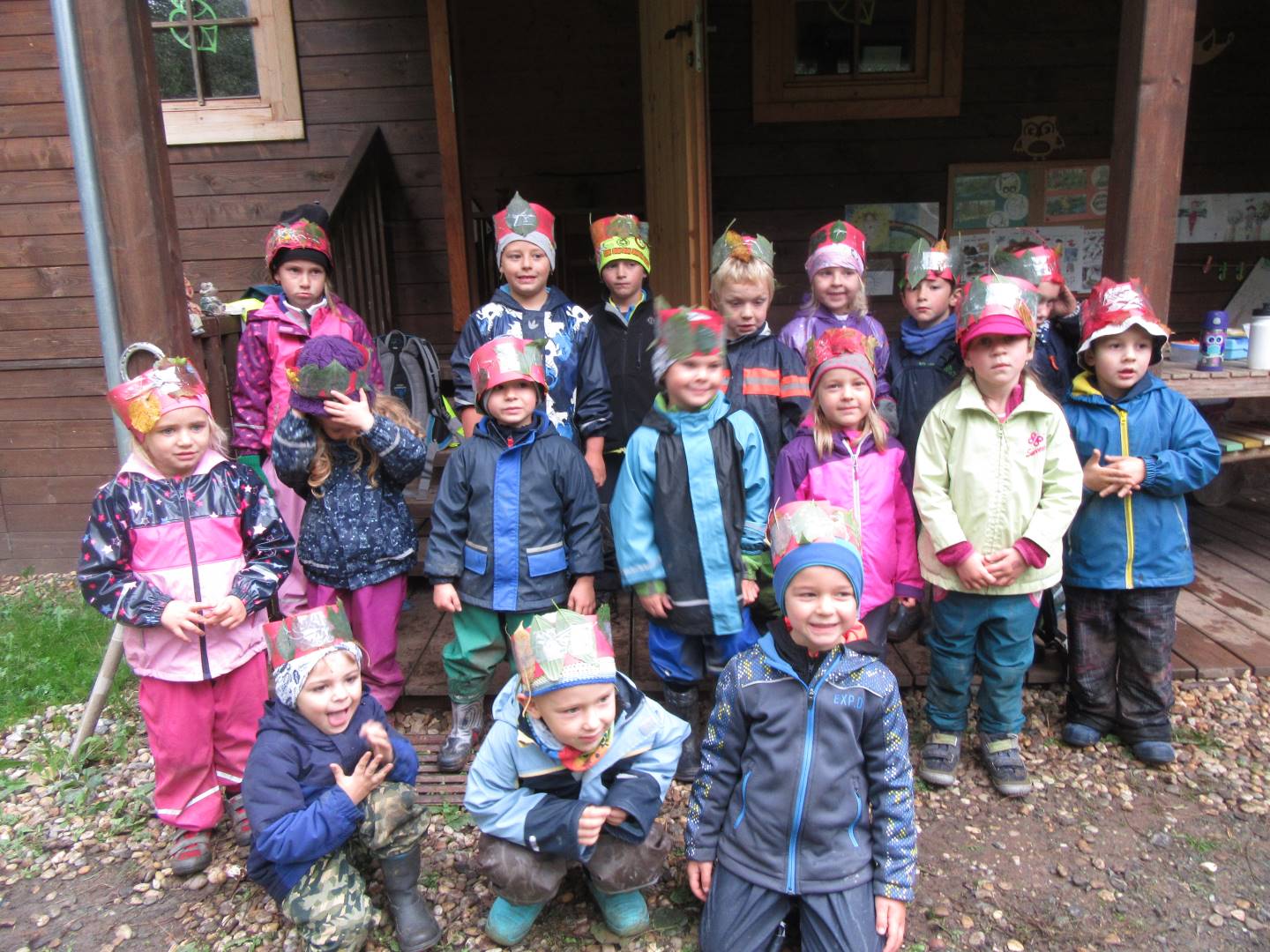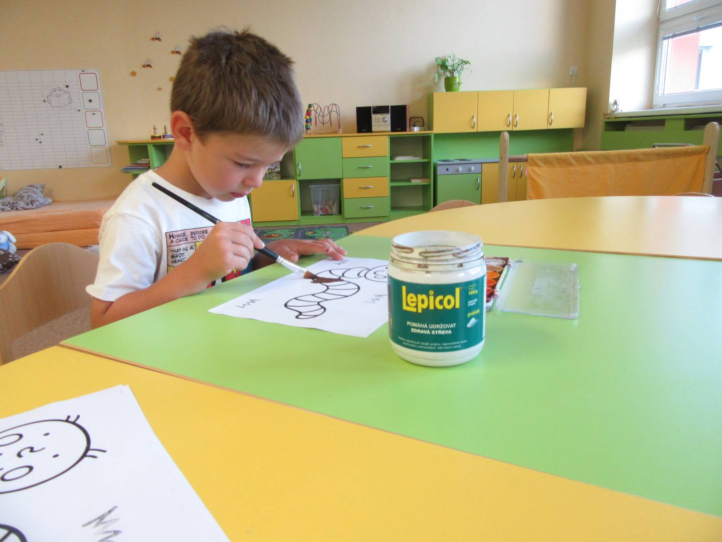 Zářím nás provedla "Žížala a její kamarádi". V dešti se nám několikrát podařilo pozorovat žížaly. Povídali jsme si o kompostu a velký obrázek kompostu si děti vytvoříly z papírových žížal a pířírodnin, které nám dala naše zahrada. Maringotku jsme vyzdobili žabičkami, které děti vybarvily trávou a listím. V půlce září jsme měli na zahradě canisterapii. Děti si vyzkoušely cvičení se psy, základní péči o srst a paní Adámková nám povídala o povolání veterináře. V pondělí 28.9. byl státní svátek a tak jsme si povídali o patronovi české země a děti vykreslily omalovánku sv. Václava. Na konci září se už ozval podzim a začaly radovánky v blátě, tvoření hrází a přehrad v lese, vaření v lesní blátivé kuchyni. Děti si oblíbily pohybové hry na kocoura a na myš a zvířecí přebíhanou. Několikrát týdně jsme zpívali za doprovodu klavíru. Kromě lidových písní jsme se naučili písničku "Srovnat hračky" a "Proč kopřiva pálí". Předškoláci dostali nové pracovní seštity, které začali vypracovávat.
