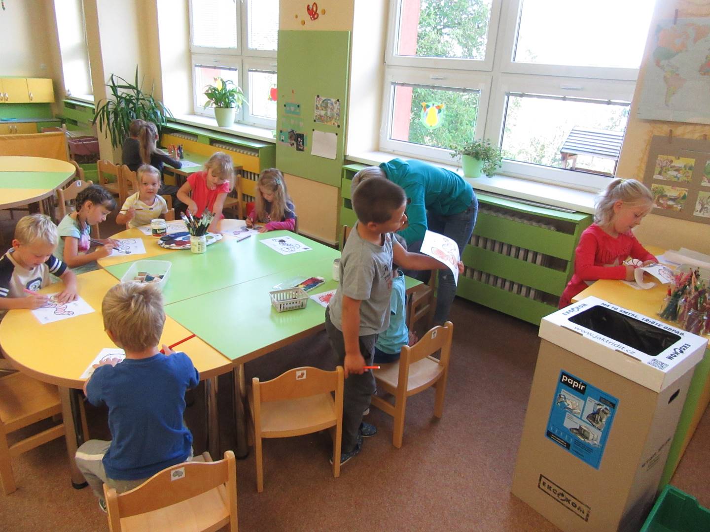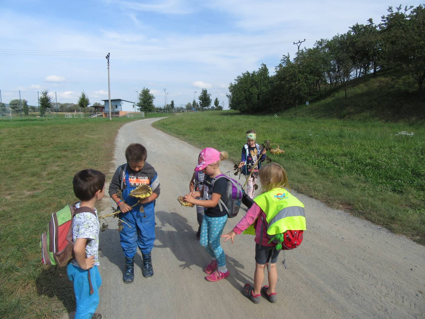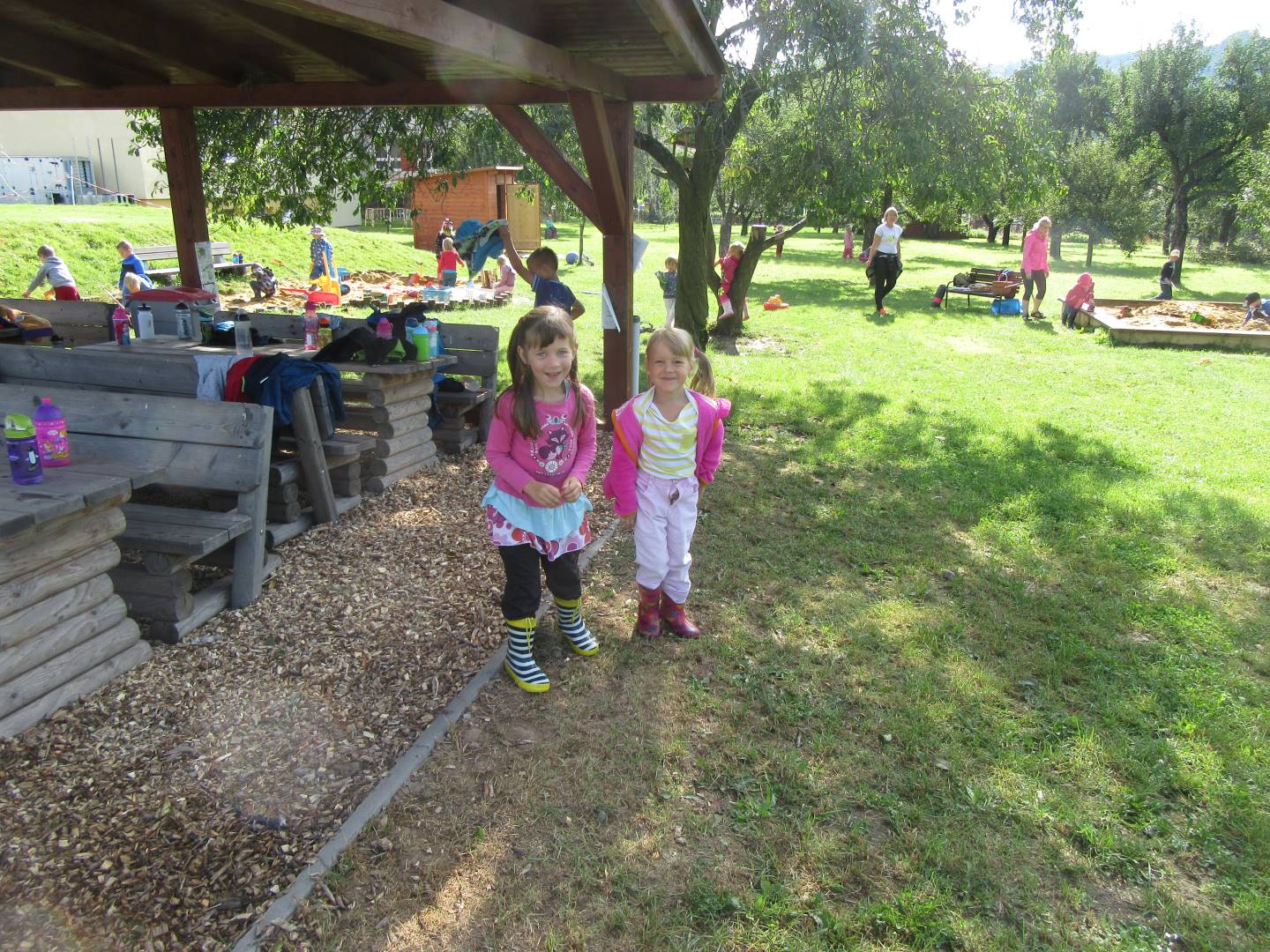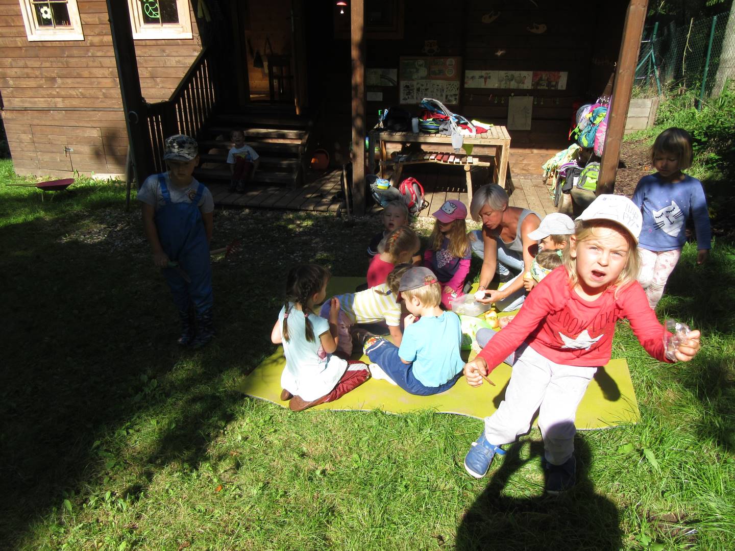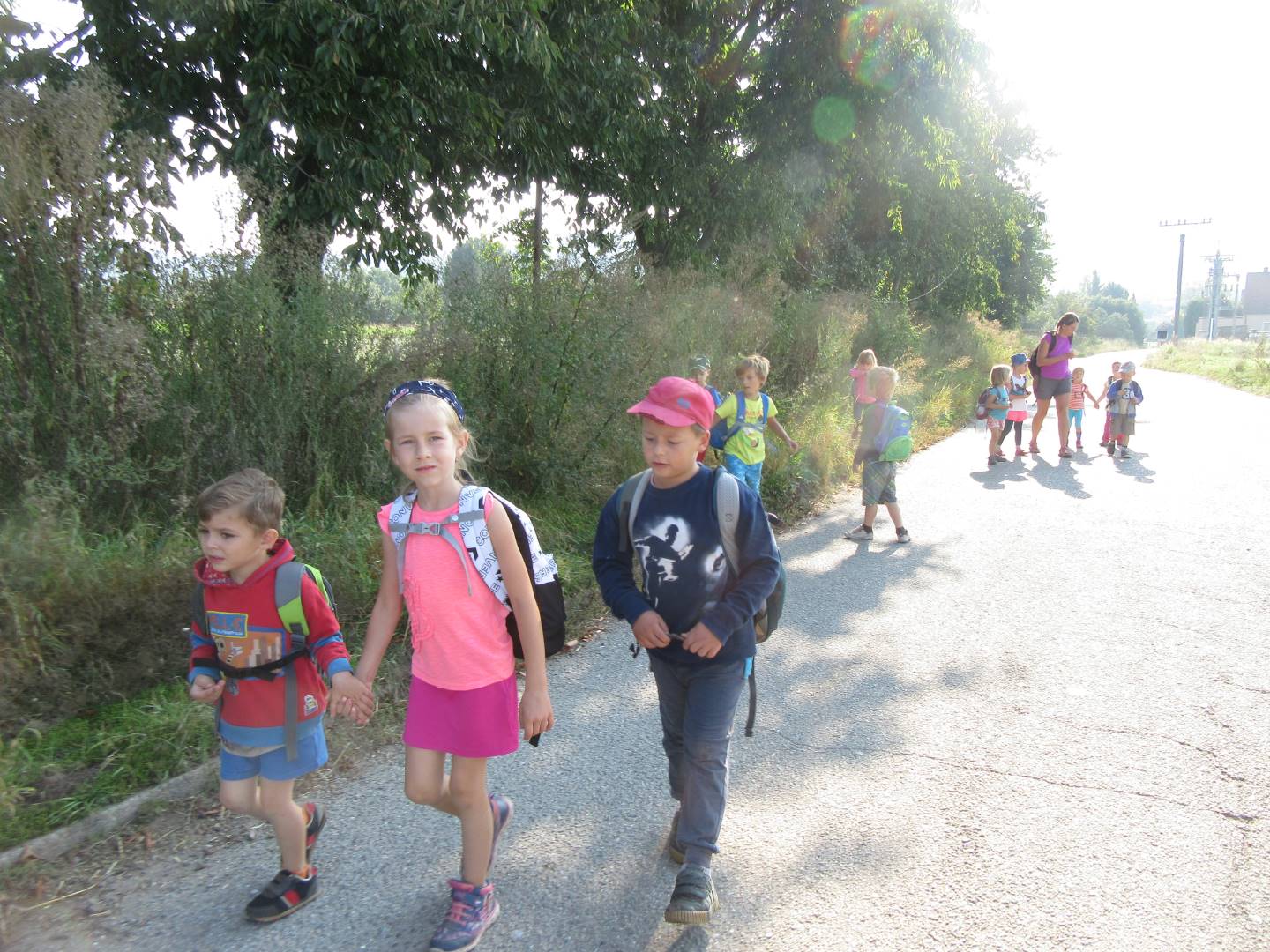 Zářím nás provedla "Žížala a její kamarádi". V dešti se nám několikrát podařilo pozorovat žížaly. Povídali jsme si o kompostu a velký obrázek kompostu si děti vytvoříly z papírových žížal a pířírodnin, které nám dala naše zahrada. Maringotku jsme vyzdobili žabičkami, které děti vybarvily trávou a listím. V půlce září jsme měli na zahradě canisterapii. Děti si vyzkoušely cvičení se psy, základní péči o srst a paní Adámková nám povídala o povolání veterináře. V pondělí 28.9. byl státní svátek a tak jsme si povídali o patronovi české země a děti vykreslily omalovánku sv. Václava. Na konci září se už ozval podzim a začaly radovánky v blátě, tvoření hrází a přehrad v lese, vaření v lesní blátivé kuchyni. Děti si oblíbily pohybové hry na kocoura a na myš a zvířecí přebíhanou. Několikrát týdně jsme zpívali za doprovodu klavíru. Kromě lidových písní jsme se naučili písničku "Srovnat hračky" a "Proč kopřiva pálí". Předškoláci dostali nové pracovní seštity, které začali vypracovávat.