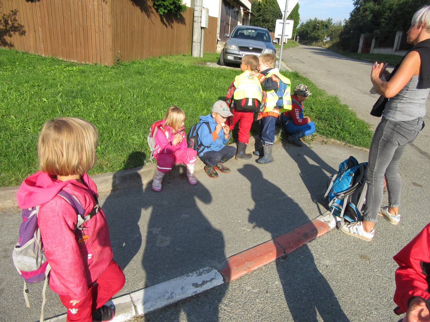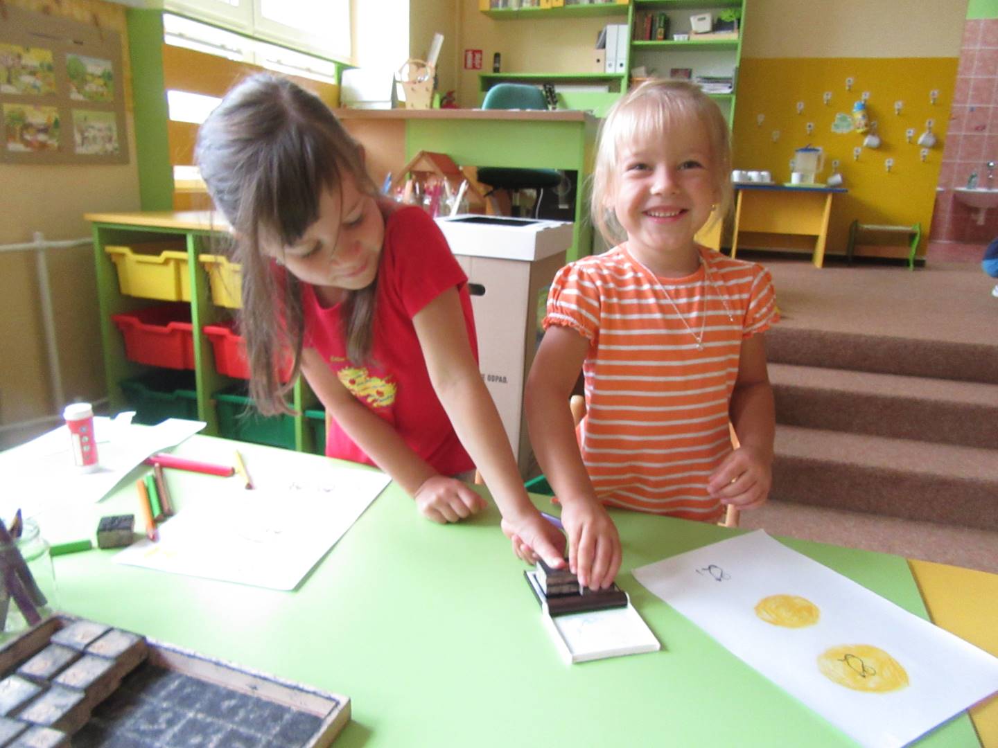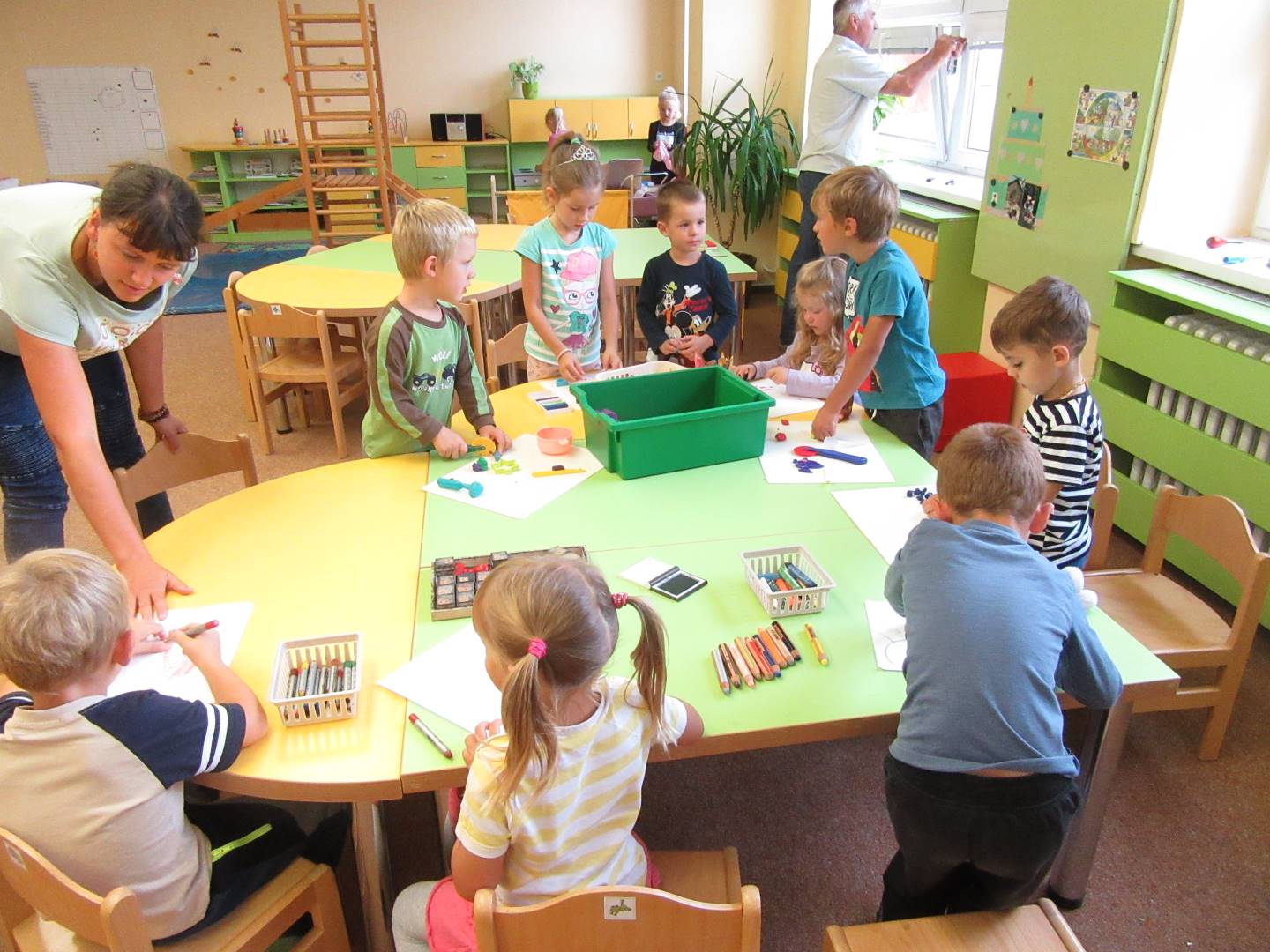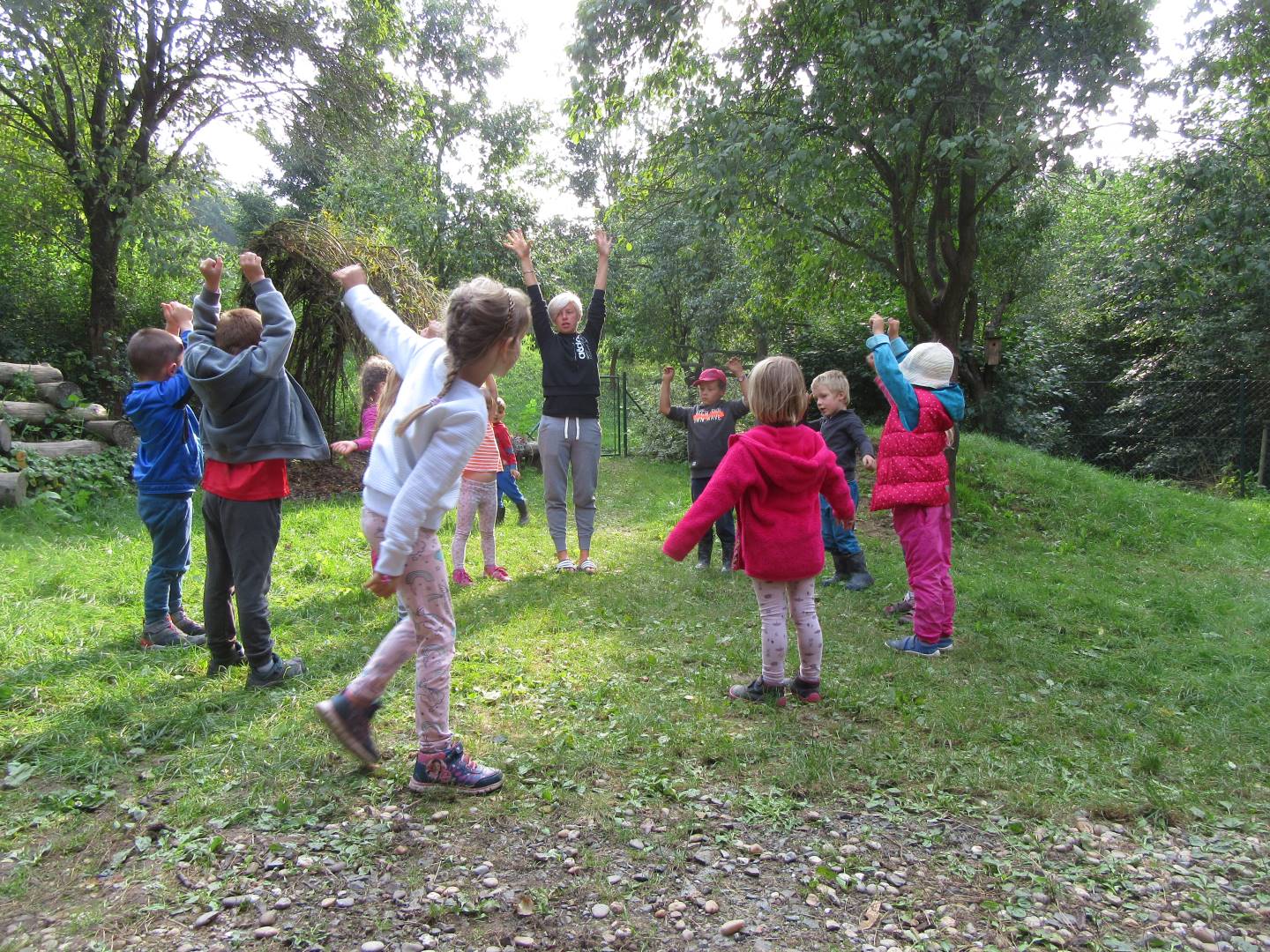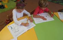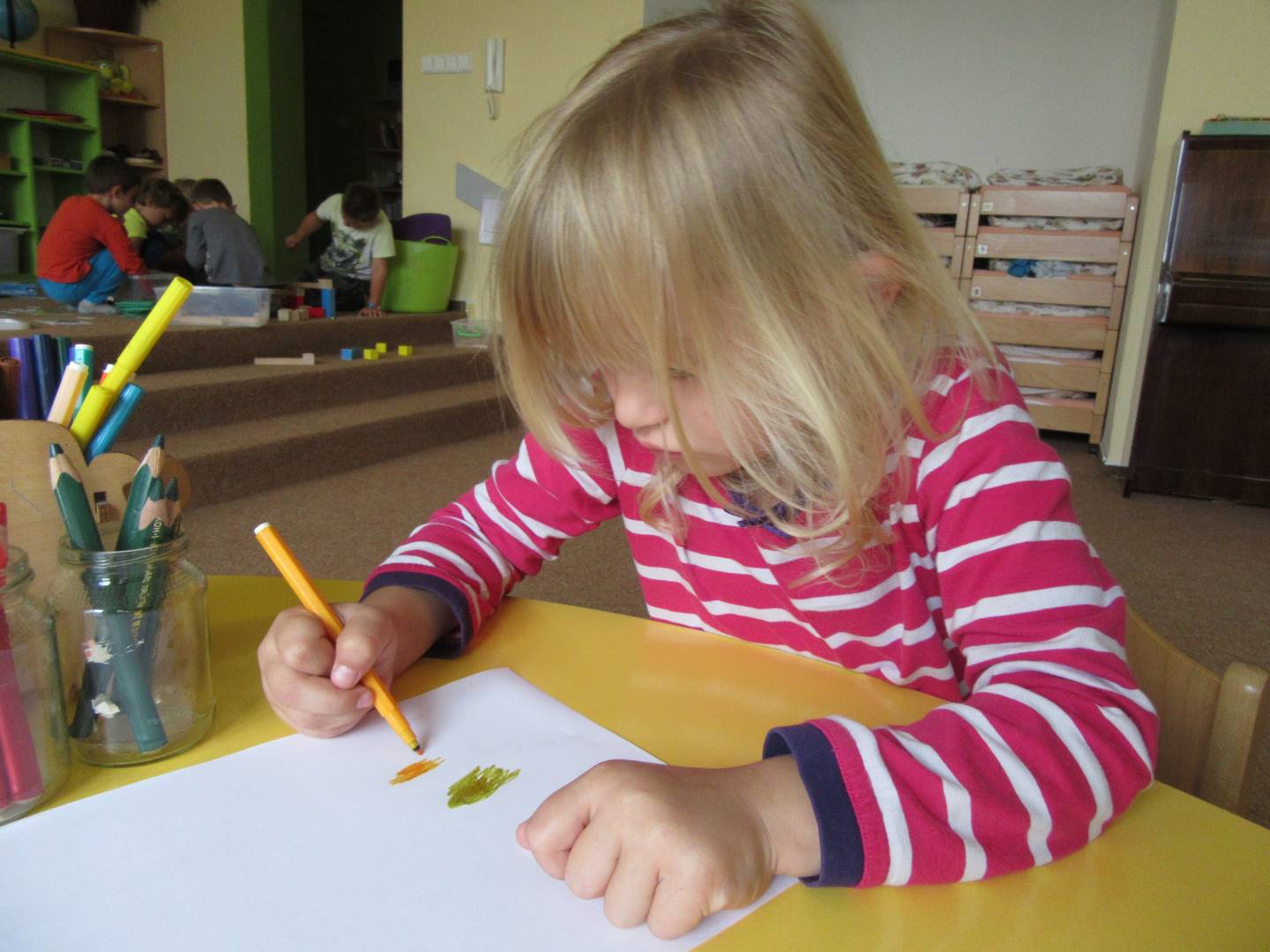 Zářím nás provedla "Žížala a její kamarádi". V dešti se nám několikrát podařilo pozorovat žížaly. Povídali jsme si o kompostu a velký obrázek kompostu si děti vytvoříly z papírových žížal a pířírodnin, které nám dala naše zahrada. Maringotku jsme vyzdobili žabičkami, které děti vybarvily trávou a listím. V půlce září jsme měli na zahradě canisterapii. Děti si vyzkoušely cvičení se psy, základní péči o srst a paní Adámková nám povídala o povolání veterináře. V pondělí 28.9. byl státní svátek a tak jsme si povídali o patronovi české země a děti vykreslily omalovánku sv. Václava. Na konci září se už ozval podzim a začaly radovánky v blátě, tvoření hrází a přehrad v lese, vaření v lesní blátivé kuchyni. Děti si oblíbily pohybové hry na kocoura a na myš a zvířecí přebíhanou. Několikrát týdně jsme zpívali za doprovodu klavíru. Kromě lidových písní jsme se naučili písničku "Srovnat hračky" a "Proč kopřiva pálí". Předškoláci dostali nové pracovní seštity, které začali vypracovávat.