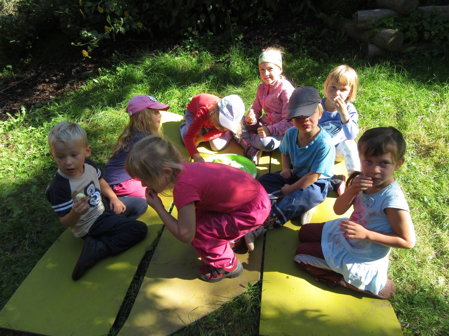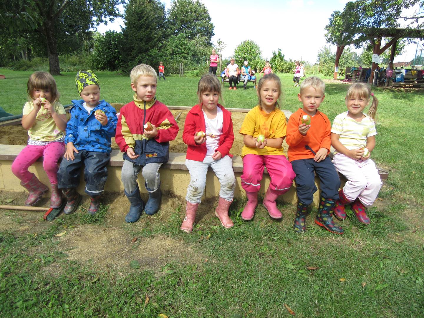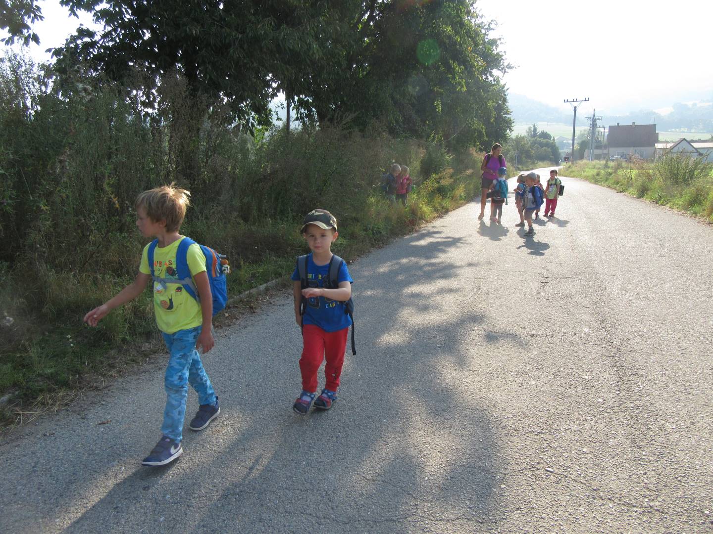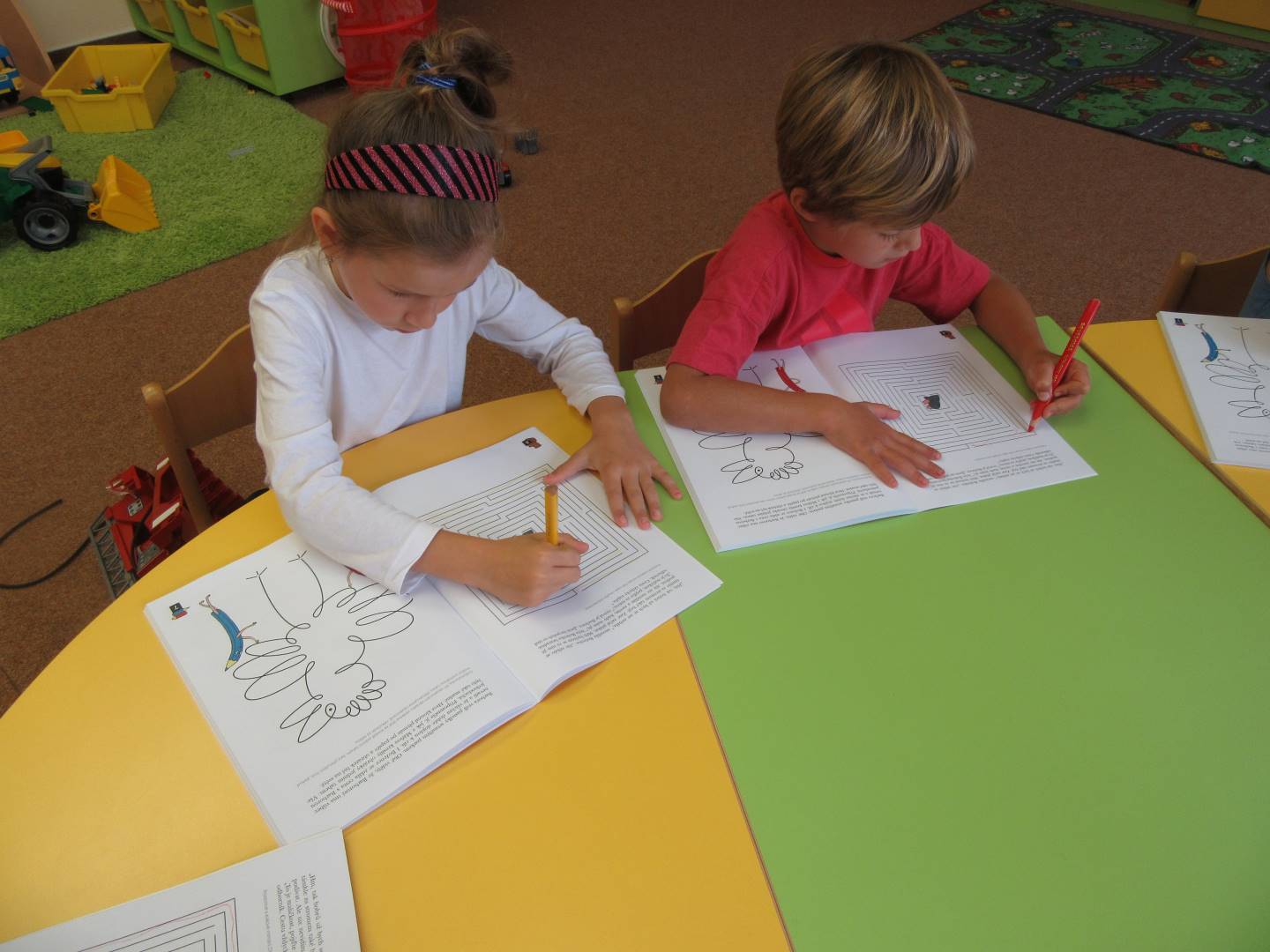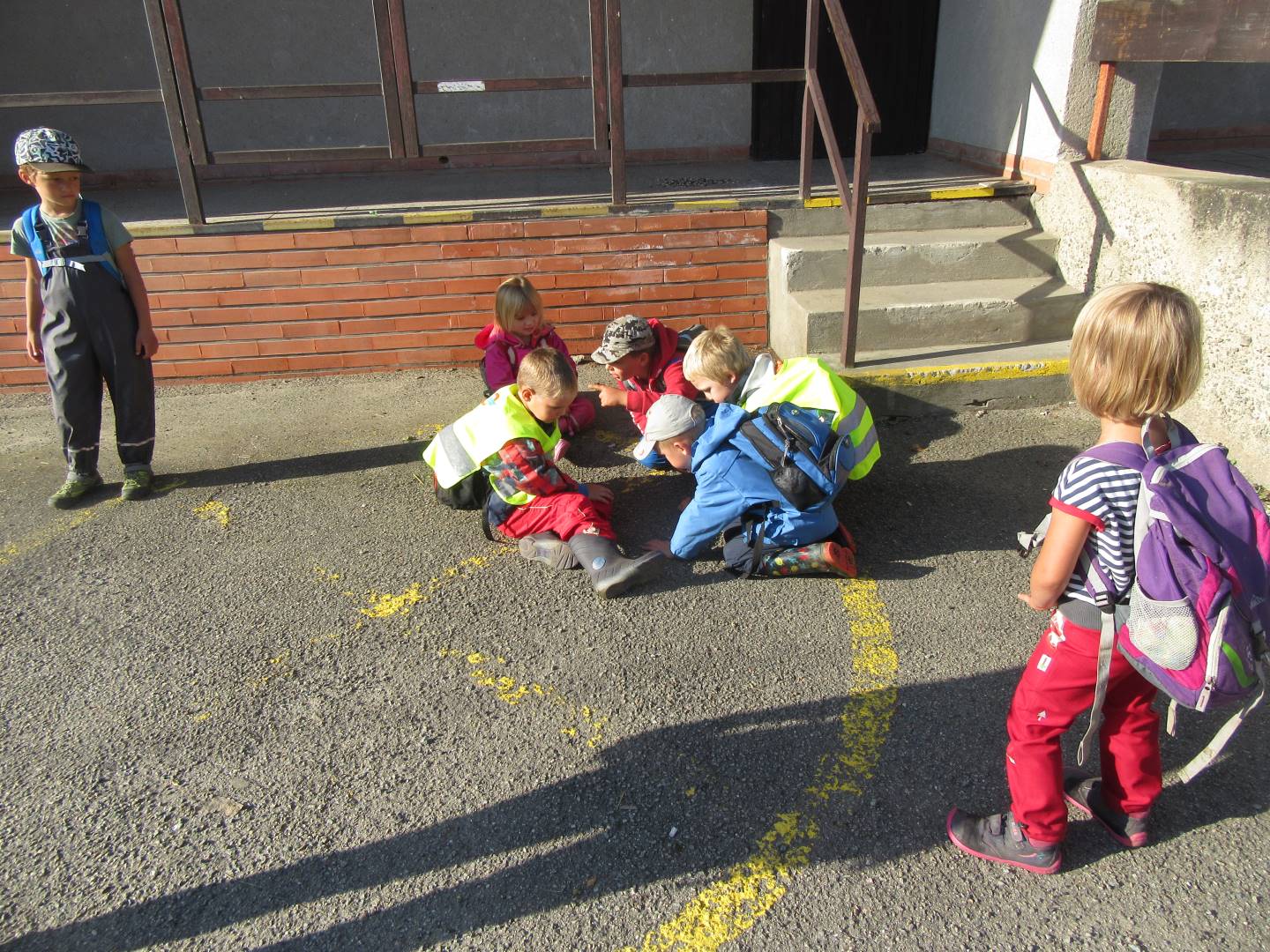 Zářím nás provedla "Žížala a její kamarádi". V dešti se nám několikrát podařilo pozorovat žížaly. Povídali jsme si o kompostu a velký obrázek kompostu si děti vytvoříly z papírových žížal a pířírodnin, které nám dala naše zahrada. Maringotku jsme vyzdobili žabičkami, které děti vybarvily trávou a listím. V půlce září jsme měli na zahradě canisterapii. Děti si vyzkoušely cvičení se psy, základní péči o srst a paní Adámková nám povídala o povolání veterináře. V pondělí 28.9. byl státní svátek a tak jsme si povídali o patronovi české země a děti vykreslily omalovánku sv. Václava. Na konci září se už ozval podzim a začaly radovánky v blátě, tvoření hrází a přehrad v lese, vaření v lesní blátivé kuchyni. Děti si oblíbily pohybové hry na kocoura a na myš a zvířecí přebíhanou. Několikrát týdně jsme zpívali za doprovodu klavíru. Kromě lidových písní jsme se naučili písničku "Srovnat hračky" a "Proč kopřiva pálí". Předškoláci dostali nové pracovní seštity, které začali vypracovávat.