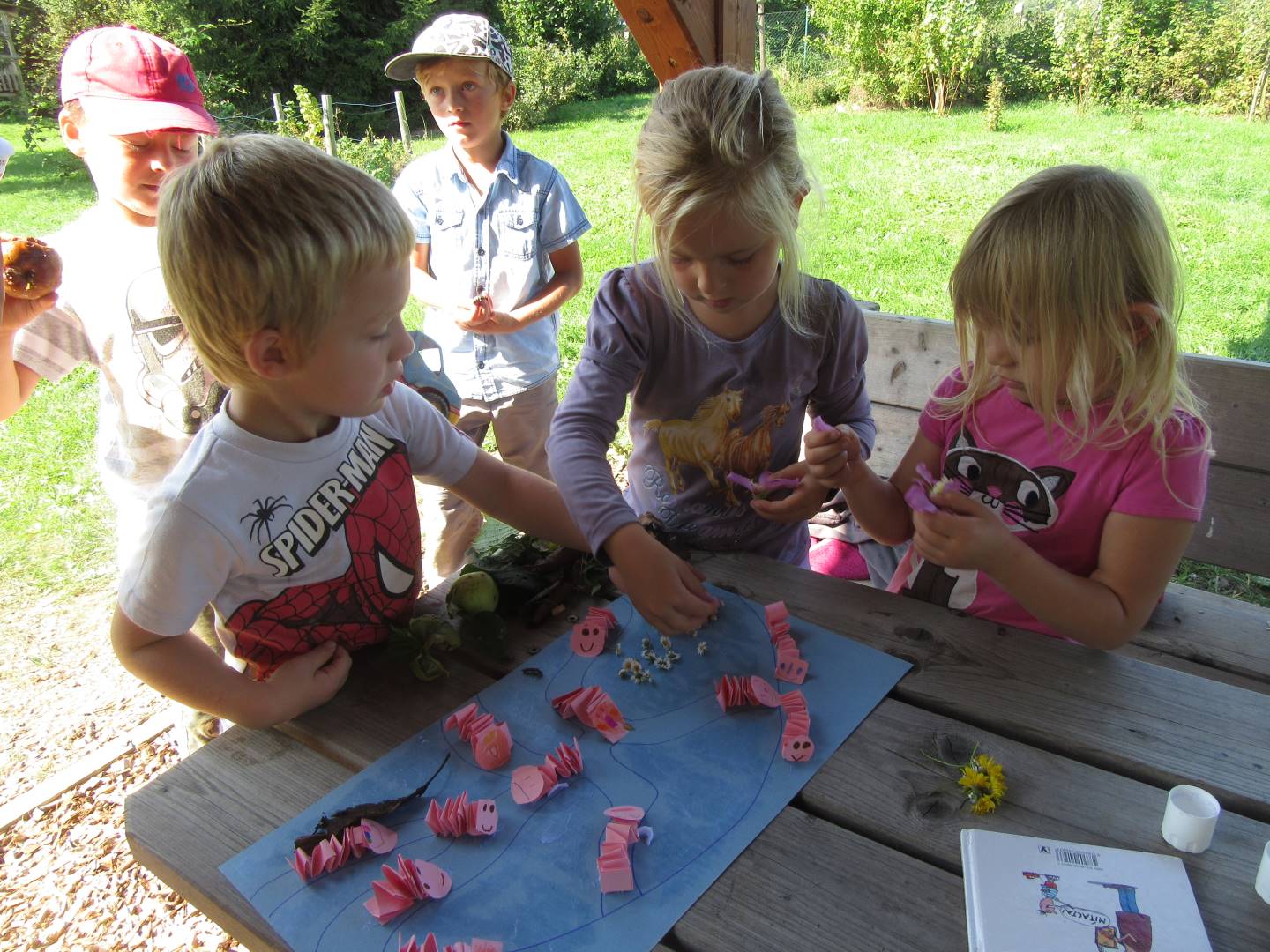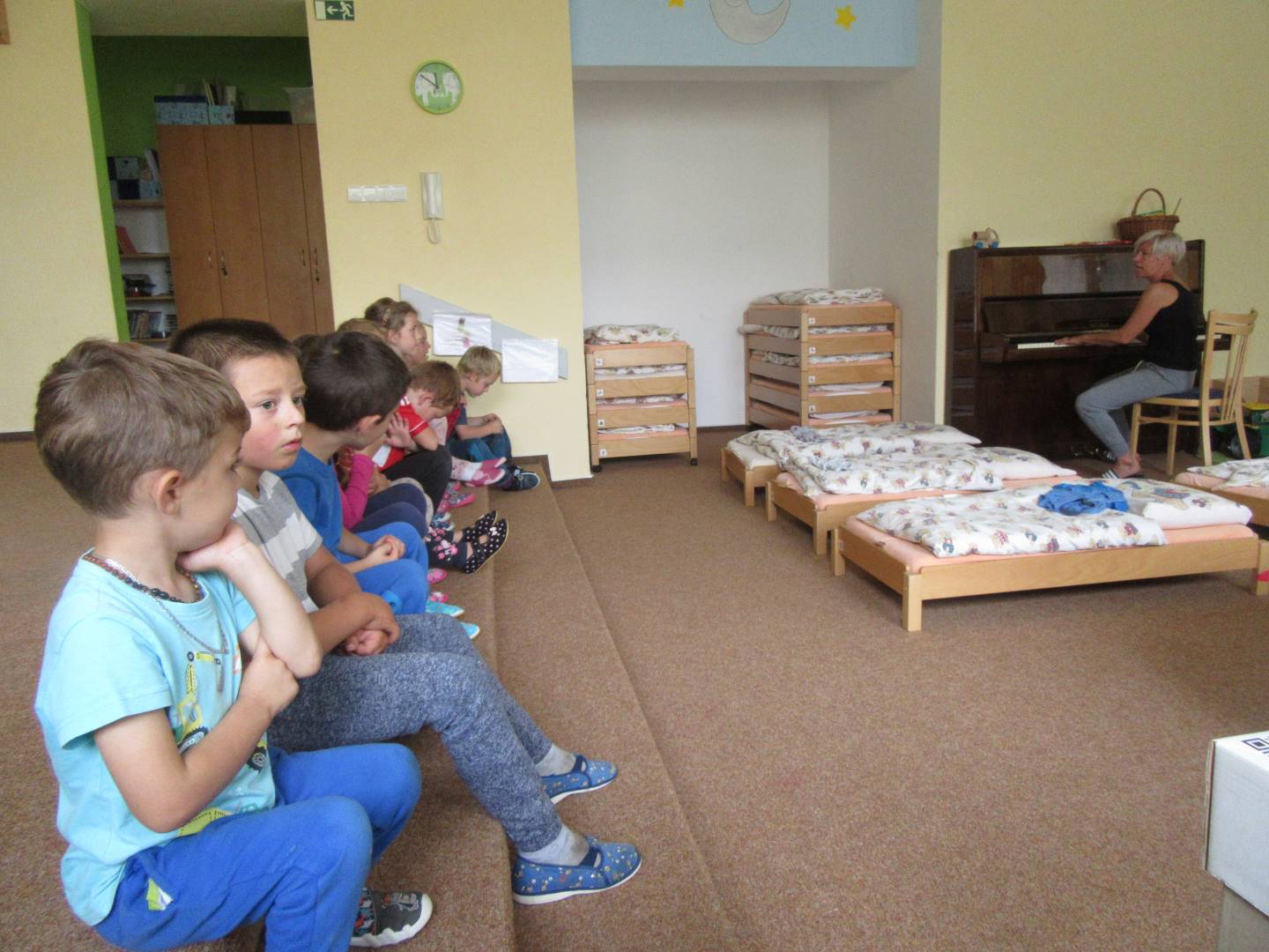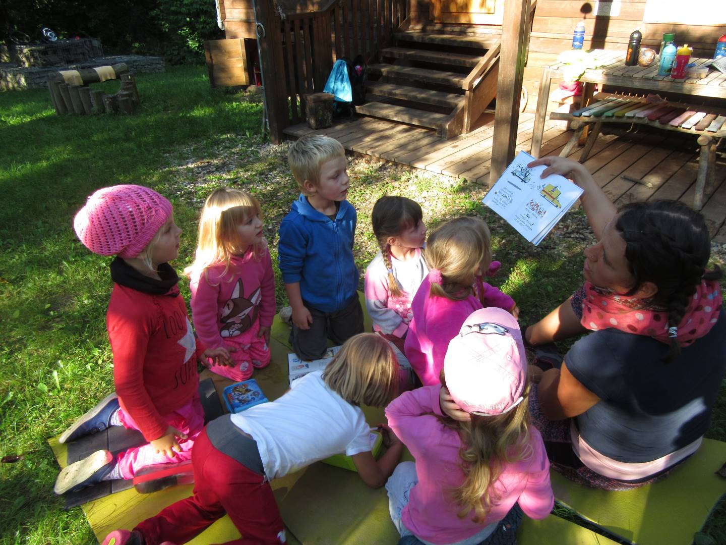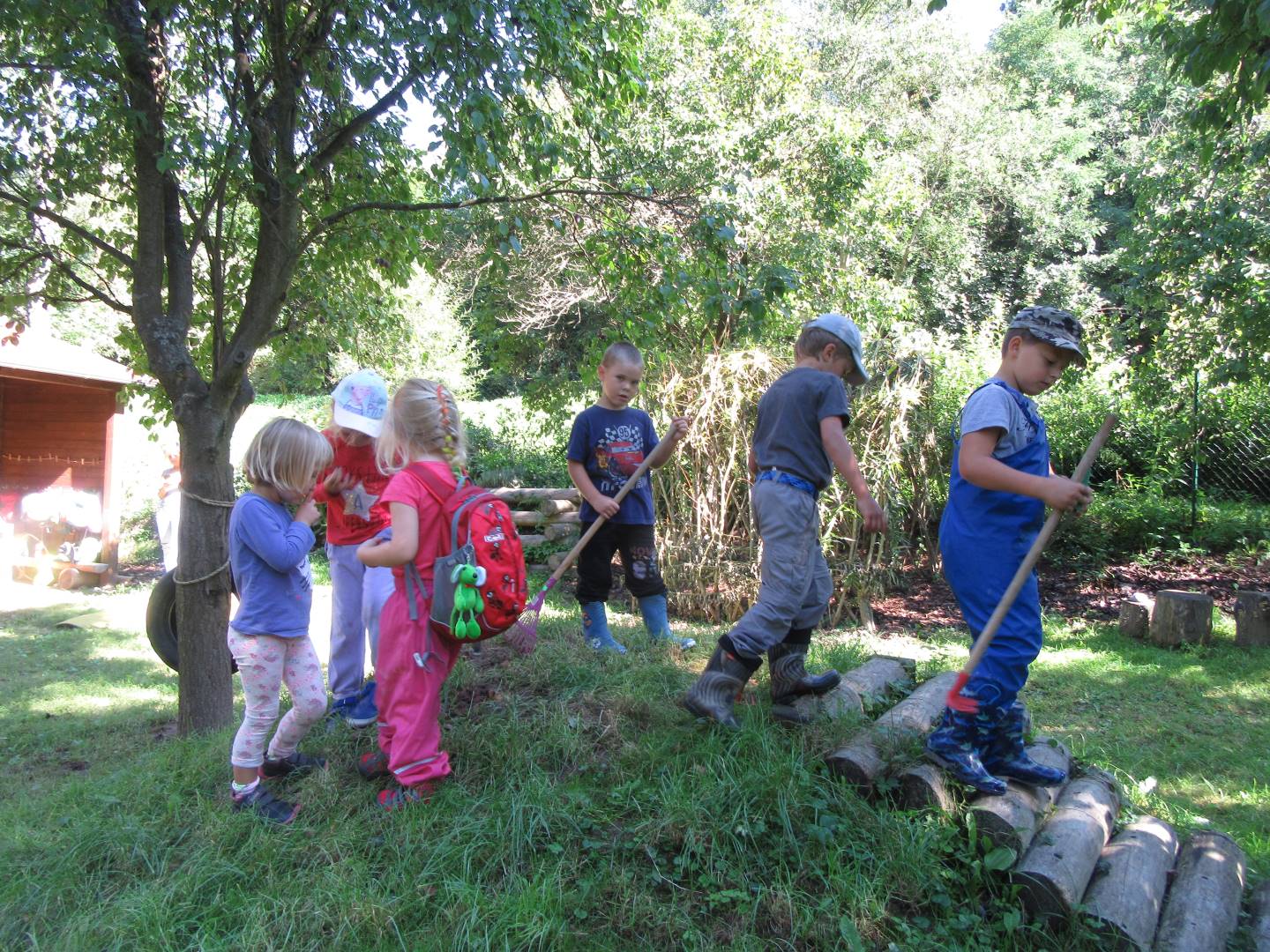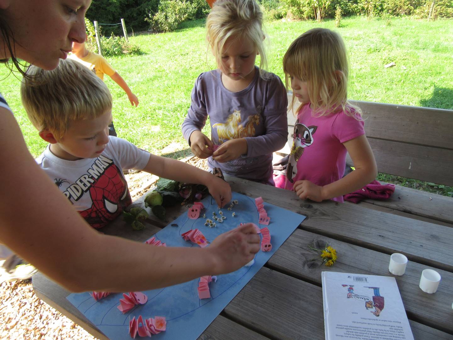 Zářím nás provedla "Žížala a její kamarádi". V dešti se nám několikrát podařilo pozorovat žížaly. Povídali jsme si o kompostu a velký obrázek kompostu si děti vytvoříly z papírových žížal a pířírodnin, které nám dala naše zahrada. Maringotku jsme vyzdobili žabičkami, které děti vybarvily trávou a listím. V půlce září jsme měli na zahradě canisterapii. Děti si vyzkoušely cvičení se psy, základní péči o srst a paní Adámková nám povídala o povolání veterináře. V pondělí 28.9. byl státní svátek a tak jsme si povídali o patronovi české země a děti vykreslily omalovánku sv. Václava. Na konci září se už ozval podzim a začaly radovánky v blátě, tvoření hrází a přehrad v lese, vaření v lesní blátivé kuchyni. Děti si oblíbily pohybové hry na kocoura a na myš a zvířecí přebíhanou. Několikrát týdně jsme zpívali za doprovodu klavíru. Kromě lidových písní jsme se naučili písničku "Srovnat hračky" a "Proč kopřiva pálí". Předškoláci dostali nové pracovní seštity, které začali vypracovávat.