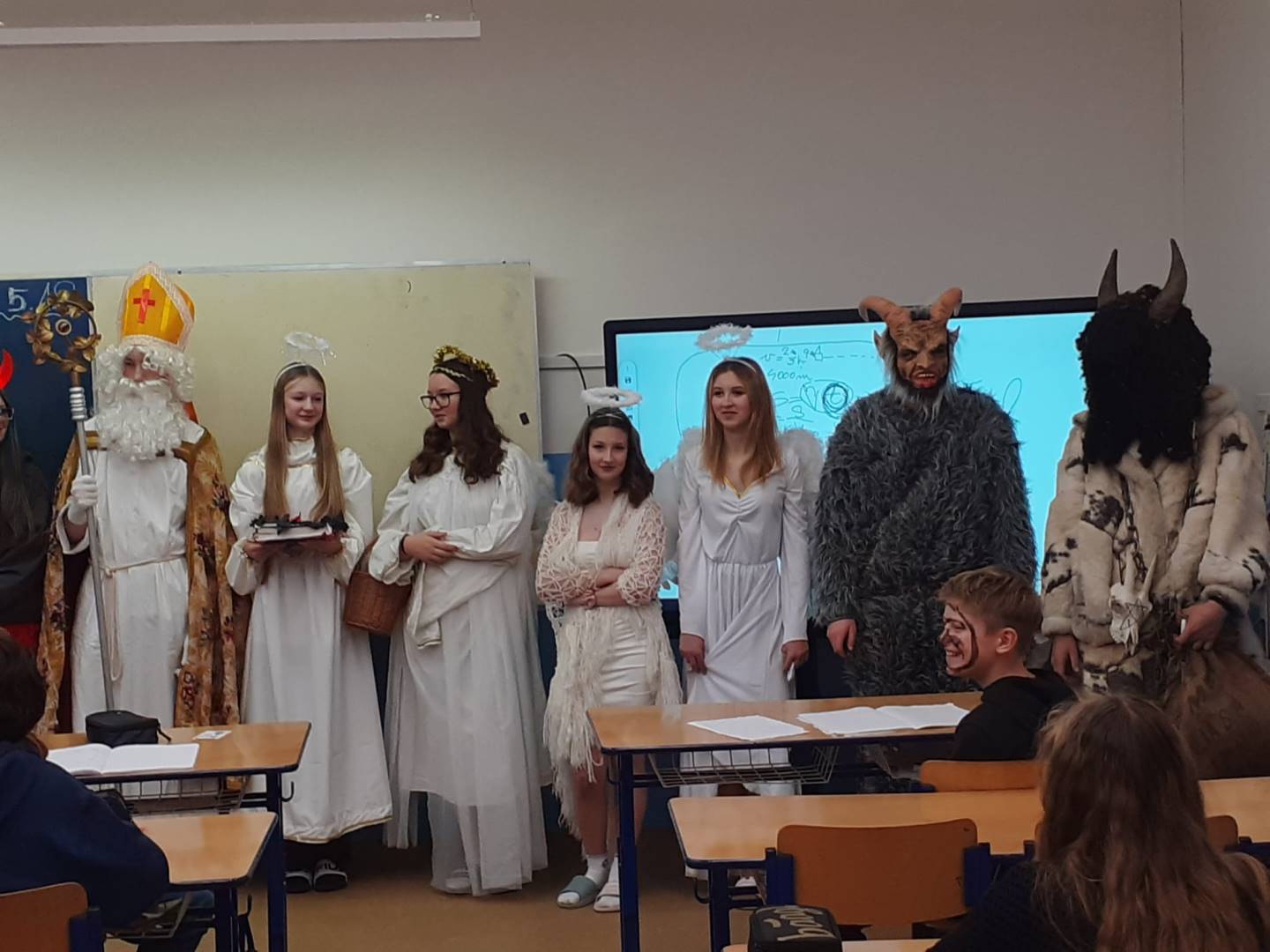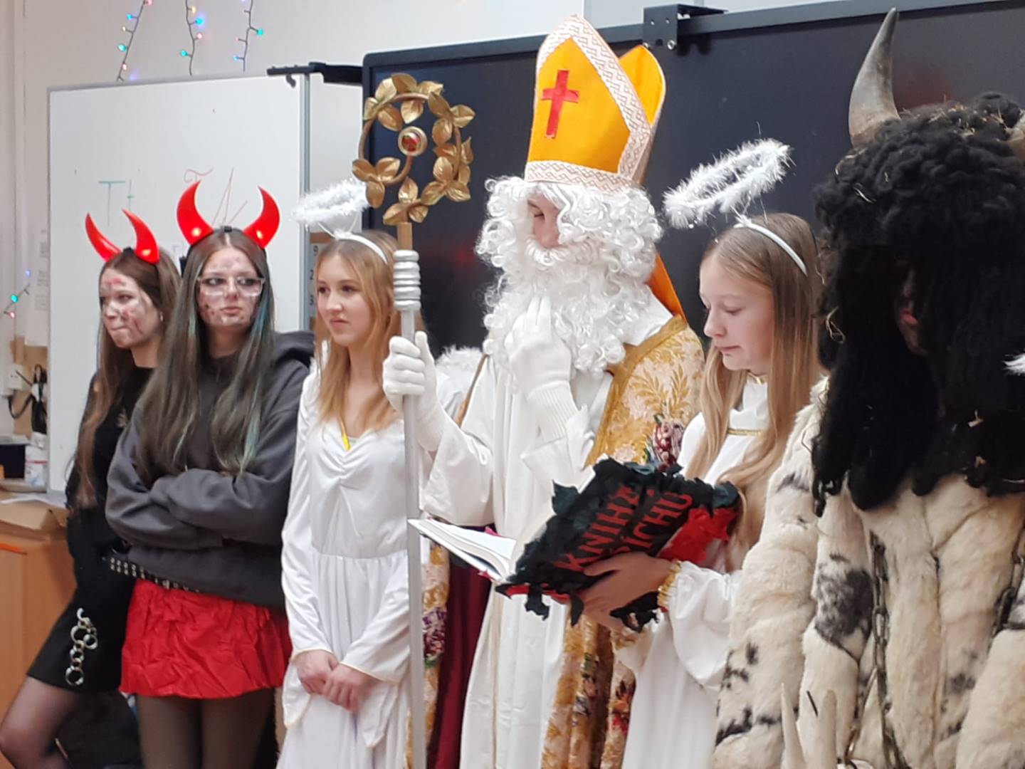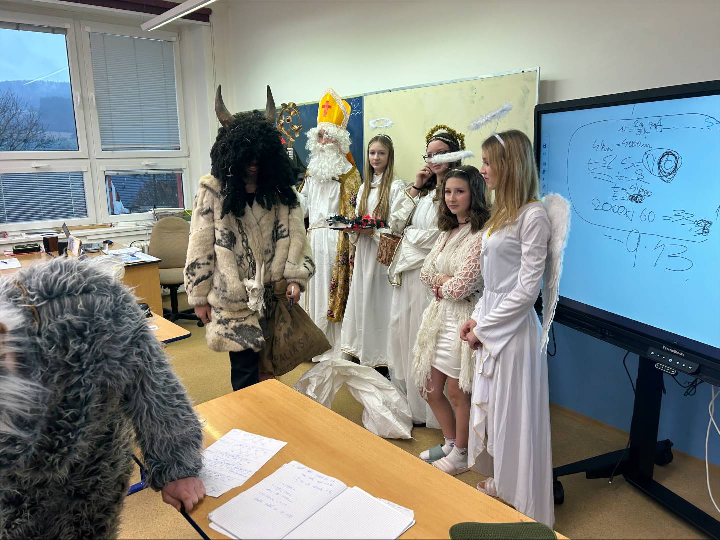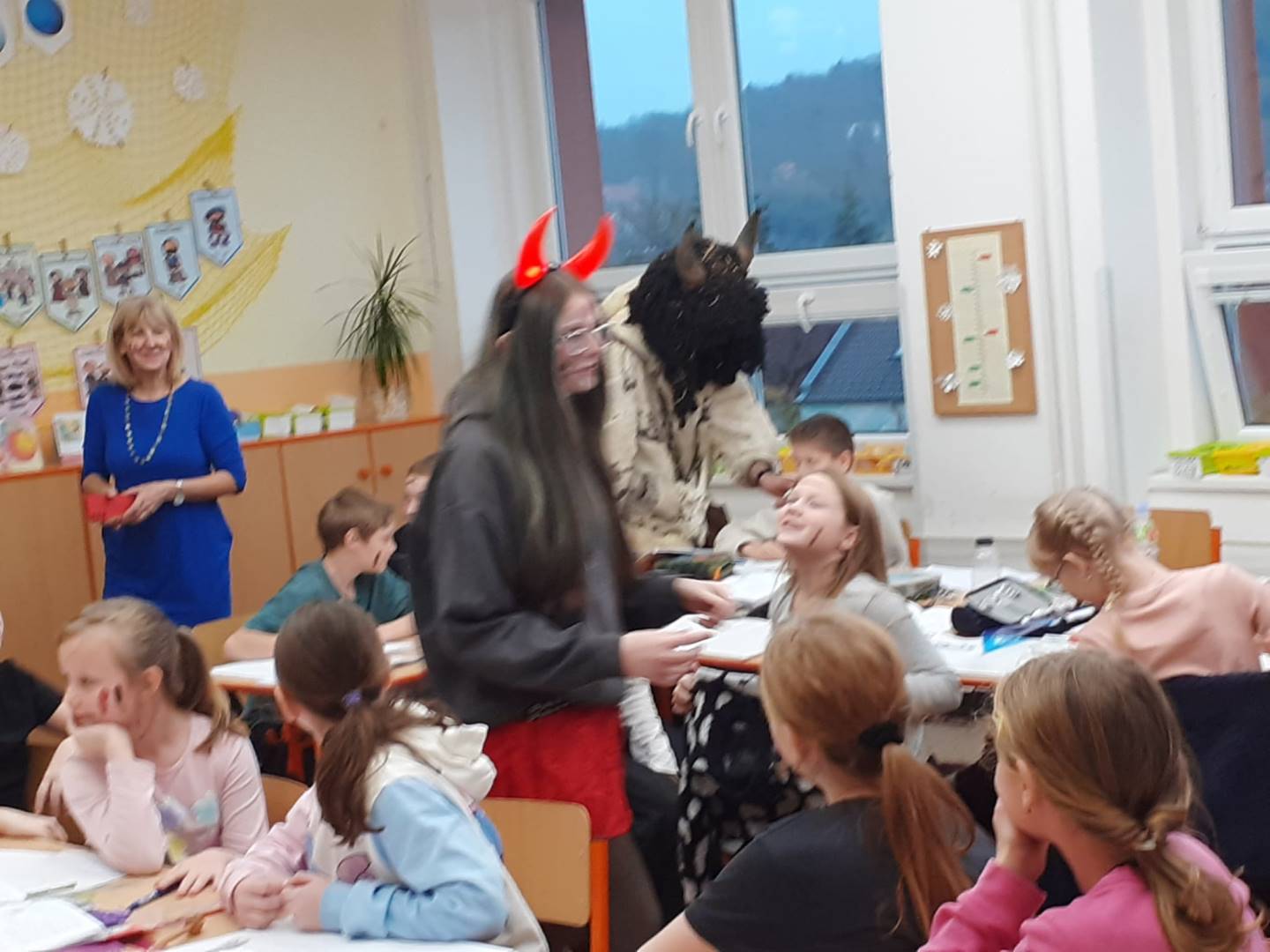 Jako každý rok, tak i letos naši školu navštívil Mikuláš s anděly a čerty. Atmosféra byla veselá – čert sice občas zadrnčel řetězem, ale nakonec zůstal jen na ozdobu. Mikuláš děti pochválil za jejich snahu a kamarádství, ale připomněl jim i drobné slabiny, jako zapomenuté úkoly nebo občasné „závody“ v lavicích. Menší děti si připravily básničky a písničky, které rozzářily celou třídu. Starší žáci se nenechali zahanbit – někteří odříkali matematický vzorec, jiní předvedli zajímavý fyzikální pokus. Všichni si nakonec odnesli sladkou odměnu a pár dobrých rad, jak být ještě lepší.