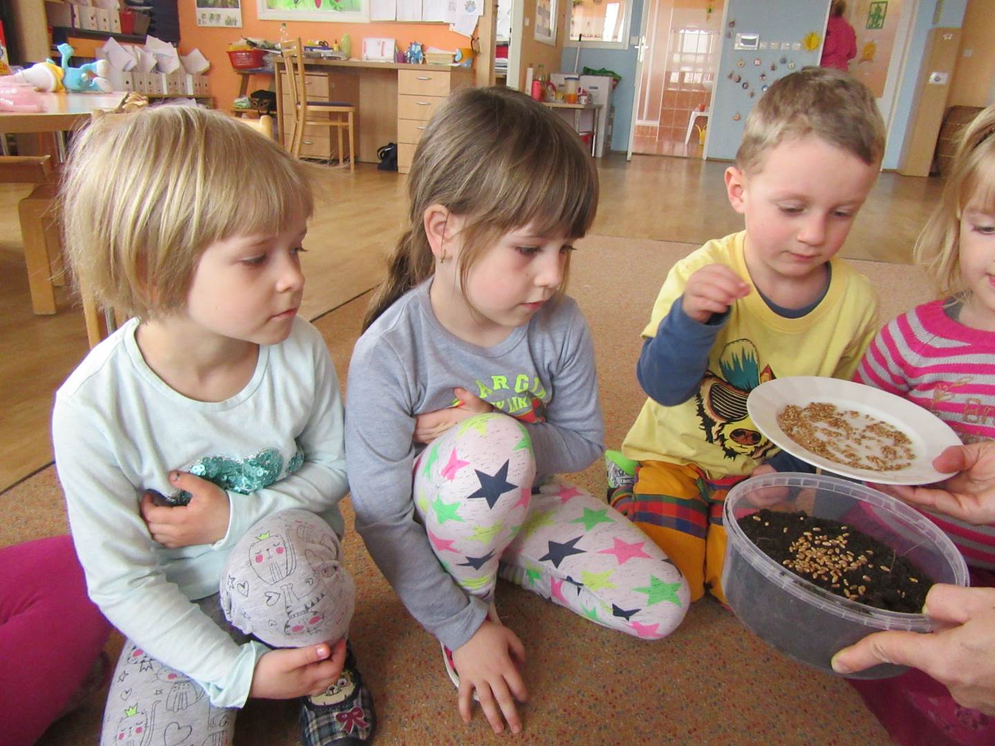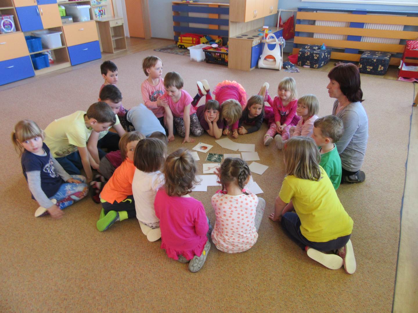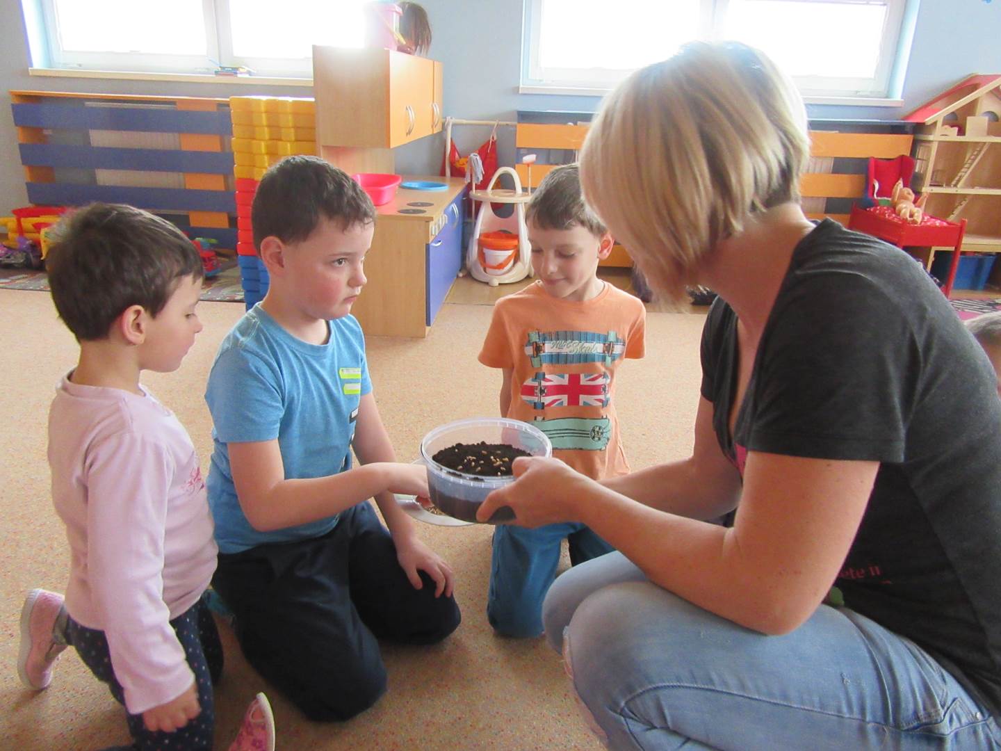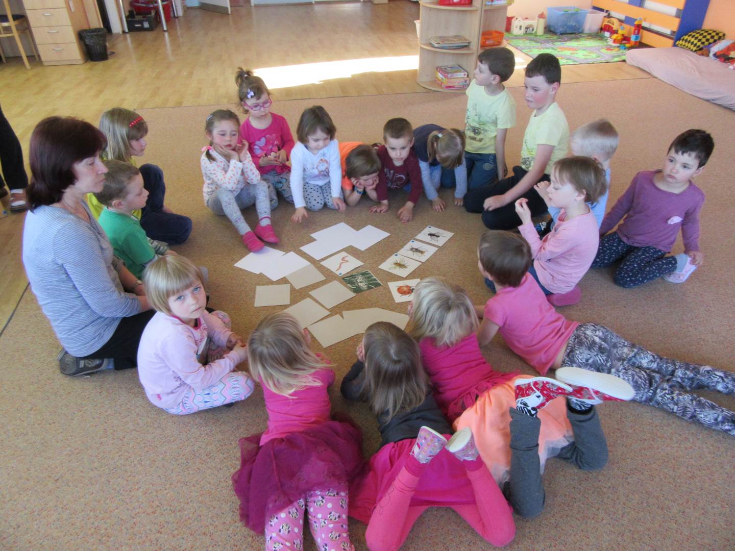Začali jsme krásným příběhem Jak Krtek budil zvířátka, hmyz a ptáčky. Děti si také zahrály na mravenečky v lese a nosily klády, při pohybu s kládami zvládly i hezkou básničku. .Písničkou Probudil se malý brouček jsme zahájili pozorování hmyzu na zahradě, dokonce nás navštívil i slepýš.Pozorovali jsme také podrobný rúst rostlinky ze semínka. Pokusili jsme se rostlinky pěstovat za různých podmínek a srovnávali jsme jak rostou.Jaro je krásné roční období, proto si ho užíváme hlavně venku na sluníčku.