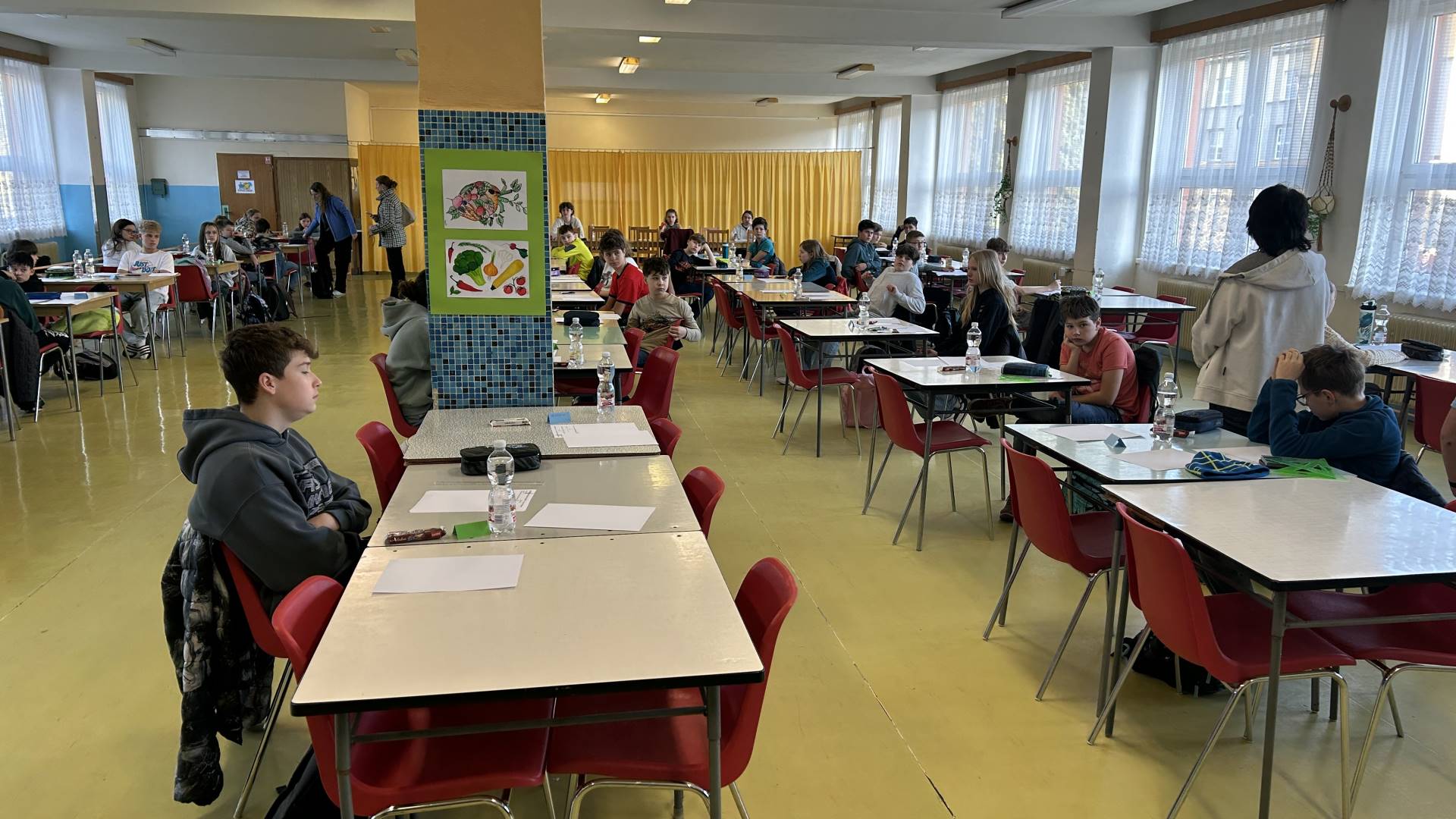 Dnešní úkol byl sice kratší, ale vůbec ne lehčí: tři úlohy, dvě hodiny a maximální soustředění. Atmosféra v jídelně byla až olympijsky tichá – jen šustění papírů a intenzivní přemýšlení. Teď už jen musíme počkat, kolik bodů si naši soutěžící připíšou a jak to celé dopadne.