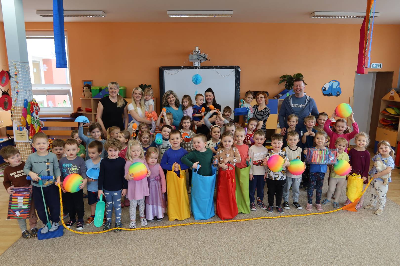 Pořídili jsme létající raketky, duhové vinylové míče, odrážecí pogo, scoopball, animanční podložku Skákací panák, gymnastické hůlky s barevnými stuhami, kreativní padák, lano na přetahování, senzorickou natahovací gumu i sportovní set se skákacími pytli a házecími pytlíky.